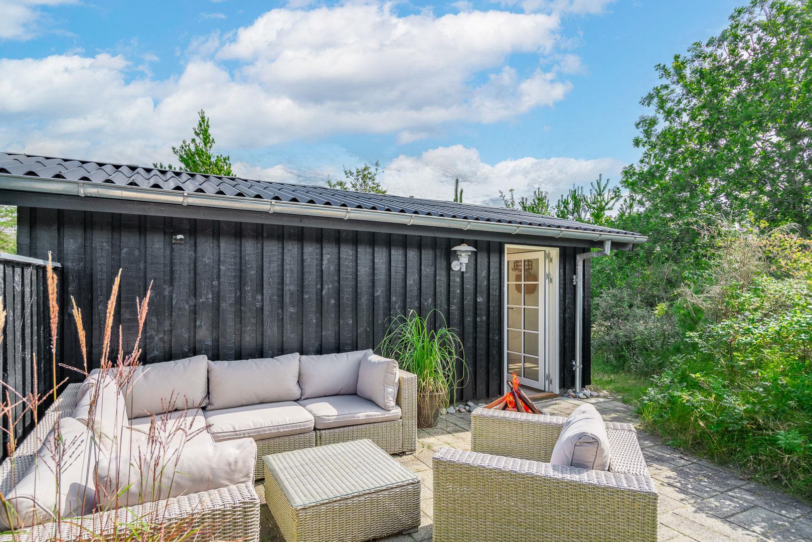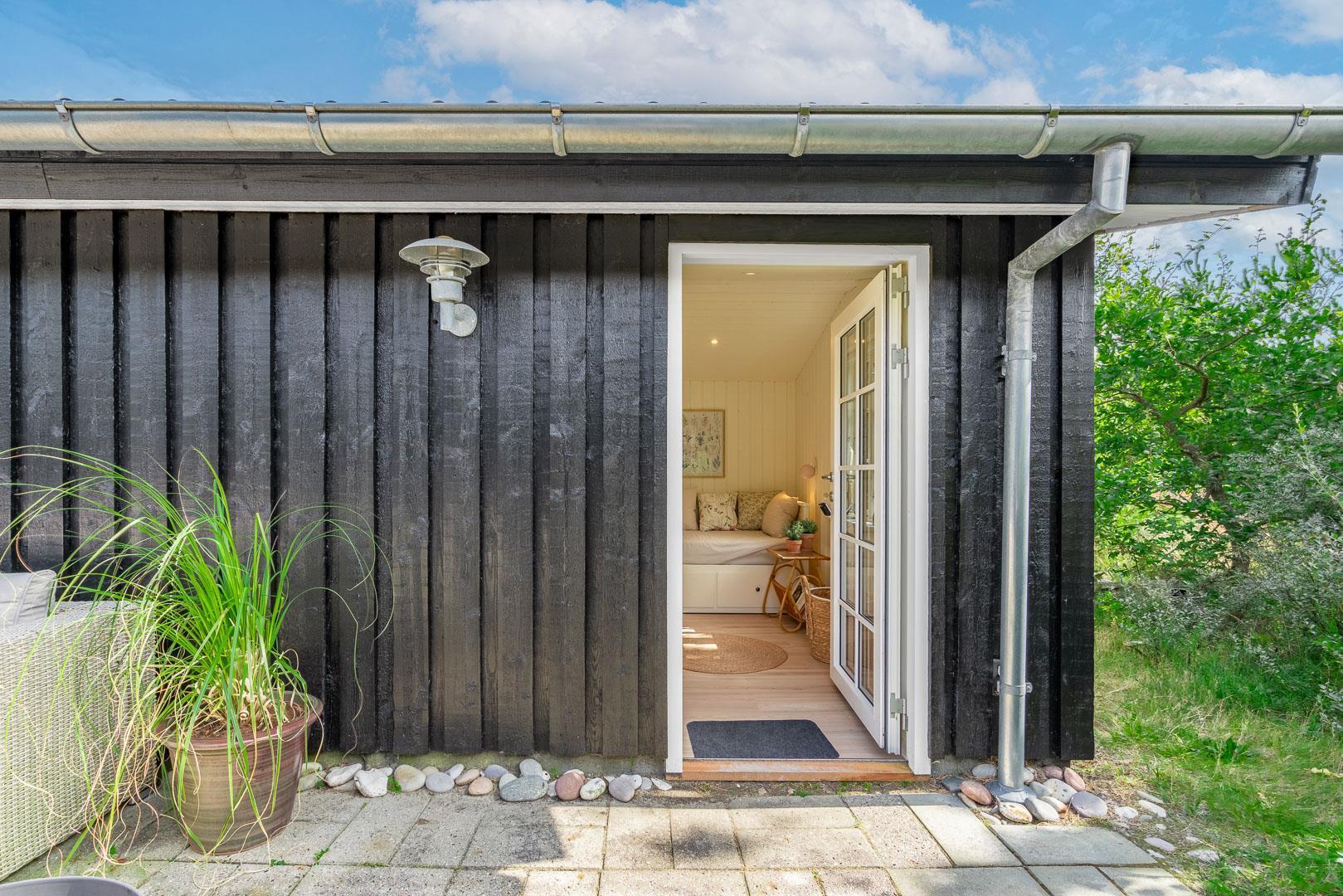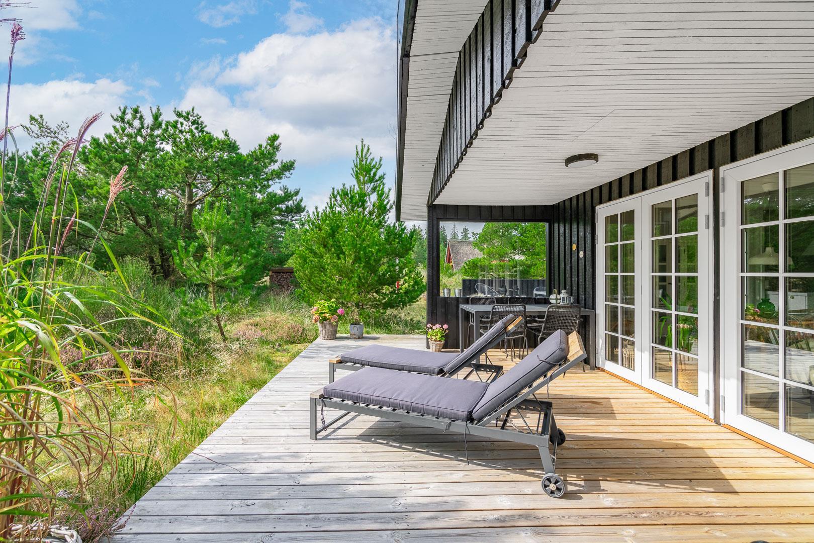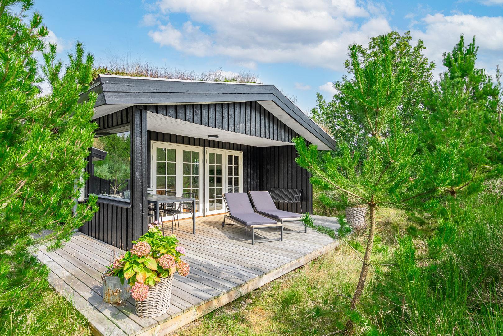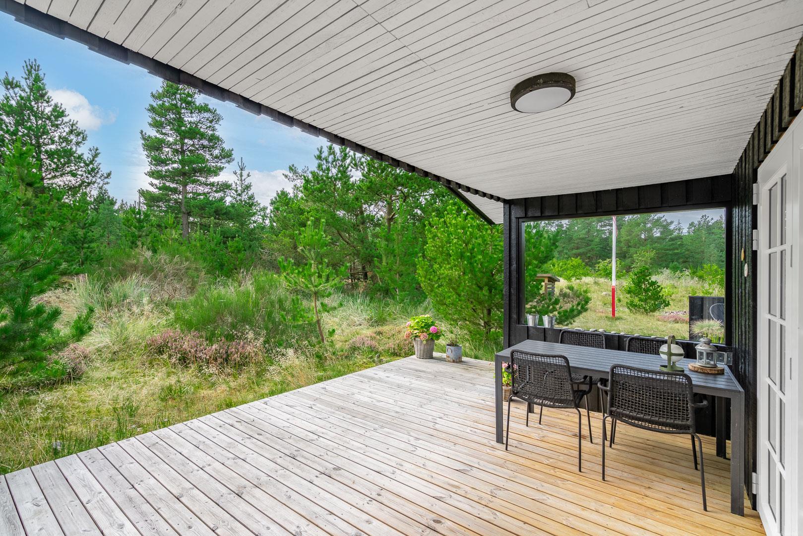 Den 1.200 m² store naturgrund er omkranset af træer og byder på masser af privatliv og plads til både leg og afslapning. På den solrige, rummelige terrasse kan I nyde dagens måltider, tænde op i grillen og lade feriemaden blive til under åben himmel. Efter en dag i naturen eller ved stranden kan I tage et forfriskende bad i den udendørs bruser og virkelig mærke ferien.