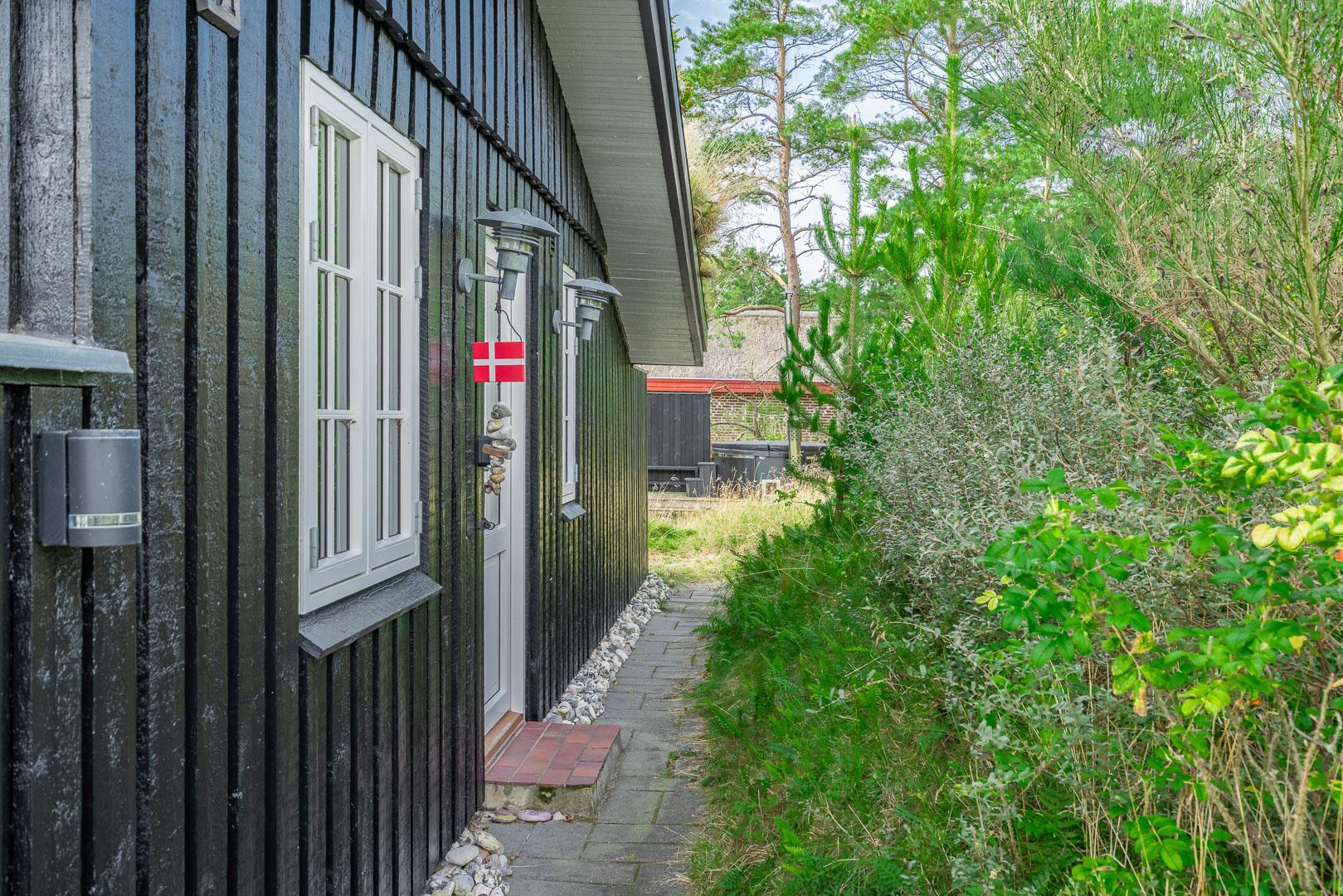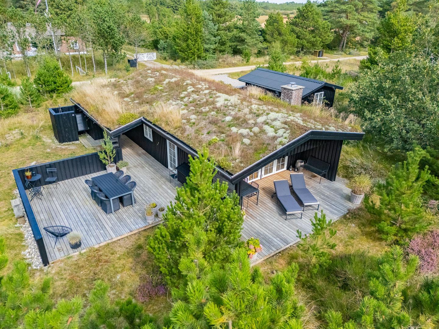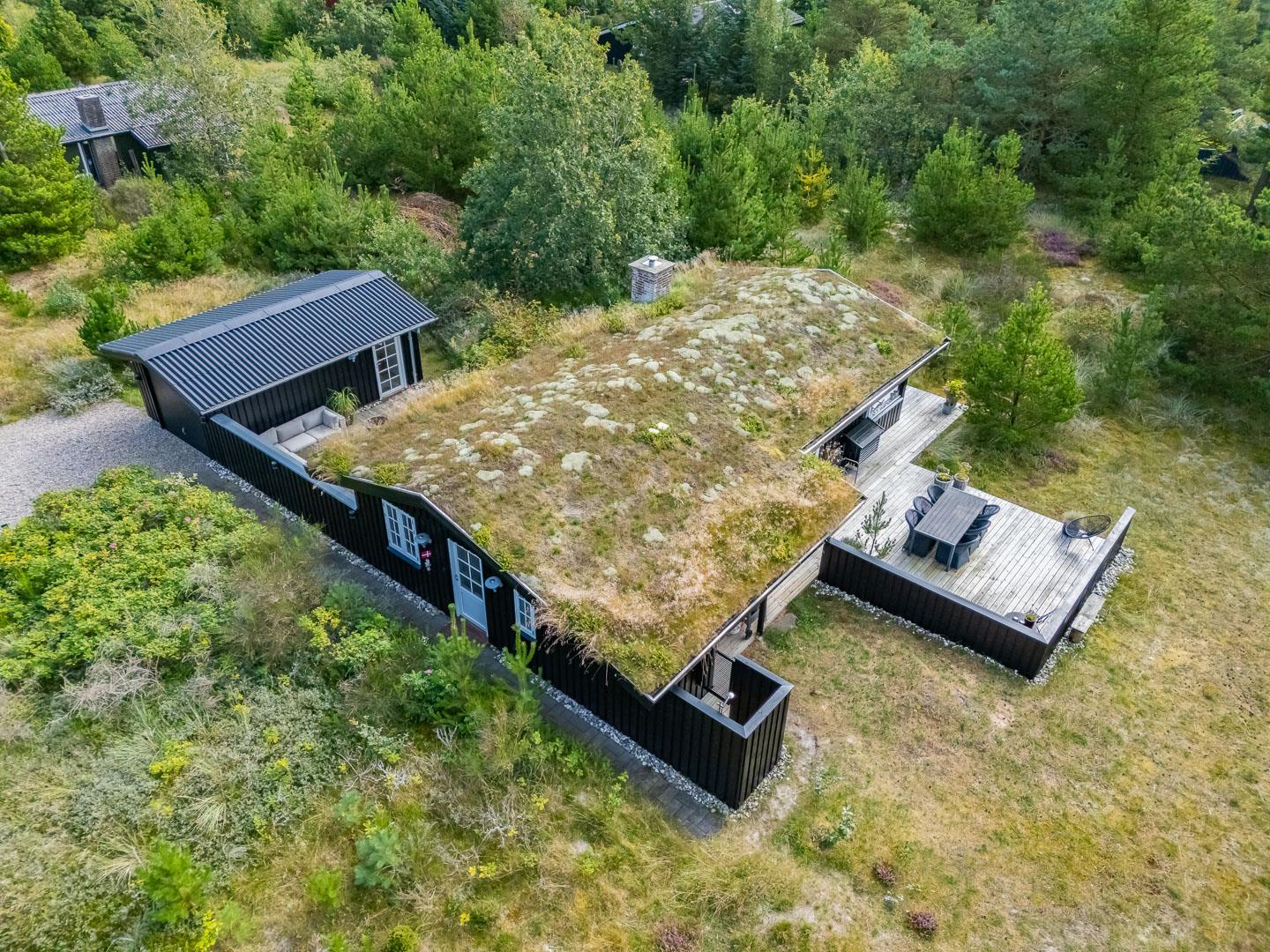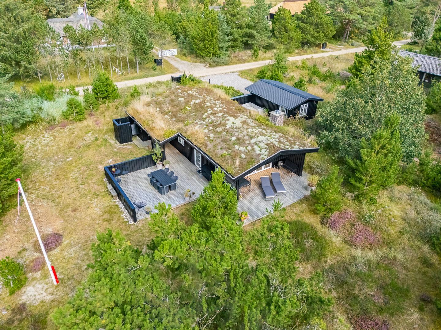 Den 1.200 m² store naturgrund er omkranset af træer og byder på masser af privatliv og plads til både leg og afslapning. På den solrige, rummelige terrasse kan I nyde dagens måltider, tænde op i grillen og lade feriemaden blive til under åben himmel. Efter en dag i naturen eller ved stranden kan I tage et forfriskende bad i den udendørs bruser og virkelig mærke ferien.