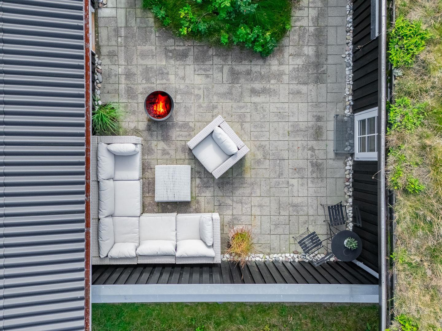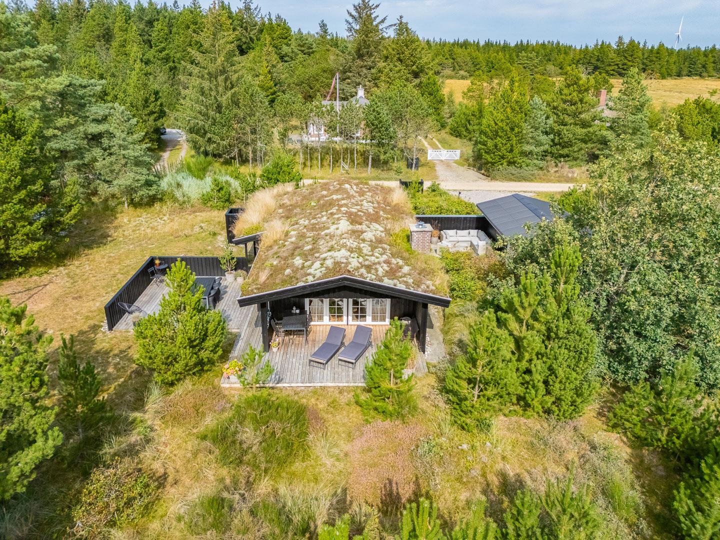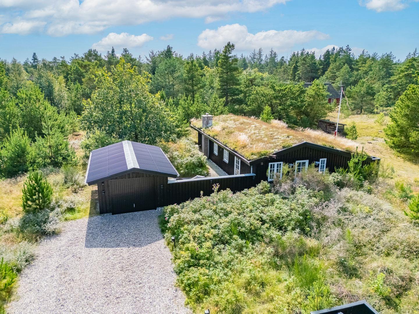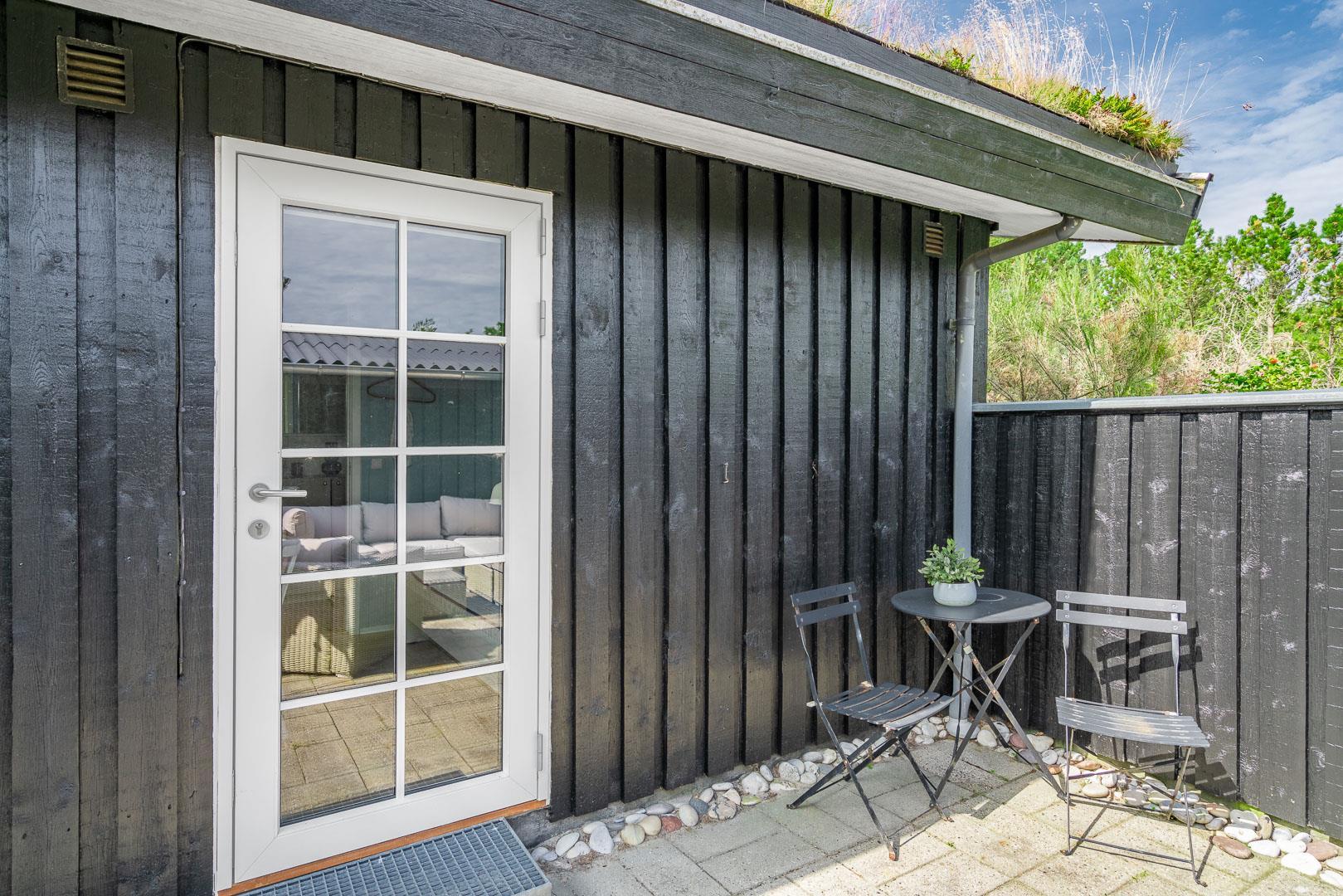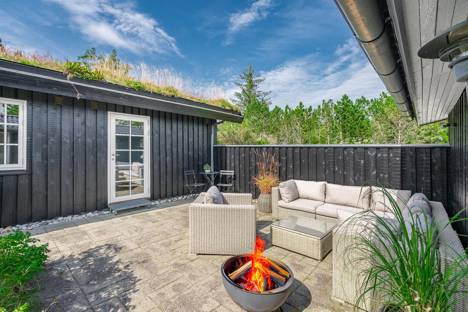Den 1.200 m² store naturgrund er omkranset af træer og byder på masser af privatliv og plads til både leg og afslapning. På den solrige, rummelige terrasse kan I nyde dagens måltider, tænde op i grillen og lade feriemaden blive til under åben himmel. Efter en dag i naturen eller ved stranden kan I tage et forfriskende bad i den udendørs bruser og virkelig mærke ferien.