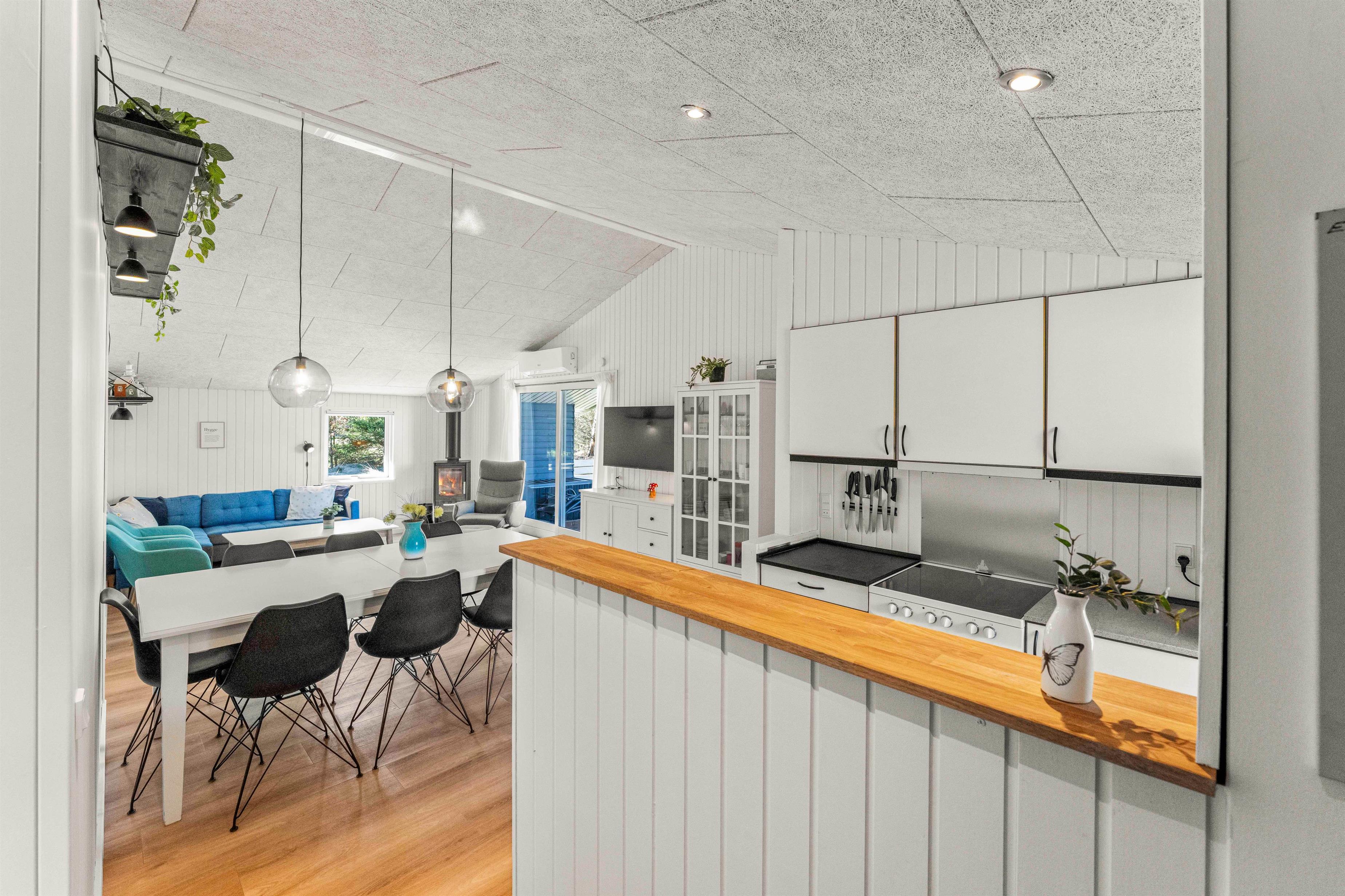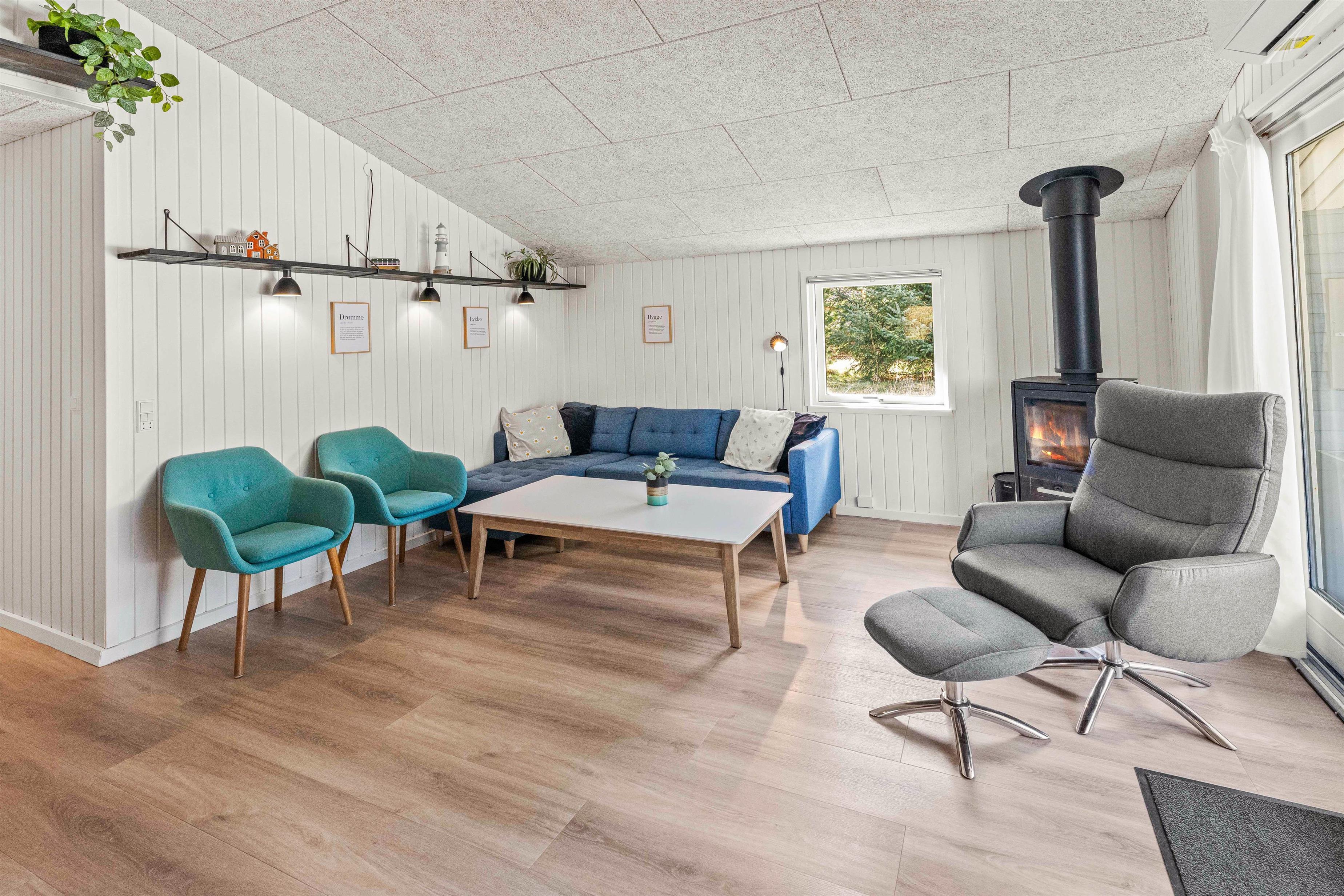 Der er ingen tvivl om, at ferien kommer til at foregå i ægte ”sommerhus-stemning”, da indretningen inviterer til masser af hygge og samvær med familien. Sommerhuset er senest renoveret i 2020 og fremstår rigtig indbydende med lyse naturmaterialer og fine detaljer, som tilfører omgivelserne ekstra 'varme'. Feriehusets skønne kombinerede stue- og spiseafdeling bliver samlingspunktet, når der skal hygges foran brændeovnen efter en dag i den friske vestenvind og i feriehusets pool.