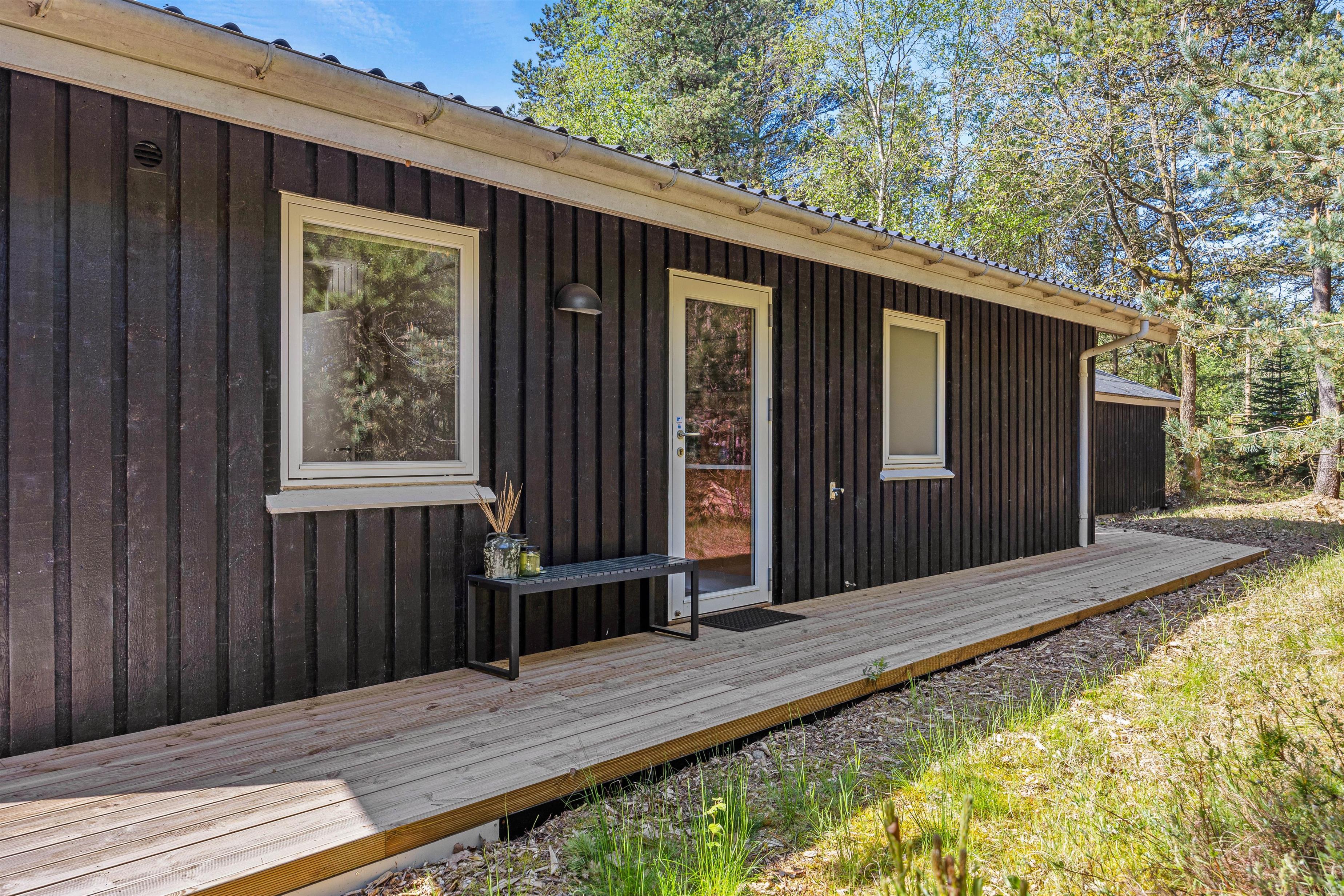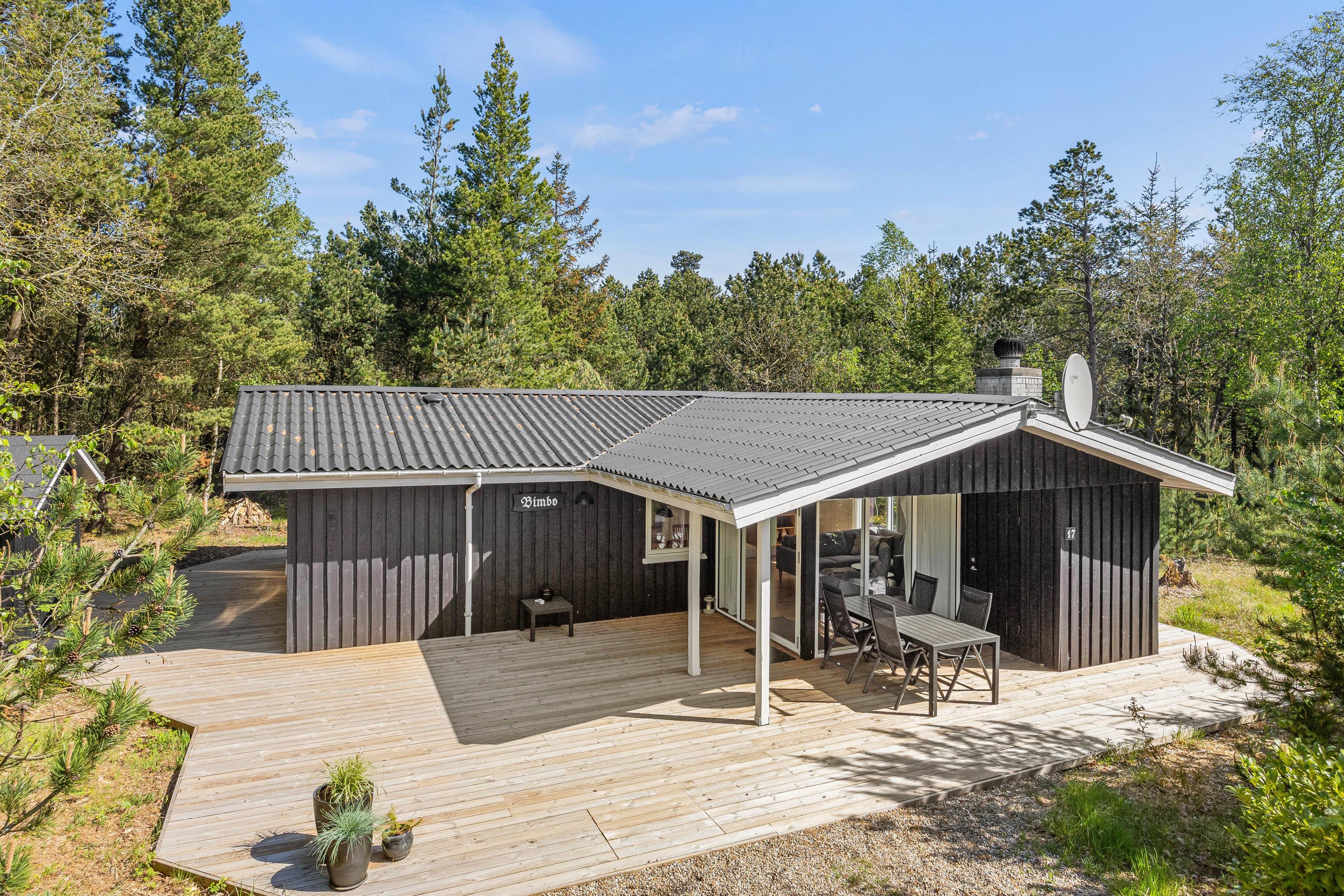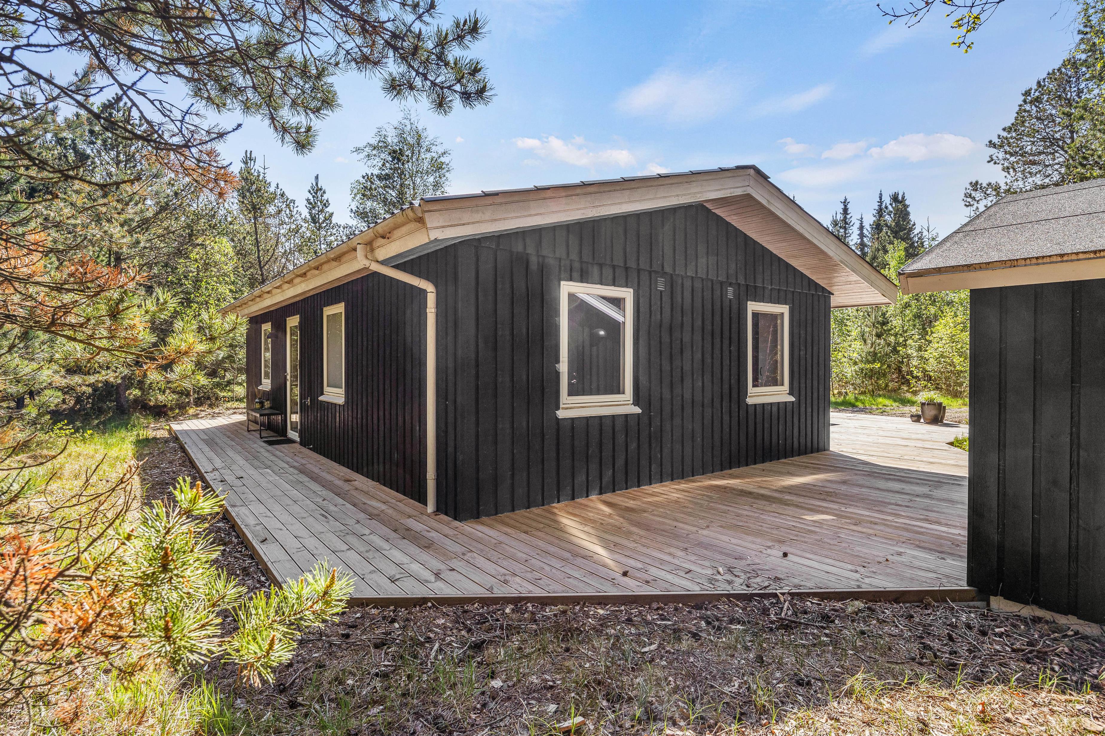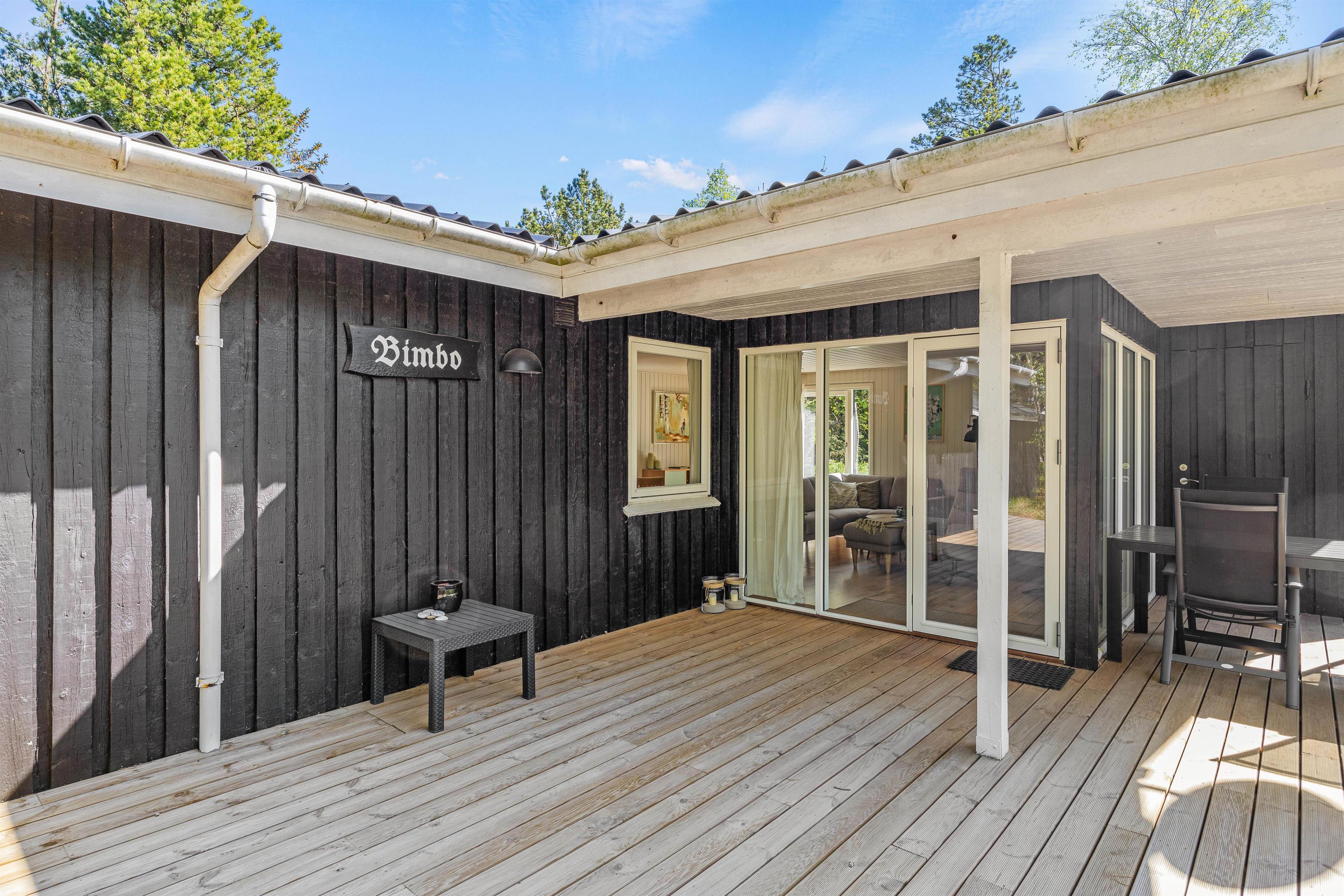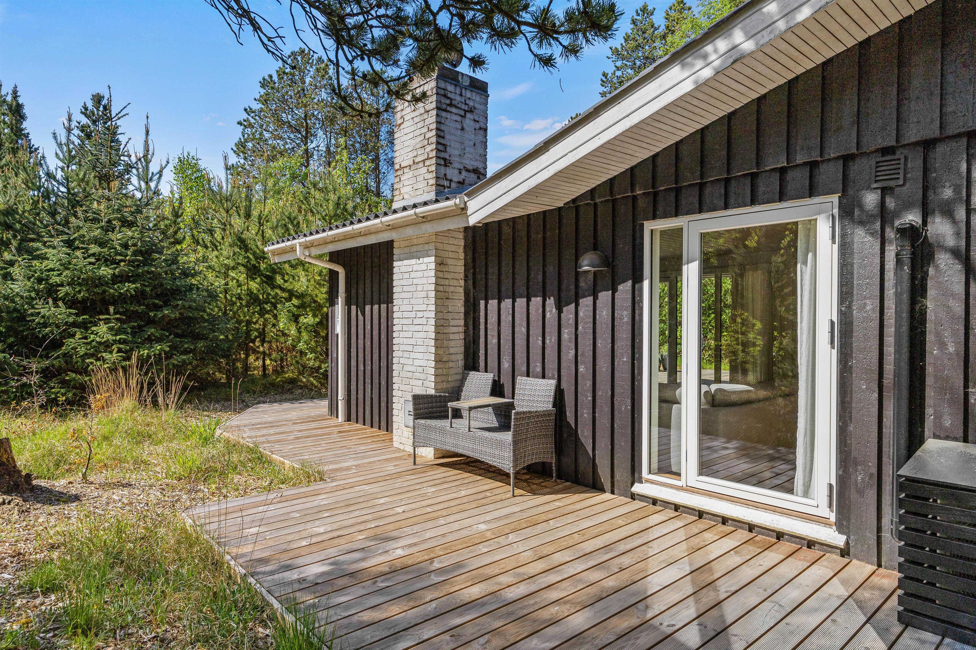 Omkring sommerhuset er der en træterrasse, som I kan tilbringe og nyde de solrige feriedage på. Her står der havemøbler og liggestole klar, som I kan sætte jer godt til rette i, mens I slapper af til synet af den omkringliggende natur og lyden af vinden i træerne.
