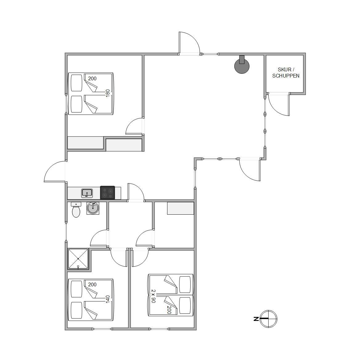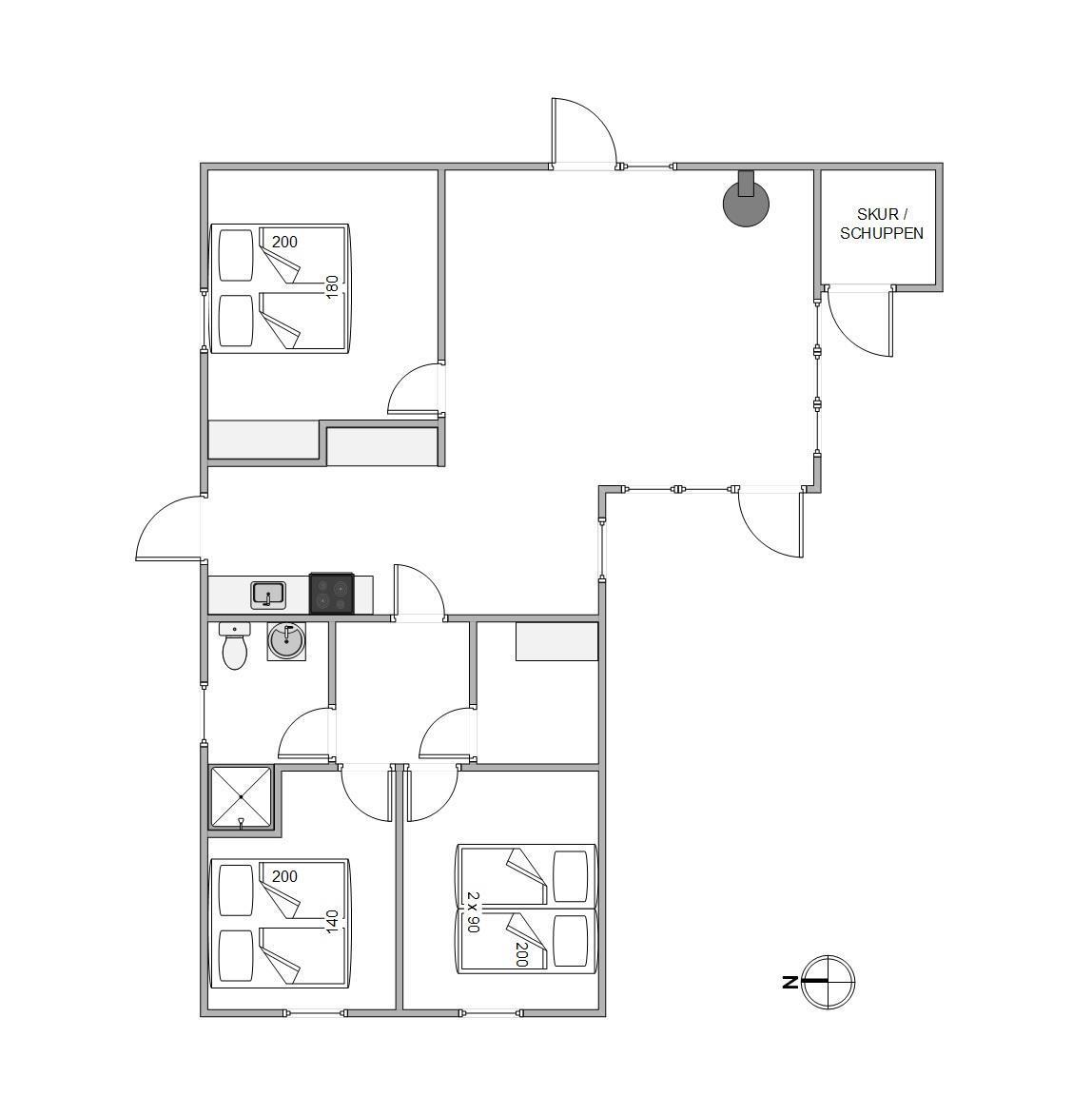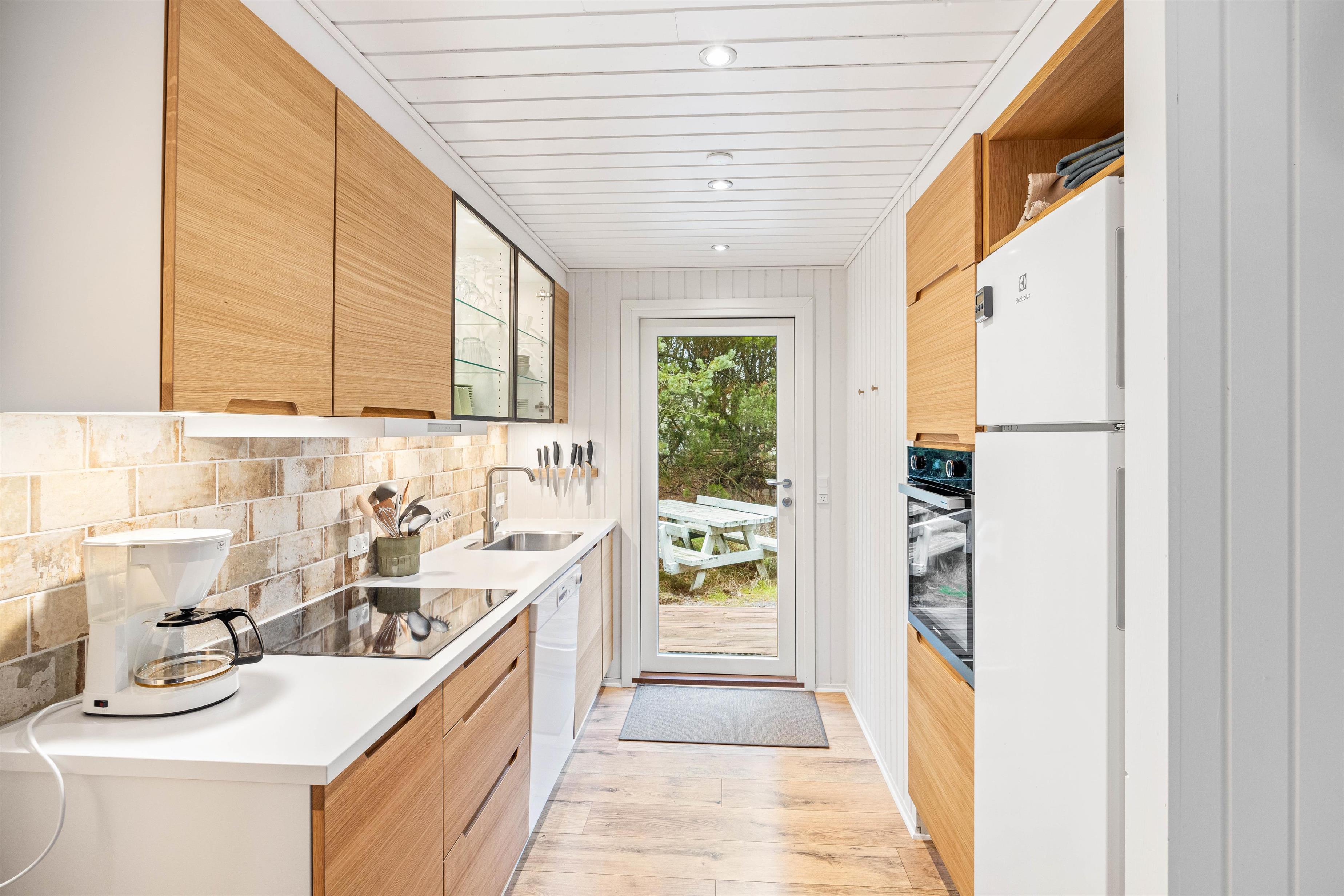 Sommerhusets hjerte er alrummet, hvor køkken, stue og spiseplads ligger i åben forbindelse. Her er rammerne sat for hyggelige feriestunder med madlavning, spil og film til lyden af brændeovnens knitren i baggrunden. Køkkenet er udstyret med en opvaskemaskine, så I slipper for at skulle tage opvasken efter madlavningen.