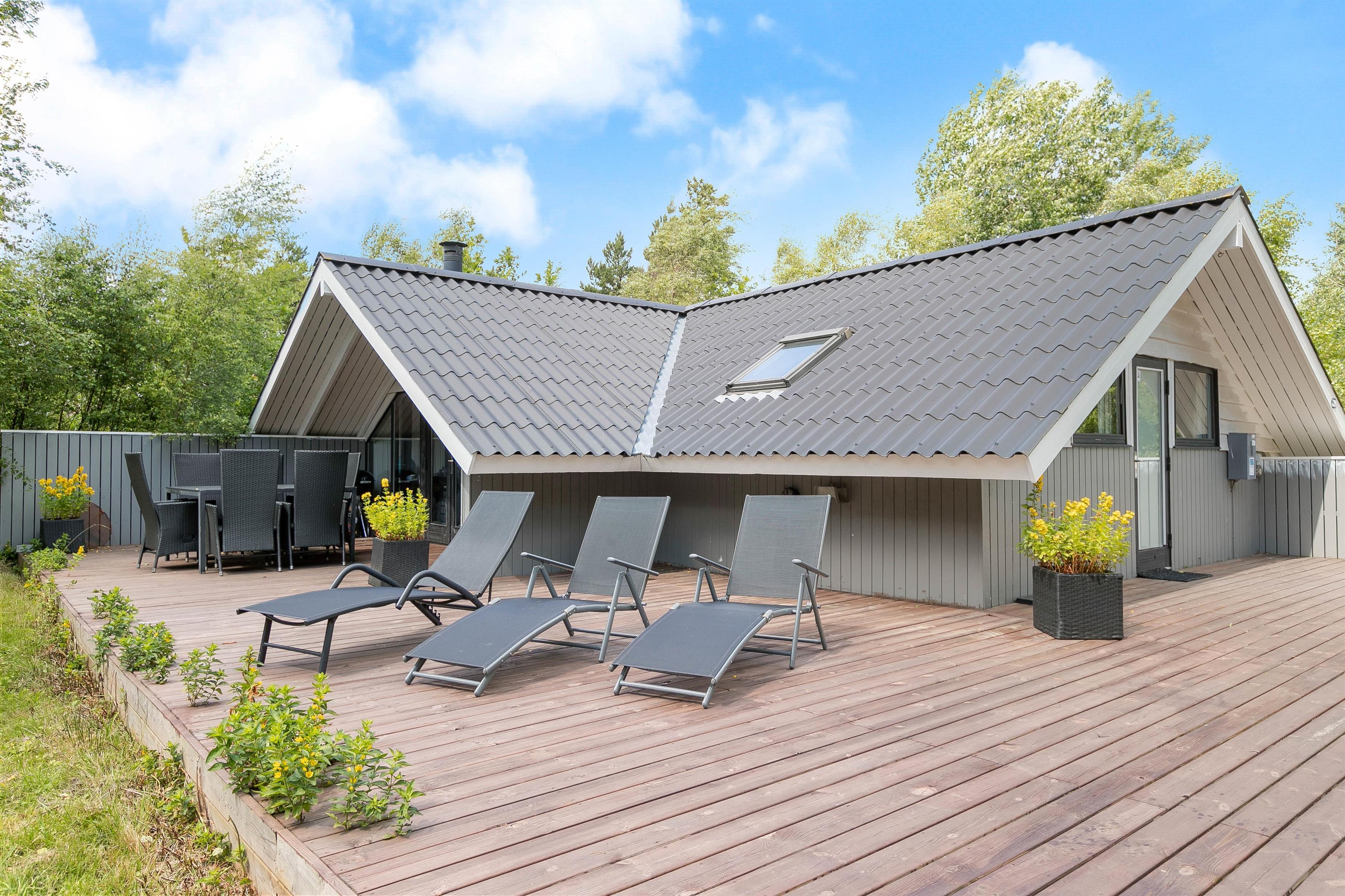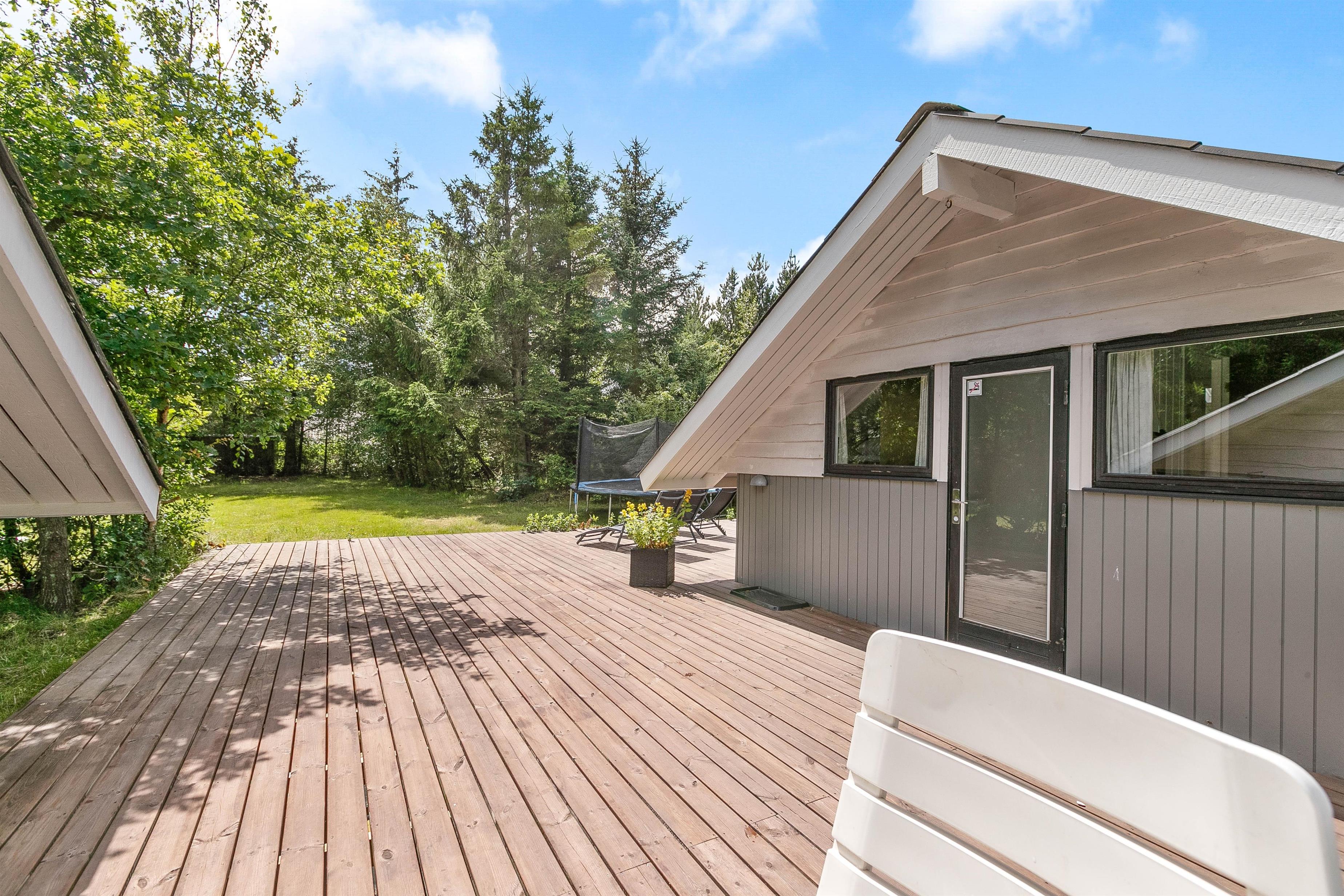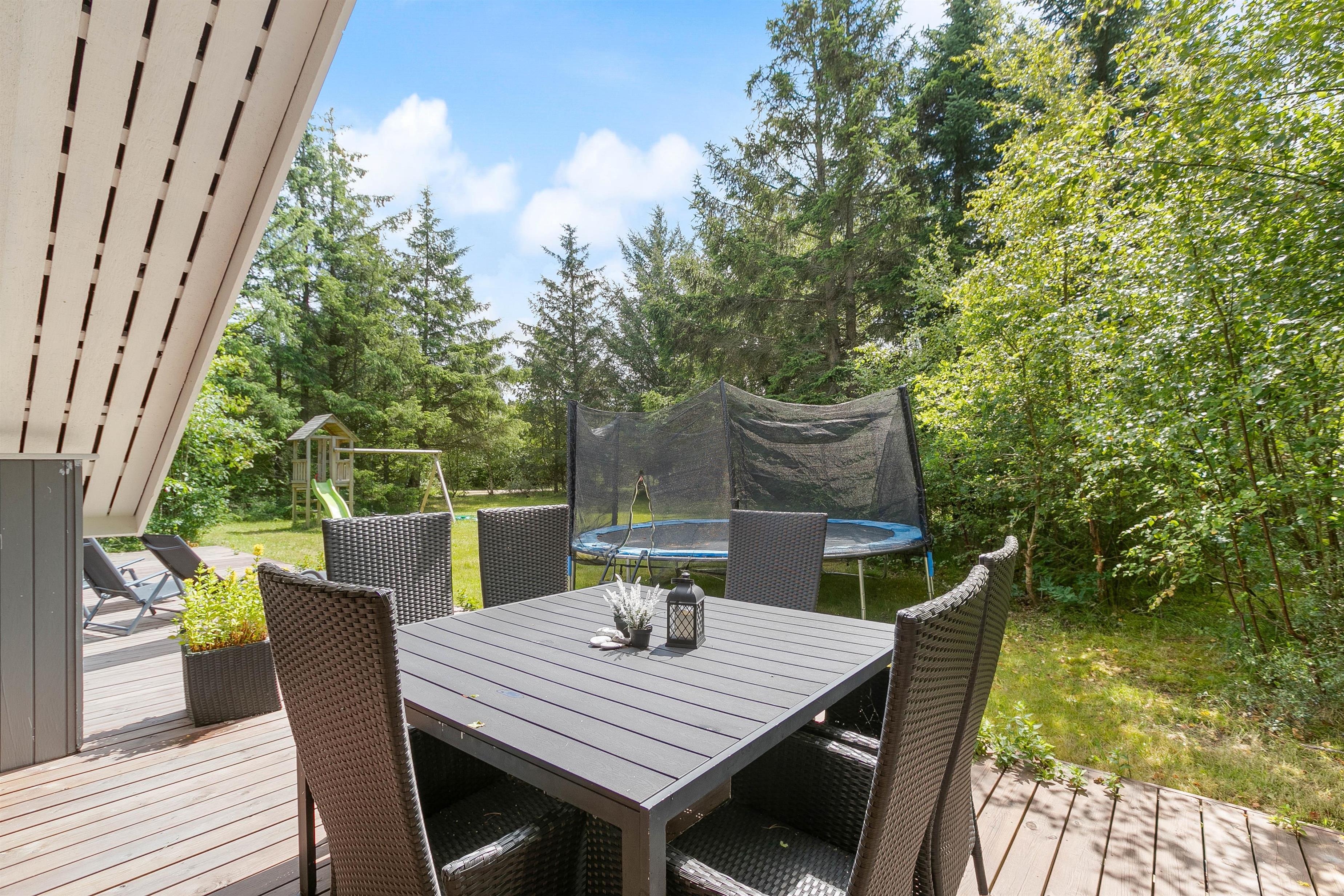 Den 1468 m2 store naturgrund, som hører til sommerhuset, har en stor terrasse, hvorfra I kan holde øje med børnene, mens I slapper af i havemøblerne eller på solvognene. Til feriens mindste gæster er der både trampolin og et legetårn med blandt andet rutsjebane og gynge, samt masser af plads at boltre sig på for alle feriens gæster – også hunden.
