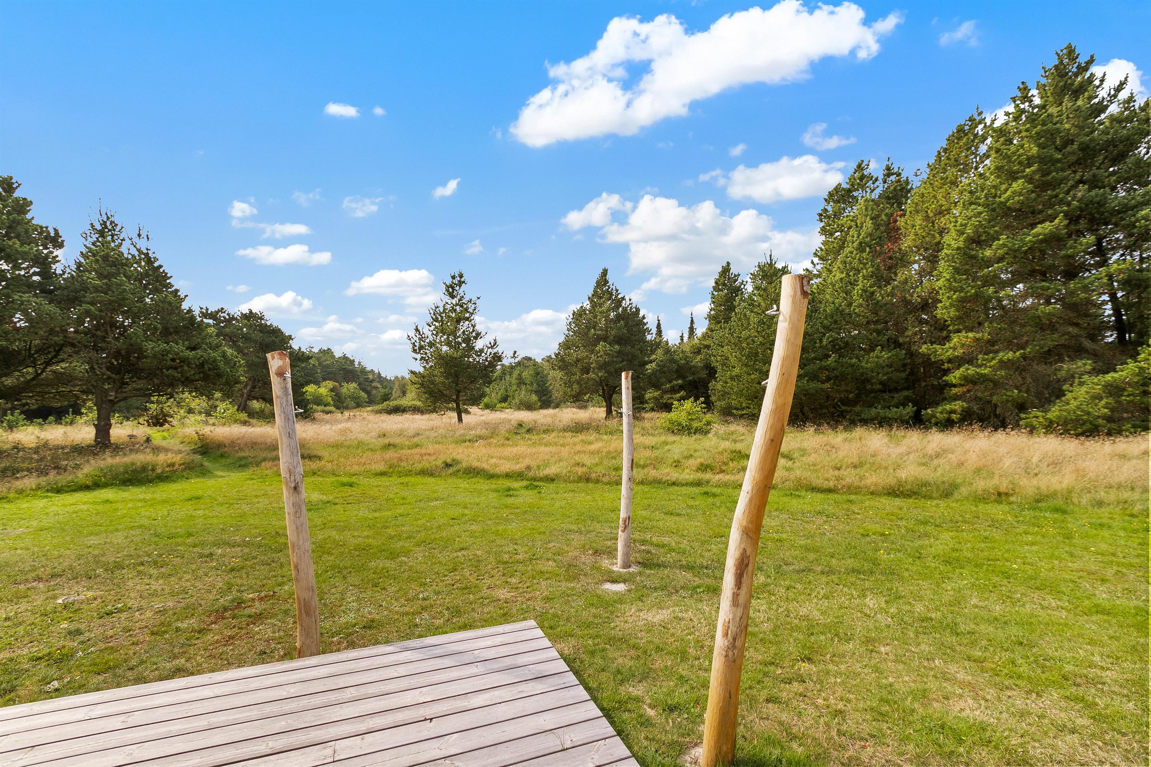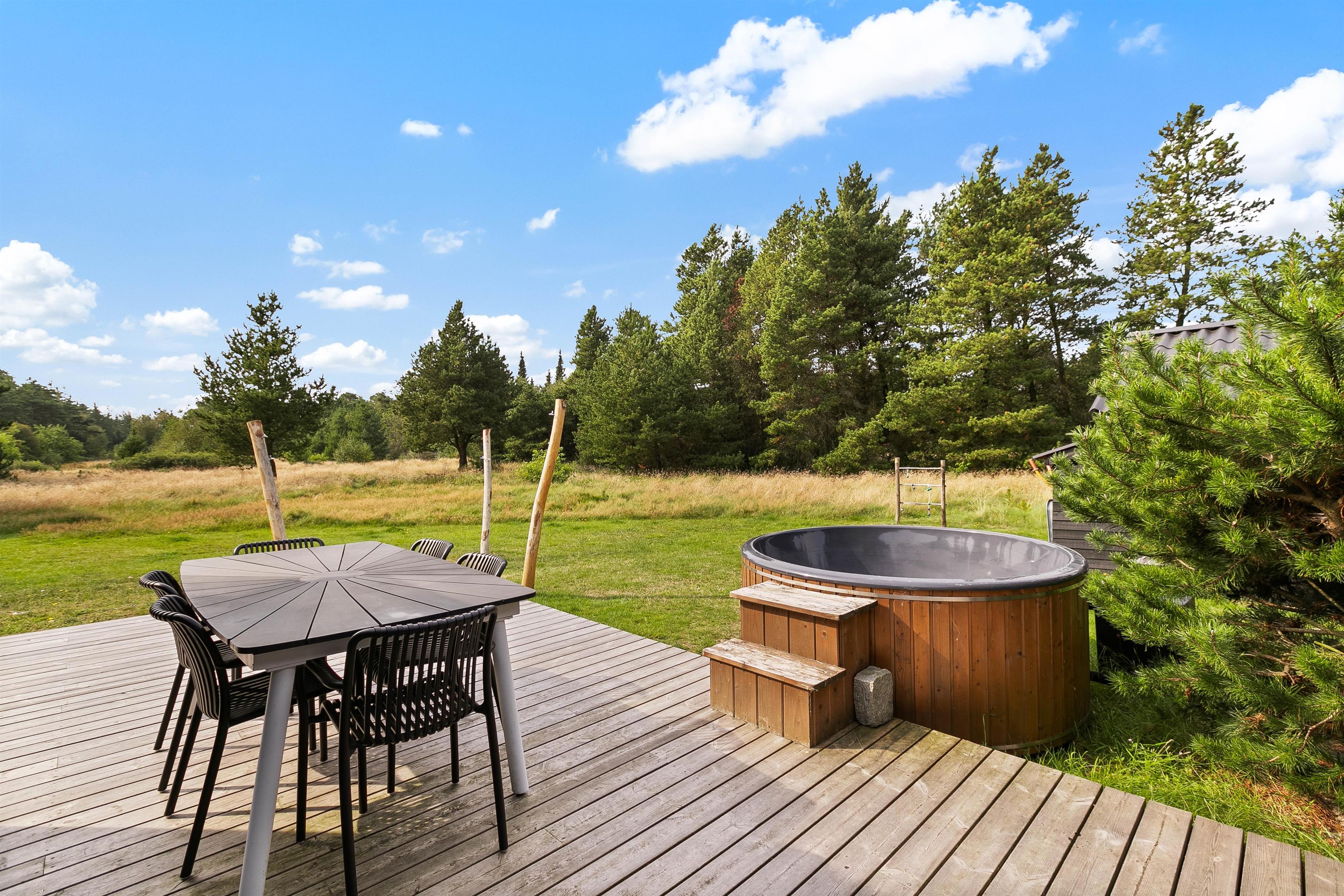 Den åbne og delvist afskærmede terrasse er udstyret med gode siddepladser, hvor I kan drikke morgenkaffen eller få en dejlig brunch sammen. Herfra har I en fantastisk udsigt over fredede arealer. Der er en gynge i haven, de små kan hygge sig på. Efter et dejligt måltid tilberedt på grillen, kan I hoppe i den udendørs spa og afslutte aftenen under stjernehimlen. Til sommerhuset er der også en carport, hvor jeres cykler kan stå i tørvejr.