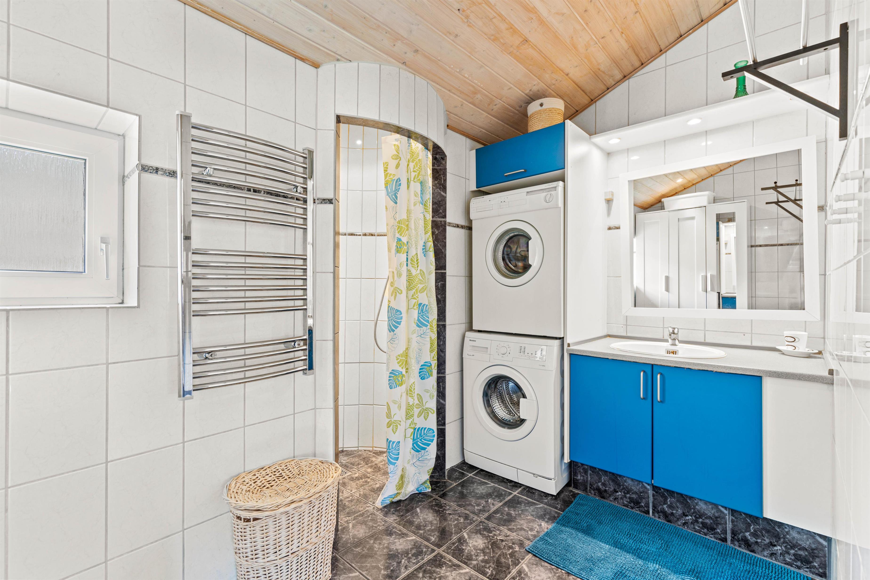 Her finder I tre hyggelige soveværelser, alle med gulvtæppe. På badeværelset er der separat bruseniche, gulvvarme samt adgang til den lille sauna. Her kan I slappe af efter en lang gåtur i det fri! Praktisk er her en energibesparende varmepumpe, og på badeværelset finder I også en vaskesøjle med vaskemaskine og tørretumbler.