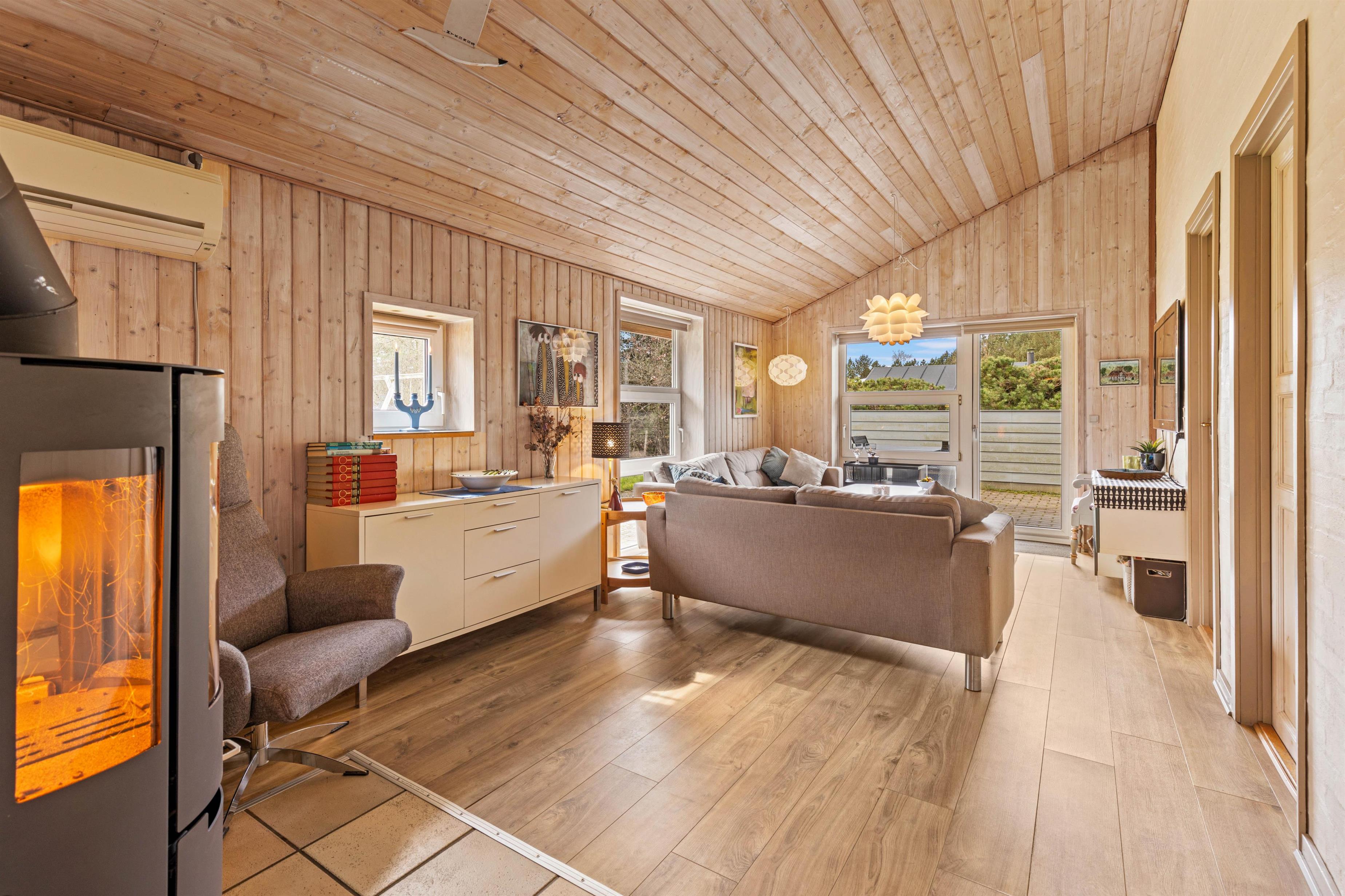 Så snart I kommer indenfor, vil I fornemme varmen og feriehusets hjemlige følelse. Her er en behagelig atmosfære, hvor man virkelig har lyst til at slå sig ned. Indretningen er holdt i rolige nuancer, og her får I flere gode siddepladser. Skønt er alrummet, hvor stue og køkken smelter sammen i ét. Feriehusets samlingspunkt, hvor I sammen kan lave god mad eller slappe af i sofaen, og mærke brændeovnens varme breder sig.