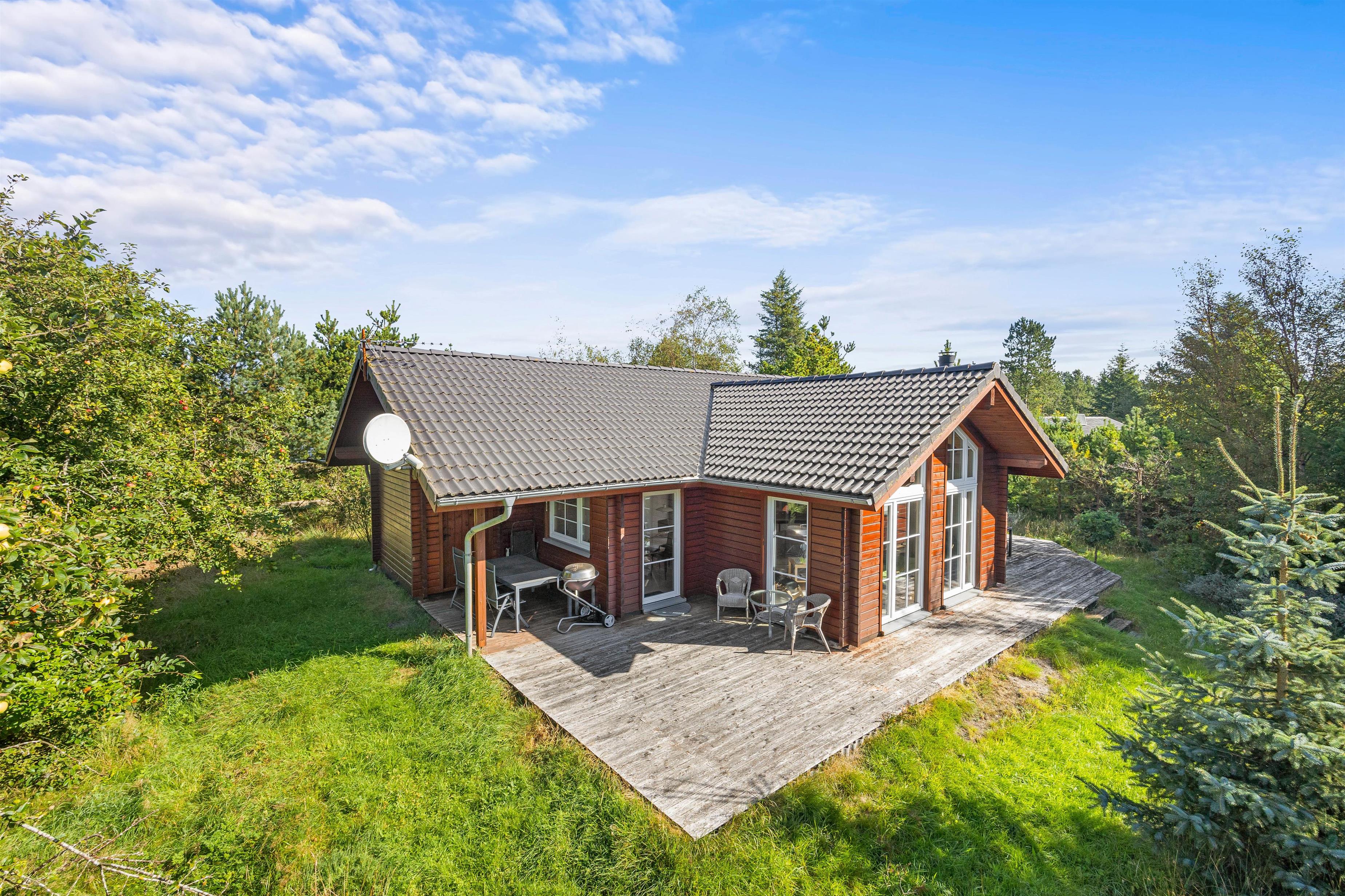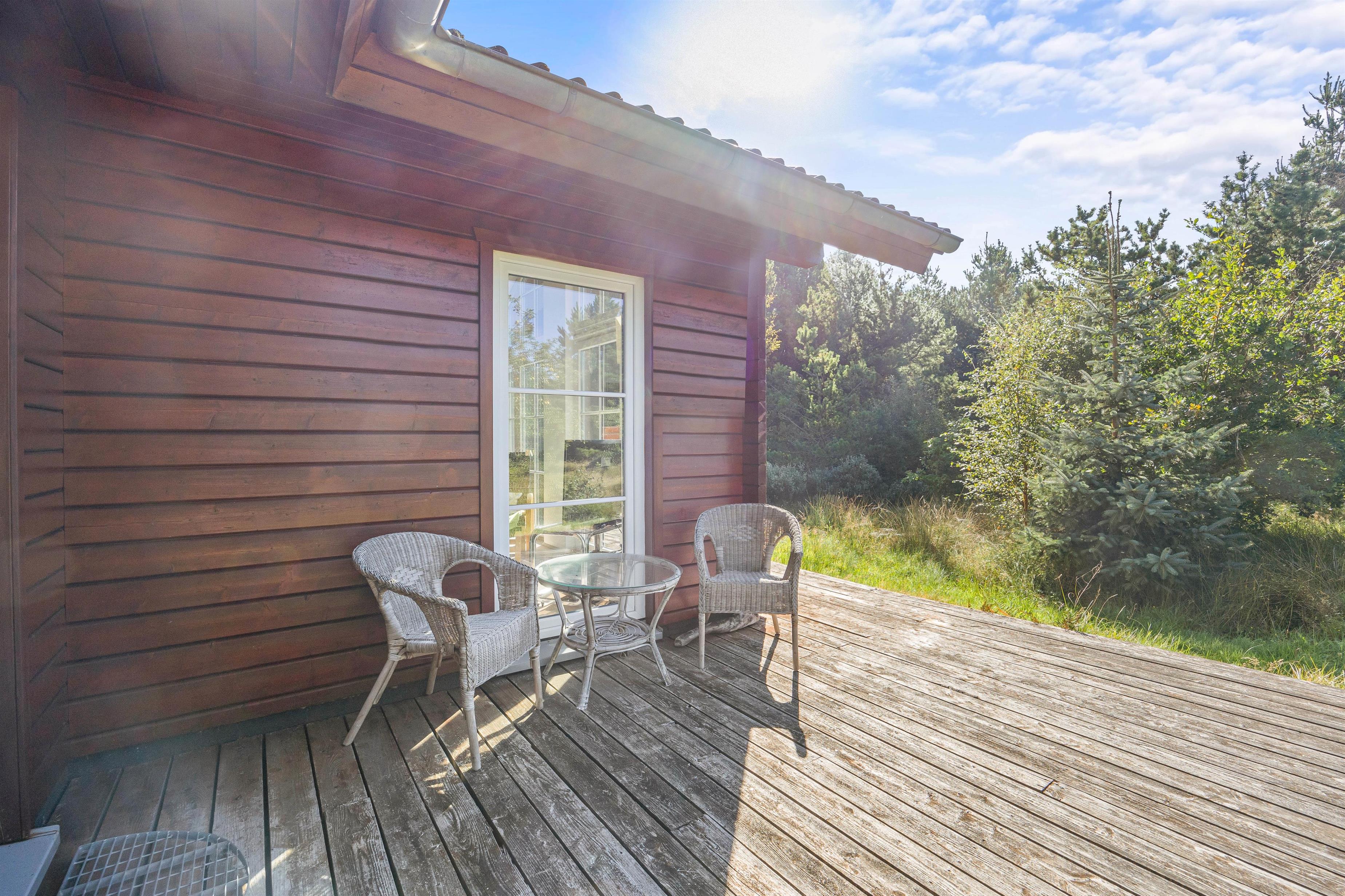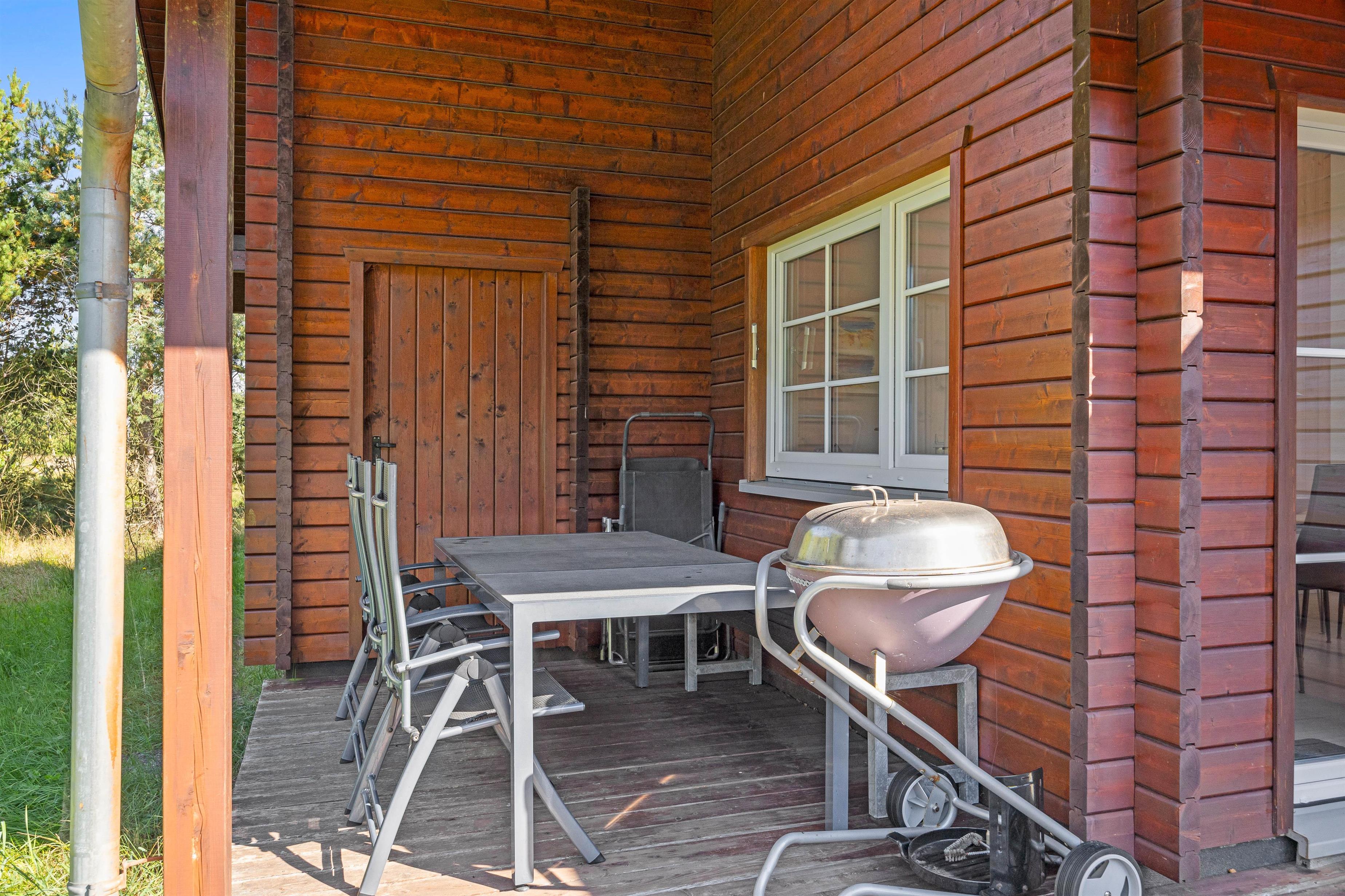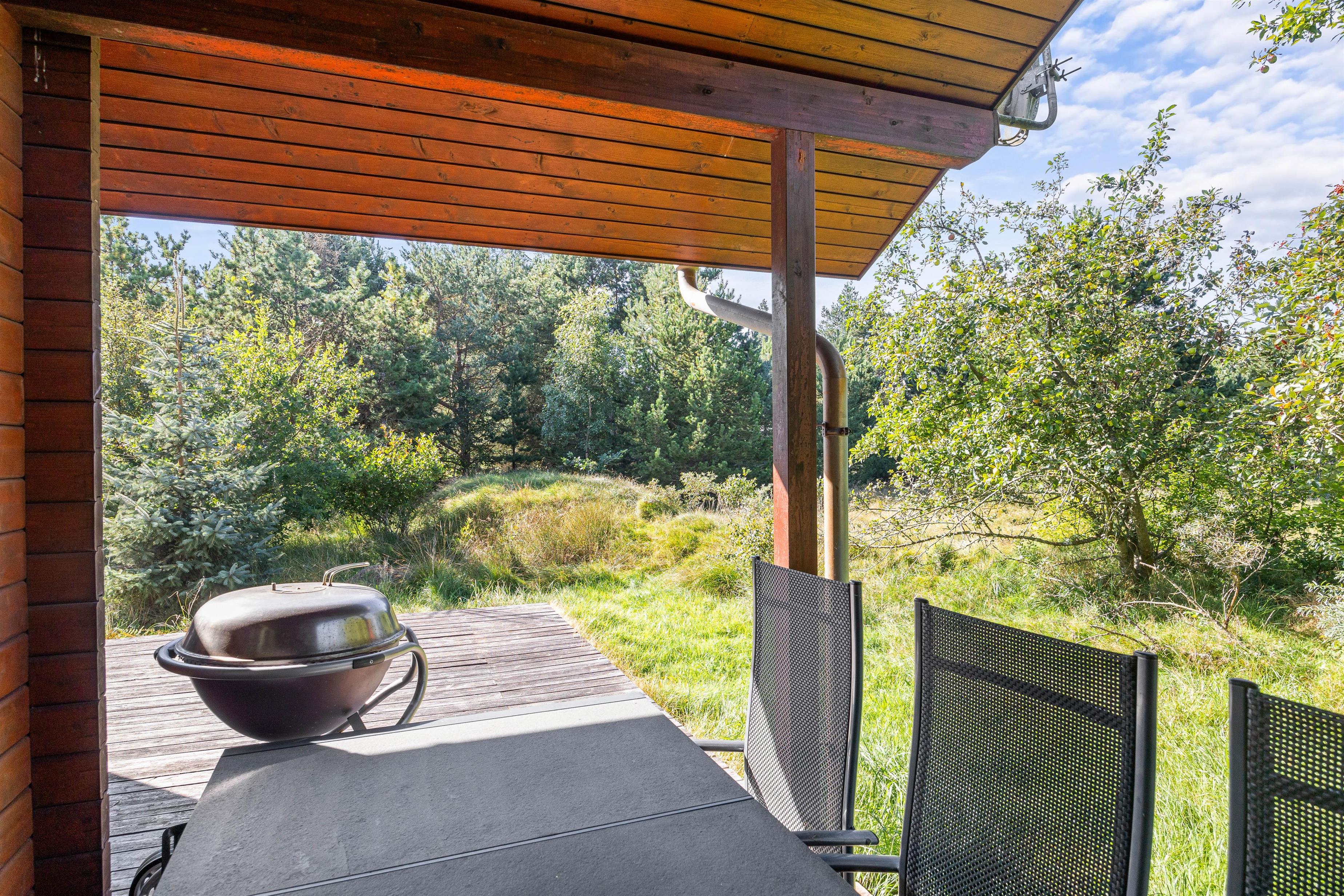 Beliggende på en blind vej og med en masse træer rundt på den 1300 kvadratmeter store naturgrund, kan I her nyde jeres ferie i fred og ro. Den åbne terrasse har også en overdækket del, så I kan nyde den friske luft i regnvejr, eller hvis I blot foretrækker skyggen. Der er også solvogne til de af jer, der ønsker at nyde solens varme stråler. Når dagen lakker mod enden og I er ved at være sultne, kan I tænde op i grillen på terrassen, og tilberede et lækkert feriemåltid.