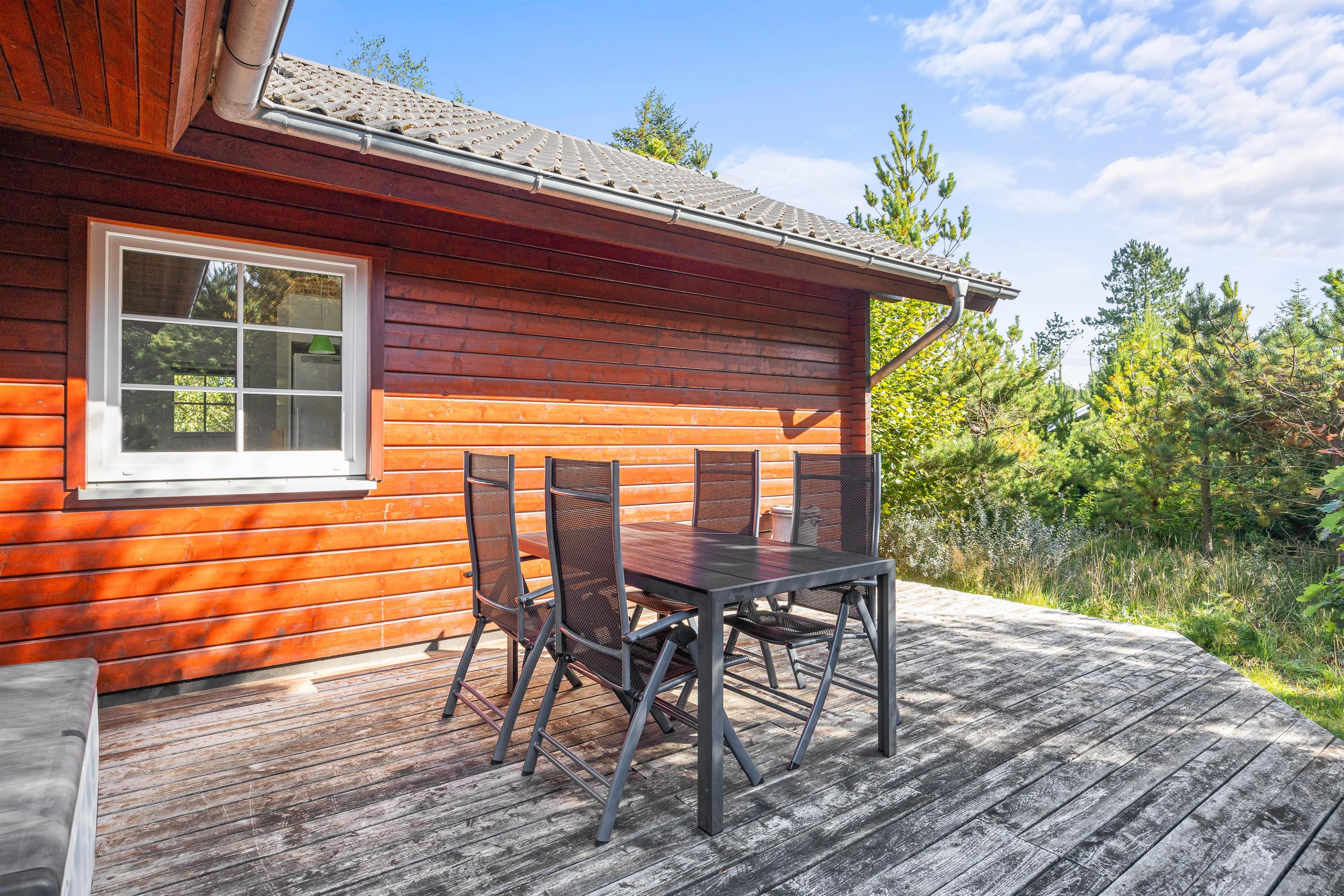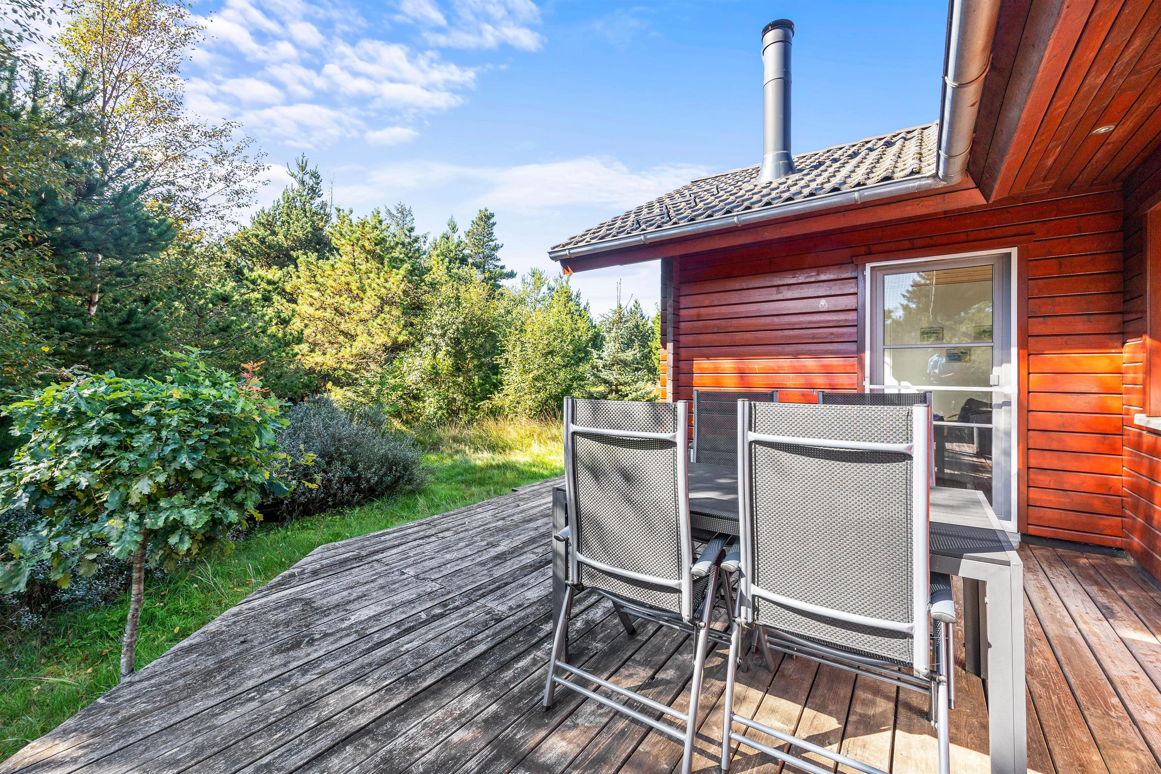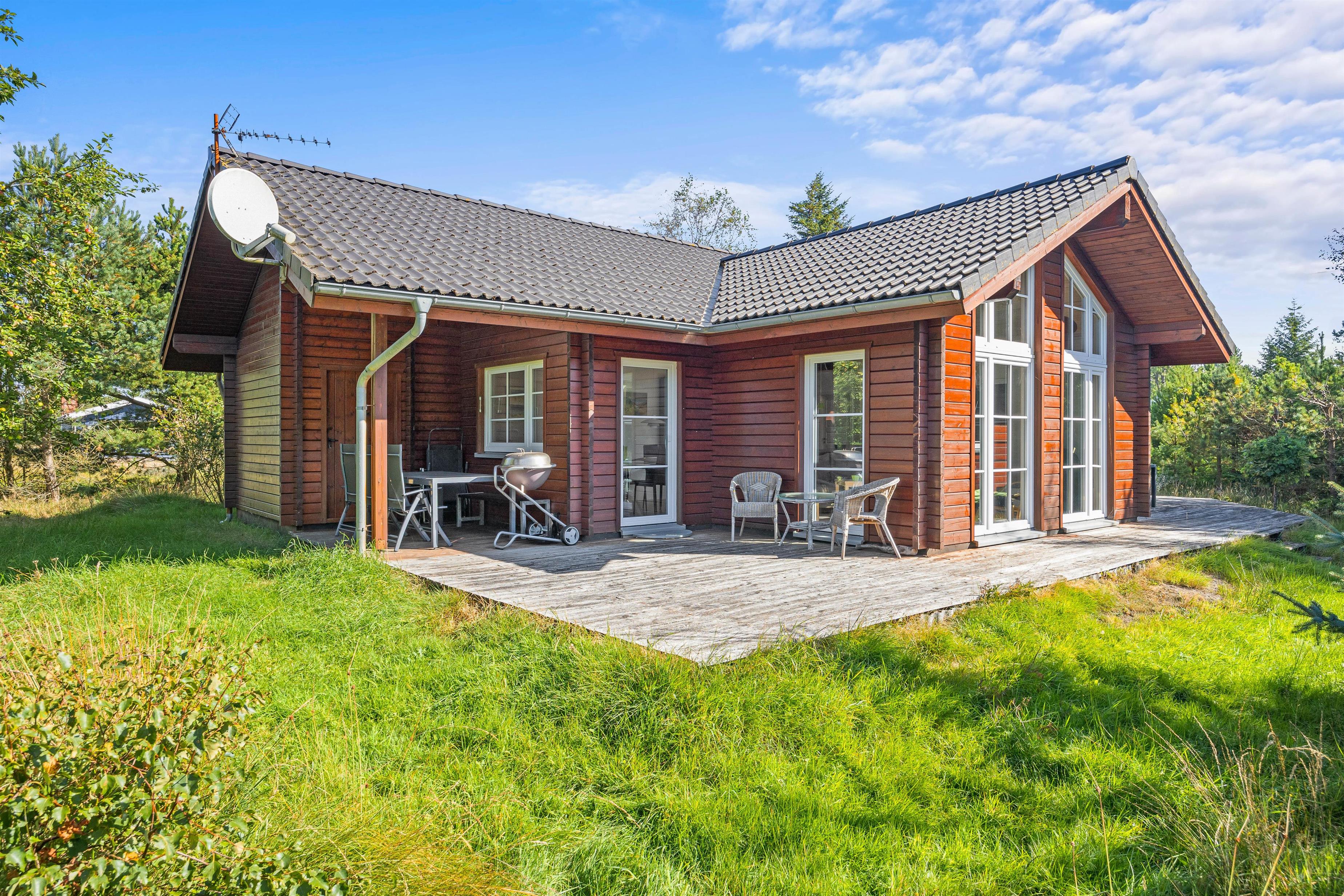 Beliggende på en blind vej og med en masse træer rundt på den 1300 kvadratmeter store naturgrund, kan I her nyde jeres ferie i fred og ro. Den åbne terrasse har også en overdækket del, så I kan nyde den friske luft i regnvejr, eller hvis I blot foretrækker skyggen. Der er også solvogne til de af jer, der ønsker at nyde solens varme stråler. Når dagen lakker mod enden og I er ved at være sultne, kan I tænde op i grillen på terrassen, og tilberede et lækkert feriemåltid.