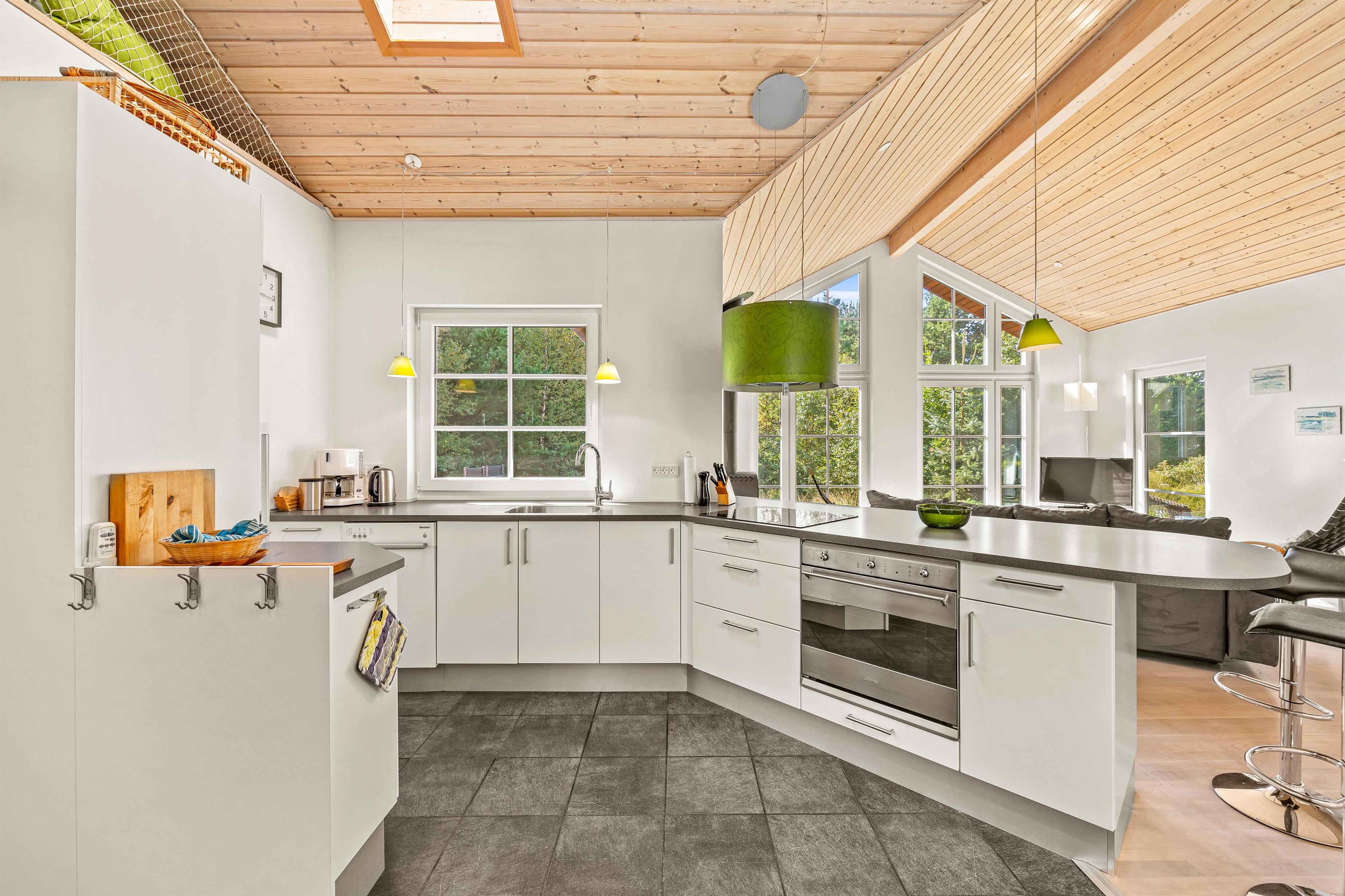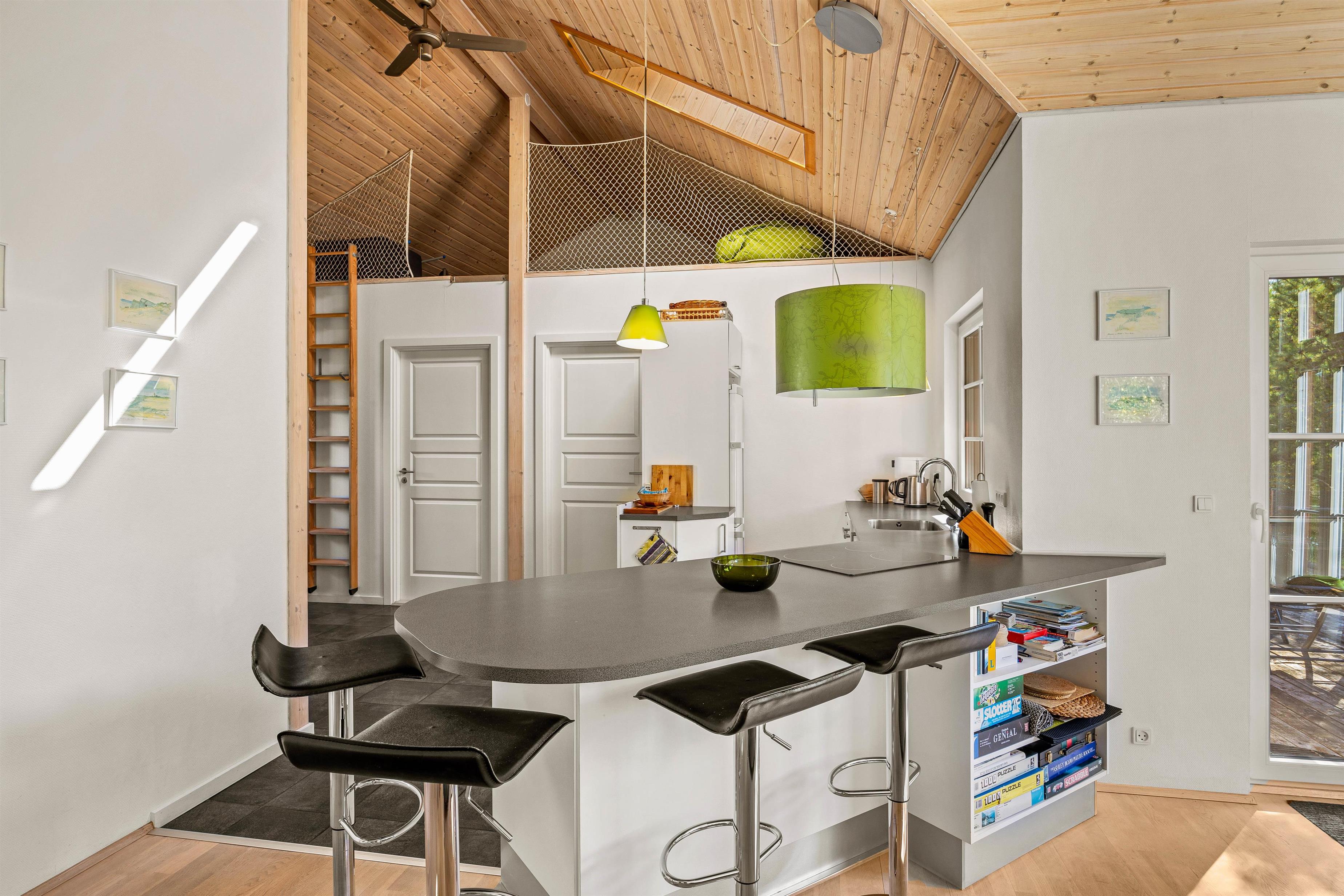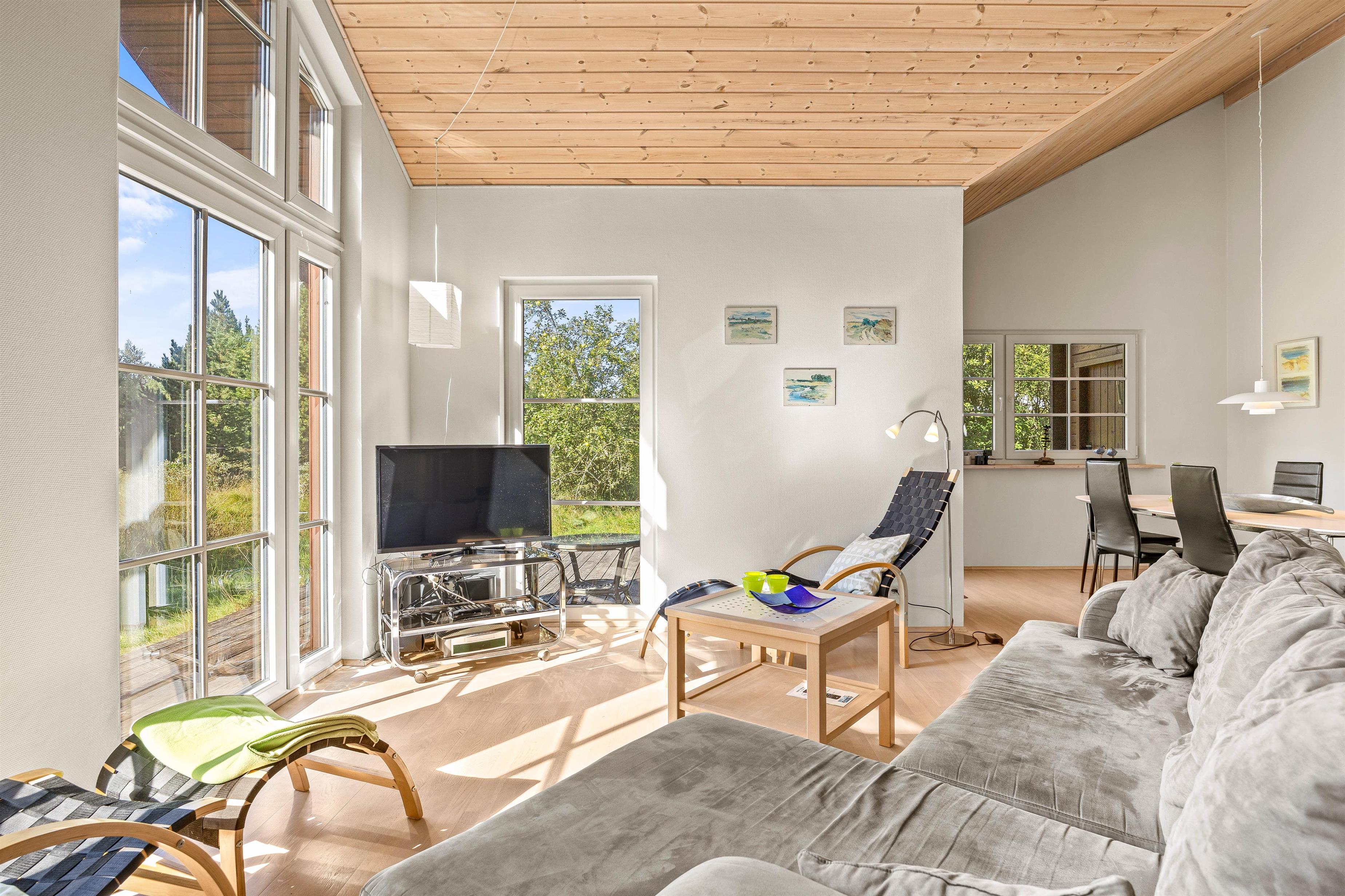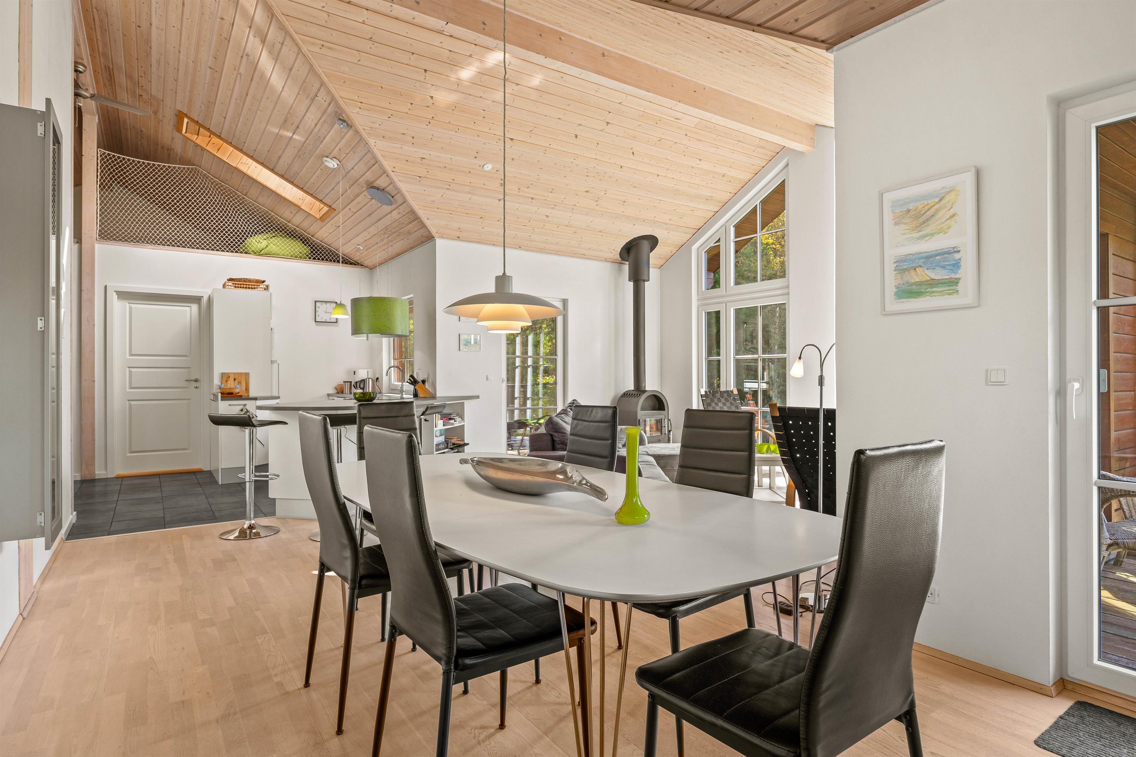 Straks når I træder ind i sommerhuset, føler I jer hjemme. Her er der højt til loftet og lyset fra både ovenlysvinduer og det store vinduesparti i stuen får det hele til at fremstå lyst og venligt, samt giver en skøn udsigt.