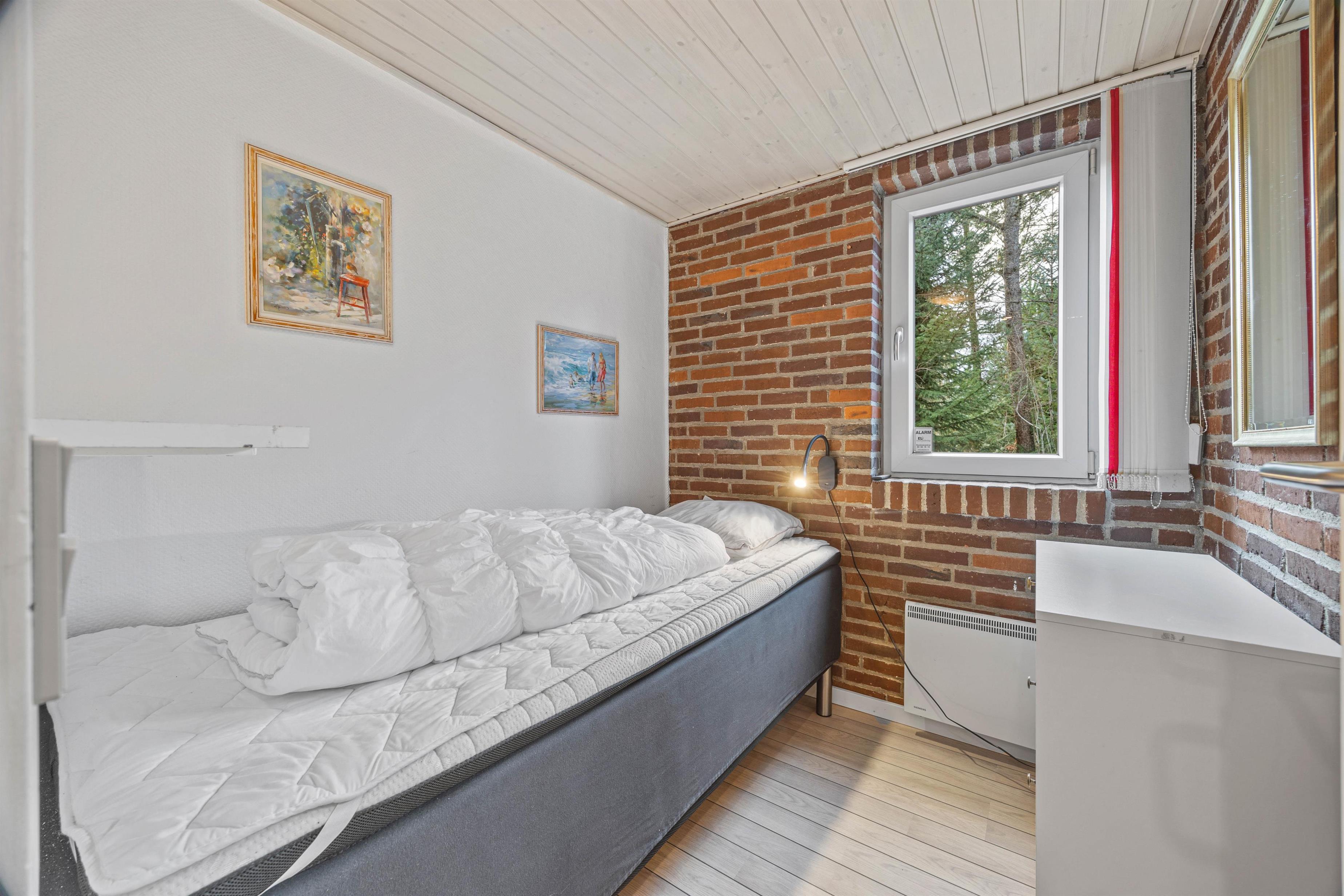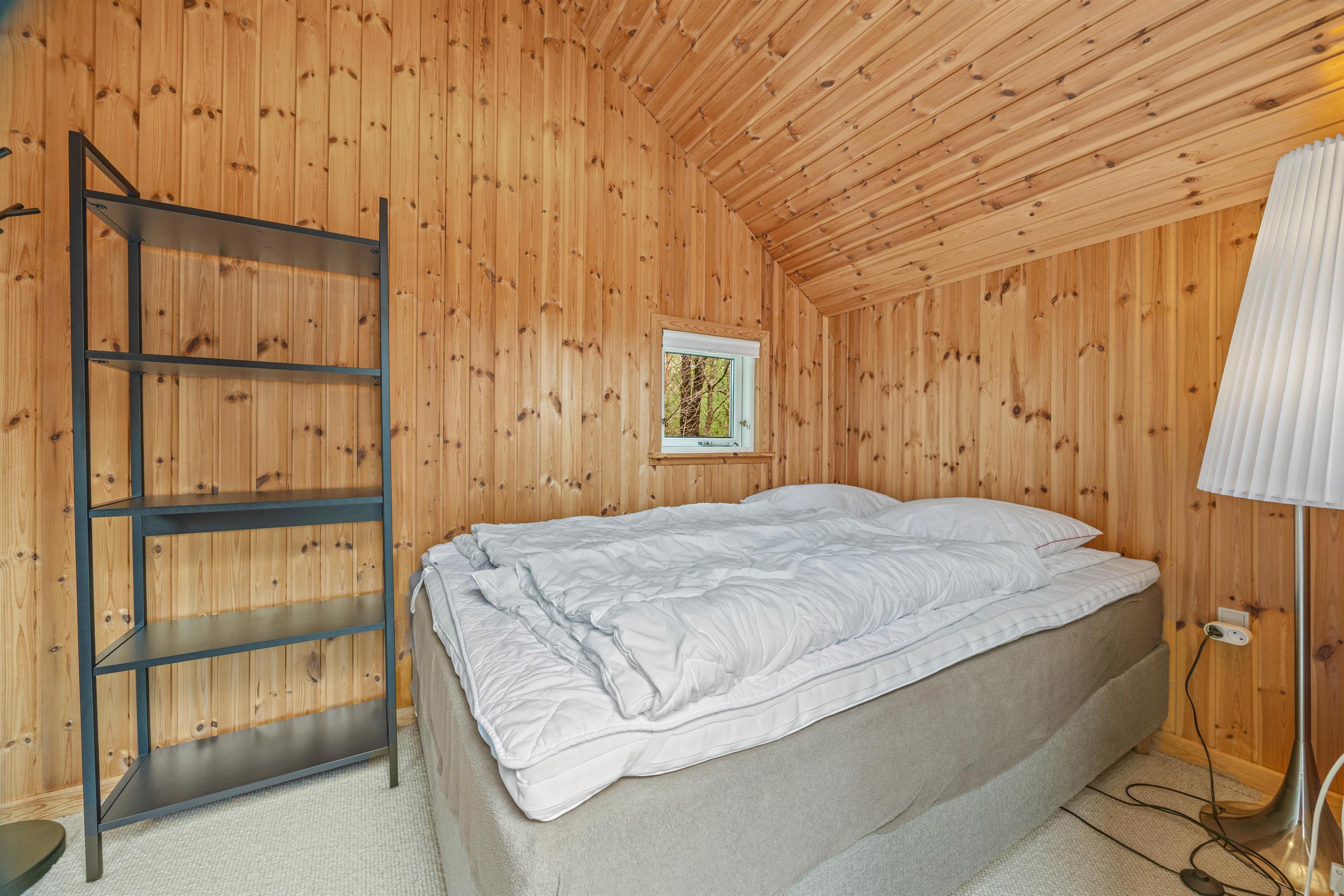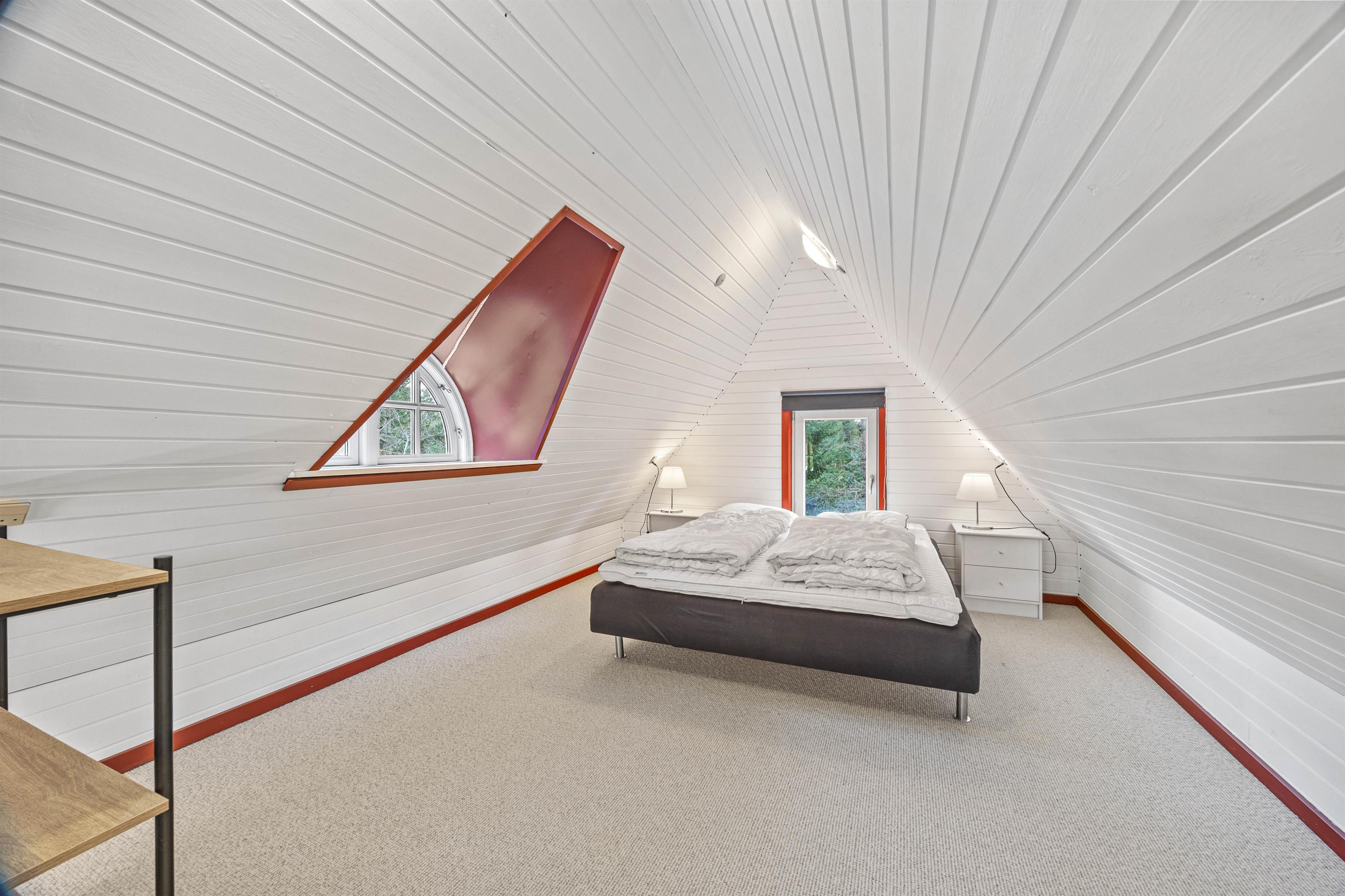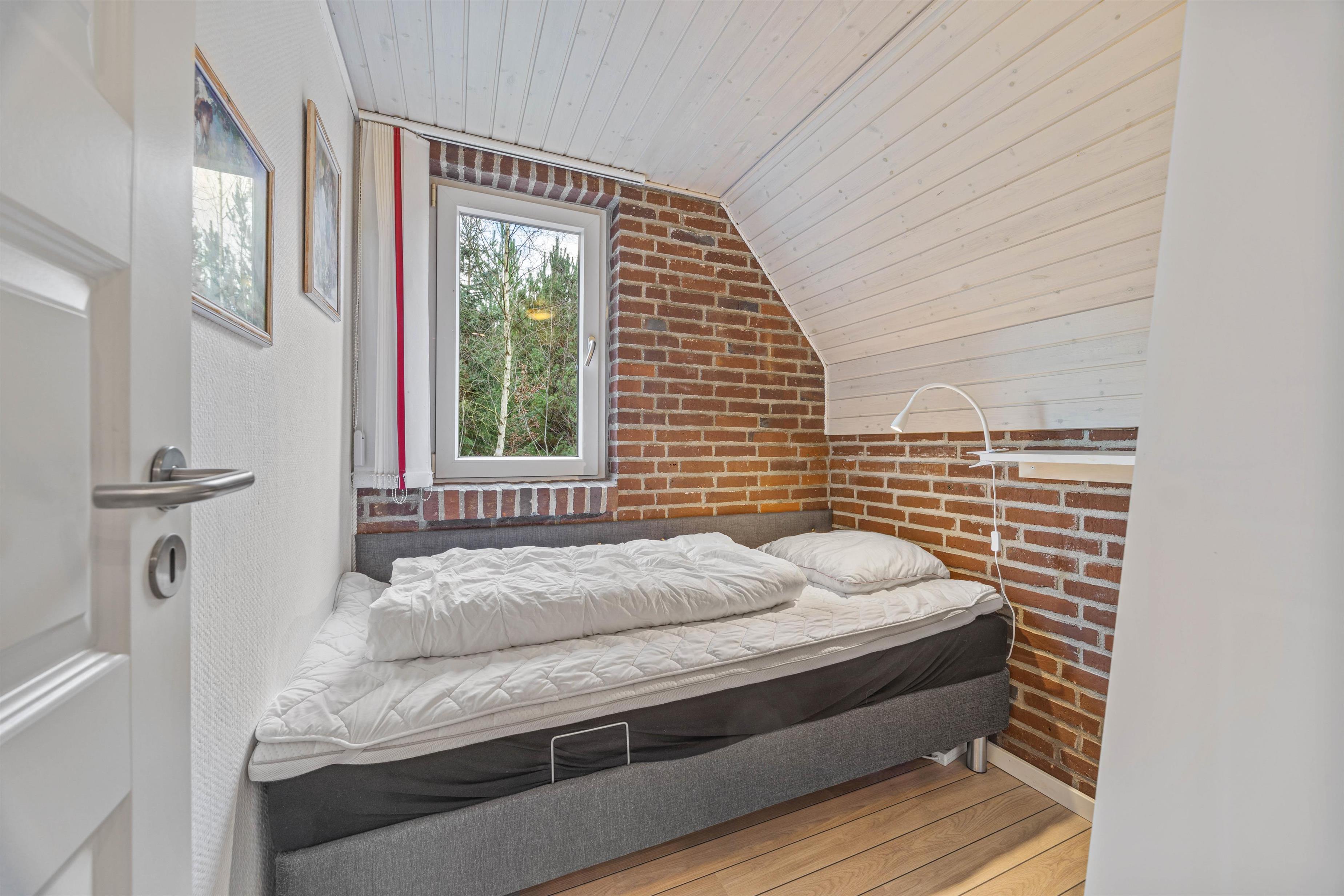 Sommerhuset byder på to soveværelser med komfortable enkeltsenge, mens I finder en dobbeltseng på den rummelige hems og yderligere en i annekset. Denne indretning passer perfekt til familier med store børn.