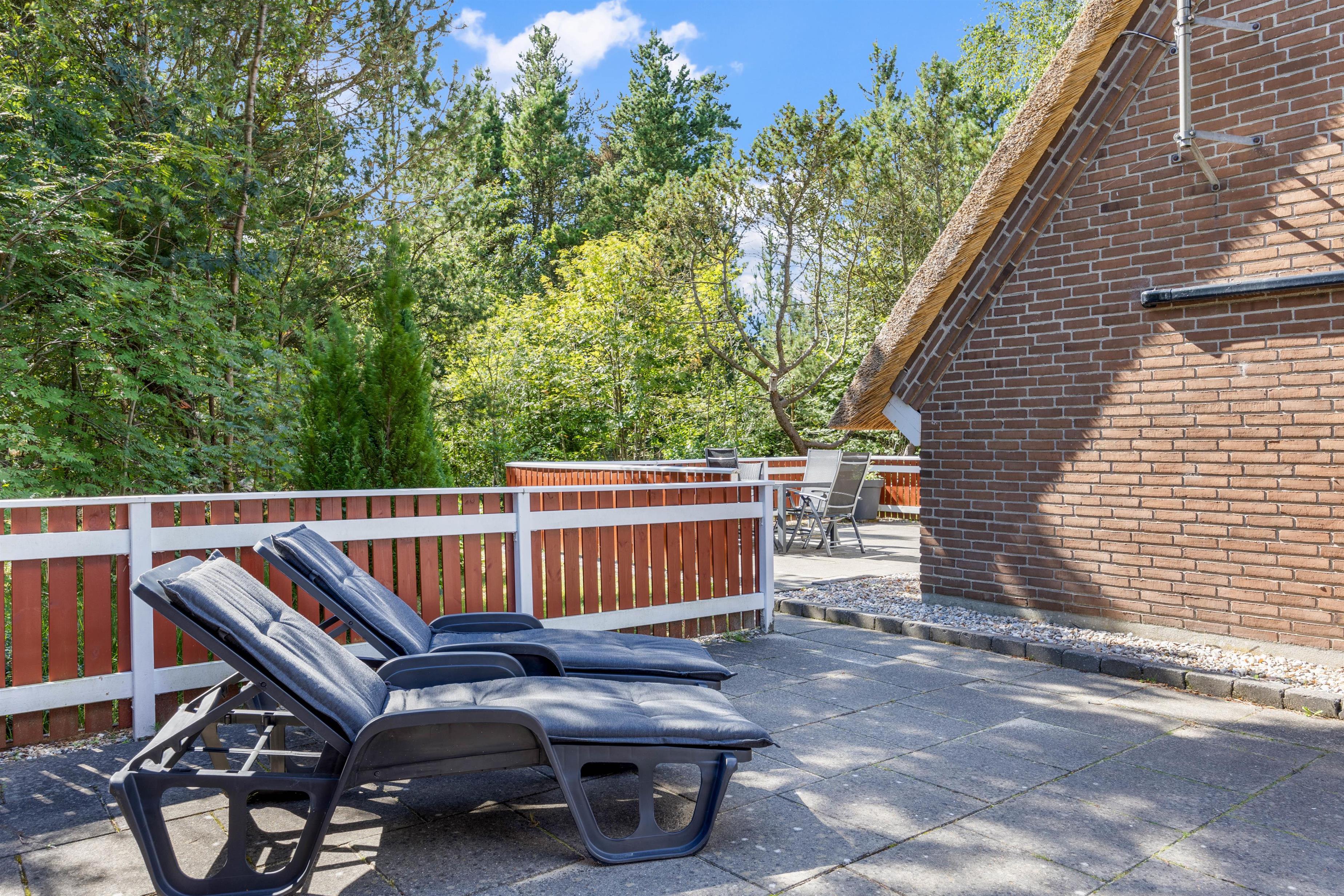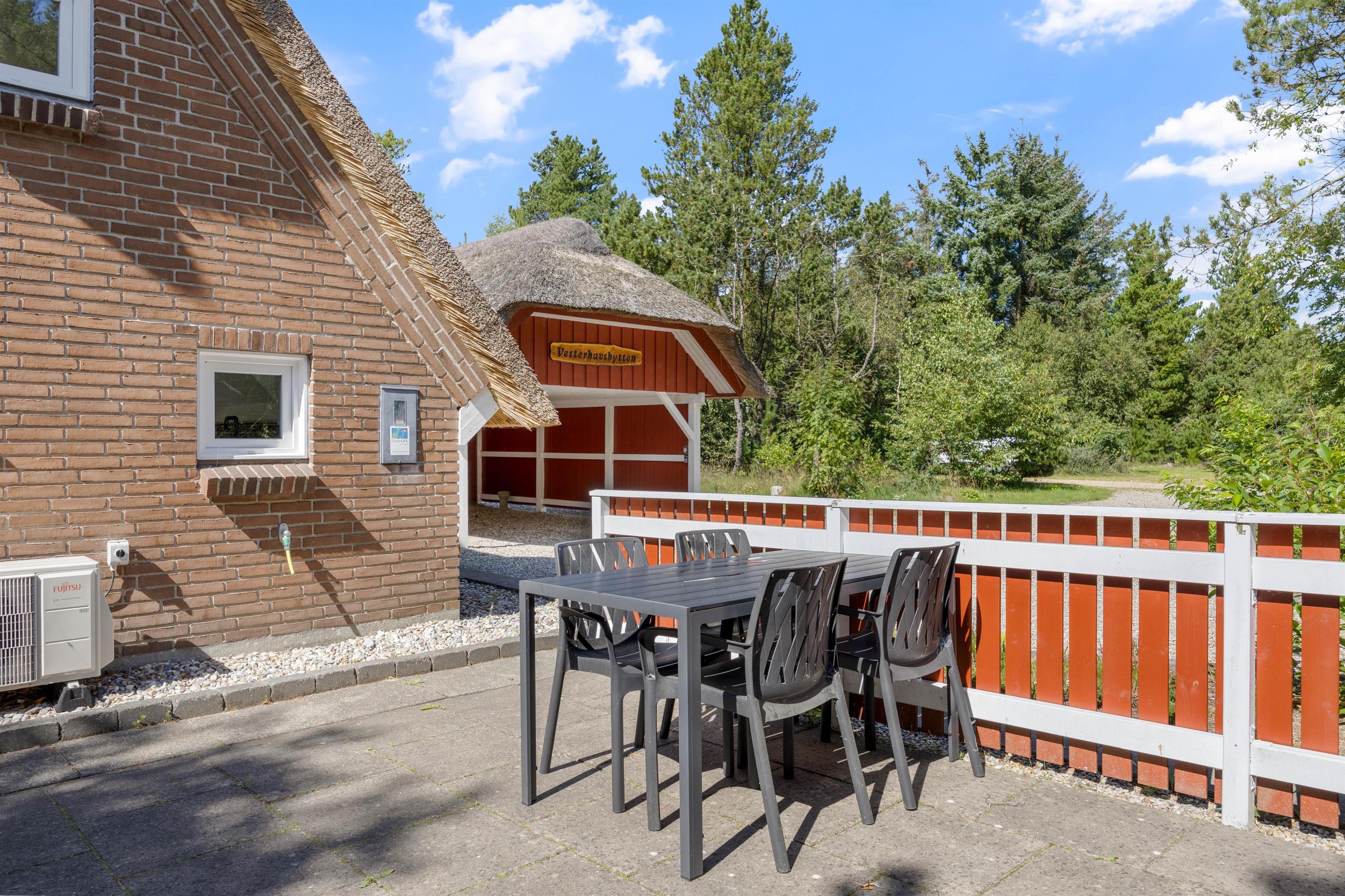 Fra stuen kan I træde ud på den åbne og delvist afskærmede terrasse, som er perfekt indrettet til en aften med madlavning og spisning under åben himmel. Her finder I alt, hvad I behøver for at nyde udendørs spisning, inklusive grill, havemøbler og faciliteter til både solrige dage med solseng og parasol.