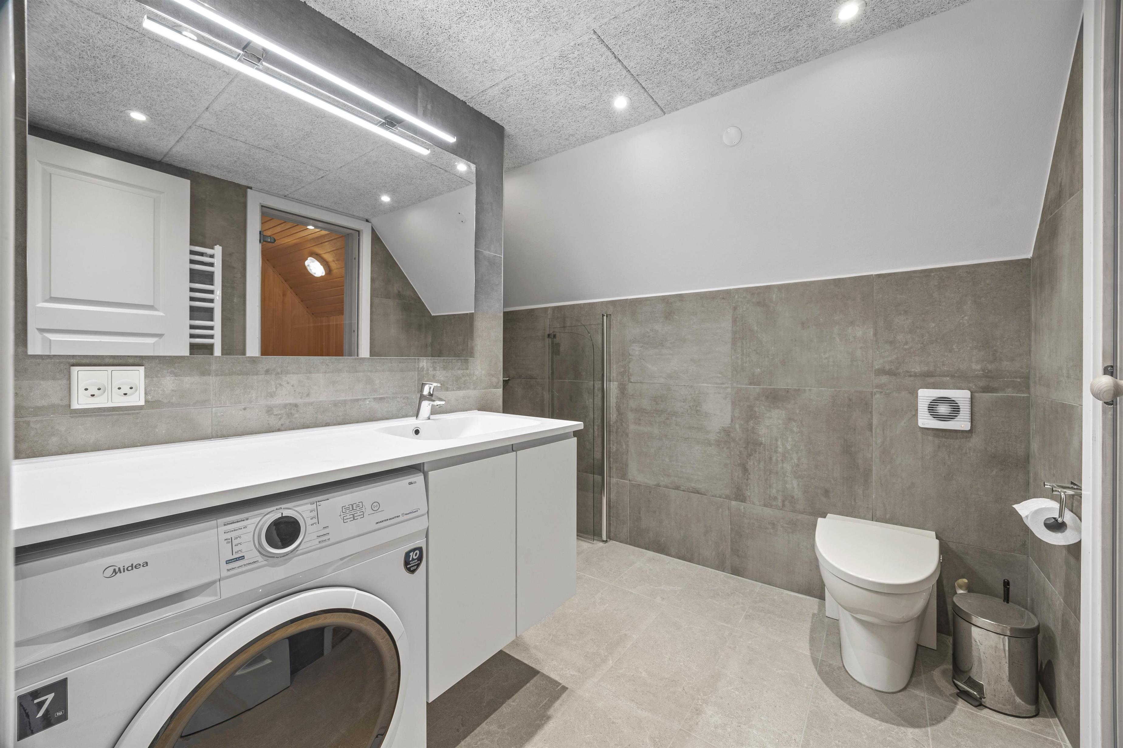 Badeværelset er udstyret med gulvvarme og en lækker sauna, hvor I kan slappe af og lade musklerne hvile efter en eventyrlig dag langs vestkysten. Den praktiske vaskemaskine sikrer, at I kan holde styr på garderoben under hele jeres ophold. Herudover er en energivenlig varmepumpe installeret, som bidrager til en behagelig og miljøvenlig boligoplevelse.