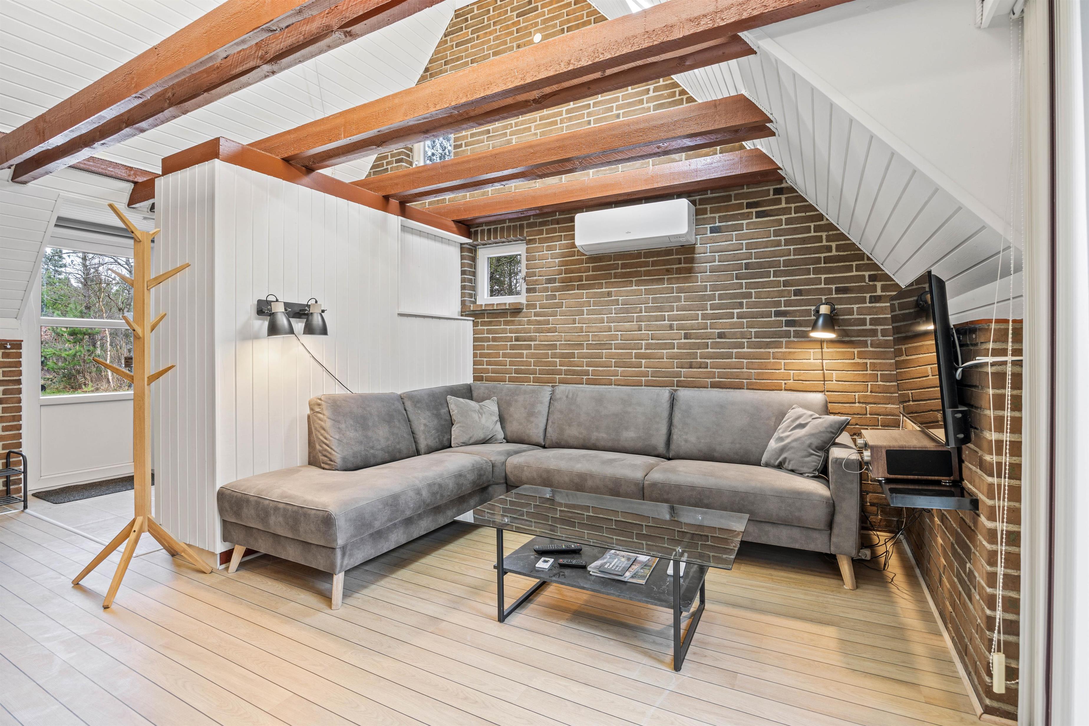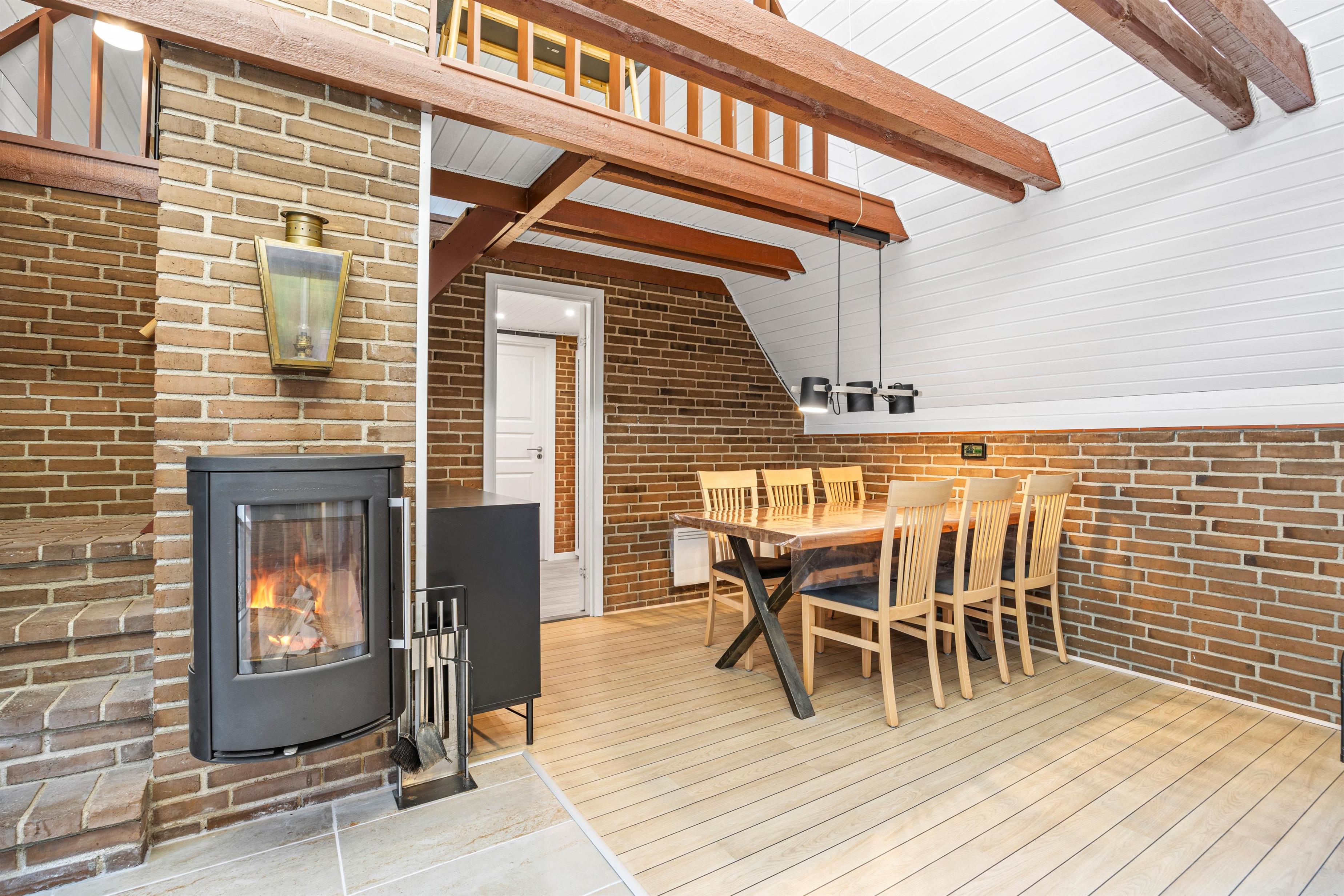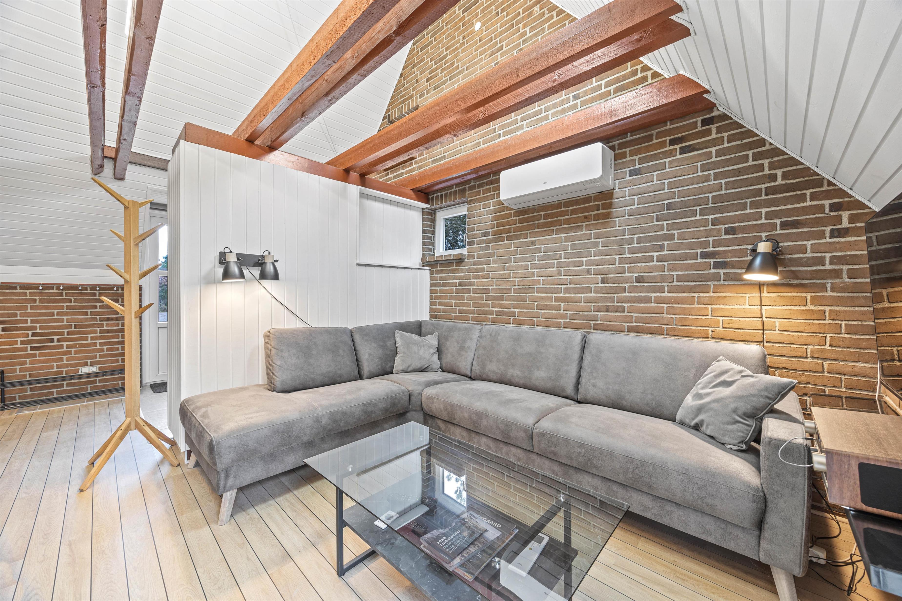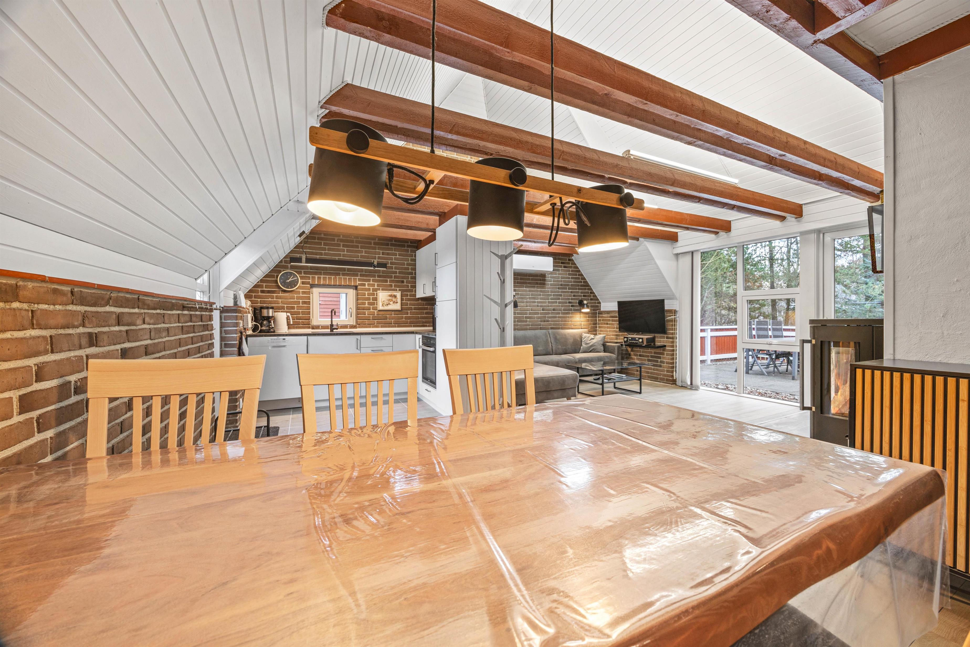 Indenfor er sommerhuset hyggeligt indrettet med frie bjælker, der tilføjer en rustik charme til rummene. I stuen finder I en stor sofa, der inviterer til afslapning for alle, hvor I kan nyde kvalitetstid med brætspil eller lade jer varme ved den hyggelige brændeovn.