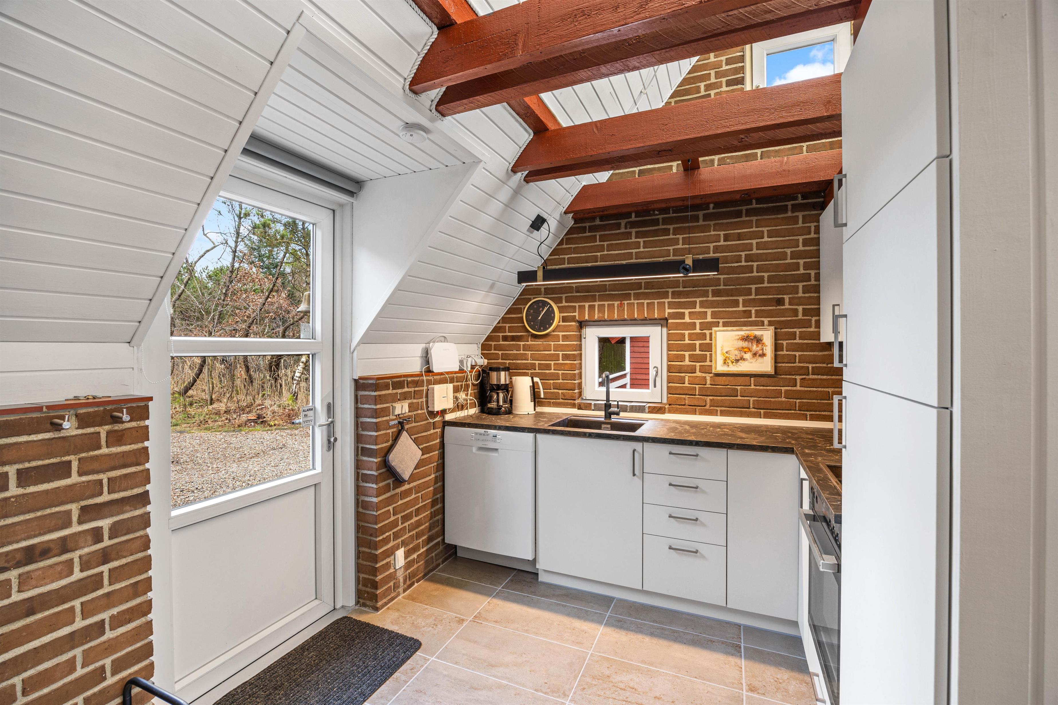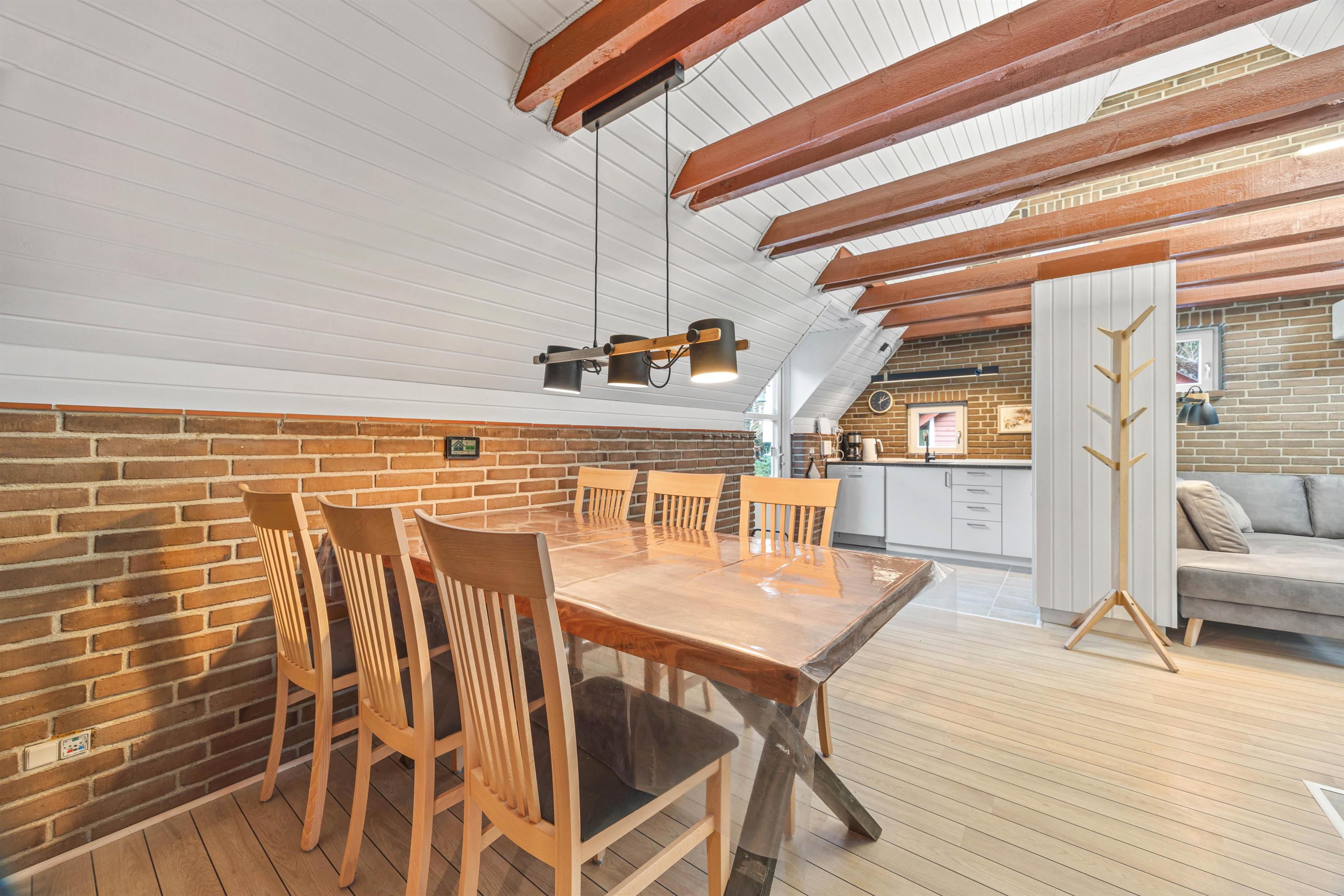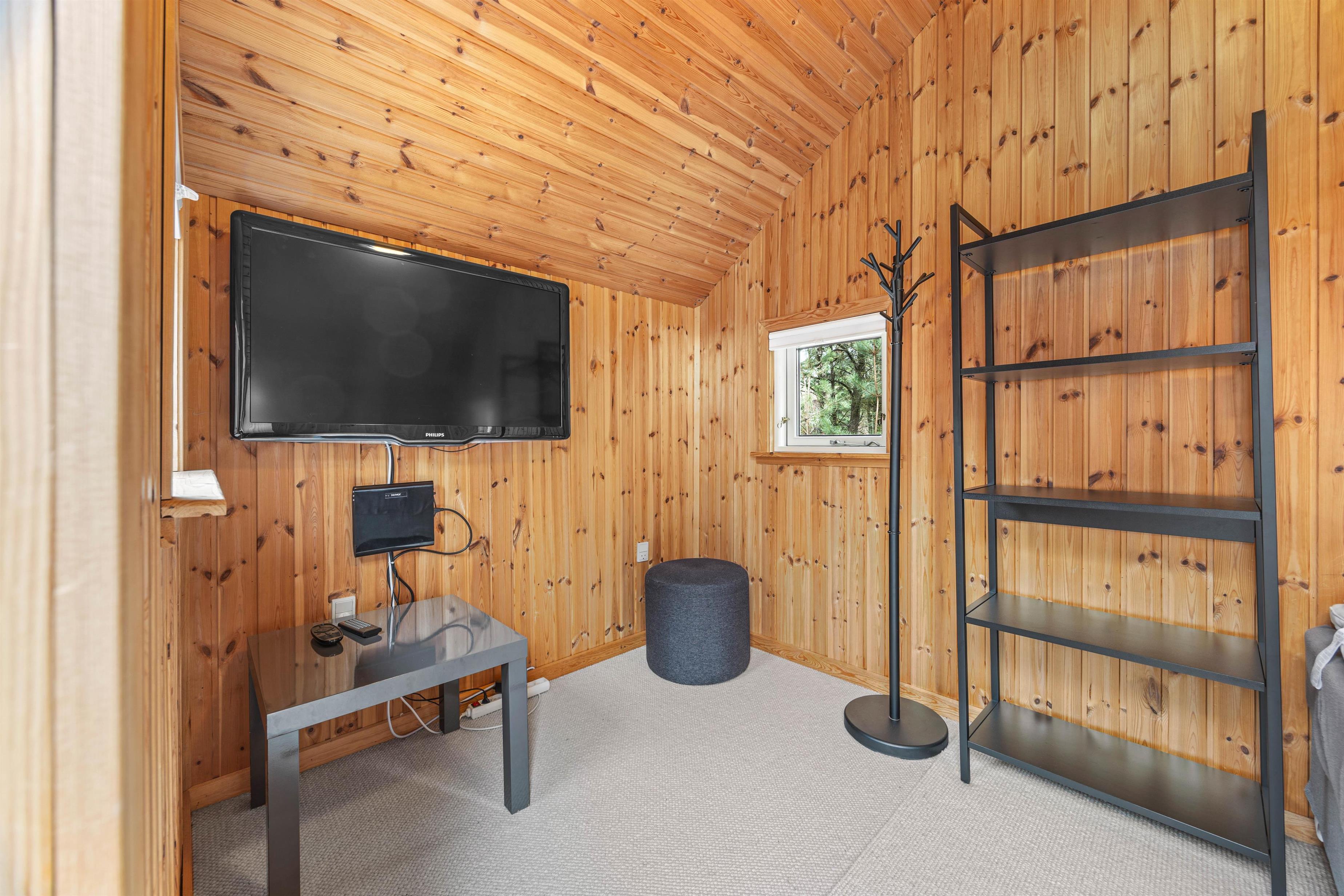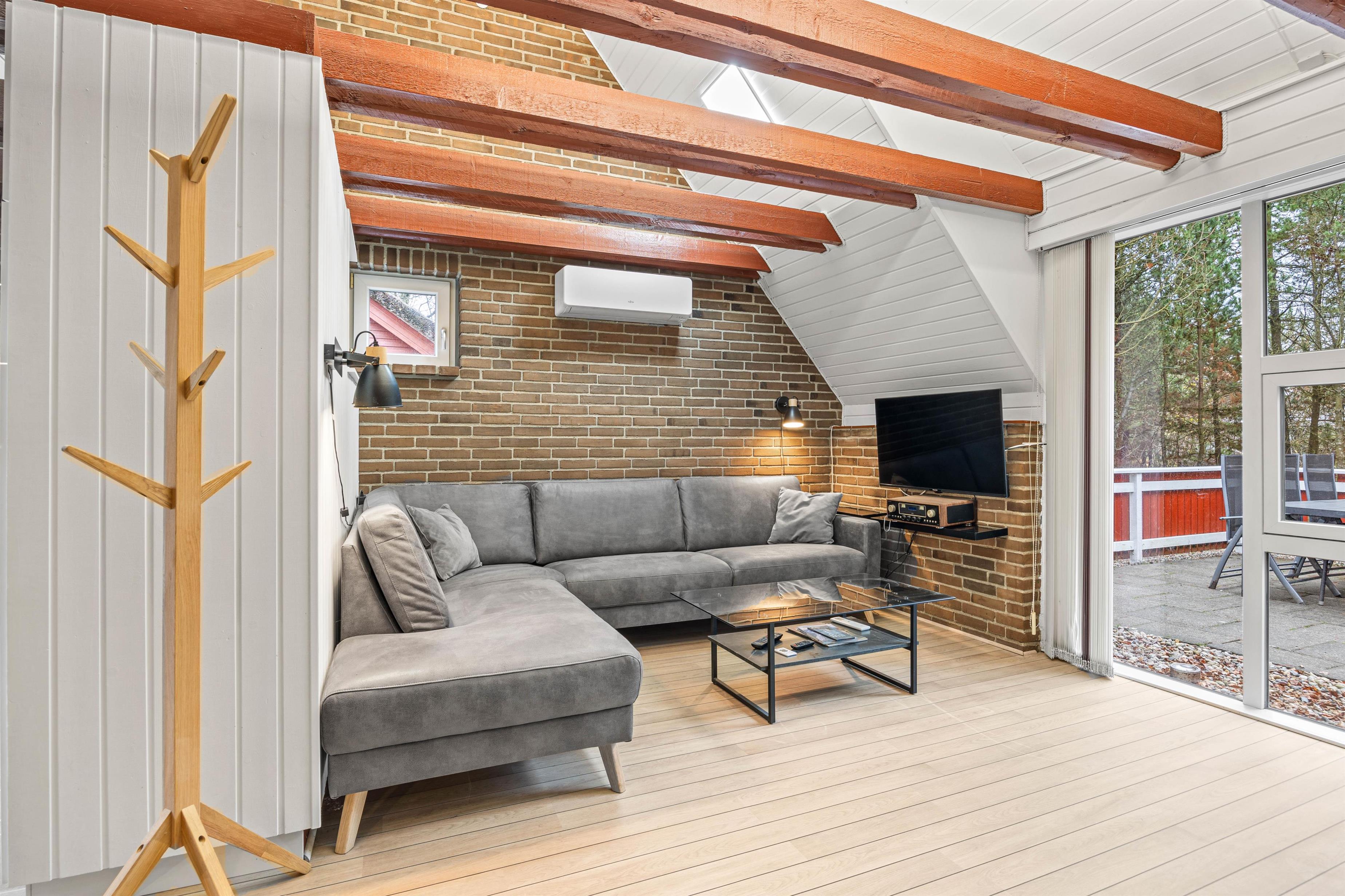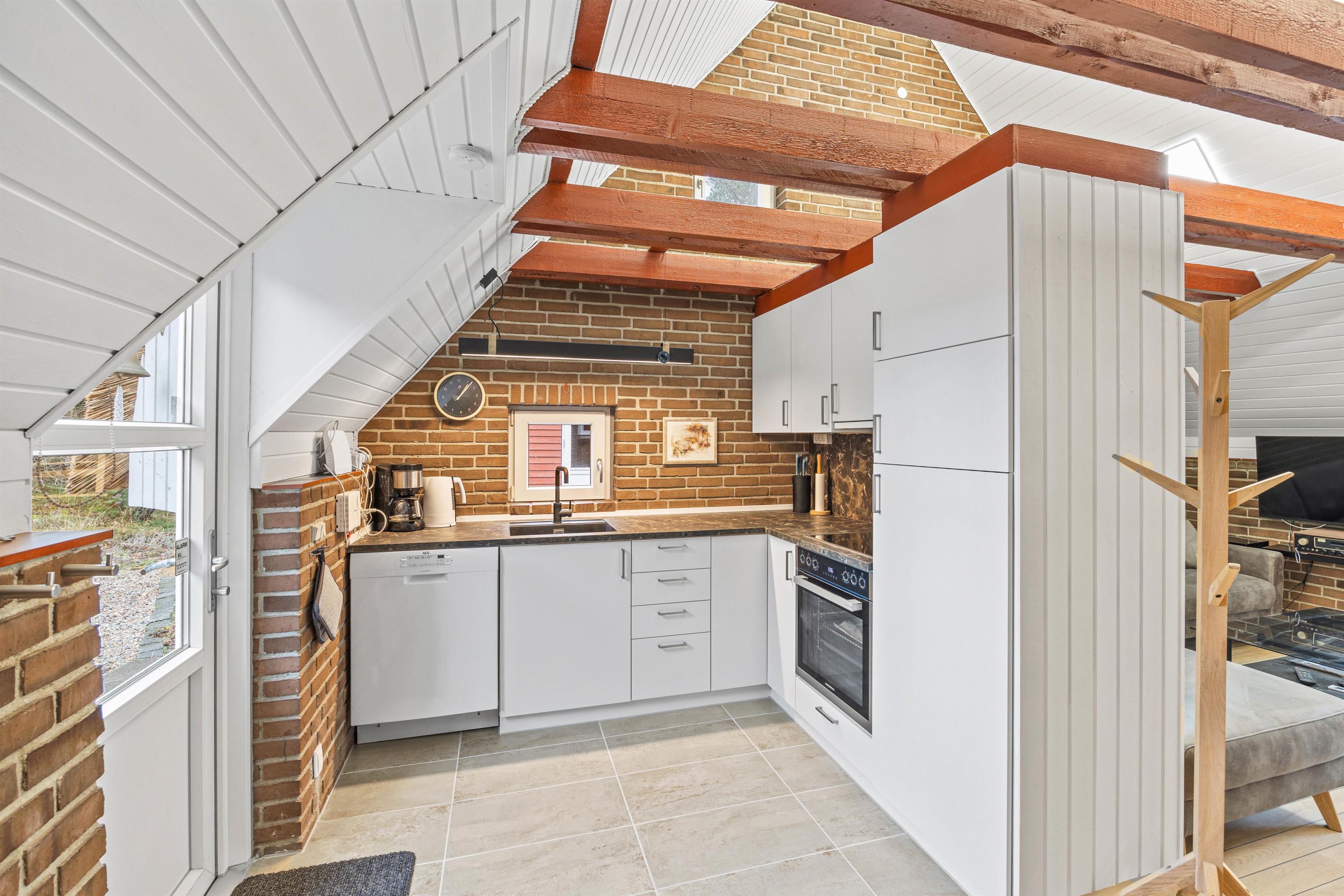 Indenfor er sommerhuset hyggeligt indrettet med frie bjælker, der tilføjer en rustik charme til rummene. I stuen finder I en stor sofa, der inviterer til afslapning for alle, hvor I kan nyde kvalitetstid med brætspil eller lade jer varme ved den hyggelige brændeovn.