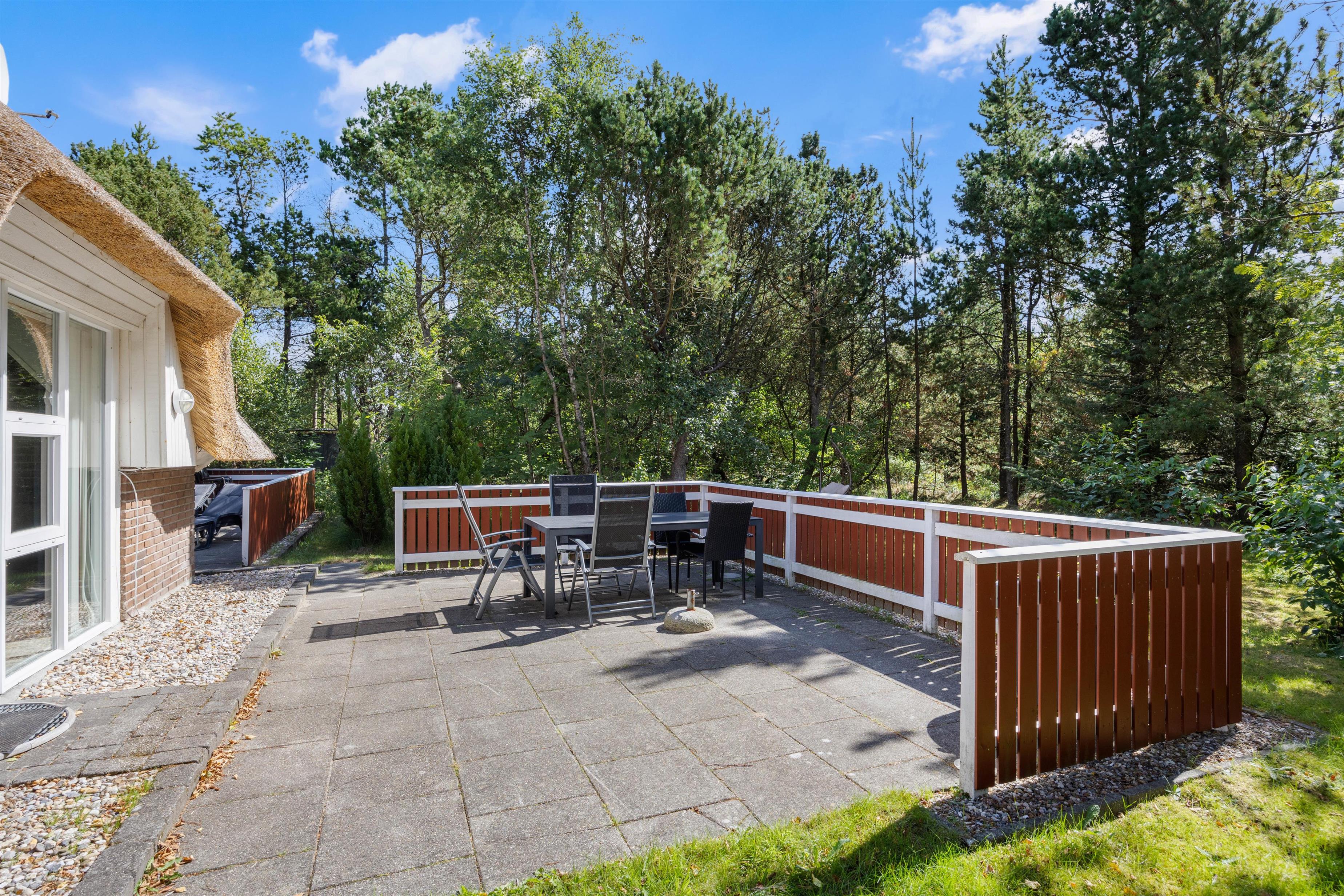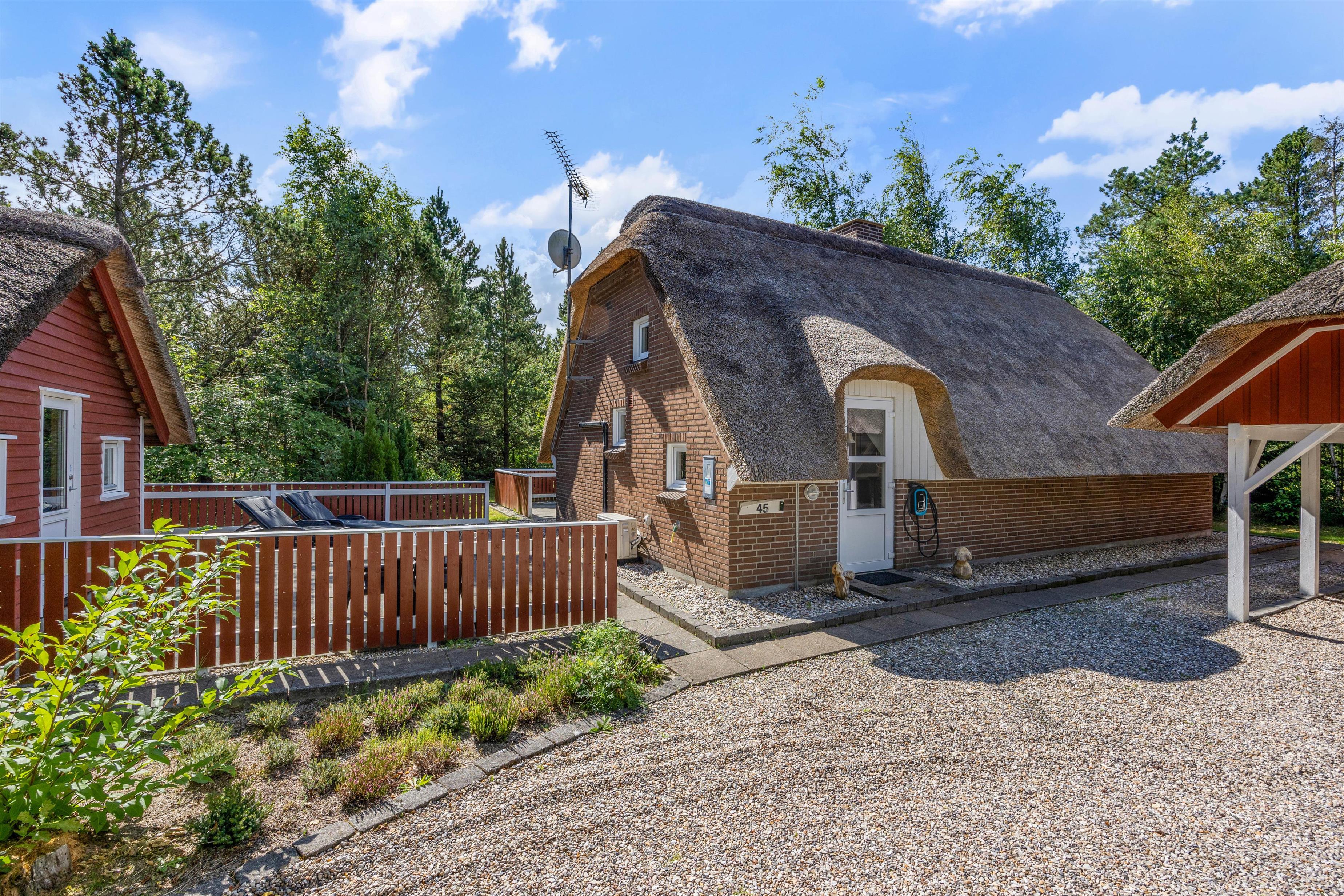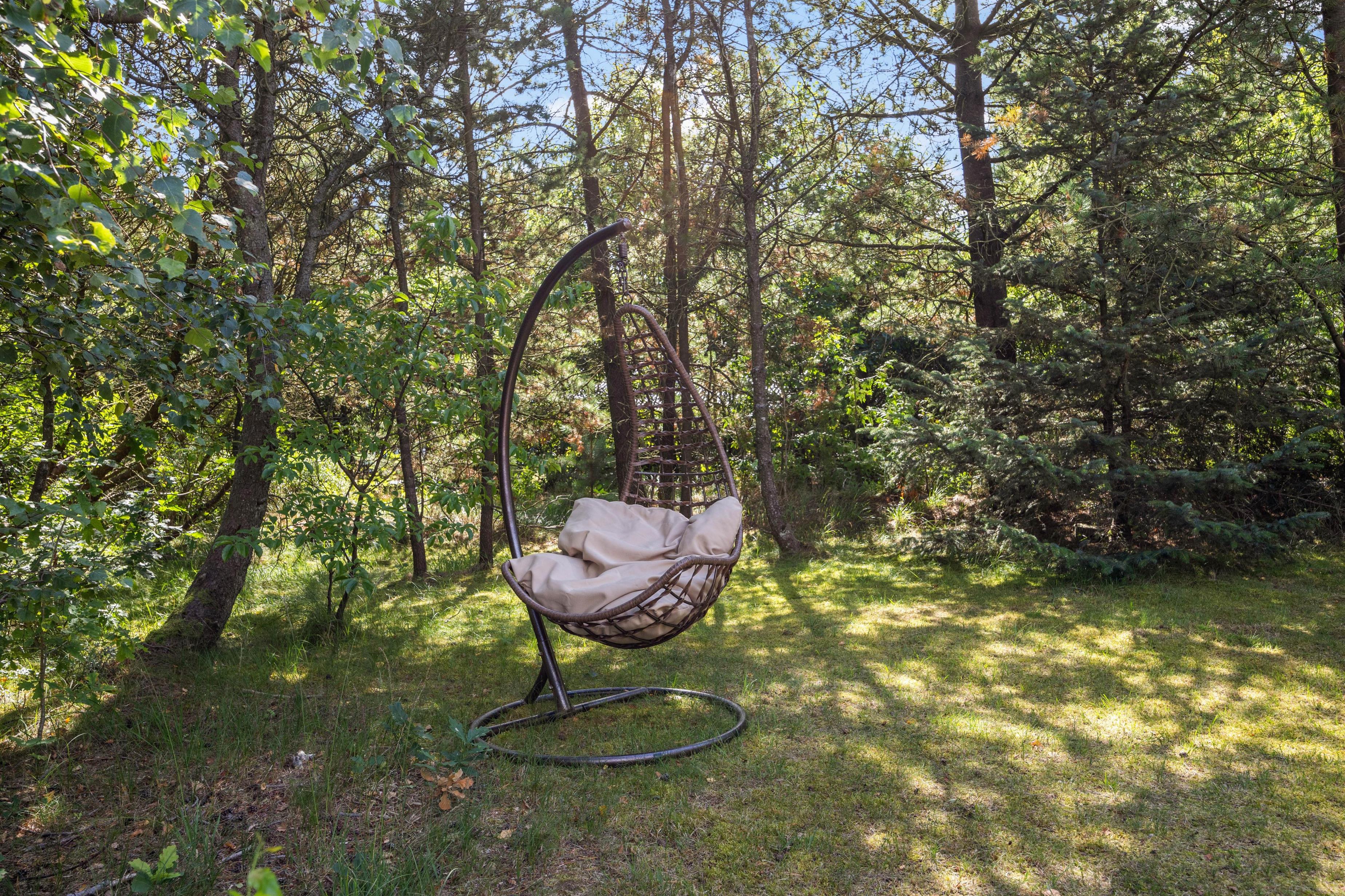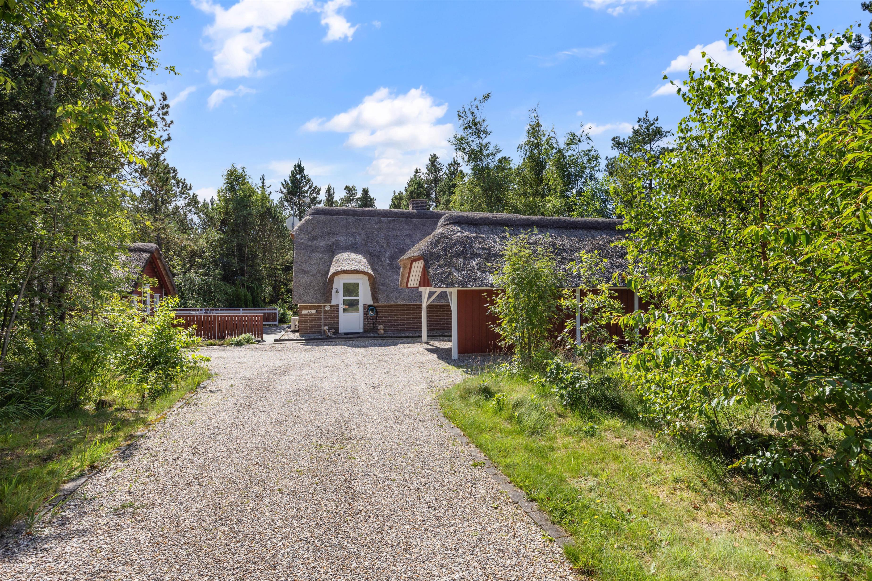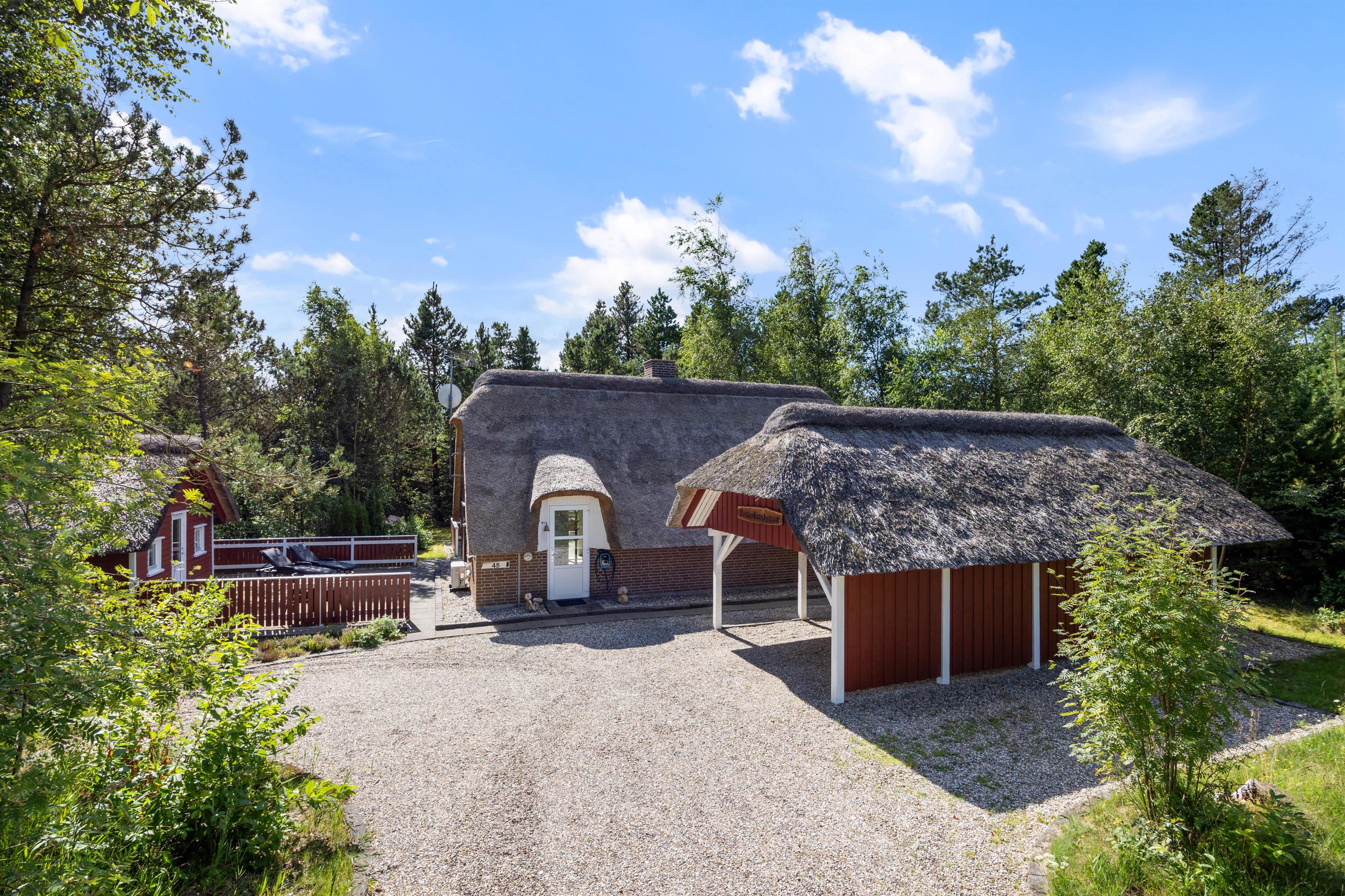Sommerhuset er omkranset af en skøn naturgrund, der inviterer til spontane møder med skovens vilde dyr. Der er flere hyggelige kroge rundt om sommerhuset, hvor I kan nyde morgenkaffen og den stille natur. En carport sikrer, at jeres bil står trygt og sikkert, mens den lader op til kommende eventyr.