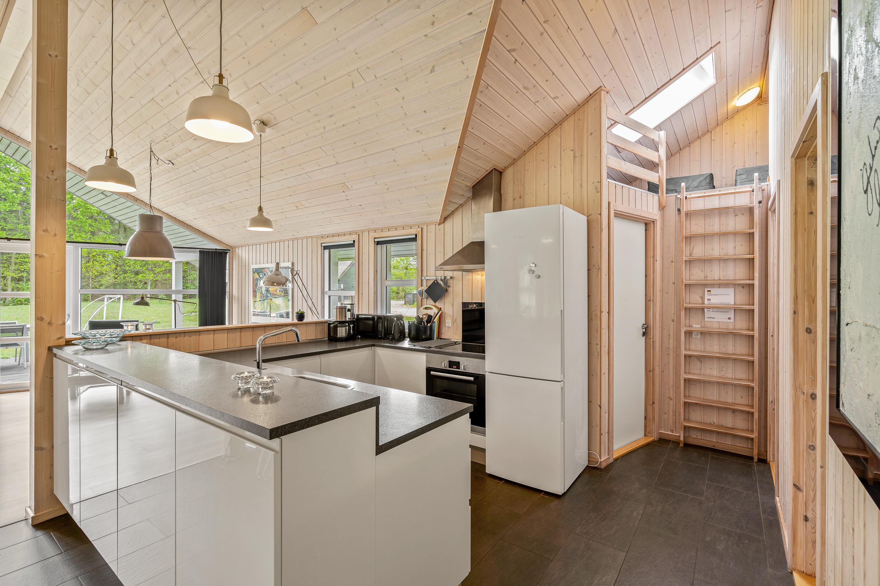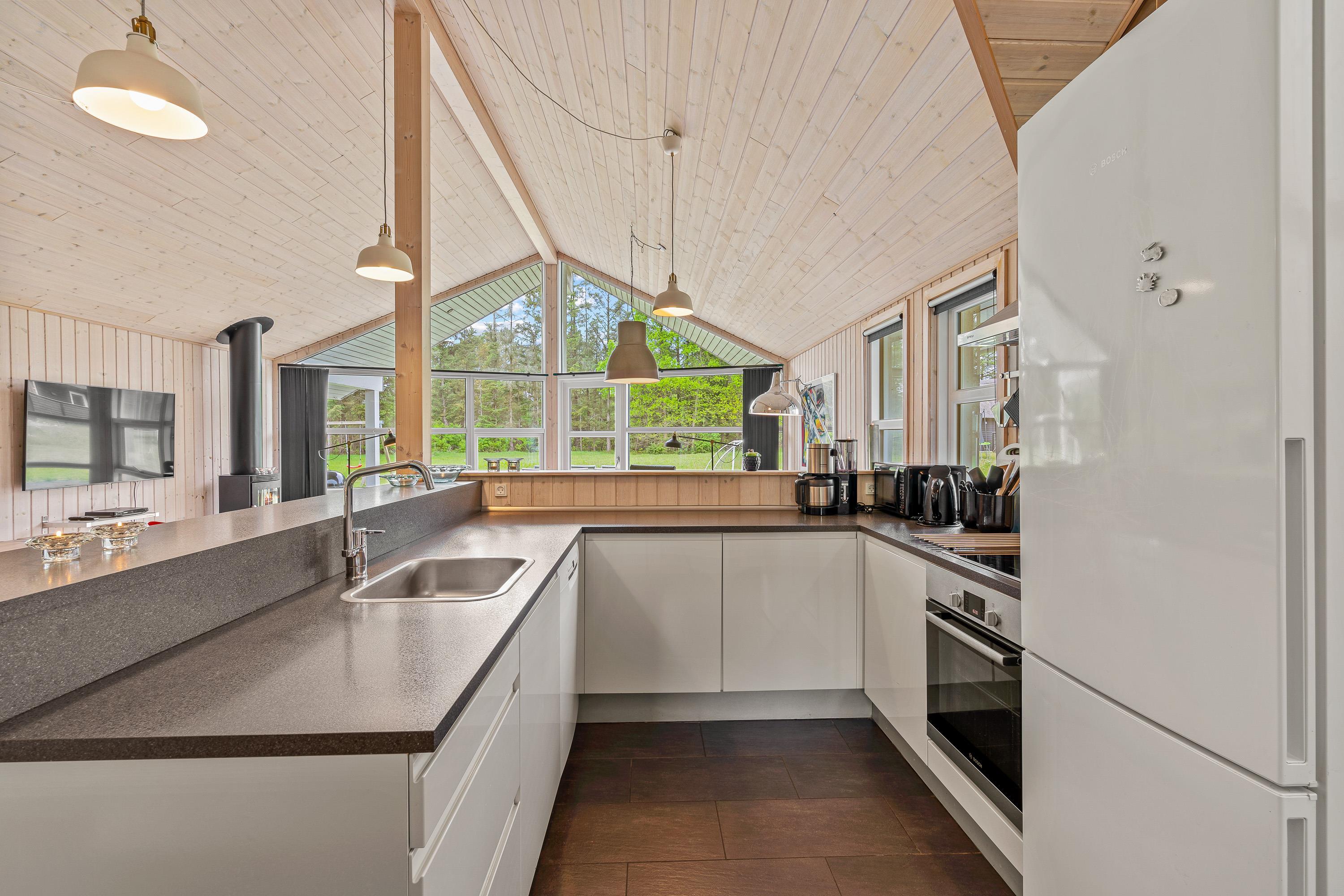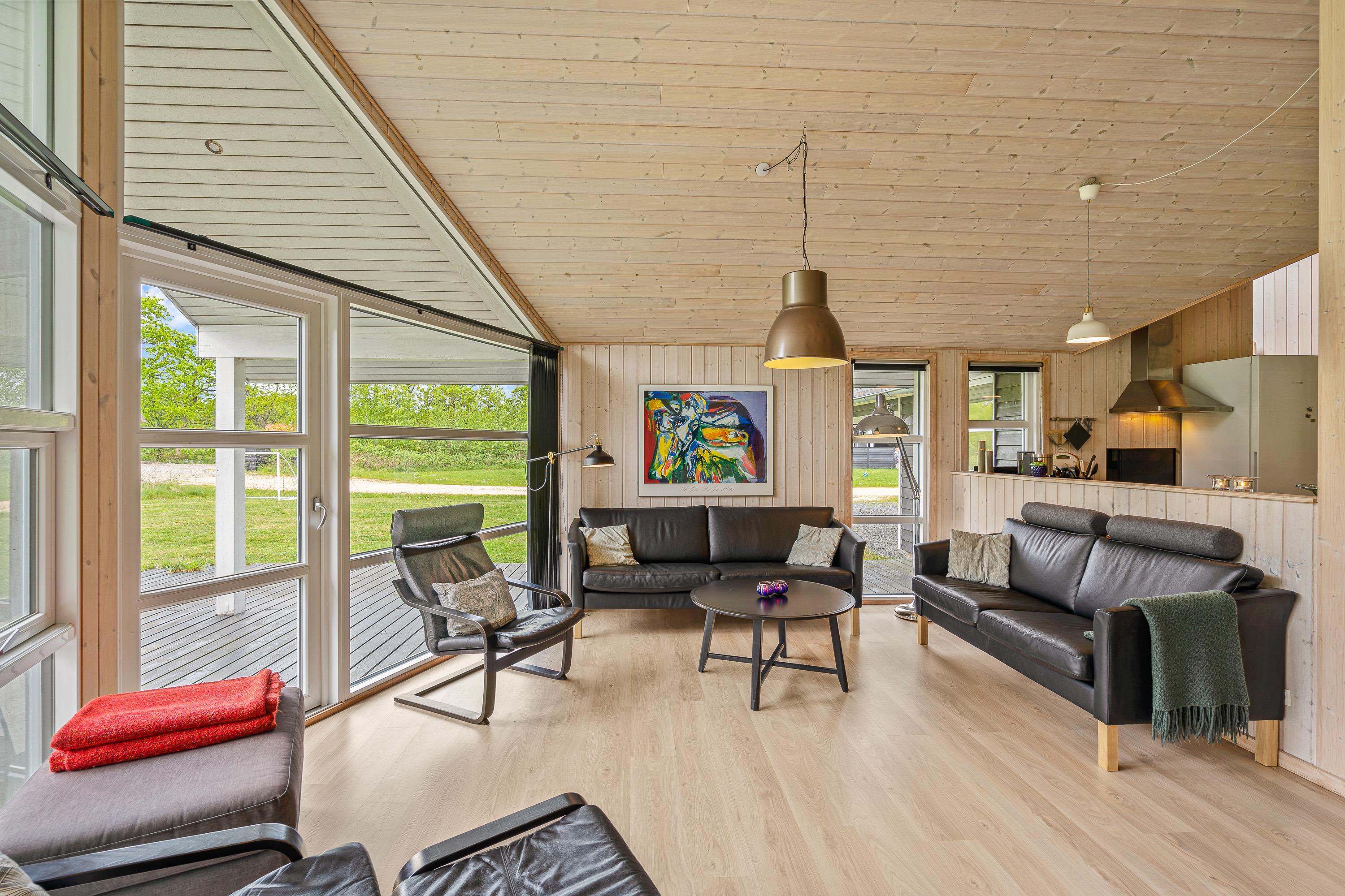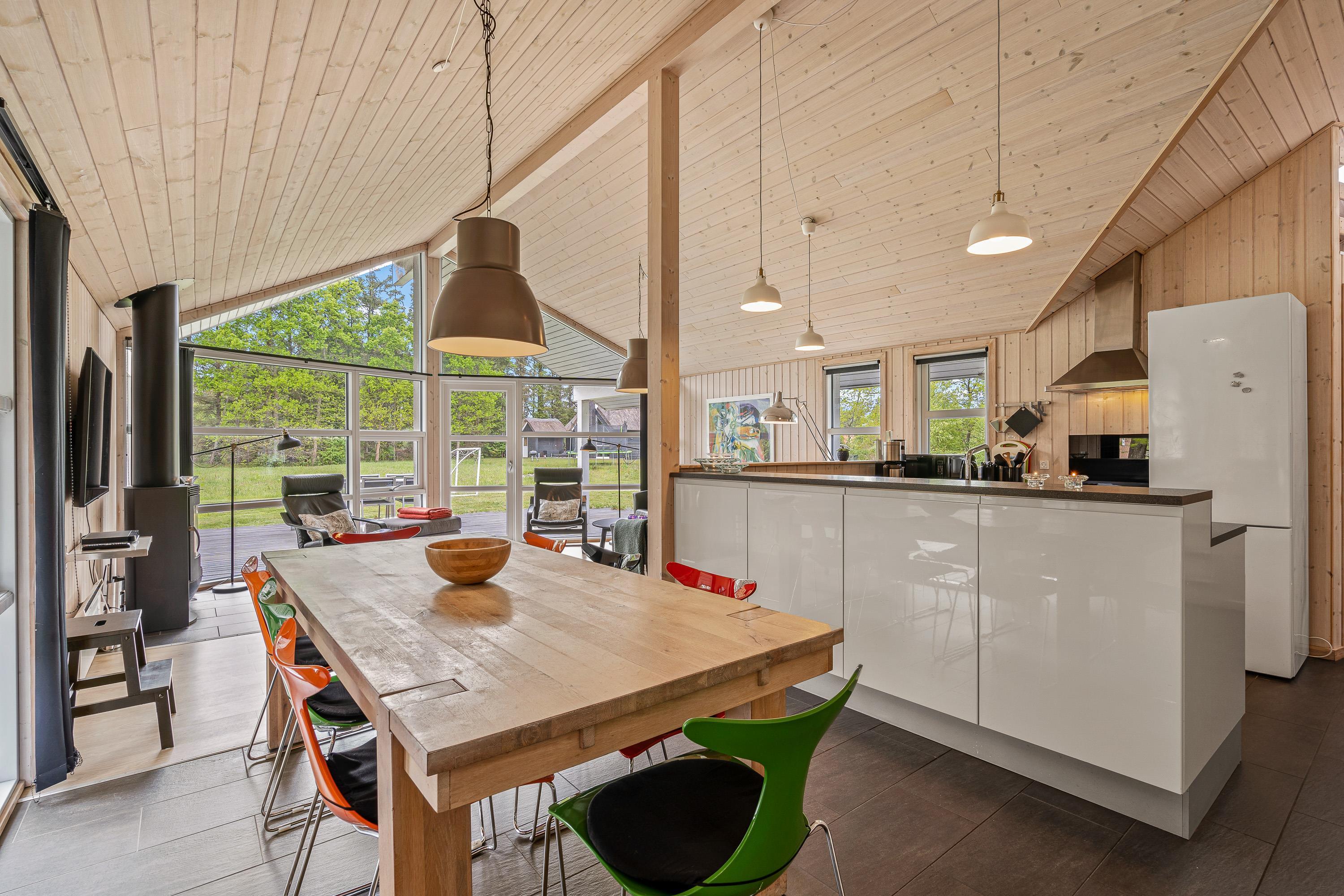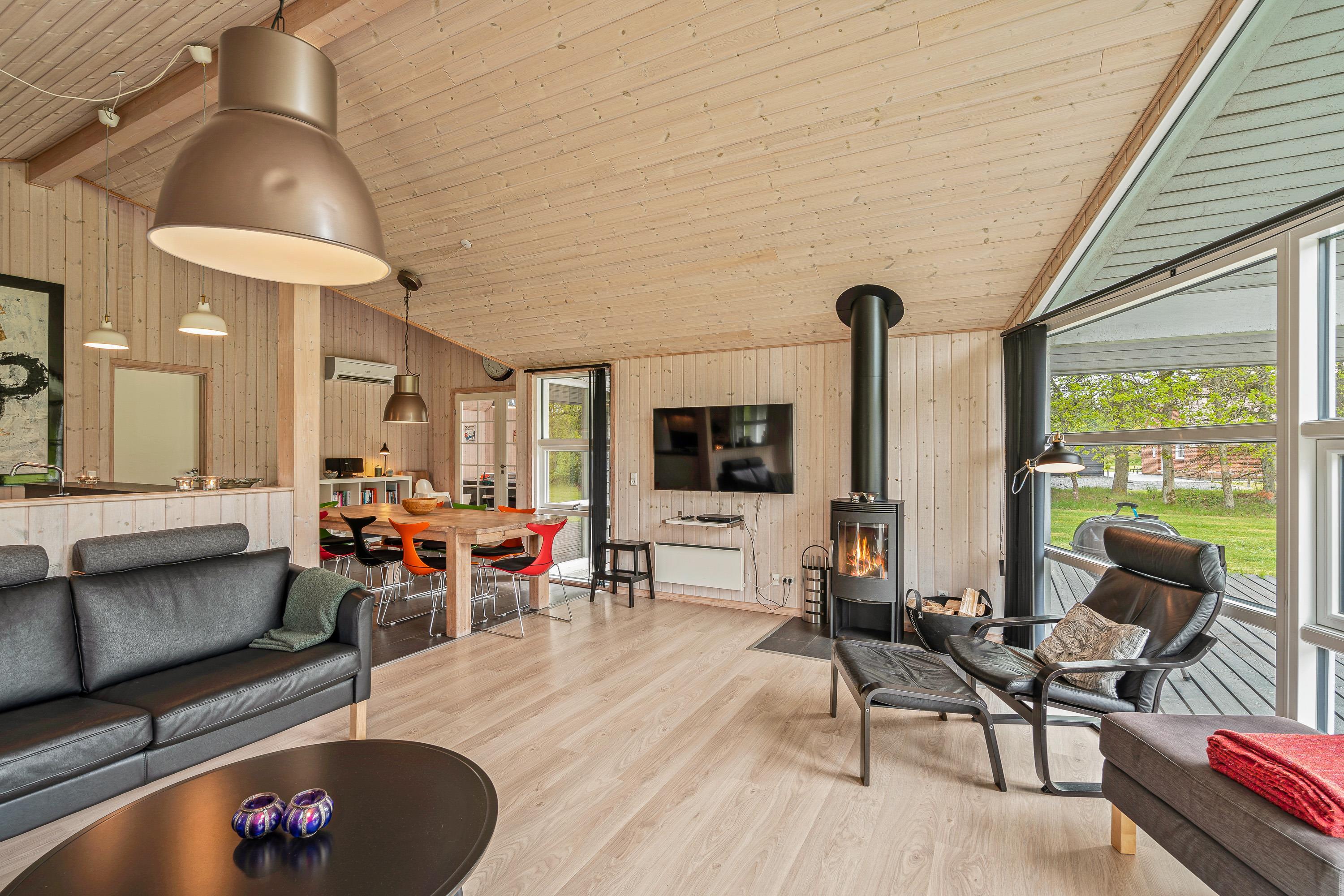 Til hyggelige feriestunder for hele ferieflokken kan I samles i alrummet. Her er køkken, stue og spiseplads forenet, og selv når nogle står i køkkenet, mens andre slapper af i sofaerne, kan I nyde hinandens selskab. Samtidig sørger brændeovnen med sin knitren for at fuldende den hyggelige feriestemning. Desuden er der gulvvarme i den del af stuen hvor der er klinker stuen.