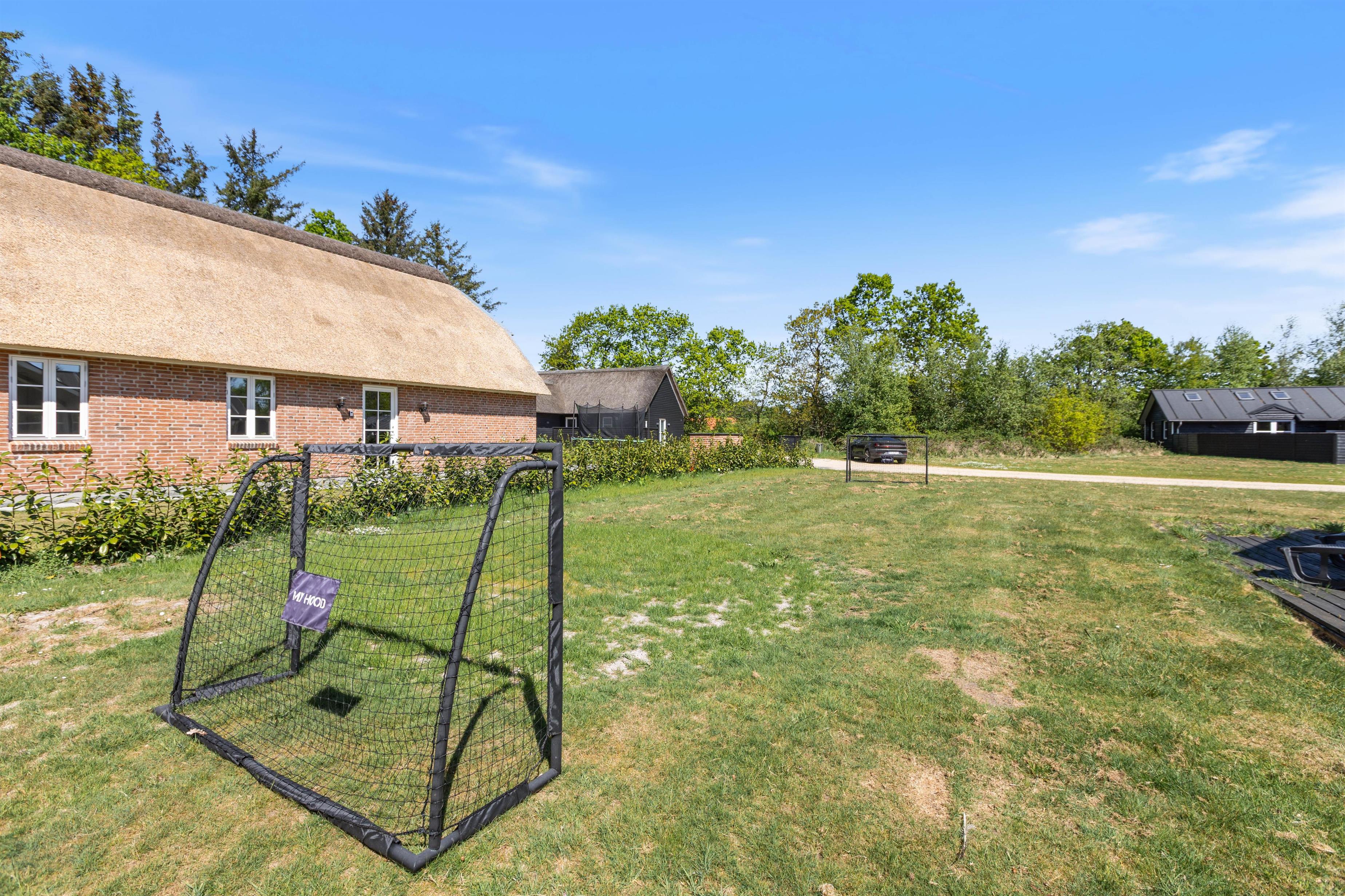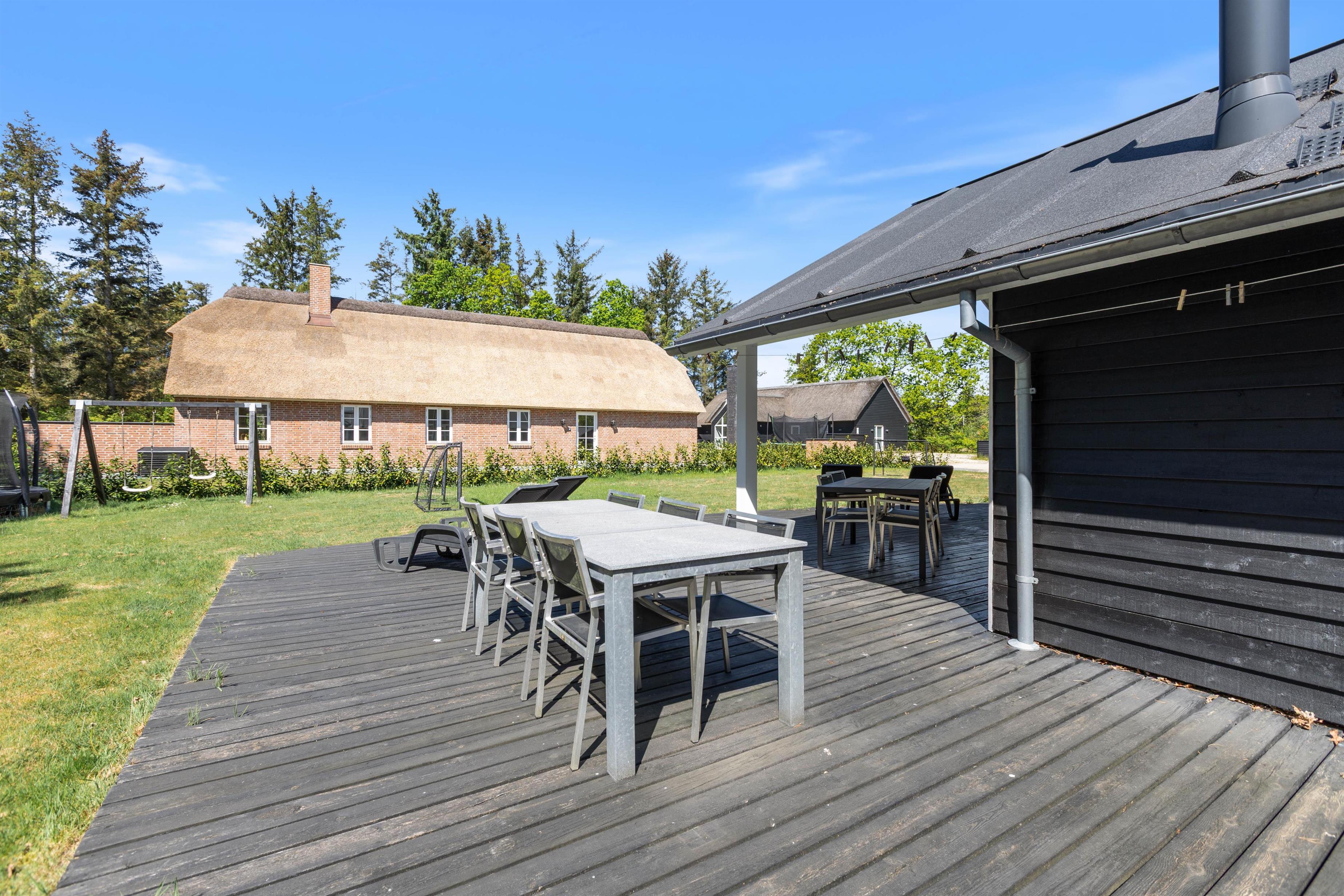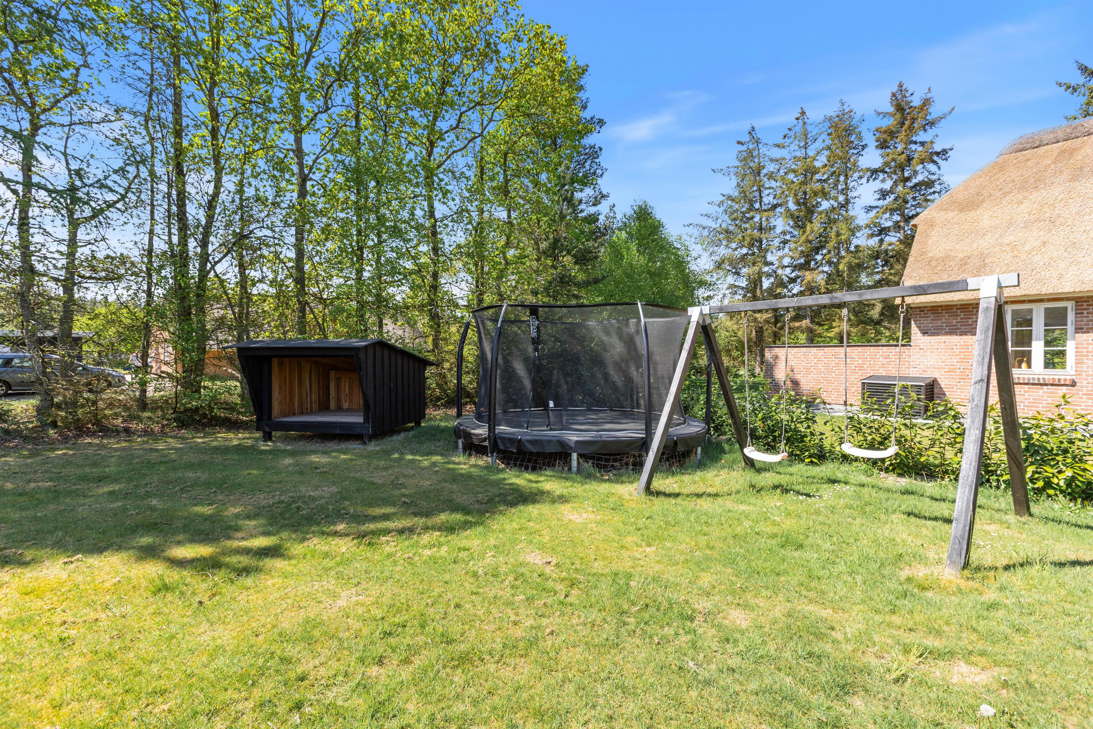 Til feriens yngste er der en mindre legeplads i form af gyngestativ, sandkasse og trampolin, som de kan få glæde af på jeres ferie. Mens de leger i haven, kan I andre slappe af på terrassen, der er delvist overdækket. Når aftenen nærmer sig, kan I tænde op i grillen og samle hele ferieflokken til en lækker middag på terrassen.