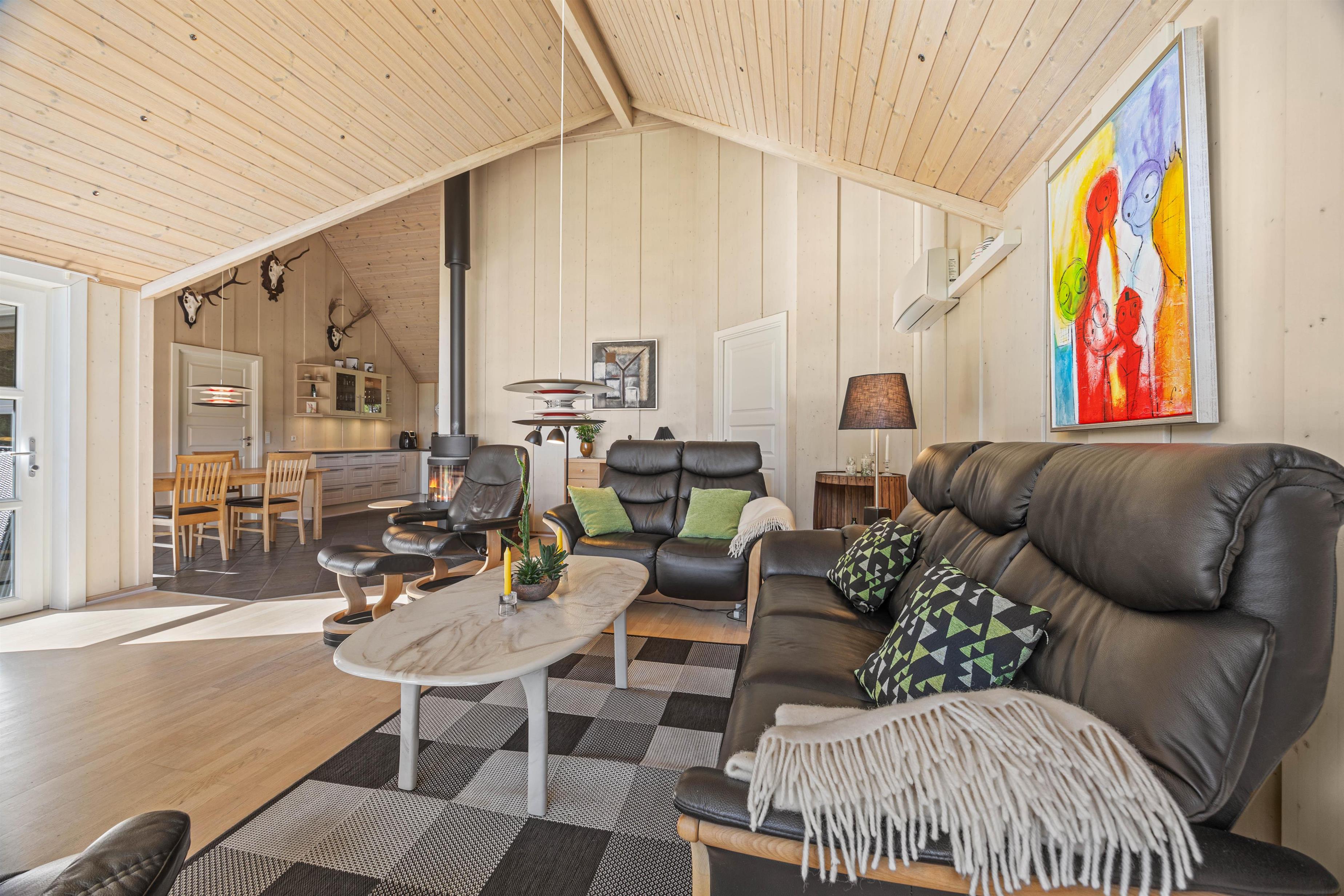 Det største wow vil du sikkert opleve, når du træder ind i husets hjerte – dets opholdsrum med stue, køkken og den store spiseplads. Her kan hele familien føle sig veltilpas, lave mad og spise sammen eller bare slappe af. Indretningen er gennemført stilfuld, bekvem og hyggelig – sæt jer til rette i de bekvemme lænestole eller den store sofa og bare nyd udsigten over eng, hede og skoven gennem det store panoramavindue – og få chancen for at se både rådyr-, krondyr, ræv og store rovfugle på nært hold.