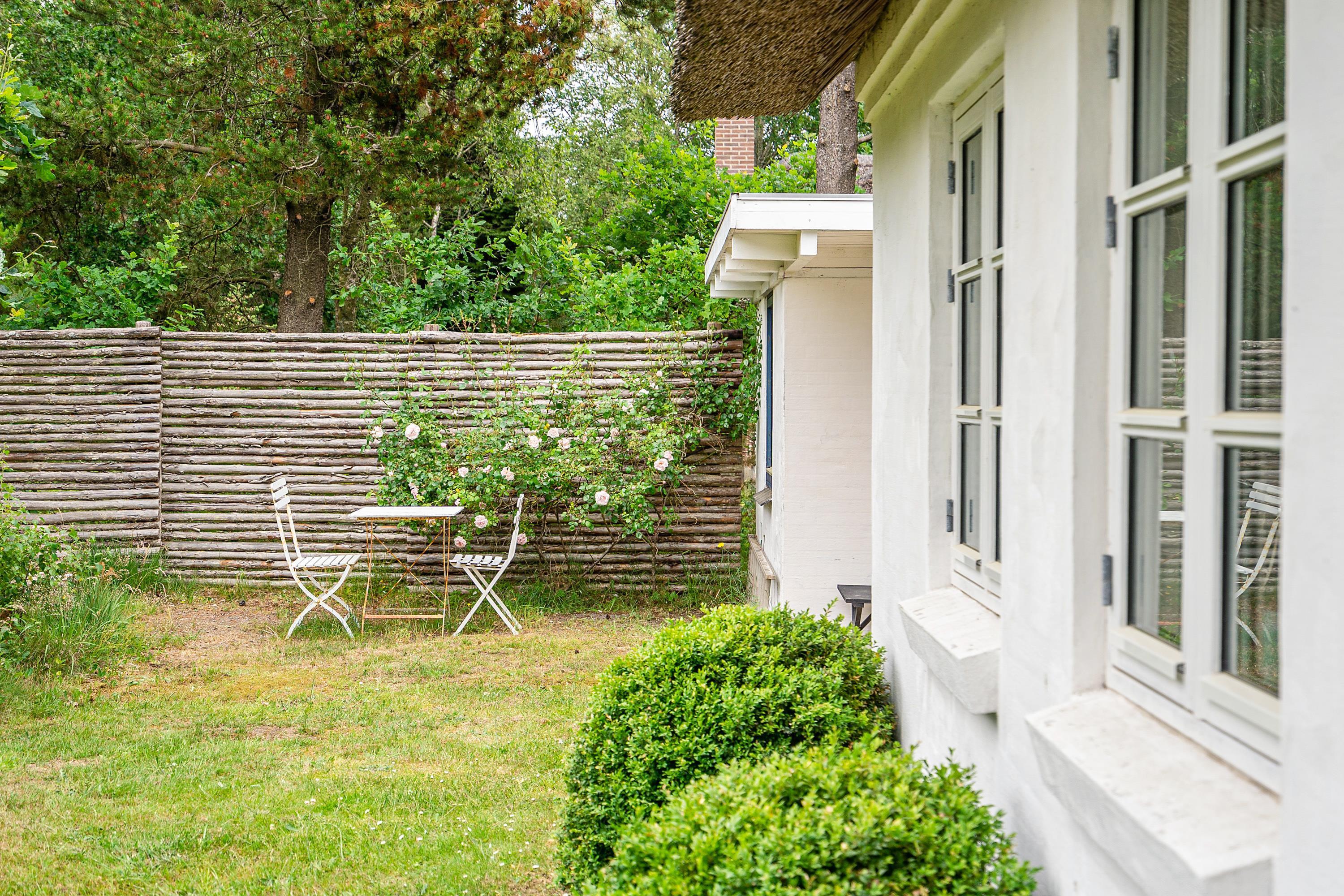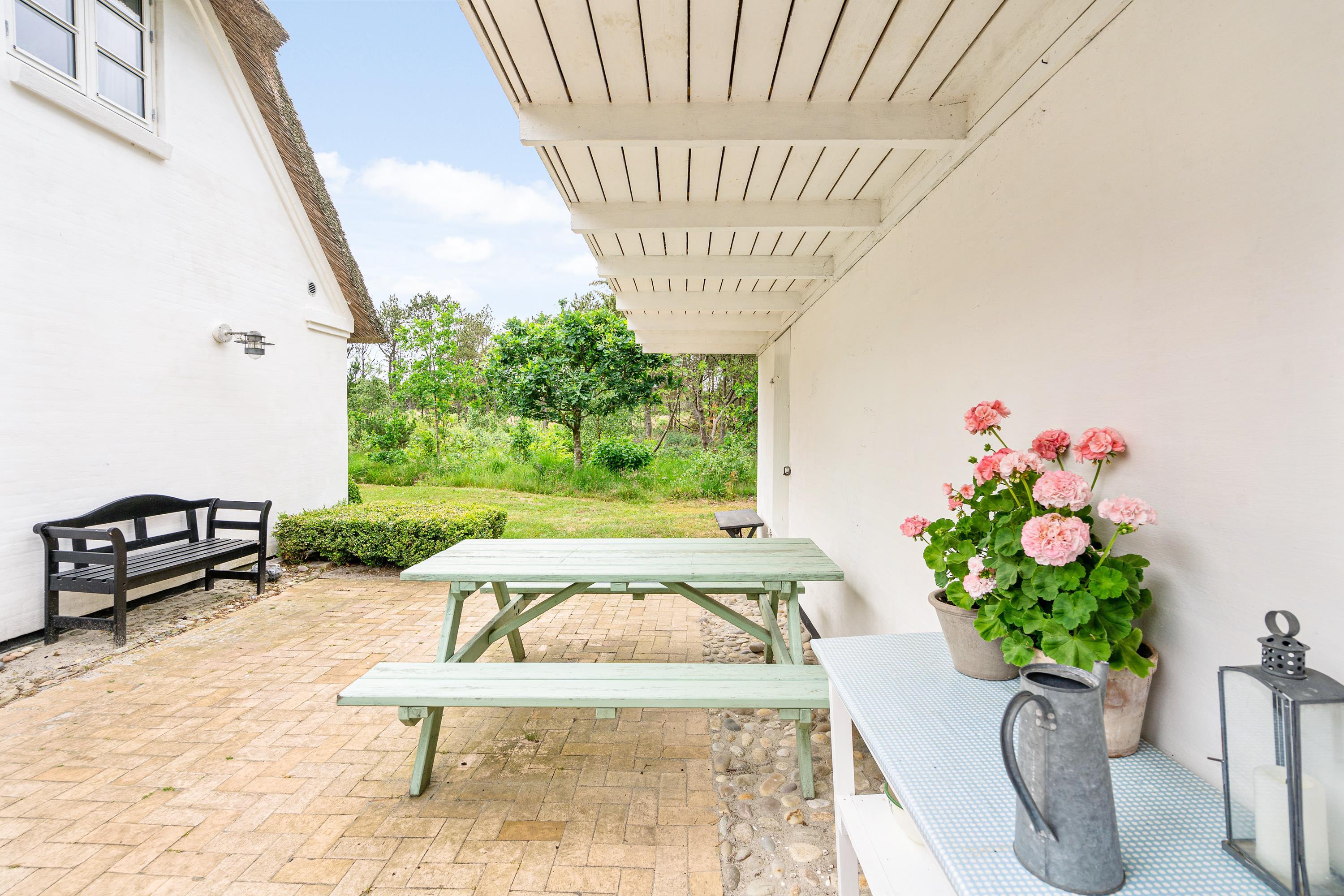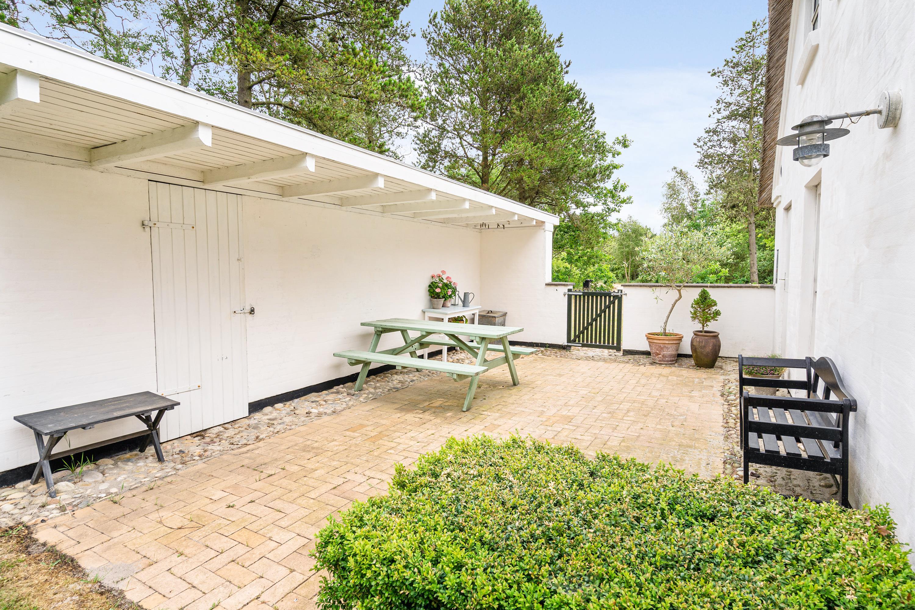 Også udenfor ånder alt idyl: Find dit magiske hjørne - her er mange muligheder! Om det er i solgården bag huset, hvor et stort overdækket område garanterer udetid fra tidligt forår til langt hen på efteråret, eller du nyder en kop kaffe og en bog i den grønne have - lidt gemt ved hegnet med de duftende roser. Ikke at forglemme er der også husets store solterrasse, hvor du kan slappe af på liggestolene og nyde områdets stilhed og duften fra lynghede og fyrretræer, imens de mindste hygger sig i sandkassen. Imens du holder ferie, kan cyklerne eller barnevognen stå tørt og godt i husets redskabsrum.