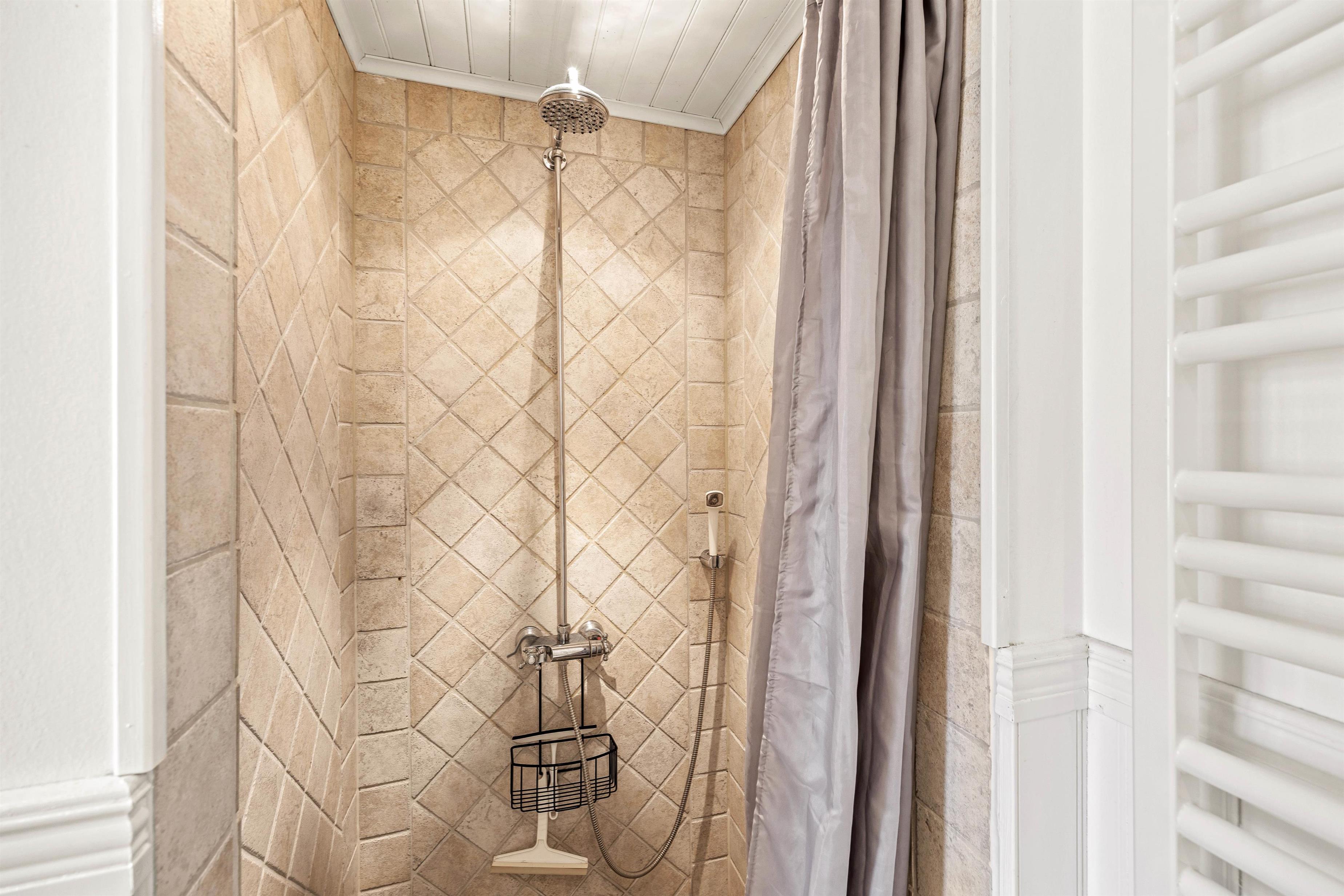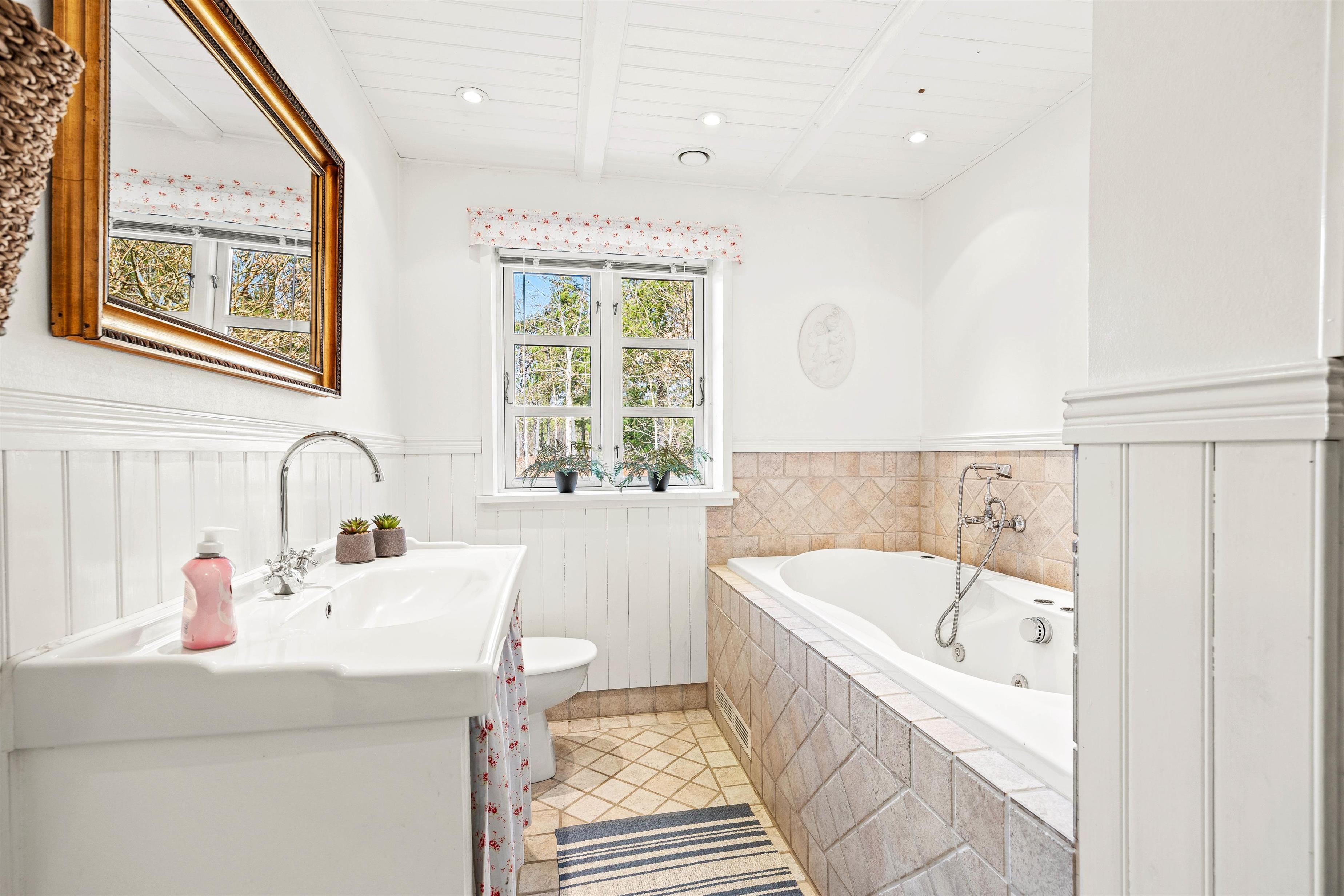 På badeværelset er der gulvvarme. Her er både bruser og en 1-personers spa, der især i den koldere årstid, kan benyttes, når man kommer hjem fra en dejlig lang gåtur ved Vesterhavet.