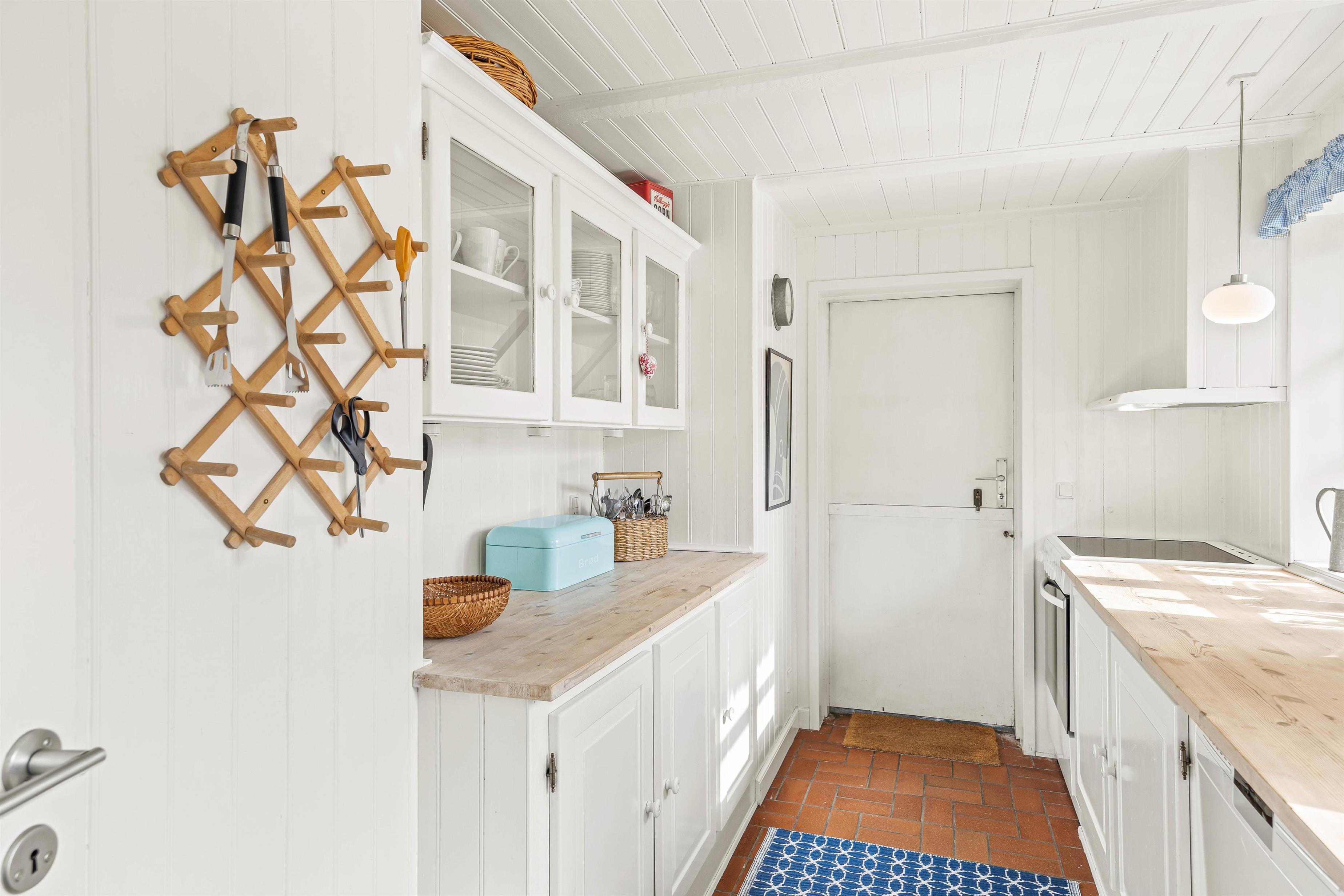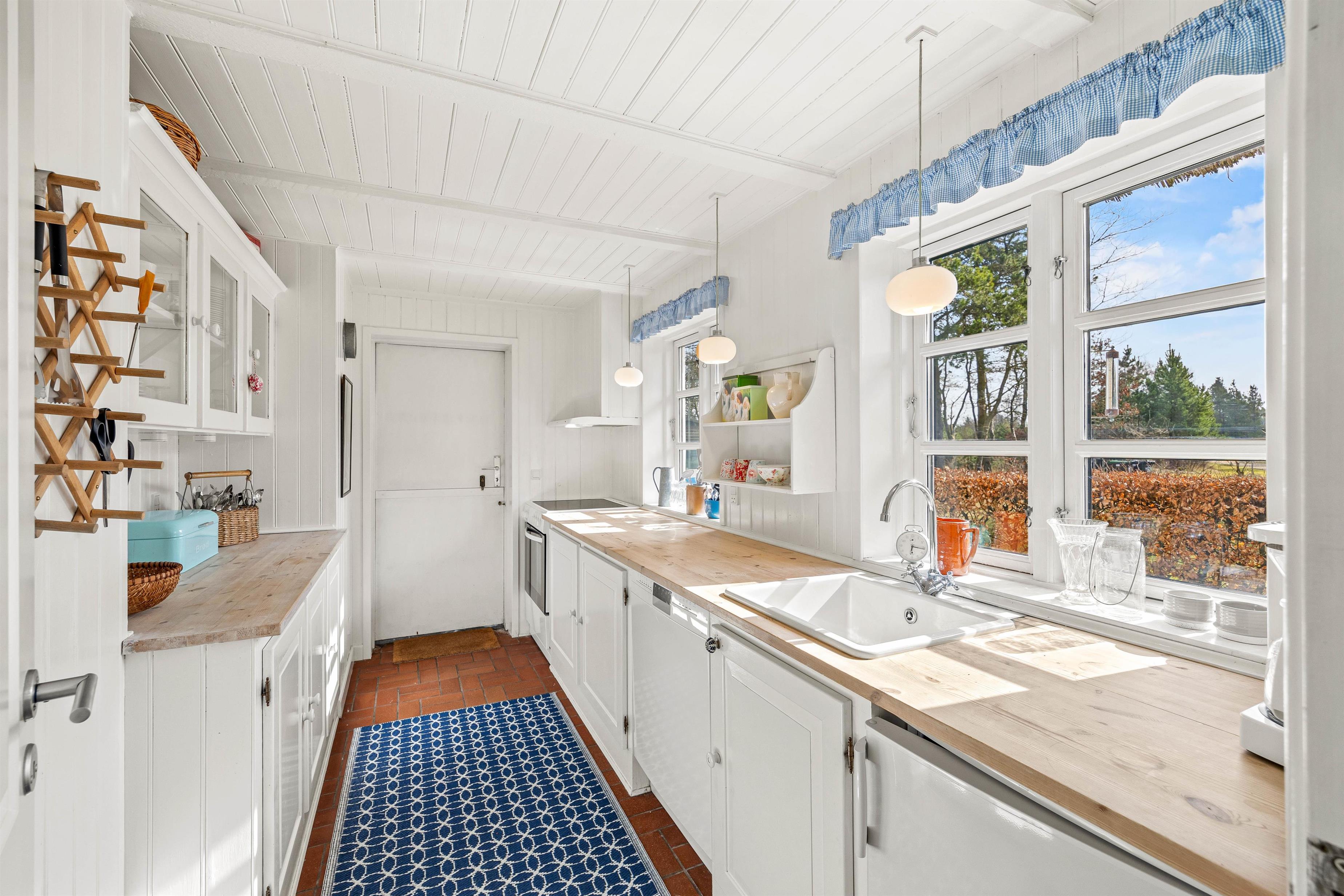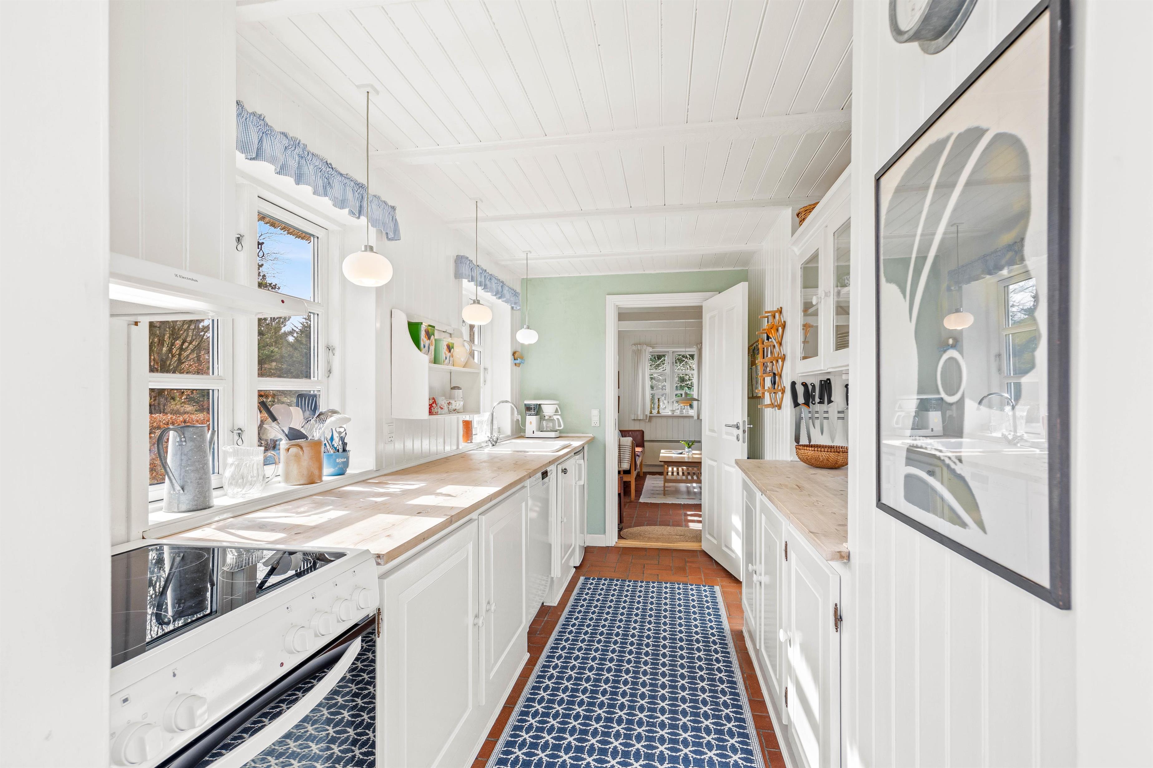 Køkkenet er godt indrettet med god plads til i fællesskab at tilberede maden, trods den gennemførte smukke bondehusstil er her naturligvis alle moderne bekvemmeligheder som f.eks opvaskemaskine.
