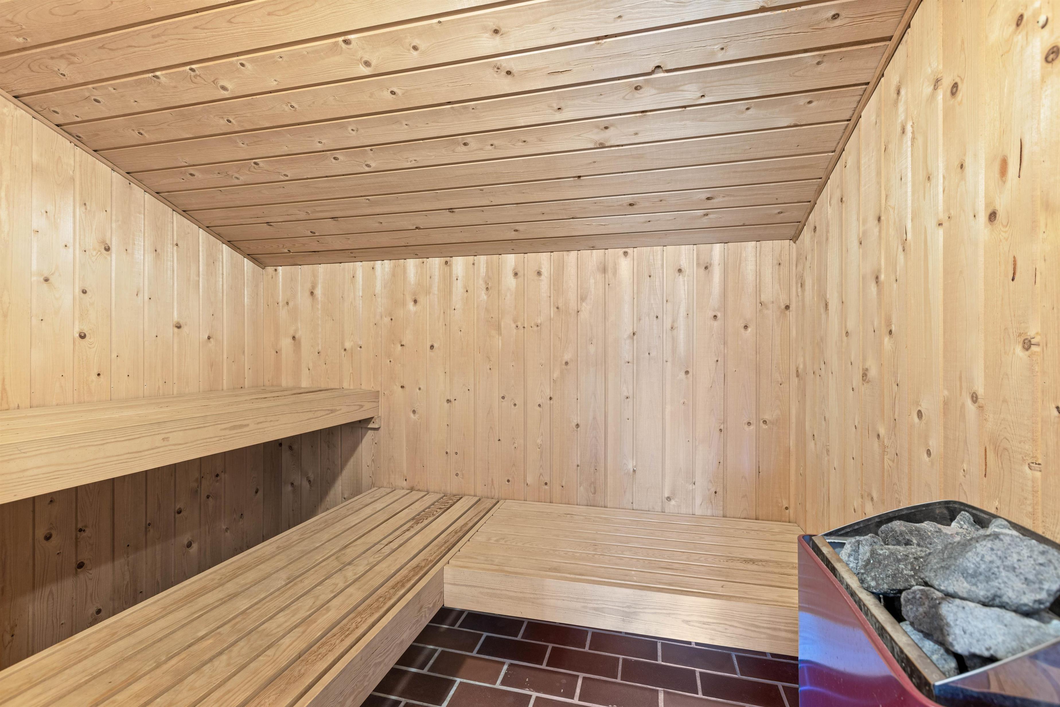 På Ndr. Skovvej 1 er der også mulighed for ekstra wellnes, da huset har en skøn sauna med tilgang fra badeværelset, hvor den lyse indretning også er gennemført. Derudover findes der noget ekstra lækkert på terrassen - et vildmarksbad!