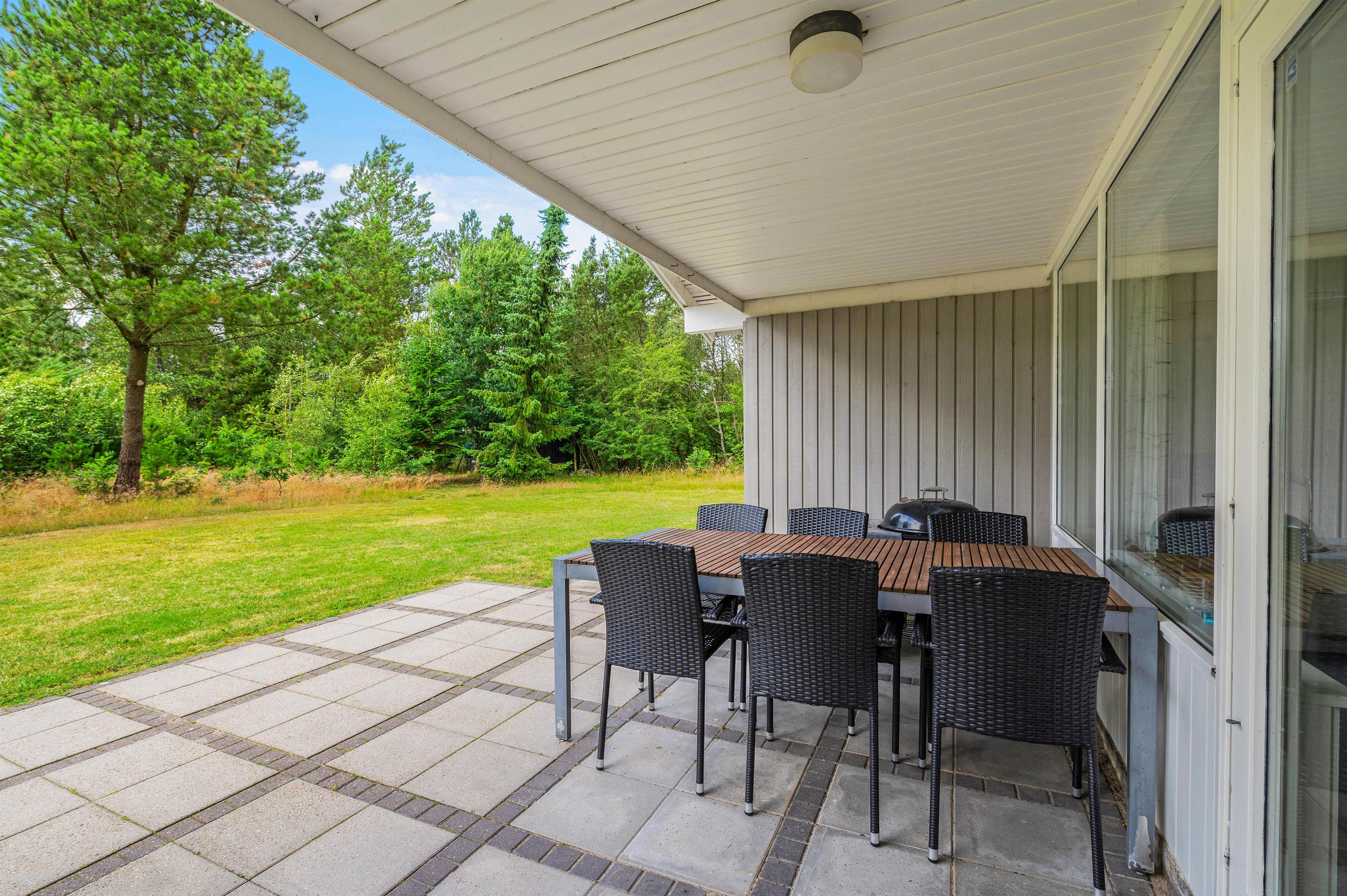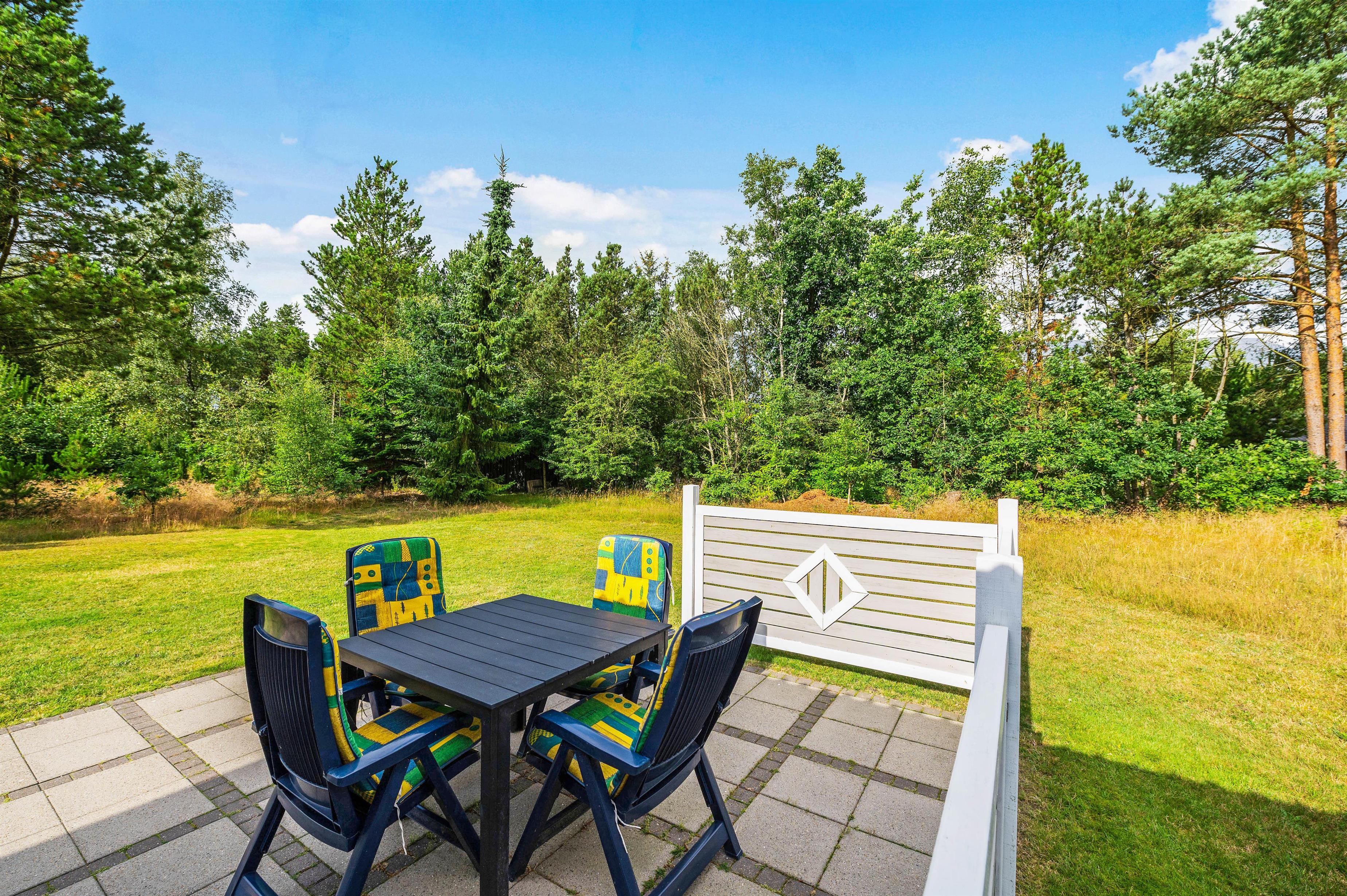 Rundt om sommerhuset er der flere terrasser med muligheder for læ, som inviterer til afslappende stunder i solen eller under de skyggefulde områder. På den imponerende 2100 kvadratmeter store grund er der rigeligt med plads til sjov og leg for både store og små. På de varme dage er det en fremragende idé at hive solsengene ud på terrassen og nyde solens stråler, mens I indsnuser den friske duft af den omkringliggende skov.