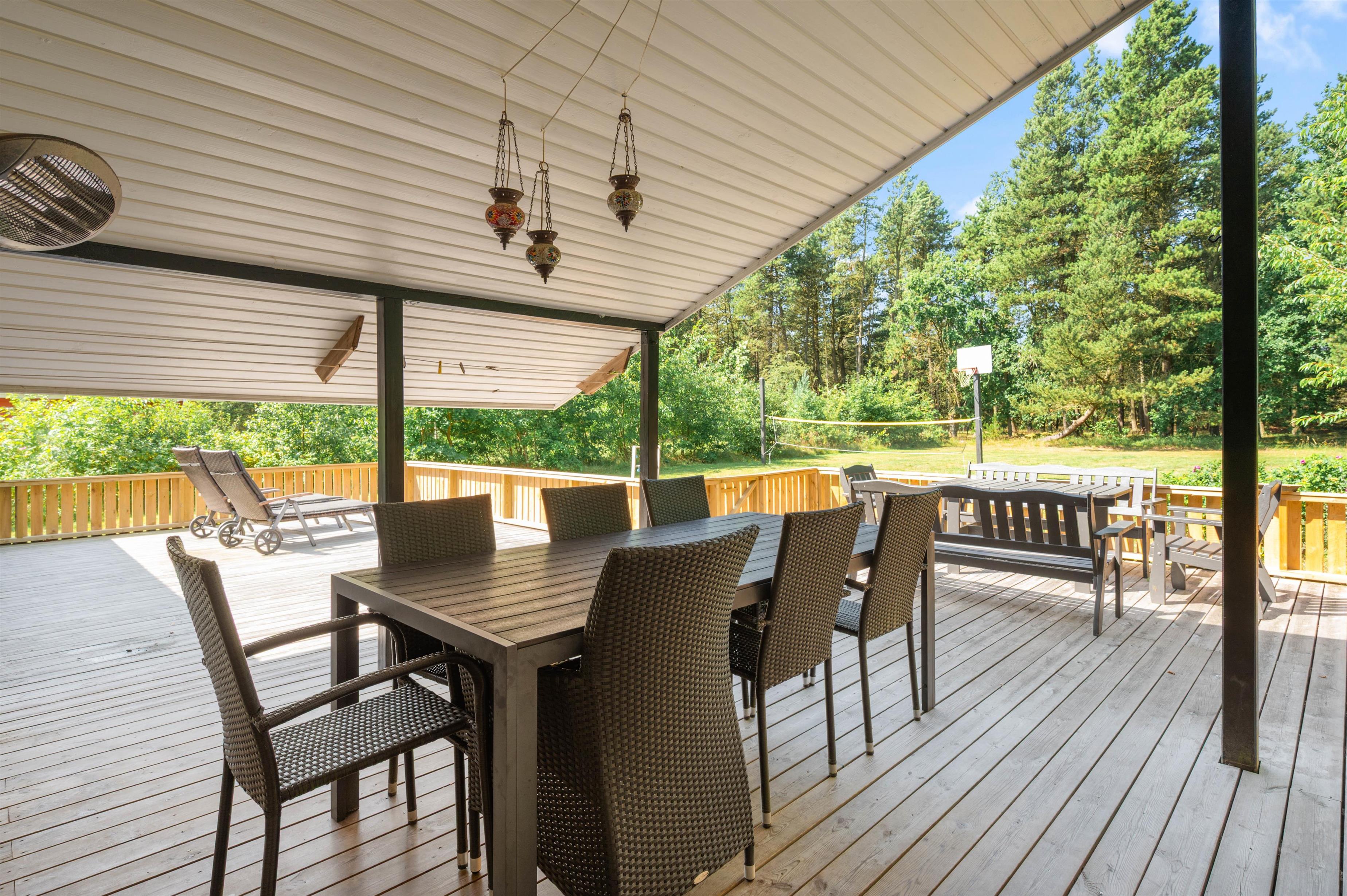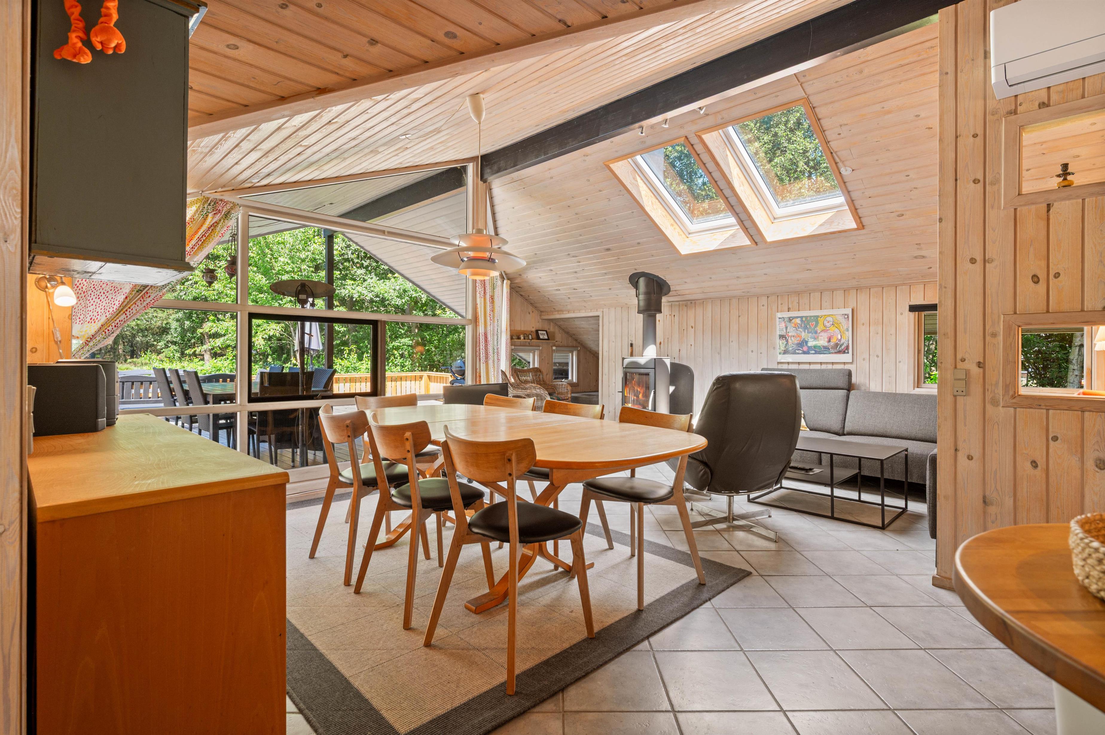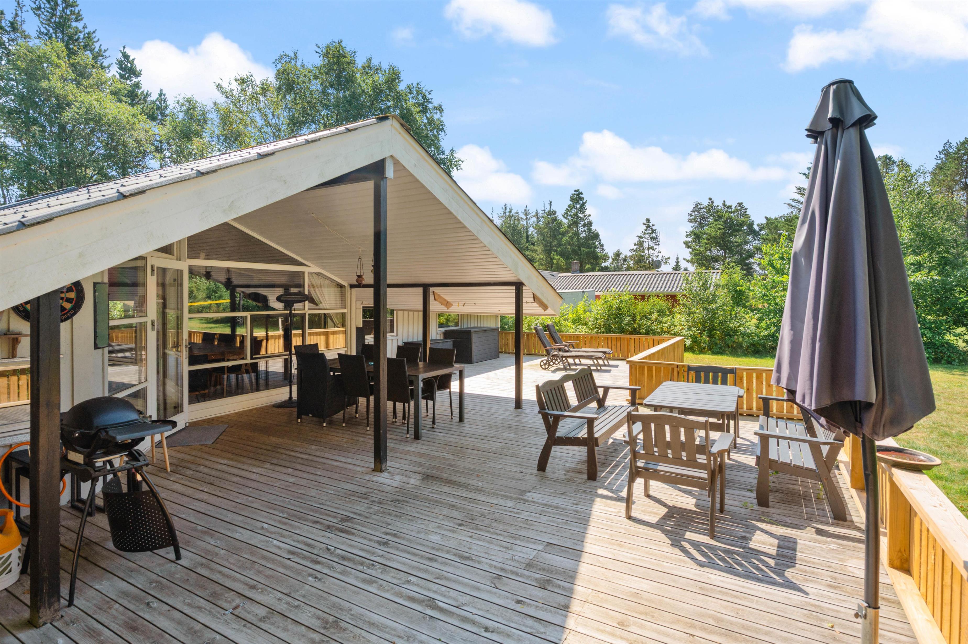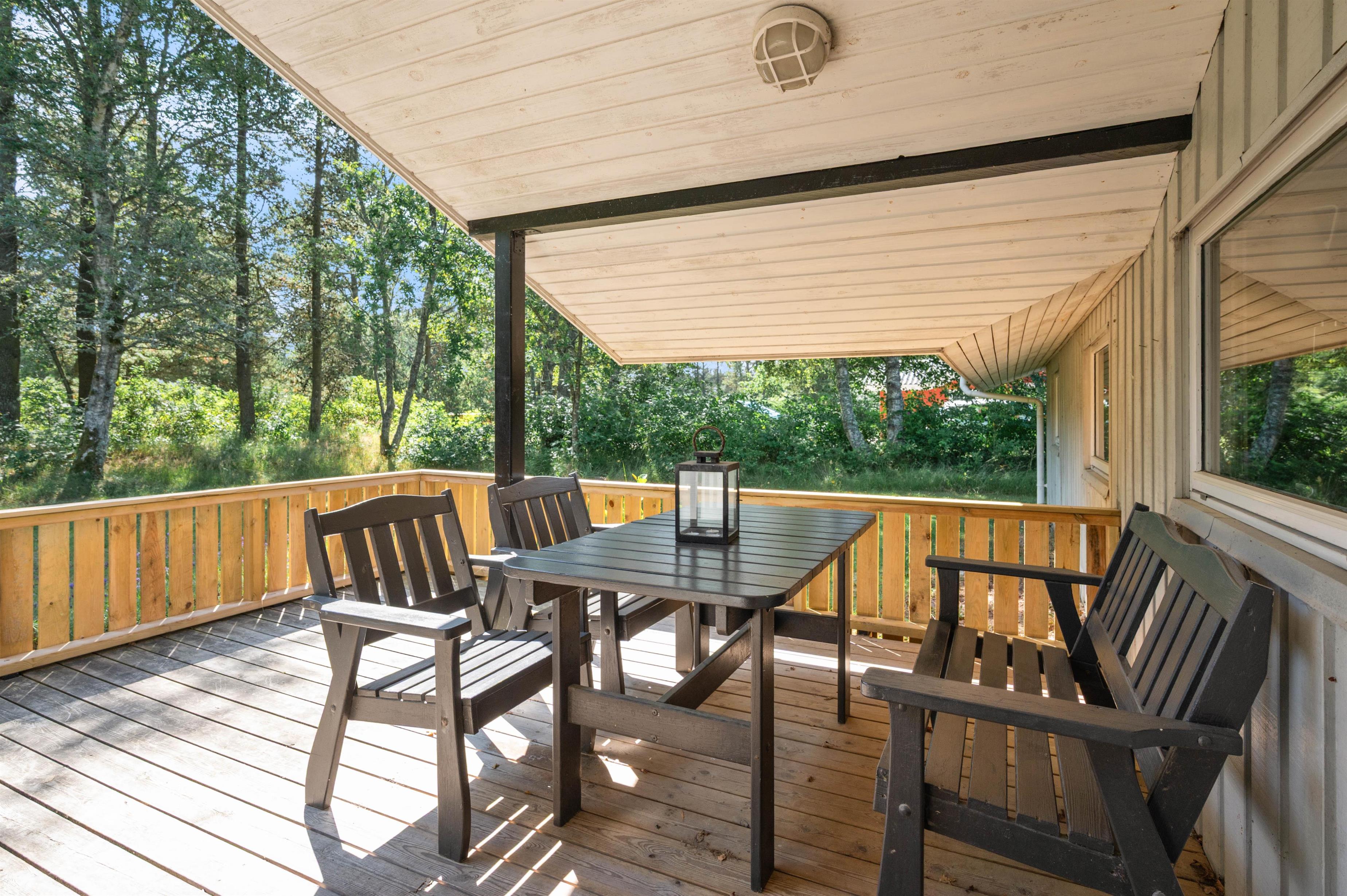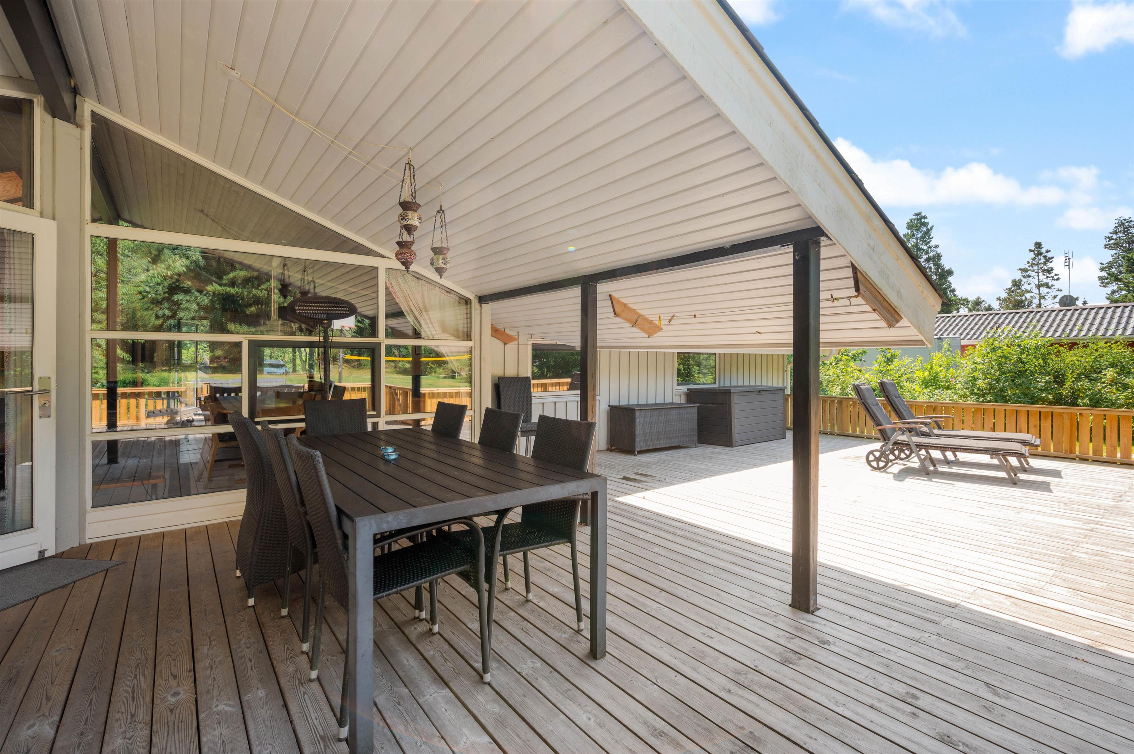 Det skønne sommerhus ligger på en dejlig naturgrund i grønne omgivelser. Der er rigtig god plads til at nyde vejret og udsigten på den store, lækre terrasse, og den er tilmed lukket af, så børnene sagtens kan lege uden opsyn.