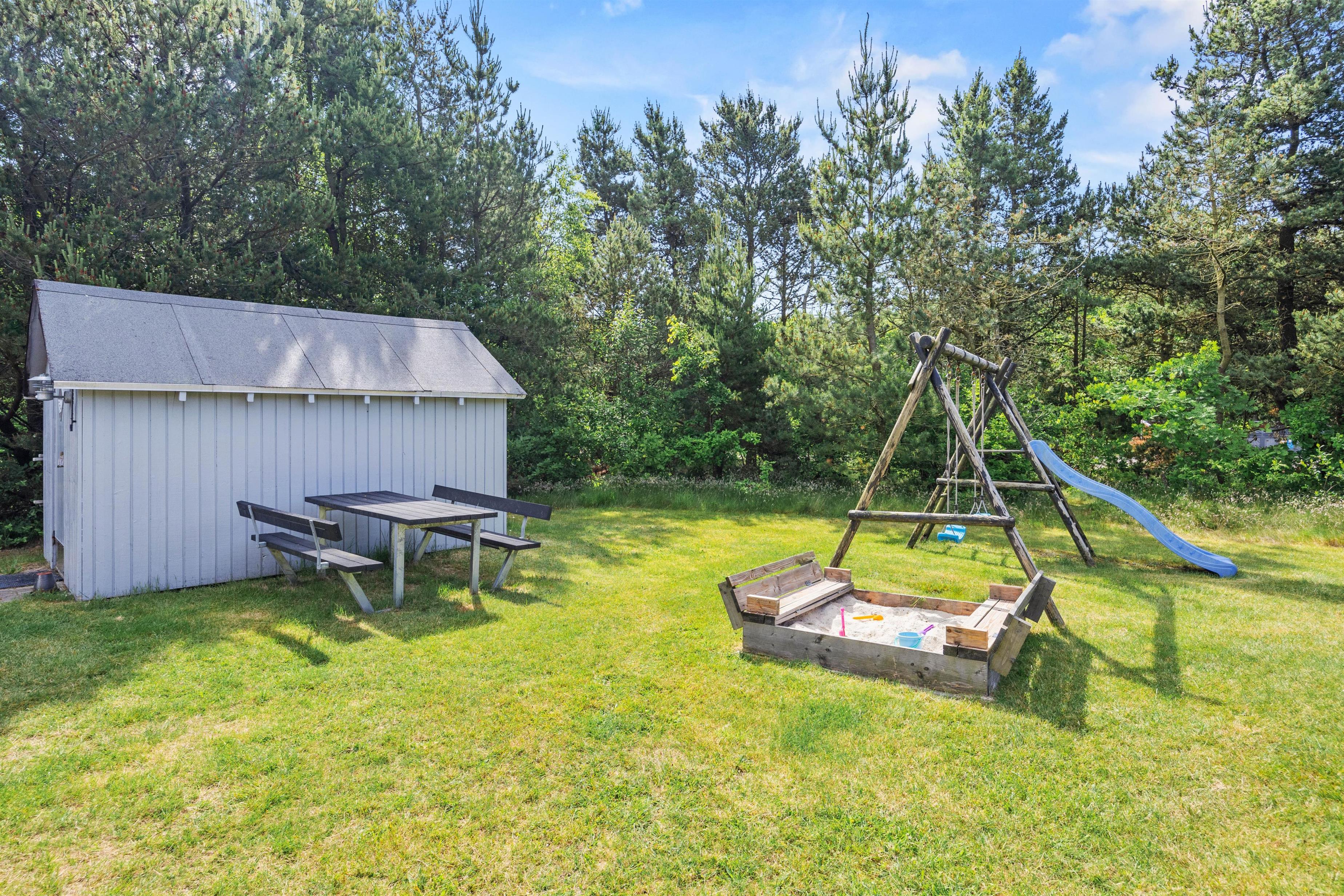 Fra husets stue er der udgang til en dejlig stor sydvest-vendt terrasse, hvor I uforstyrret kan sole jer og hygge dagen lang imens børnene leger på gyngerne, i sandkassen eller tumler på den store naturgrund med familiens hund. Imens der tændes op i grillen og skyggerne bliver lange, tager børnene og de barnlige sjæle måske en sidste bolddyst ved fodboldmålet i haven.