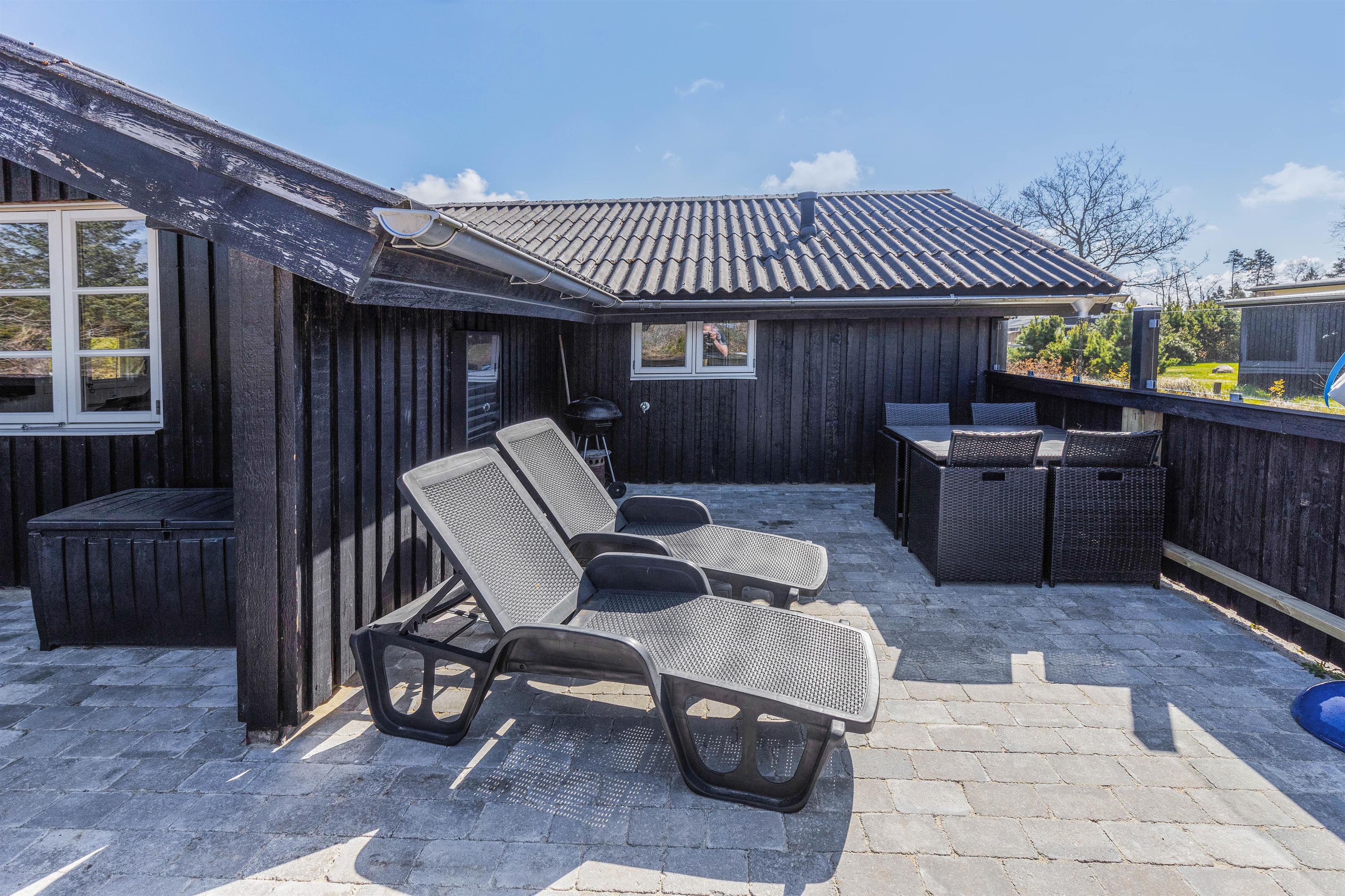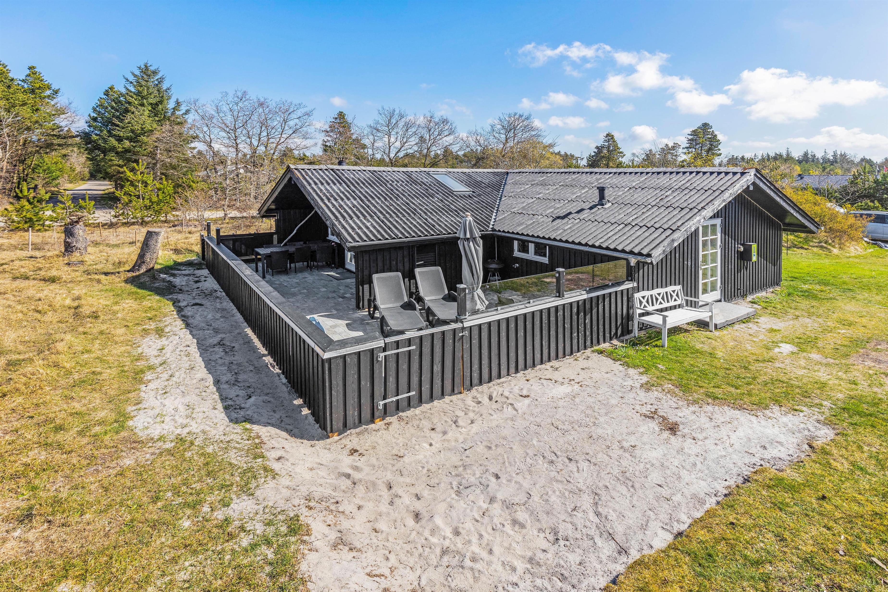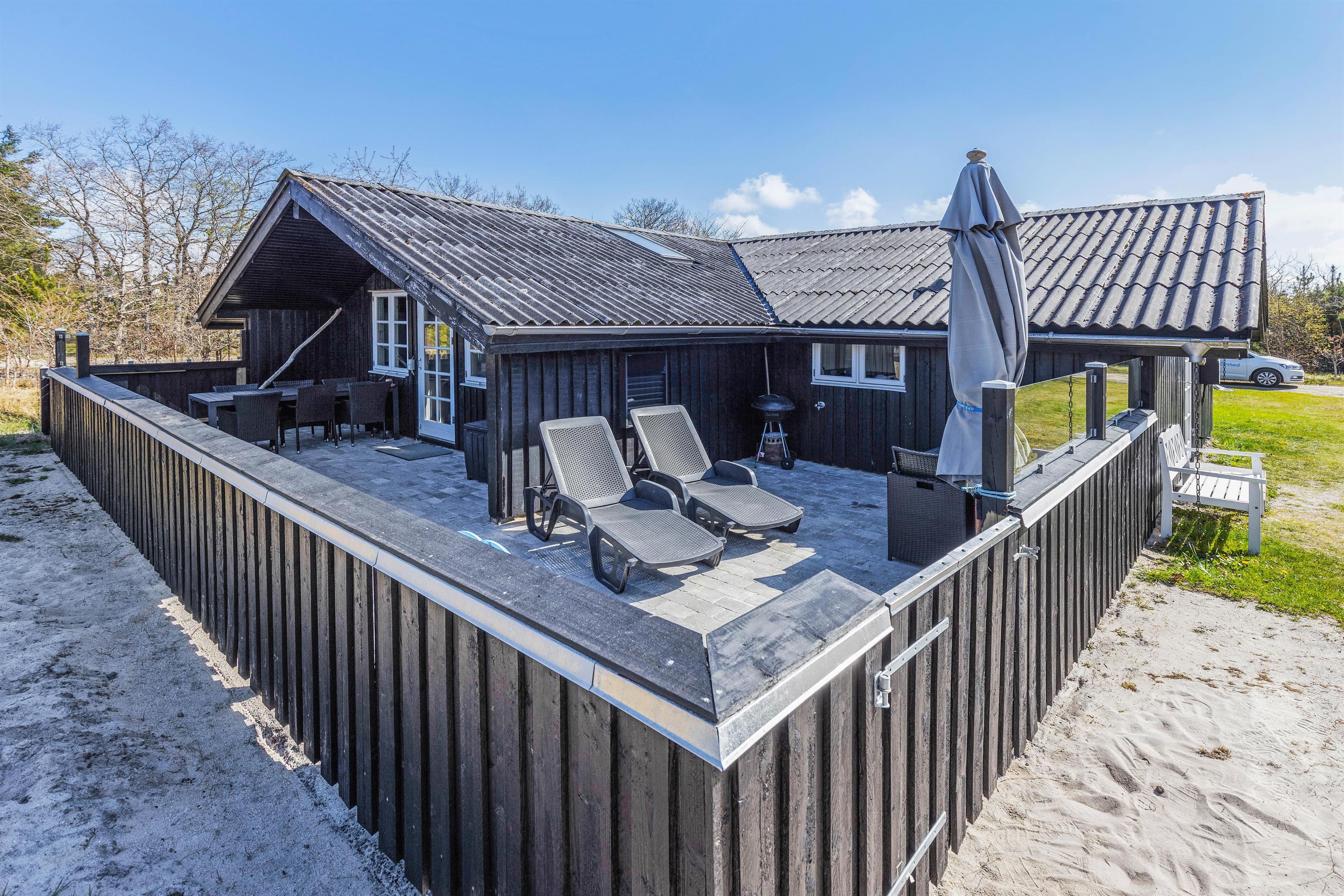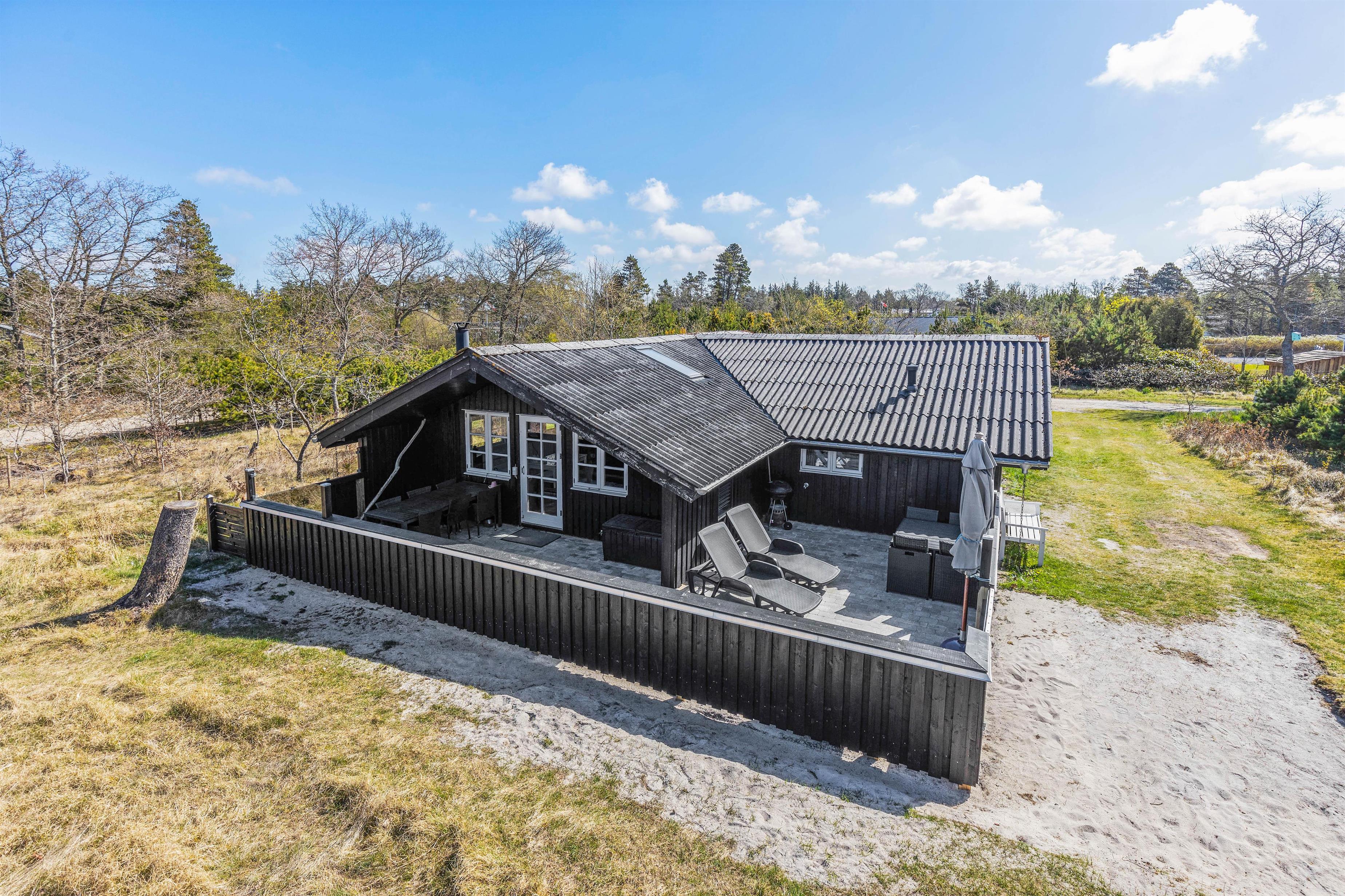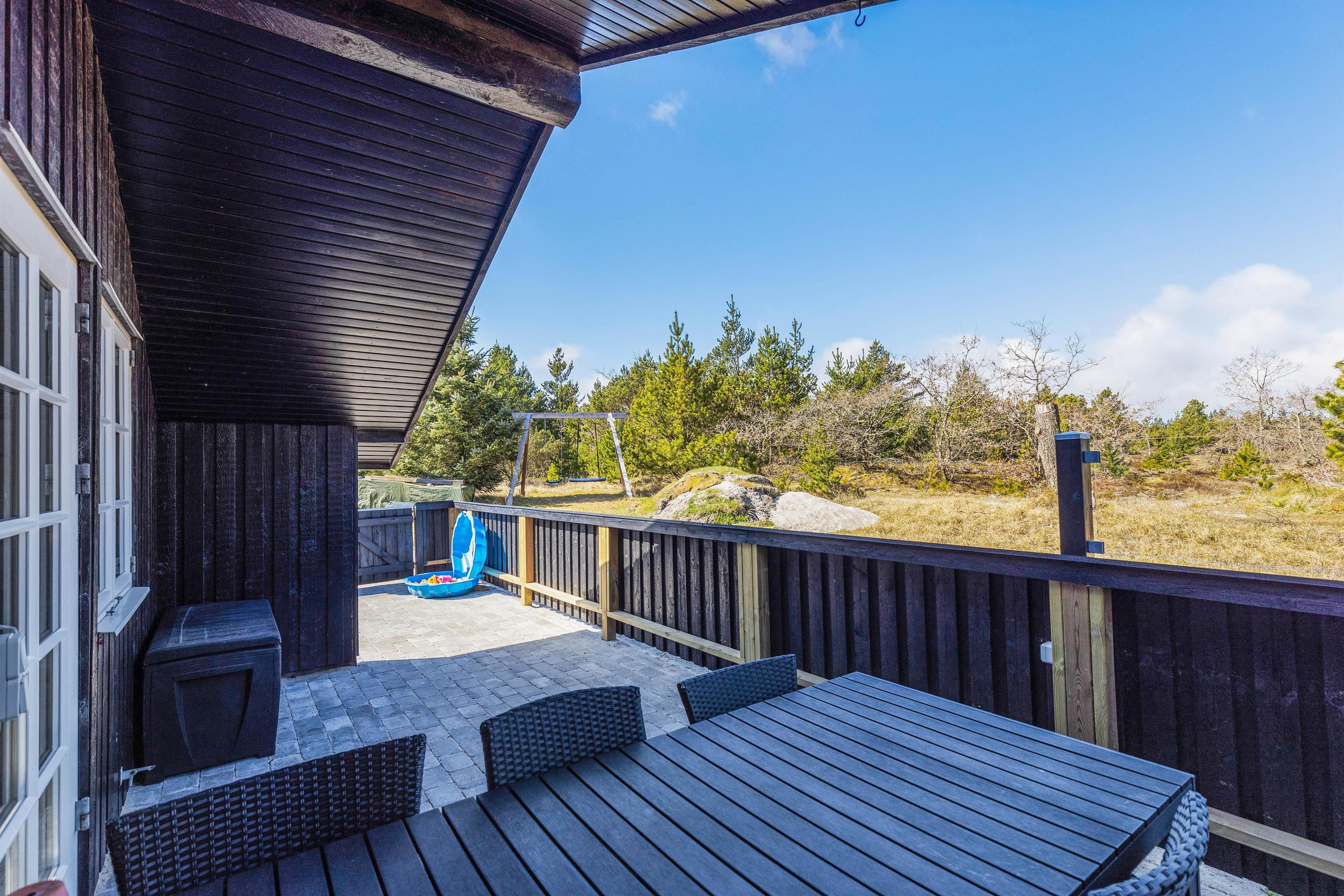 På den store græsplæne er der rigelig med plads til leg og spil, og I finder sågar en gynge og en sandkasse, som vil være til stor glæde for de yngste. På terrassen står liggestolene klar til jer, og skulle regnen mod forventning melde sig, er terrassen delvist overdækket, så I uden problemer kan grille og nyde udsigten trods vind og vejr.