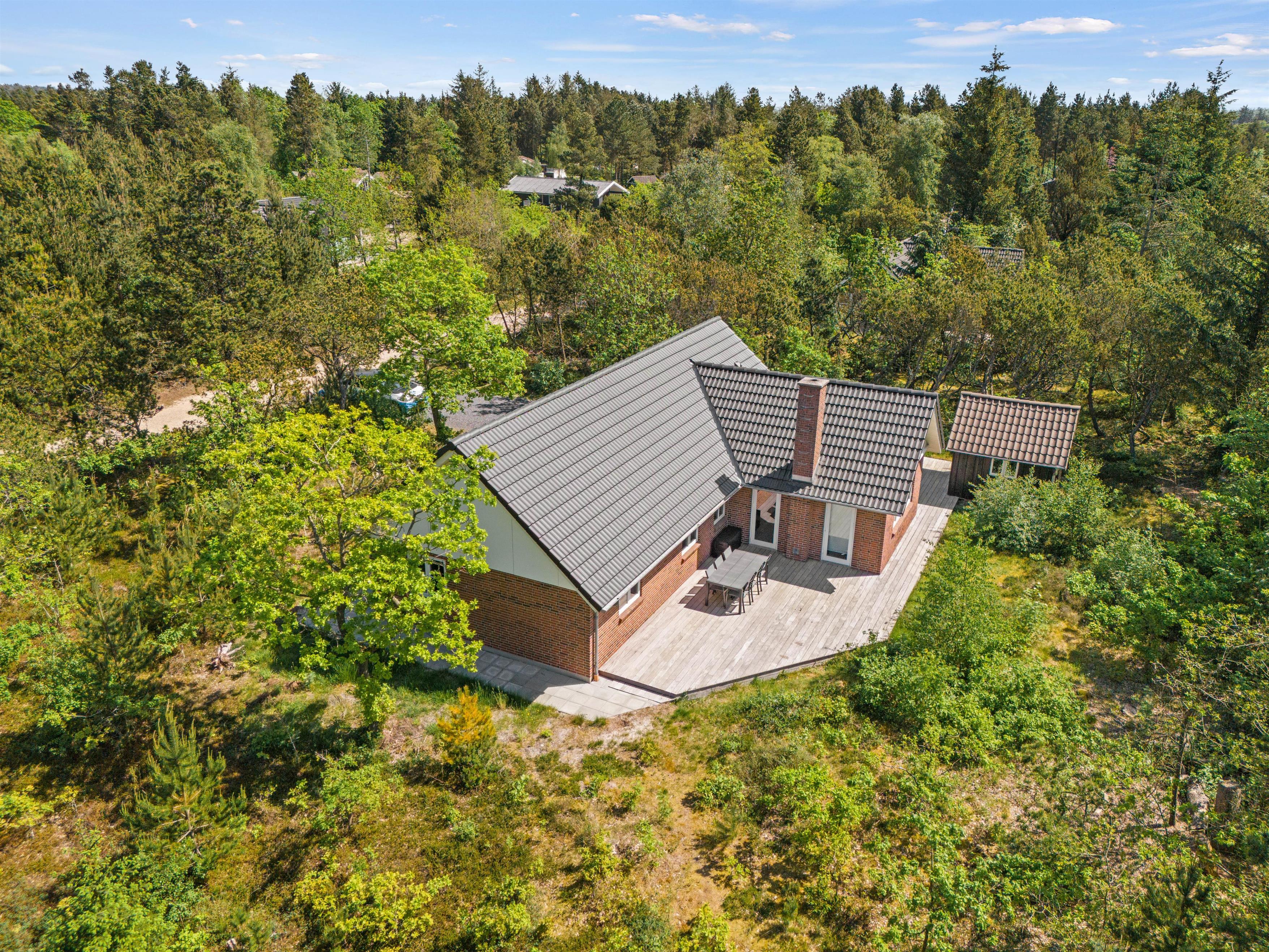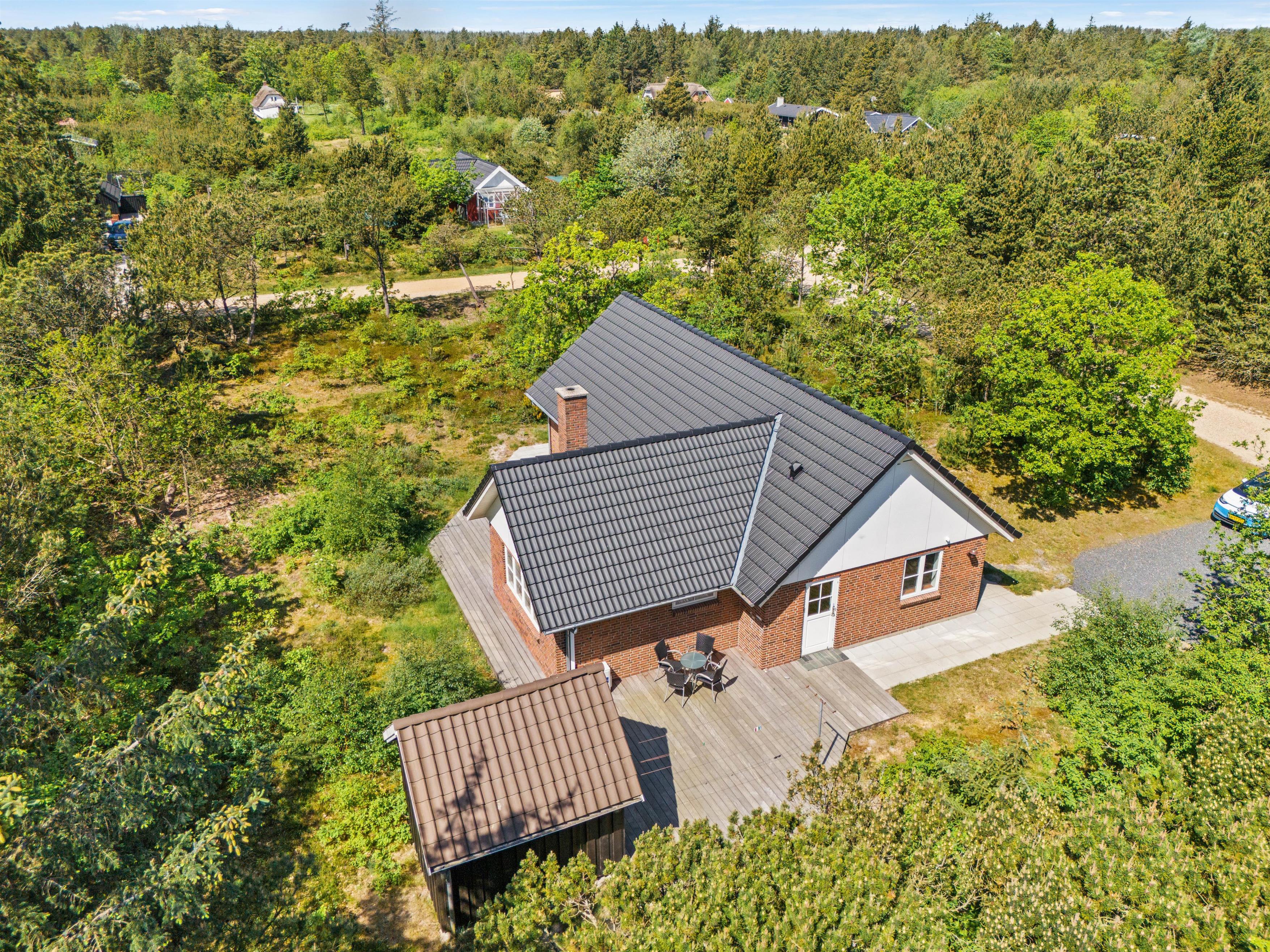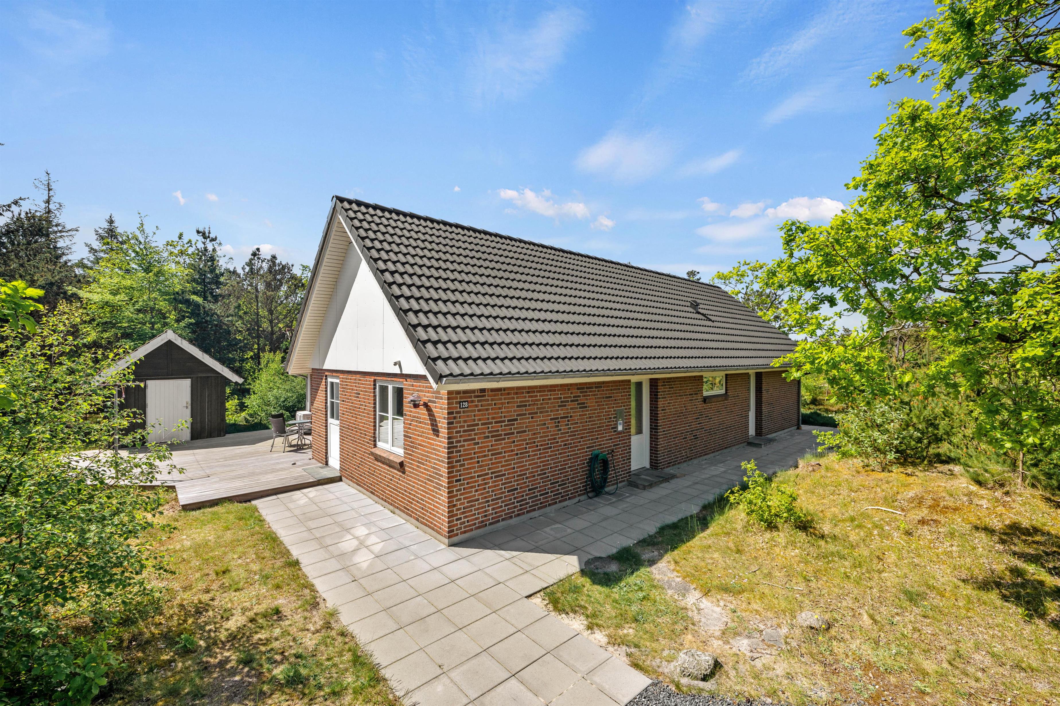 Feriehuset, der har en fantastisk sydvestvendt træterrasse, er ideel til en familieferie eller til et eller to vennepar. Beliggenheden på Søndervang 128 er stille, selvom det er en hjørnegrund. Campingpladsen er kun et stenkast væk, og her kan I købe frisk morgenbrød og andre småting.