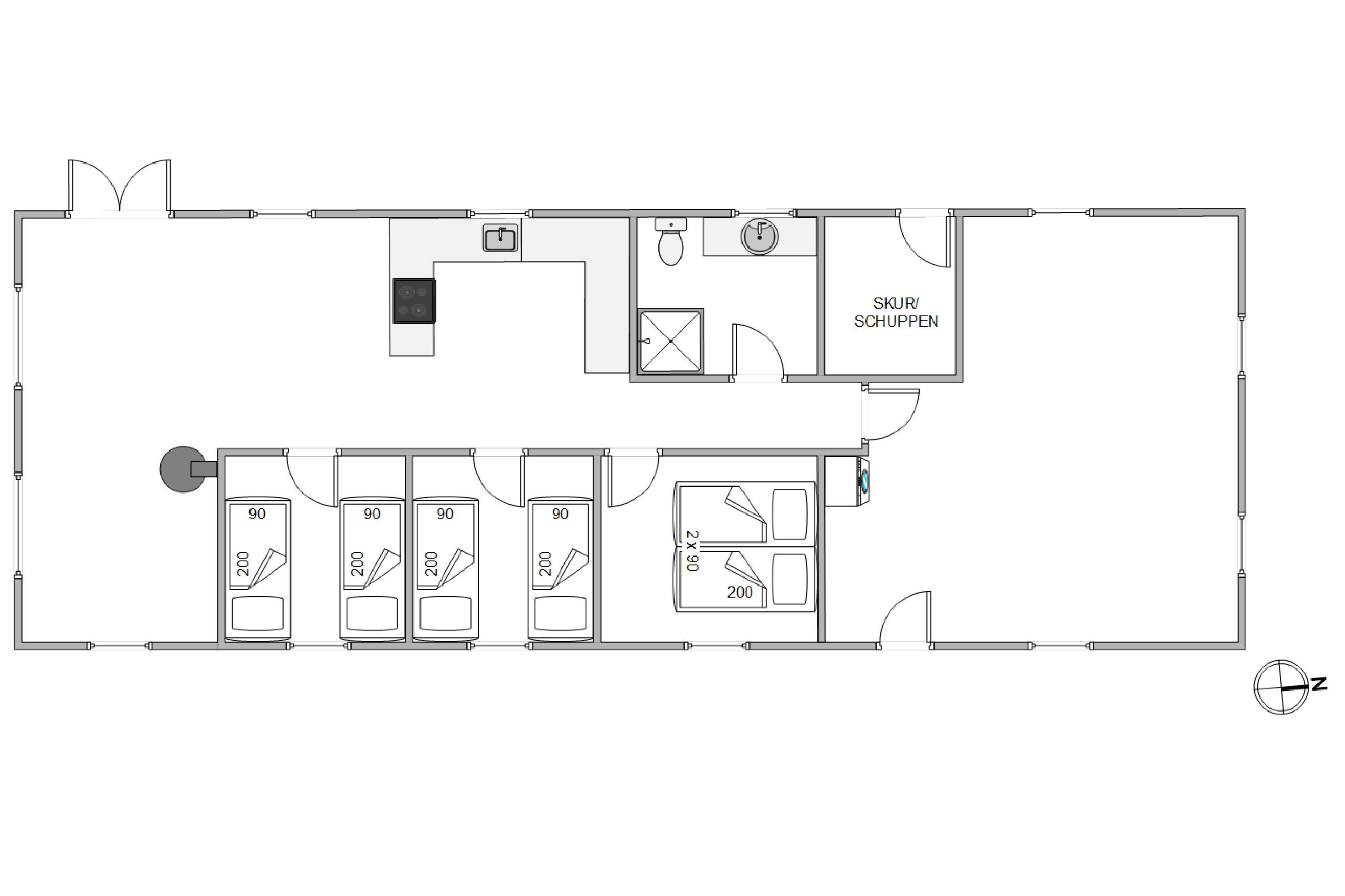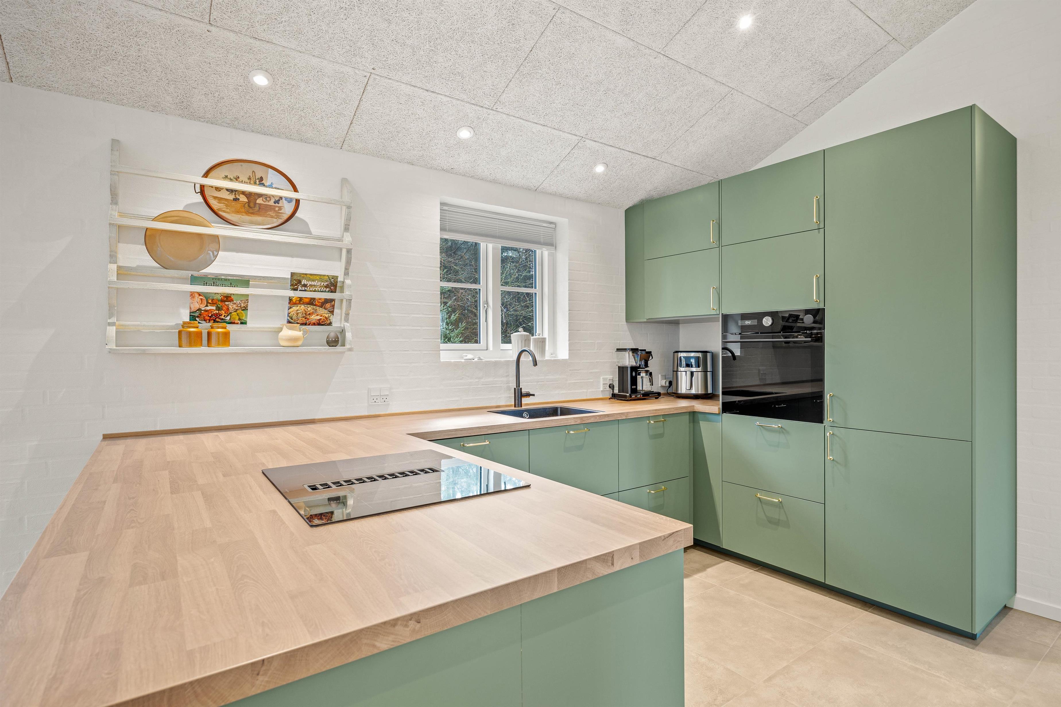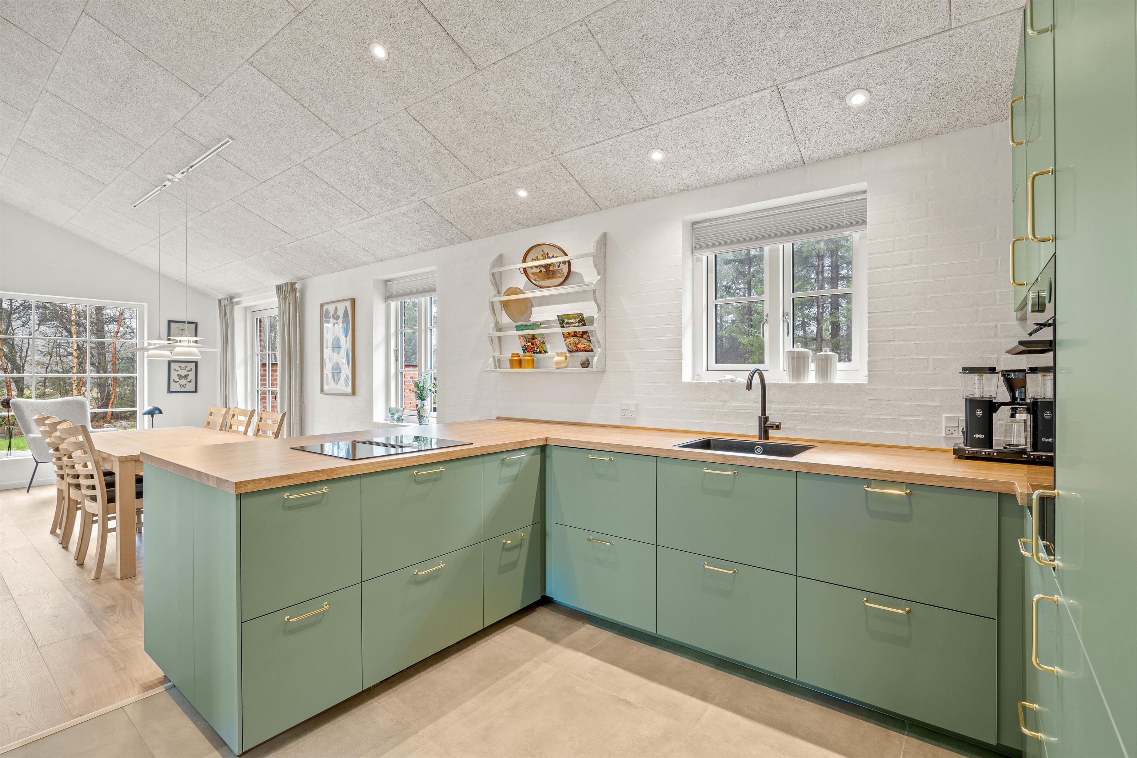 Indenfor byder sommerhuset på en hyggelig og funktionel indretning, perfekt for en afslappende ferie. Køkkenalrummet i den ene ende af sommerhuset er det naturlige samlingspunkt, og med en brændeovn i stuen opstår der automatisk en varm og indbydende atmosfære, som inviterer til lange, hyggelige aftener.