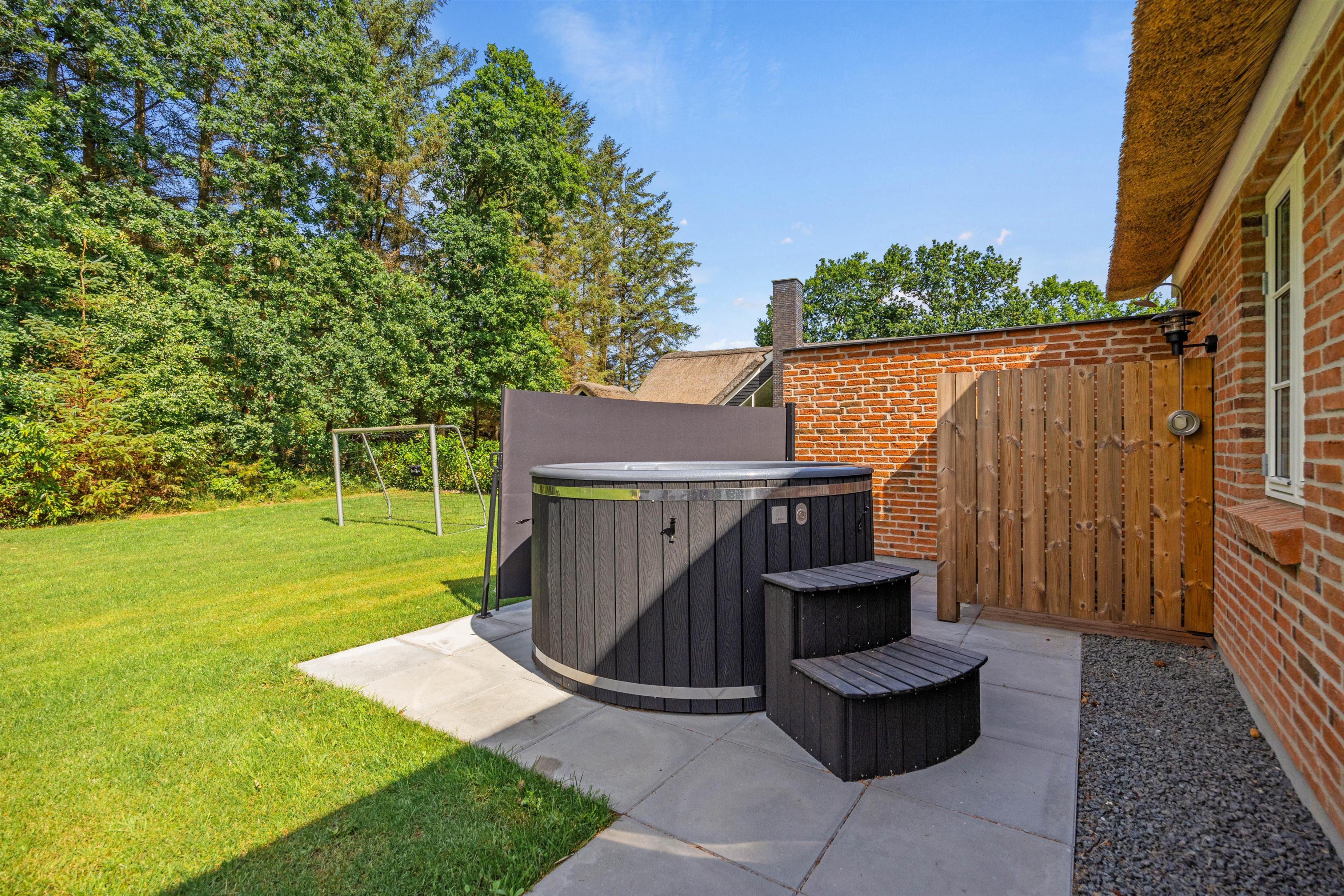 Udendørsområdet på terrassen byder på en række skønne faciliteter, heriblandt en udebruser, der kan benyttes fra april til november, men højdepunktet er uden tvivl det dejlige vildmarksbad til 5 personer. Her kan I nyde fantastiske stunder under åben himmel, uanset om det er dag eller nat. Vildmarksbadet er det perfekte sted til afslapning efter en dag fuld af aktiviteter eller til at skabe en romantisk atmosfære om aftenen.