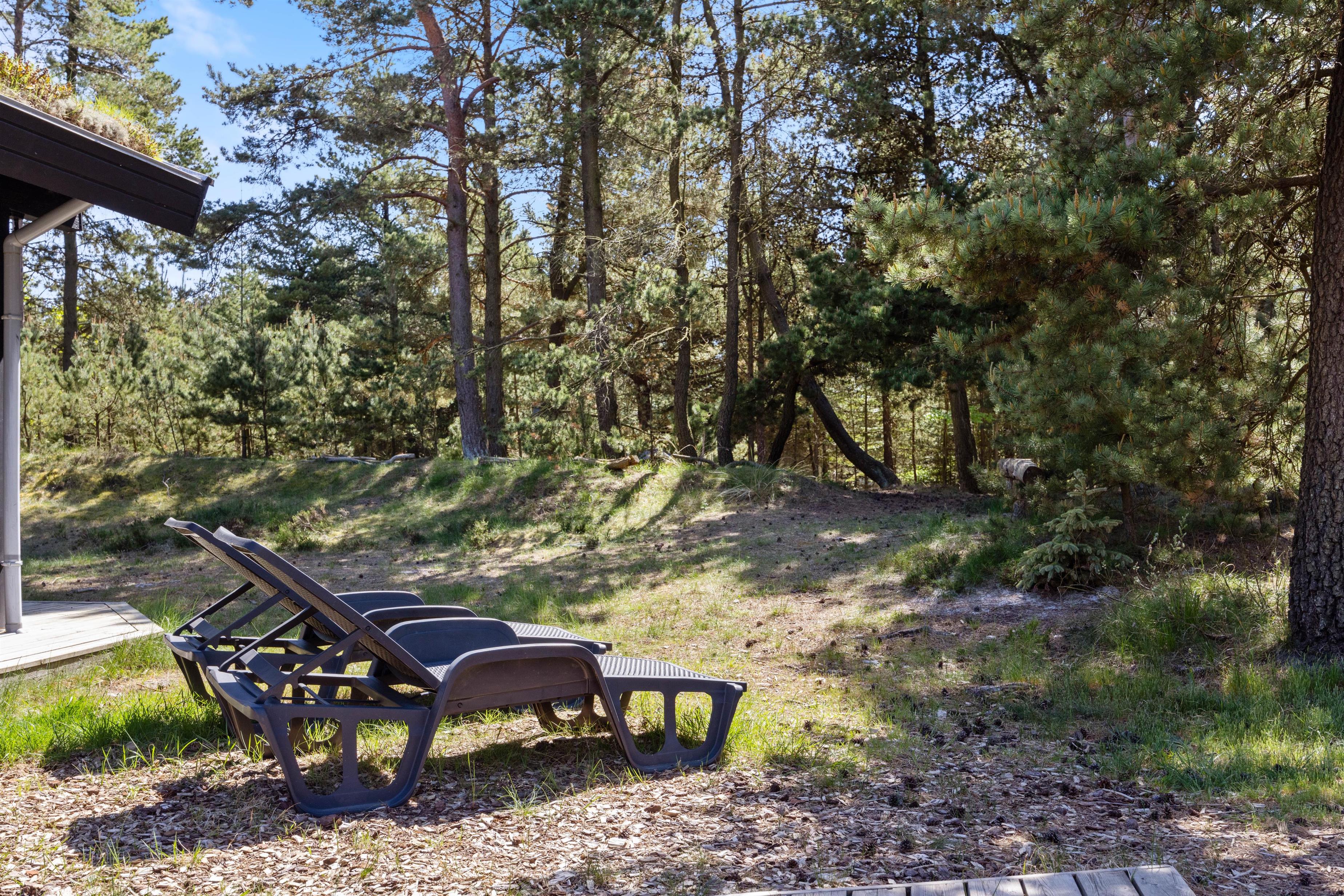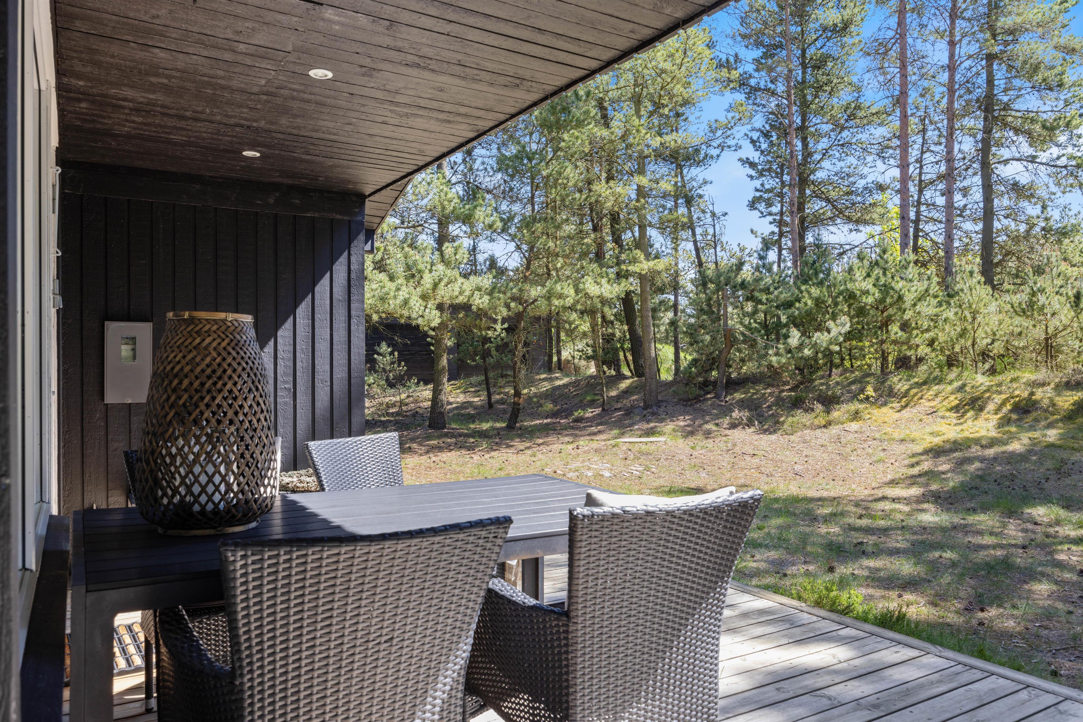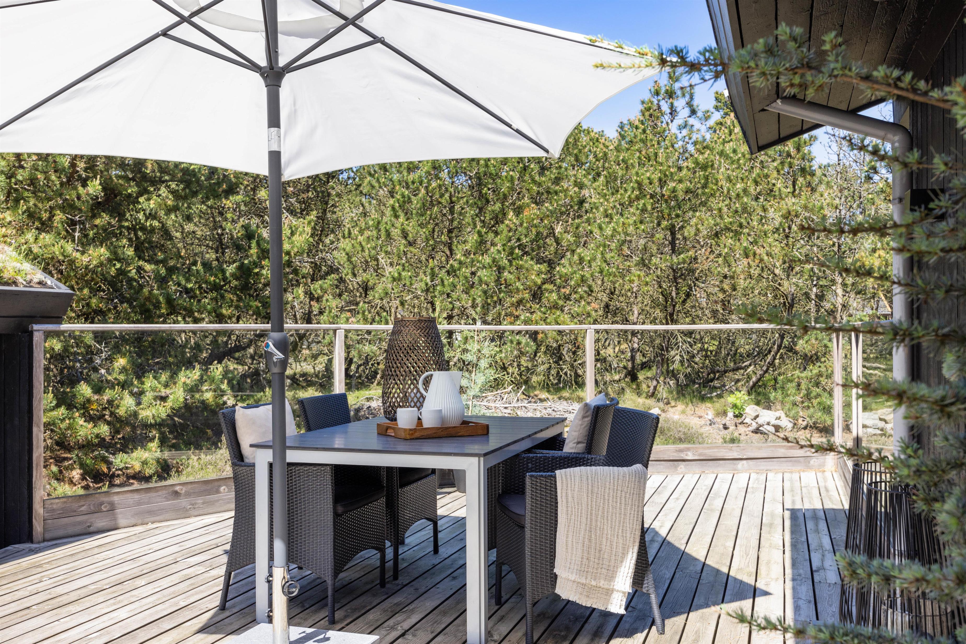 Fra stuen har I direkte udgang til træterrassen, hvor havemøbler, liggestole og grill står klar til jer. Terrassen er delvist overdækket og afskærmet, så her kan I altid finde en god krog med læ. Desuden er naturgrunden omringet af træer, så I kan nyde privatlivet uden forstyrrelser.