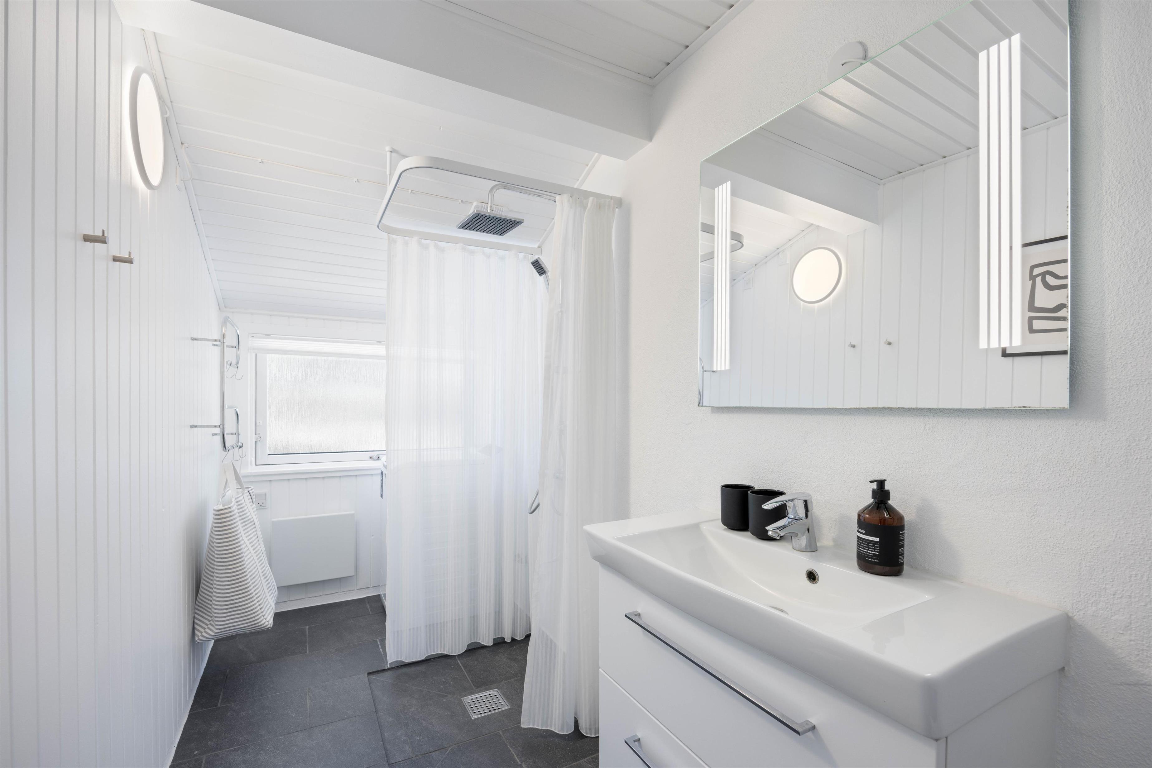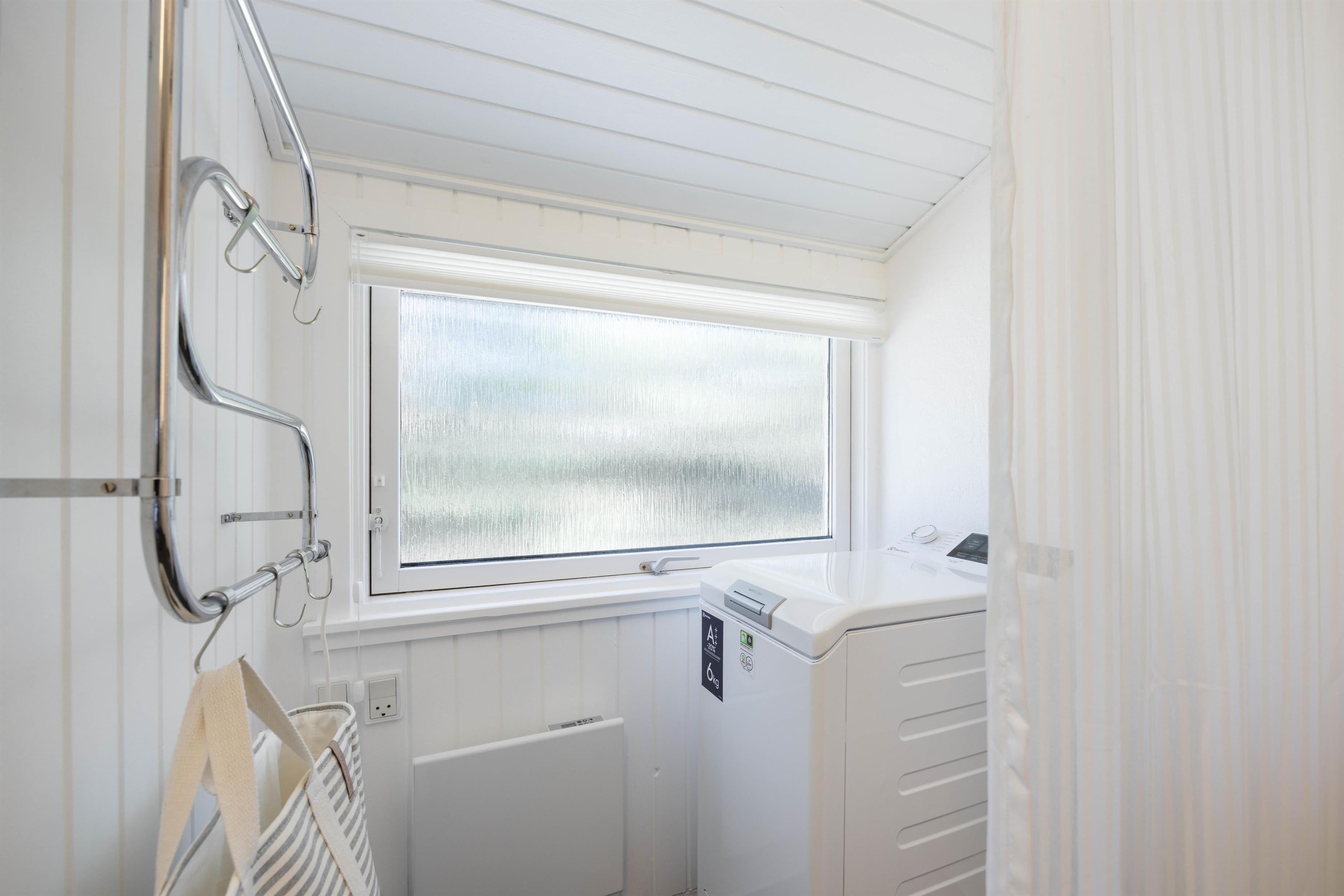 Badeværelset er lyst og indbydende indrettet og har gulvvarme, så I slipper for kolde fødder. Sommerhuset er udstyret med en vaskemaskine, så I kan vaske tøj under ferien. Derudover finder I både strygebræt, strygejern og et tørrestativ, så garderoben forbliver skarp, og vasken kan tørres nemt og effektivt.