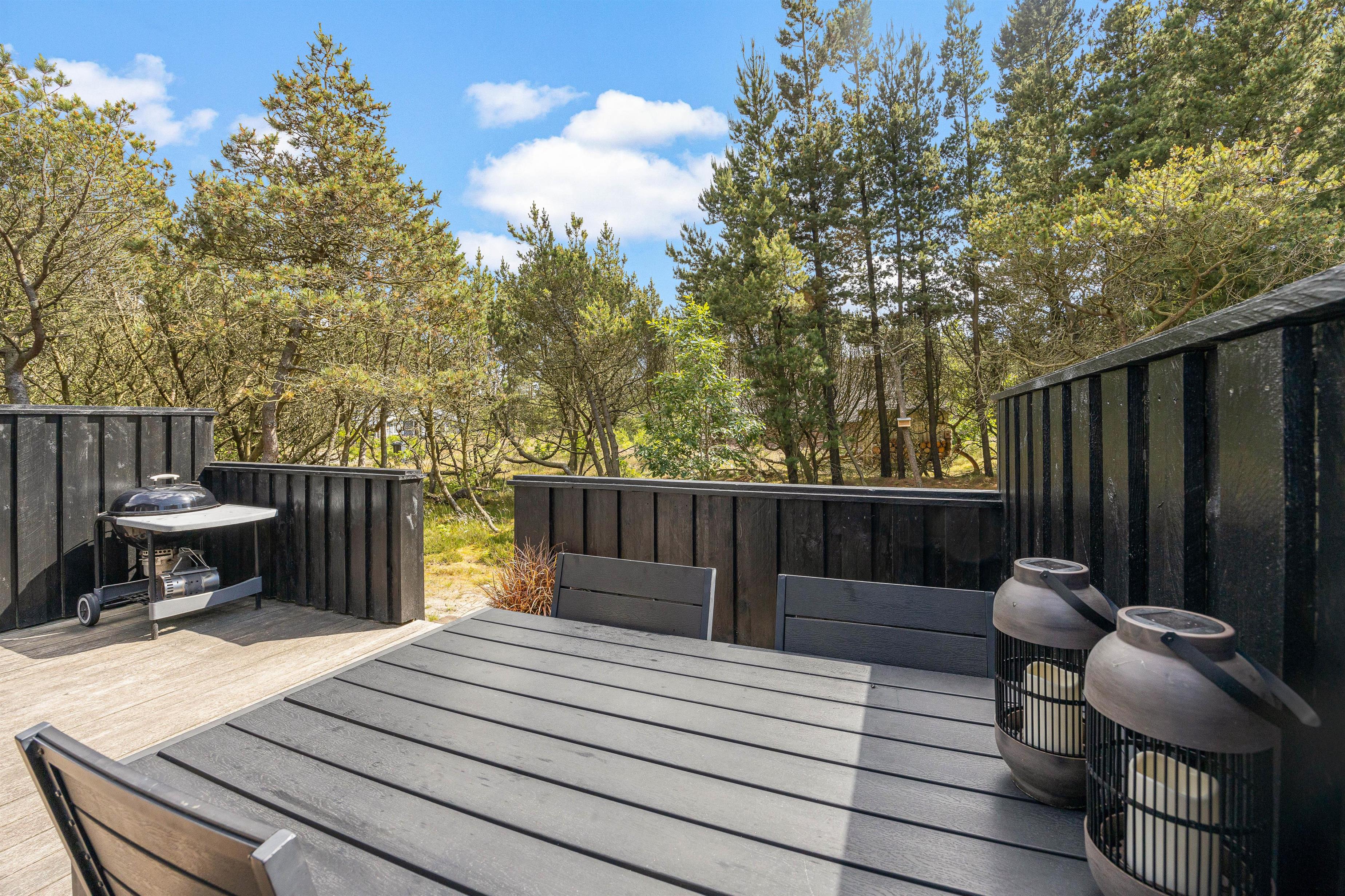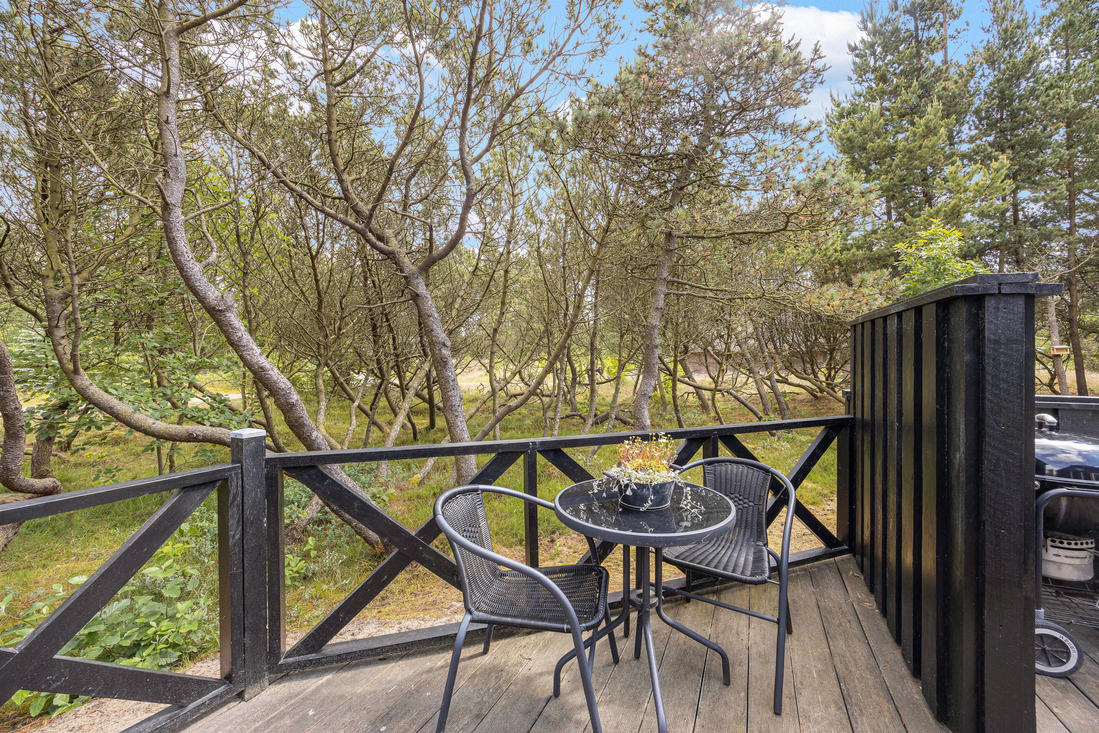 Udendørs venter jer nemlig en skøn, afskærmet terrasse. Her kan I finde jer en god plads i solen og læne jer tilbage i havemøbler og liggestole, mens I nyder ferien, solen og lyden af fuglefløjt i baggrunden.