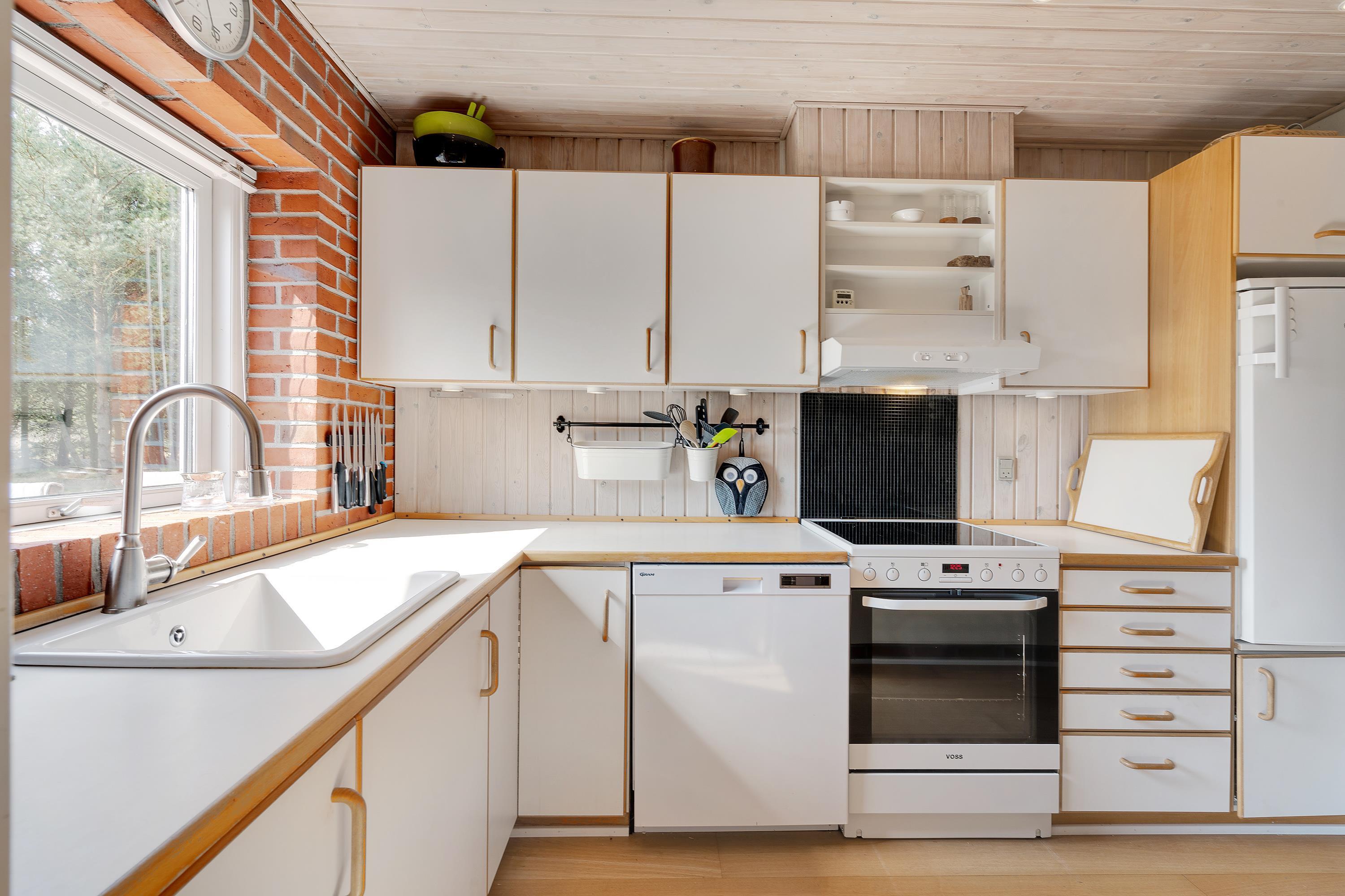 Hverdagens bekvemmeligheder følger selvfølgelig med, for i sommerhuset er der både vaskemaskine, tørretumbler og opvaskemaskine, så efter et lækkert måltid aftensmad, kan I samles på sofaen til et spil kort, se en god film, eller læse en bog i ro og fred, mens den knitrende brændeovn giver rummet varme og en hyggelig stemning. Ønsker I endnu mere varme, finder I det i feriehusets badeværelse med både sauna og spa, hvor der selvfølgelig også er gulvvarme. Her kan I lade op igen efter en dejlig dag i Houstrups fantastiske natur.
