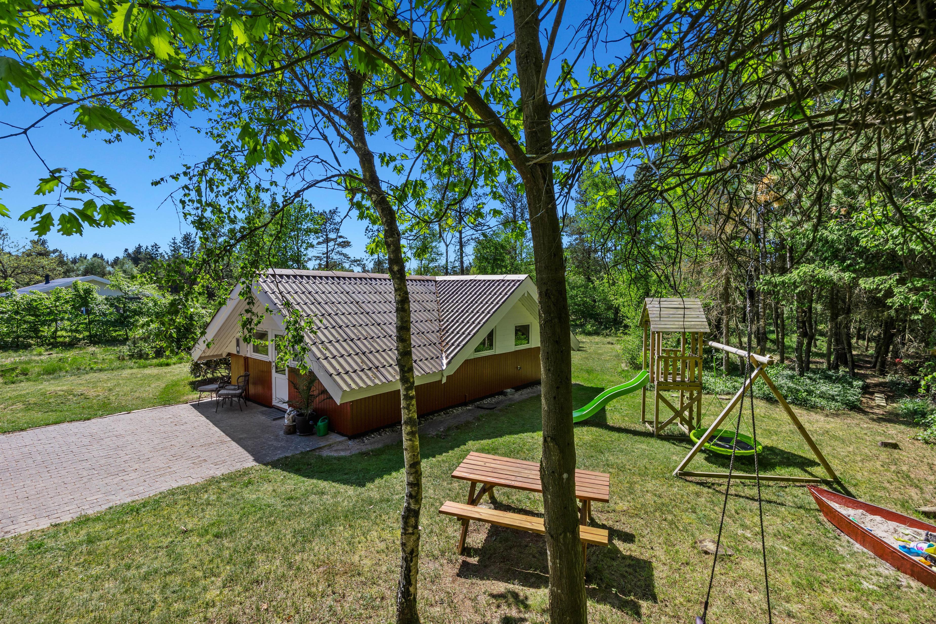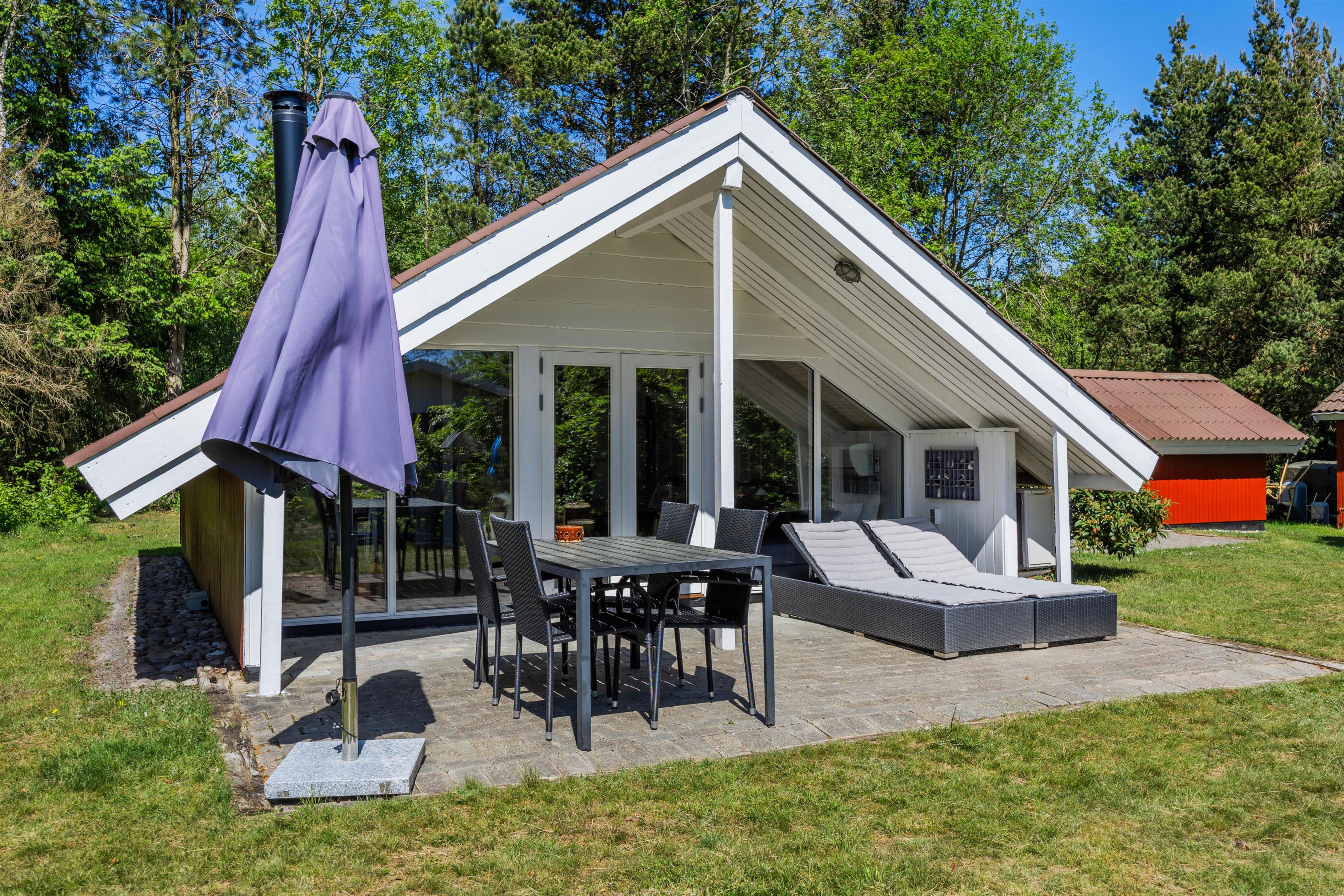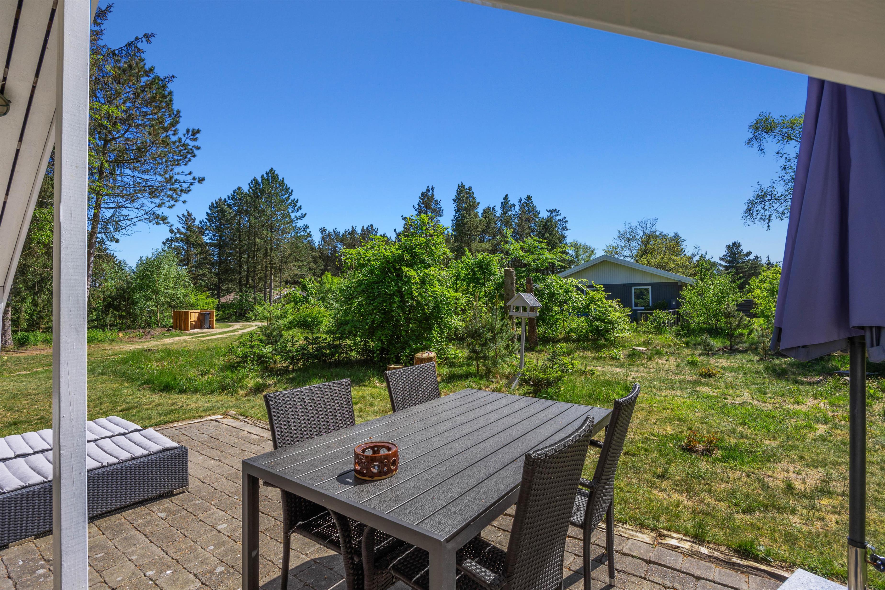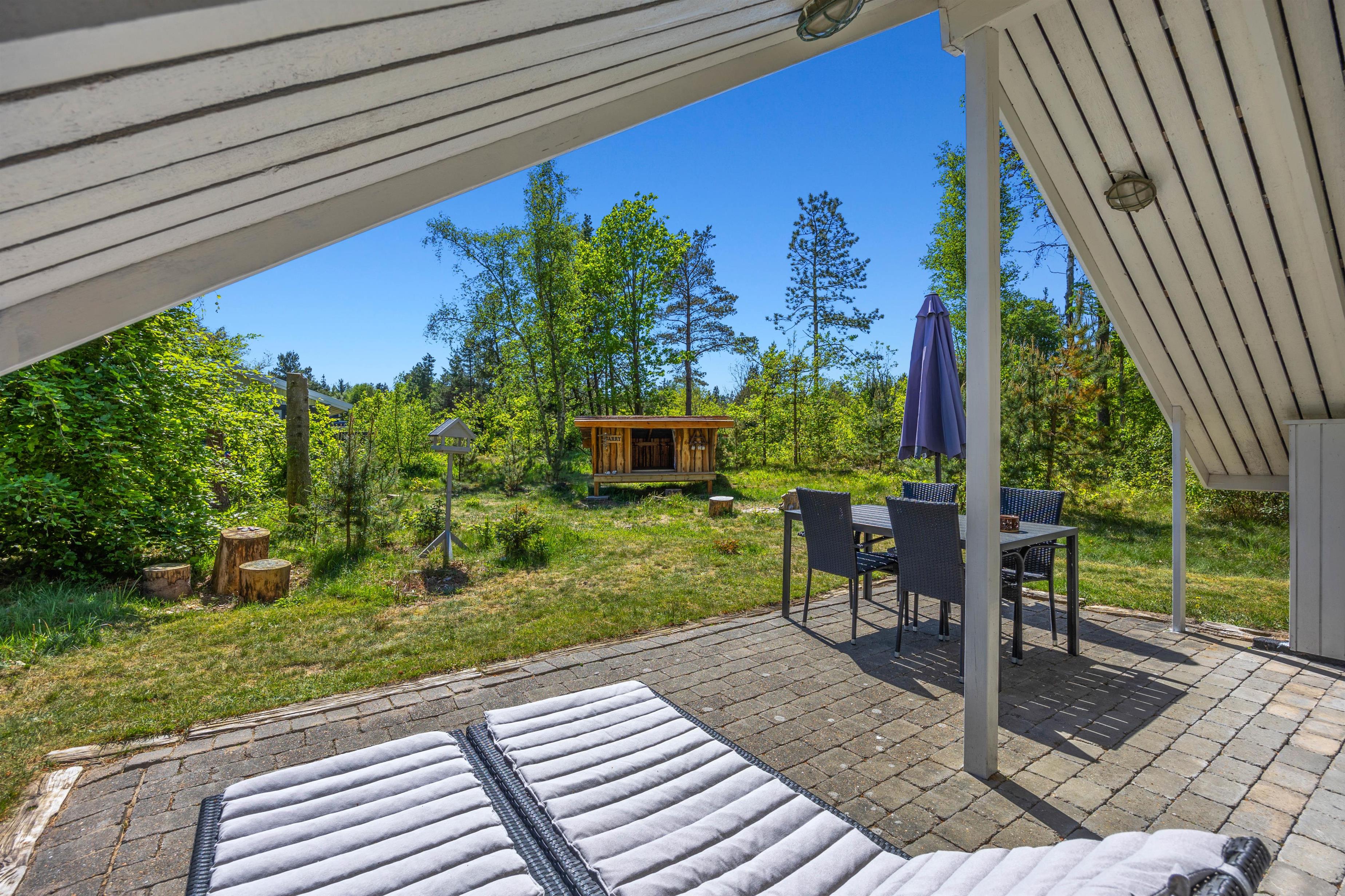 Feriehuset er beliggende på en grøn plænegrund, hvor I sagtens kan spille kongespil osv. Her er en delvist overdækket fliseterrasse, hvor I kan nyde solen og de lune sommeraftner. På de lune sommeraftner skal der naturligvis tændes op i husets grill – steg nogle ekstra lækre bøffer og nyd dertil et godt glas vin. Dertil er der også en hyggelig shelter, hvis I har mod på at overnatte ude i det fri.