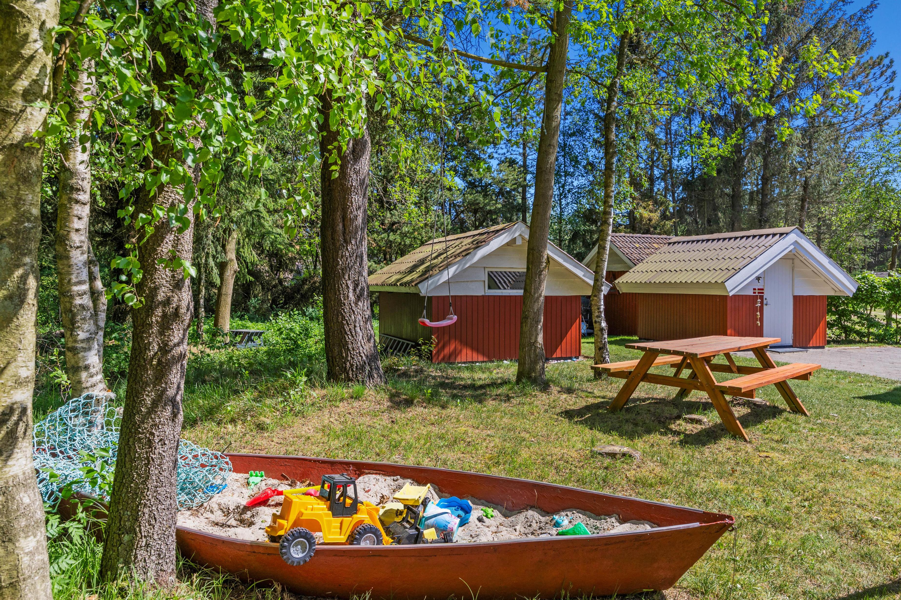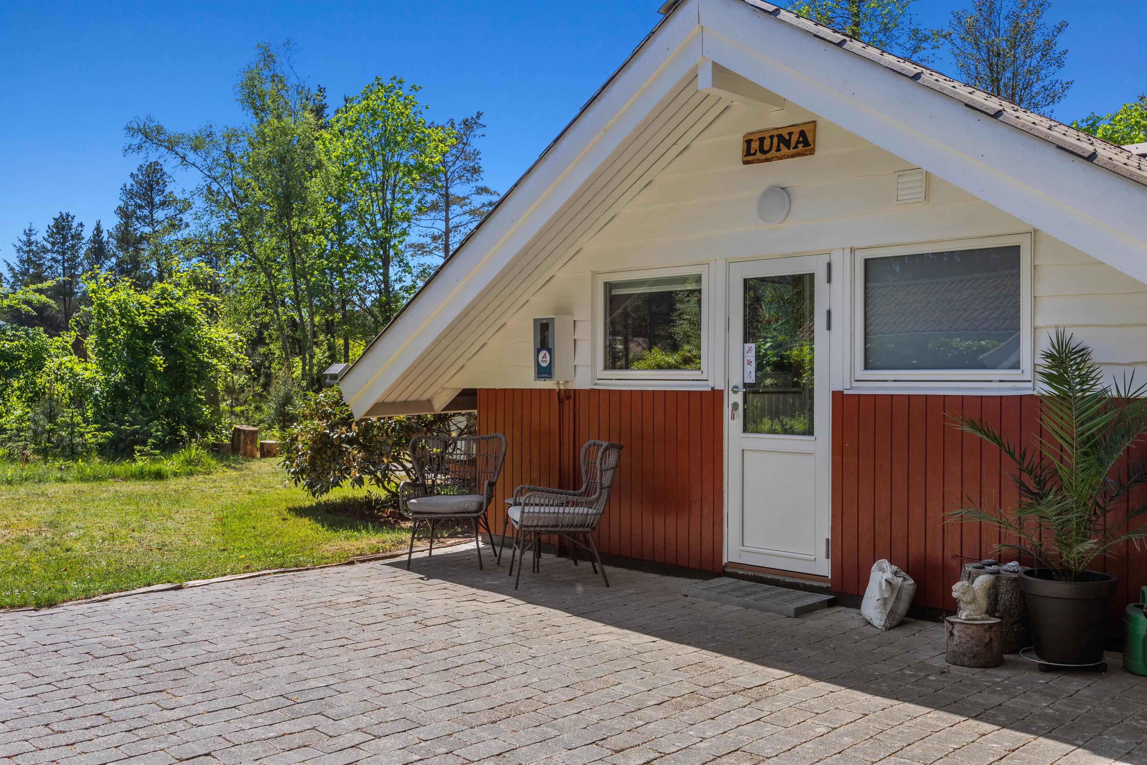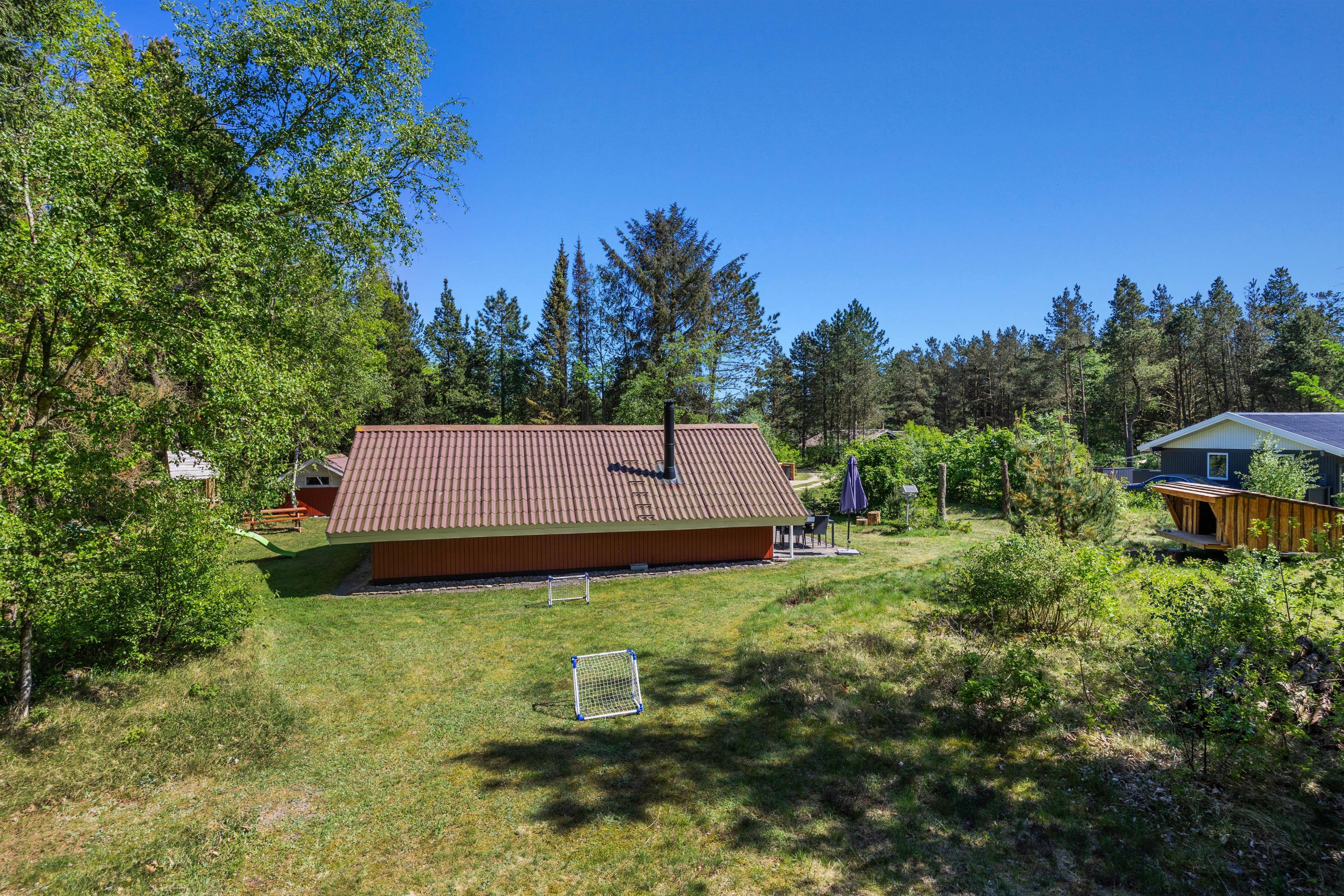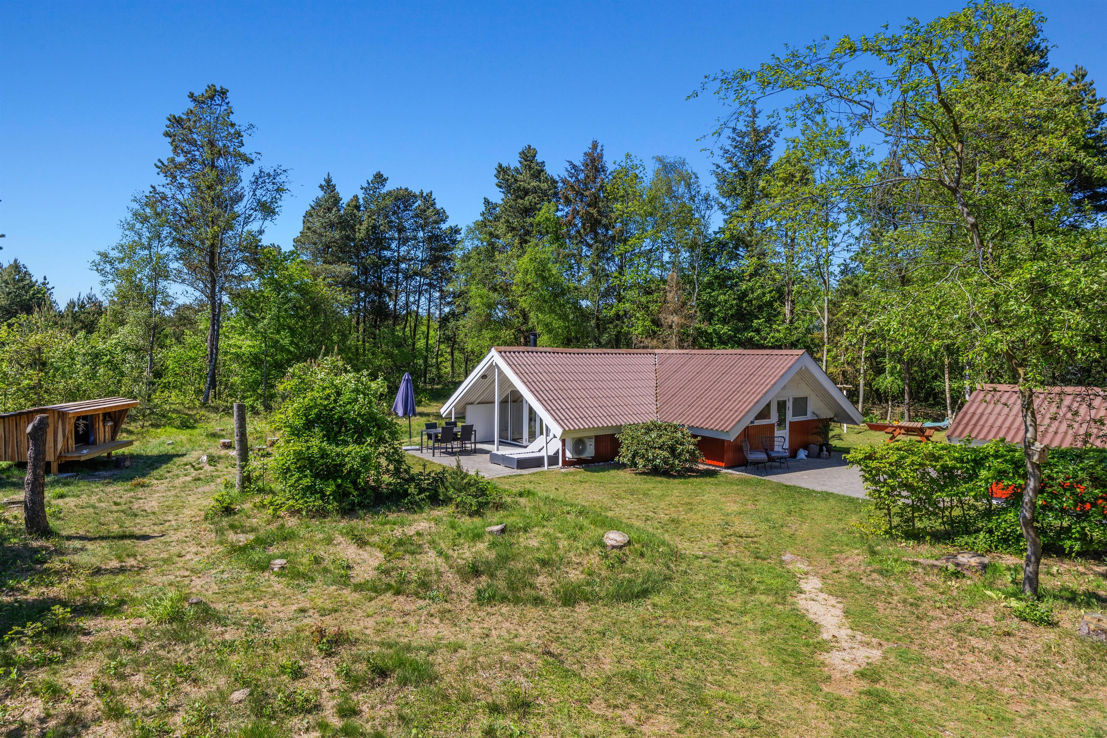 Feriehuset er beliggende på en grøn plænegrund, hvor I sagtens kan spille kongespil osv. Her er en delvist overdækket fliseterrasse, hvor I kan nyde solen og de lune sommeraftner. På de lune sommeraftner skal der naturligvis tændes op i husets grill – steg nogle ekstra lækre bøffer og nyd dertil et godt glas vin. Dertil er der også en hyggelig shelter, hvis I har mod på at overnatte ude i det fri.
