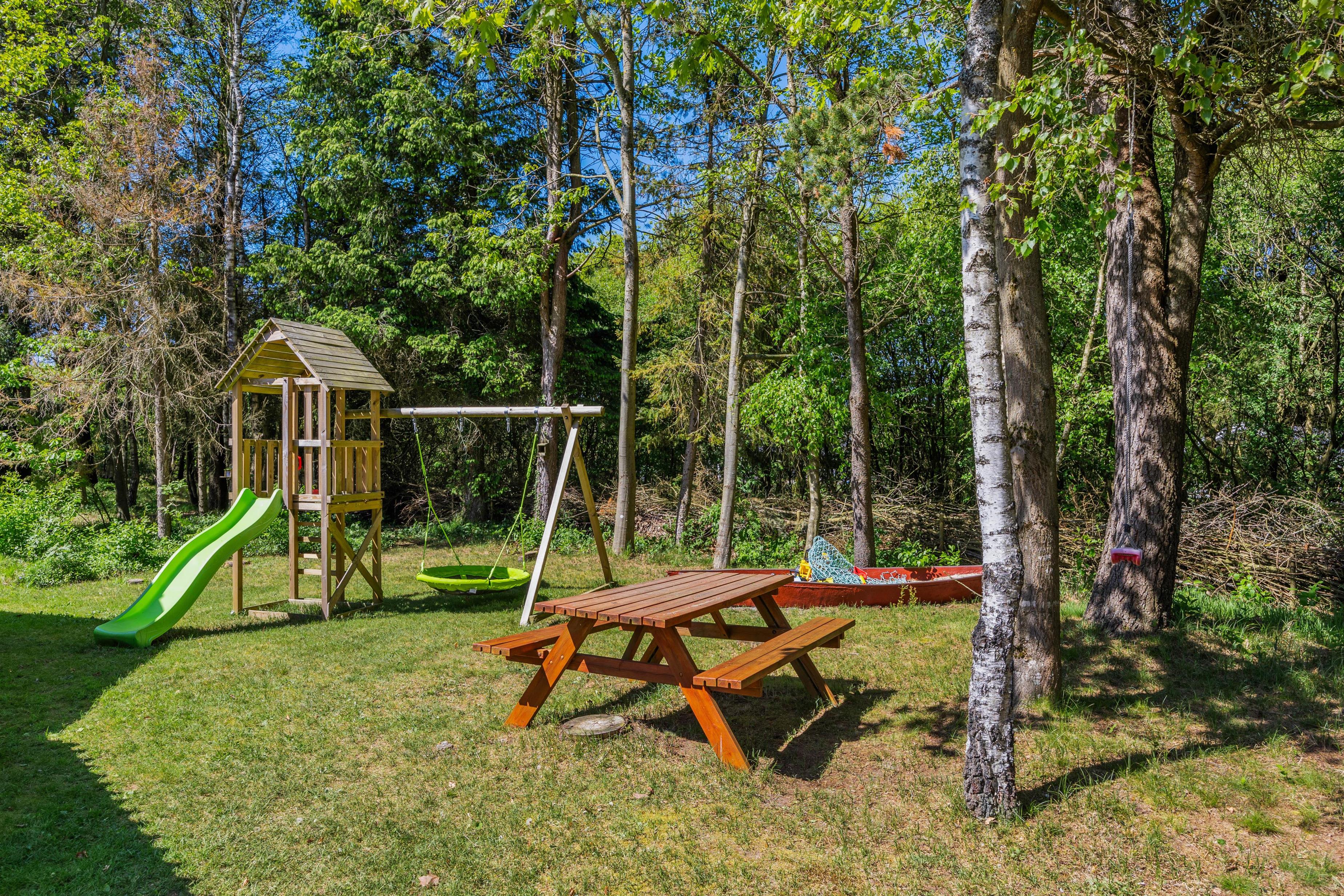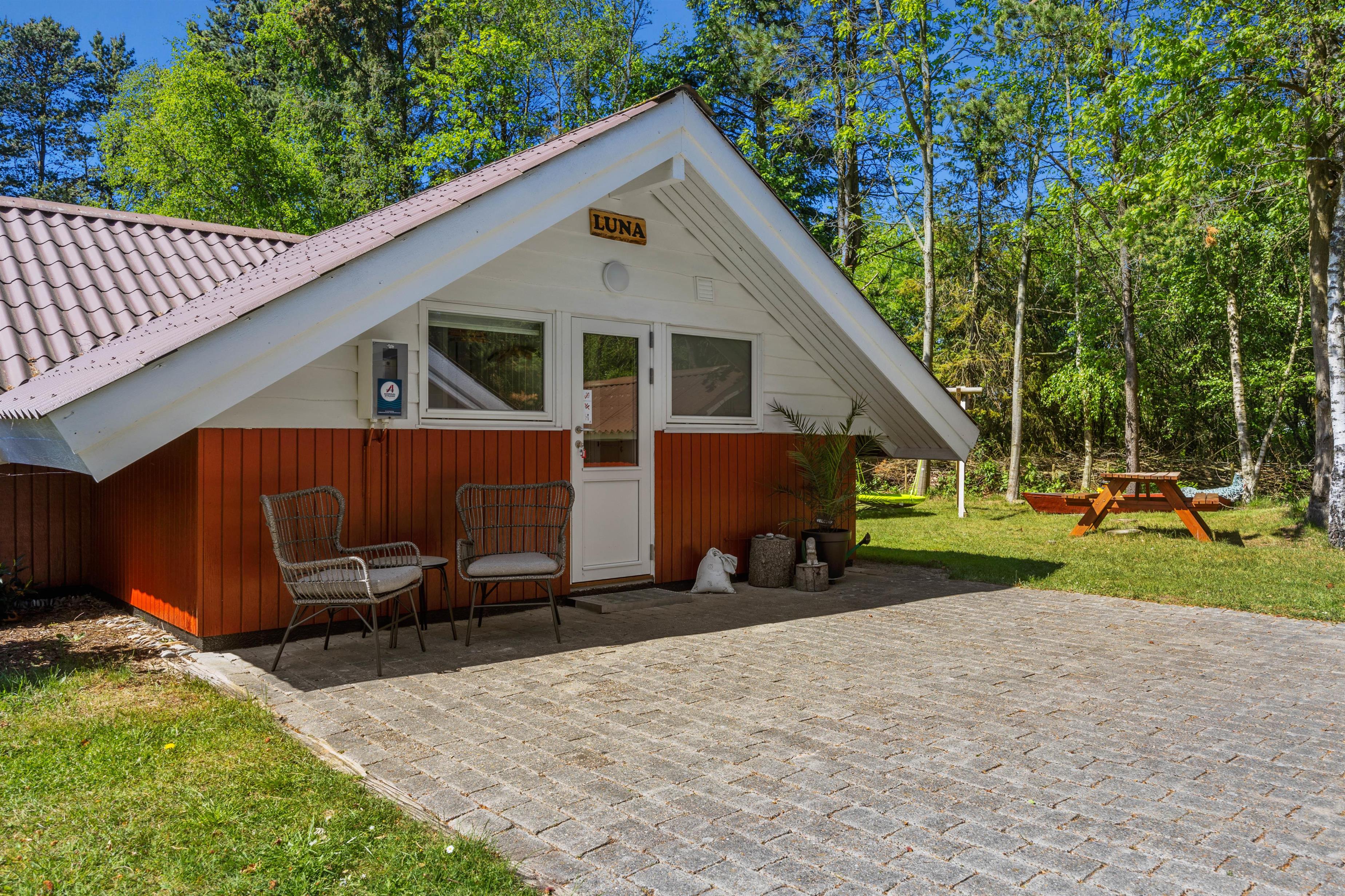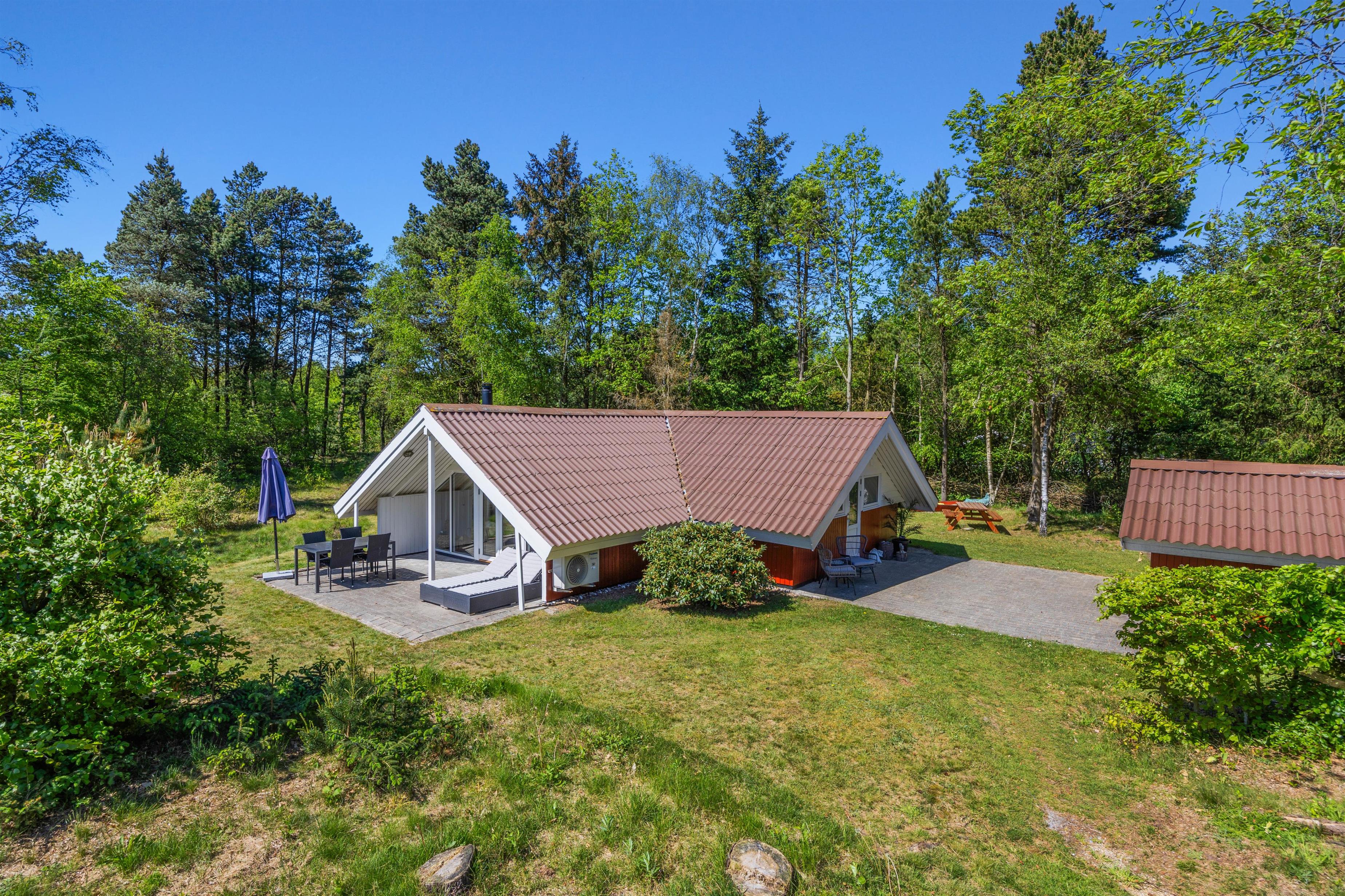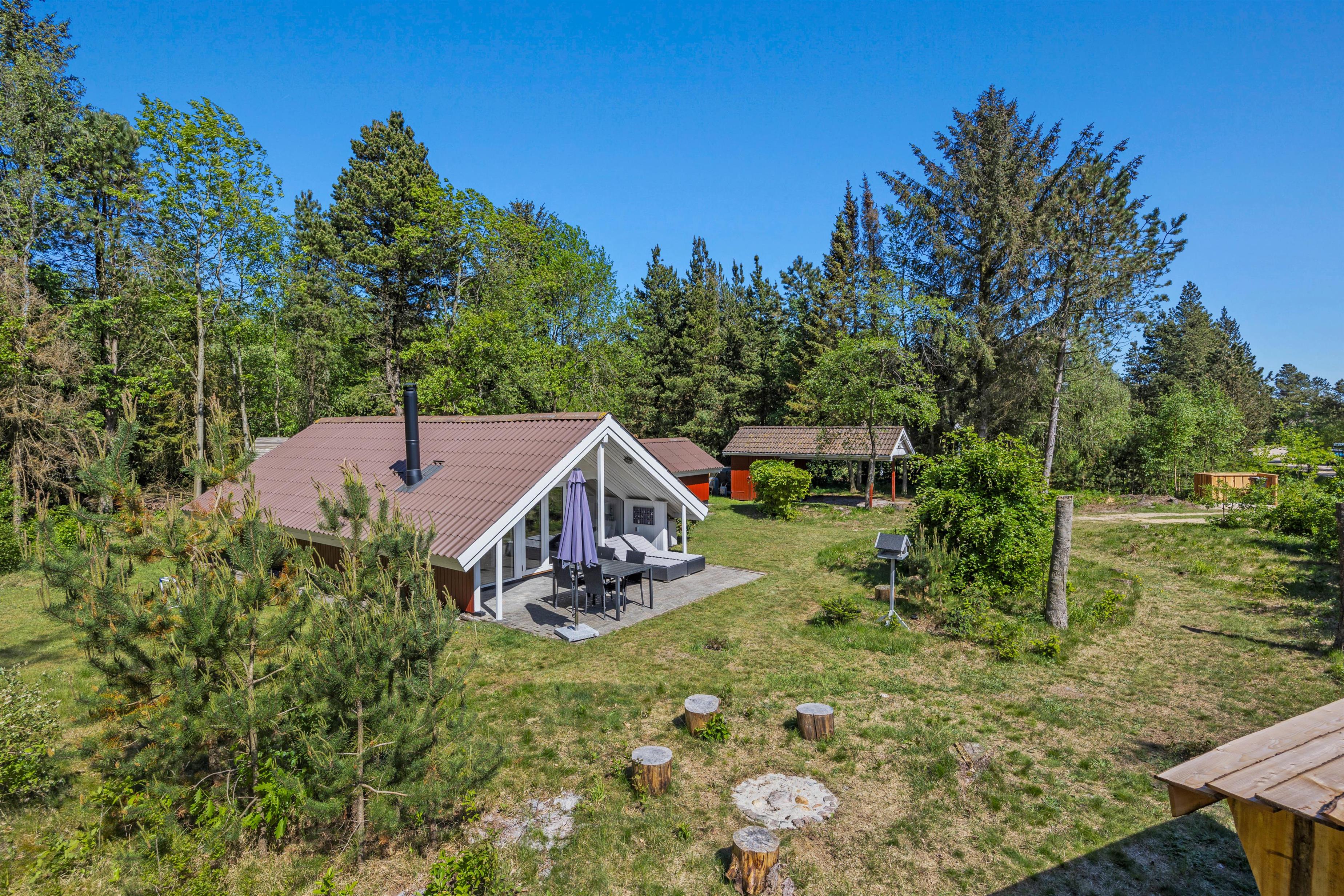 Feriehuset er beliggende på en grøn plænegrund, hvor I sagtens kan spille kongespil osv. Her er en delvist overdækket fliseterrasse, hvor I kan nyde solen og de lune sommeraftner. På de lune sommeraftner skal der naturligvis tændes op i husets grill – steg nogle ekstra lækre bøffer og nyd dertil et godt glas vin. Dertil er der også en hyggelig shelter, hvis I har mod på at overnatte ude i det fri.