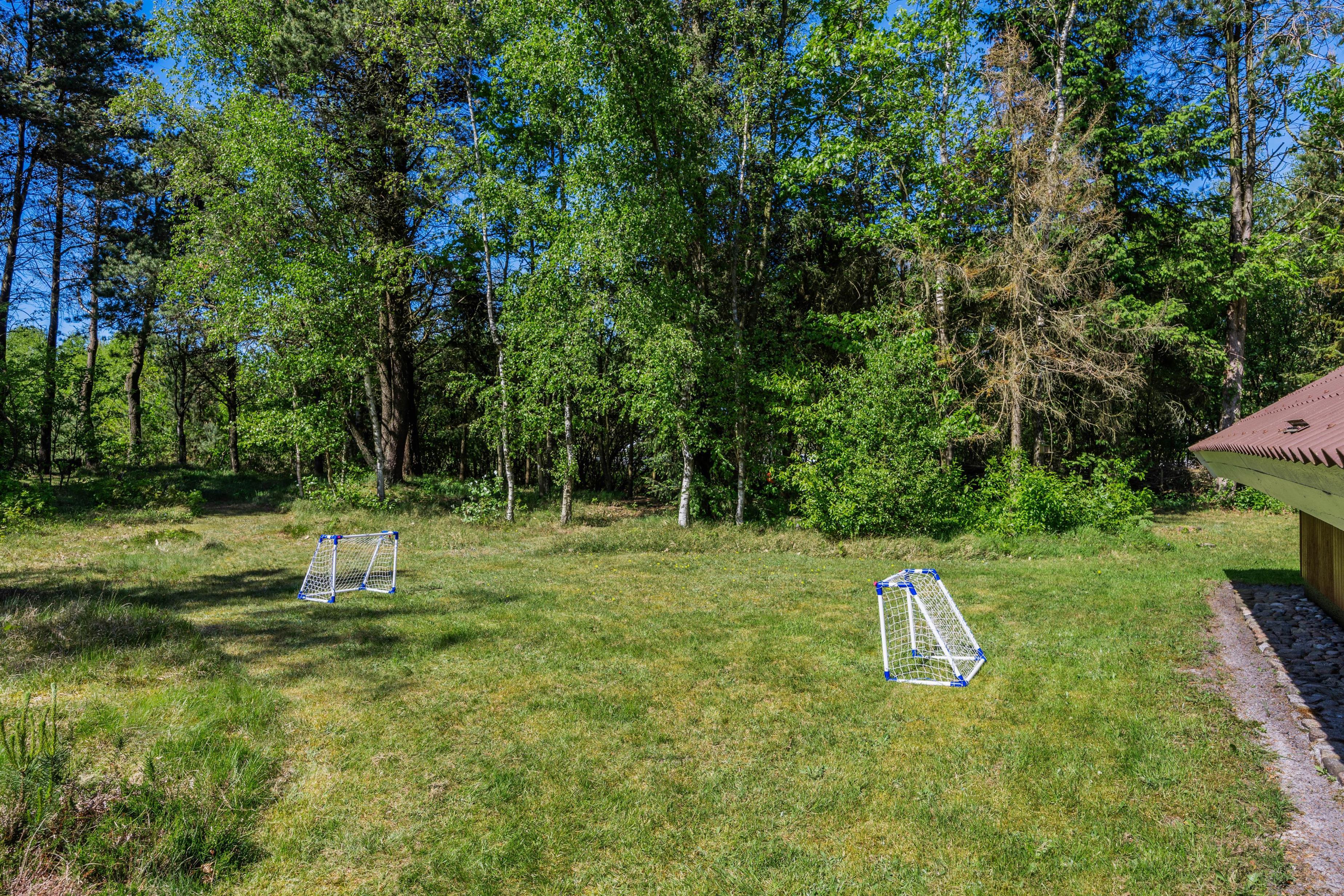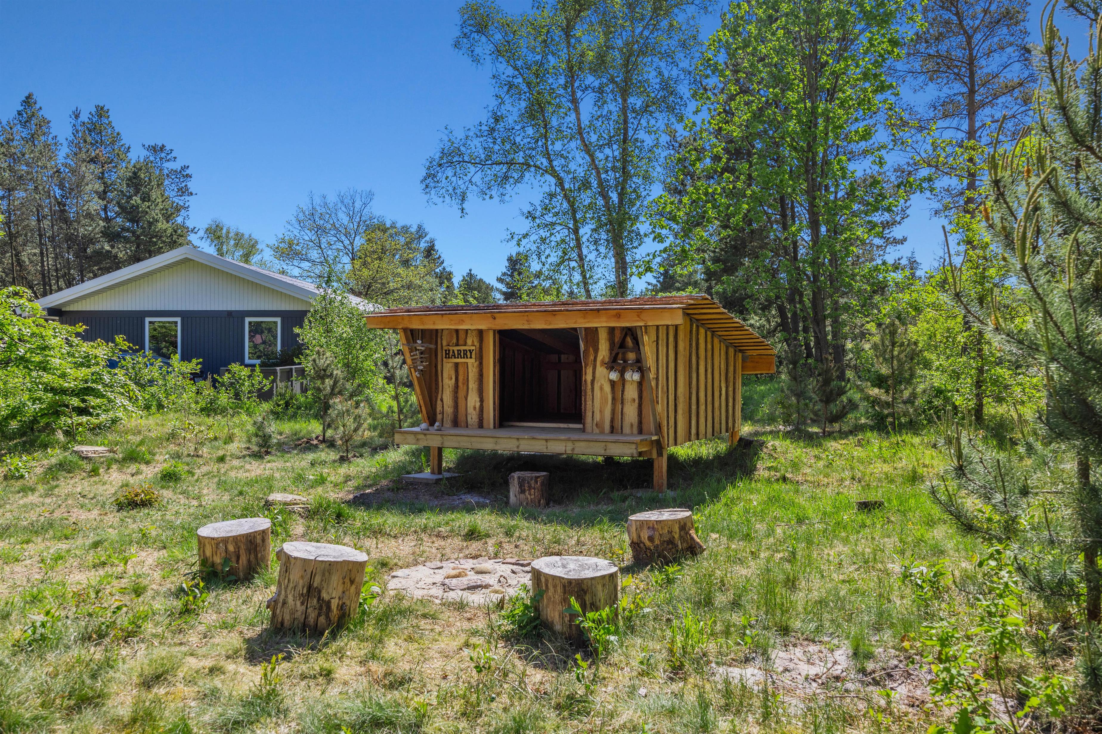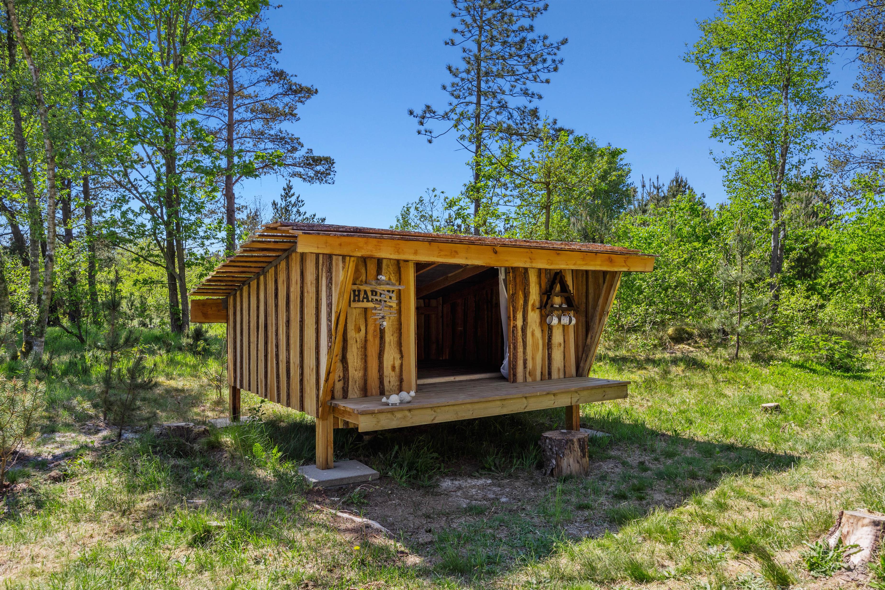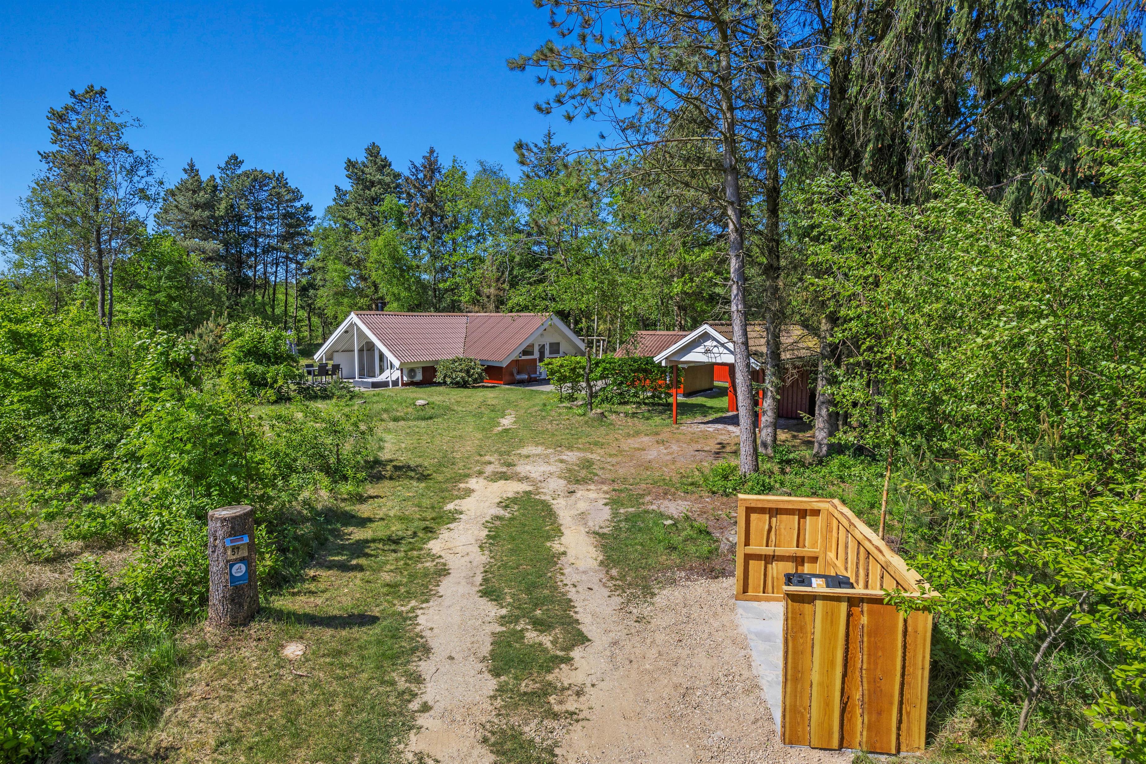 Feriehuset er beliggende på en grøn plænegrund, hvor I sagtens kan spille kongespil osv. Her er en delvist overdækket fliseterrasse, hvor I kan nyde solen og de lune sommeraftner. På de lune sommeraftner skal der naturligvis tændes op i husets grill – steg nogle ekstra lækre bøffer og nyd dertil et godt glas vin. Dertil er der også en hyggelig shelter, hvis I har mod på at overnatte ude i det fri.