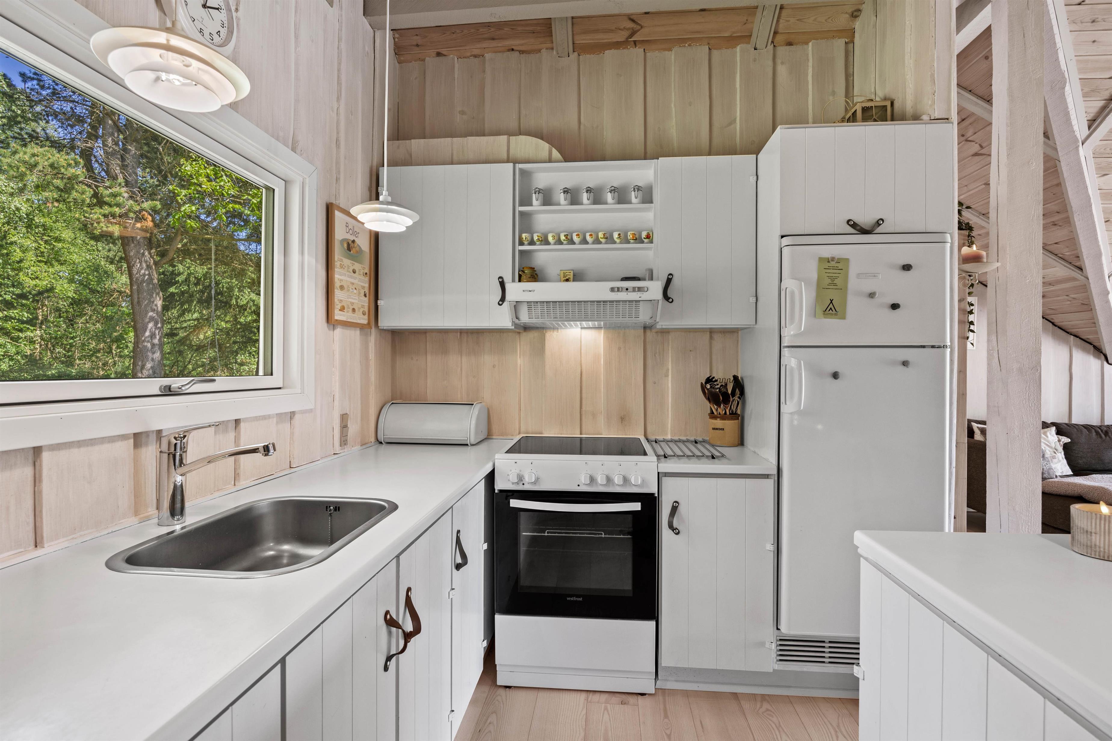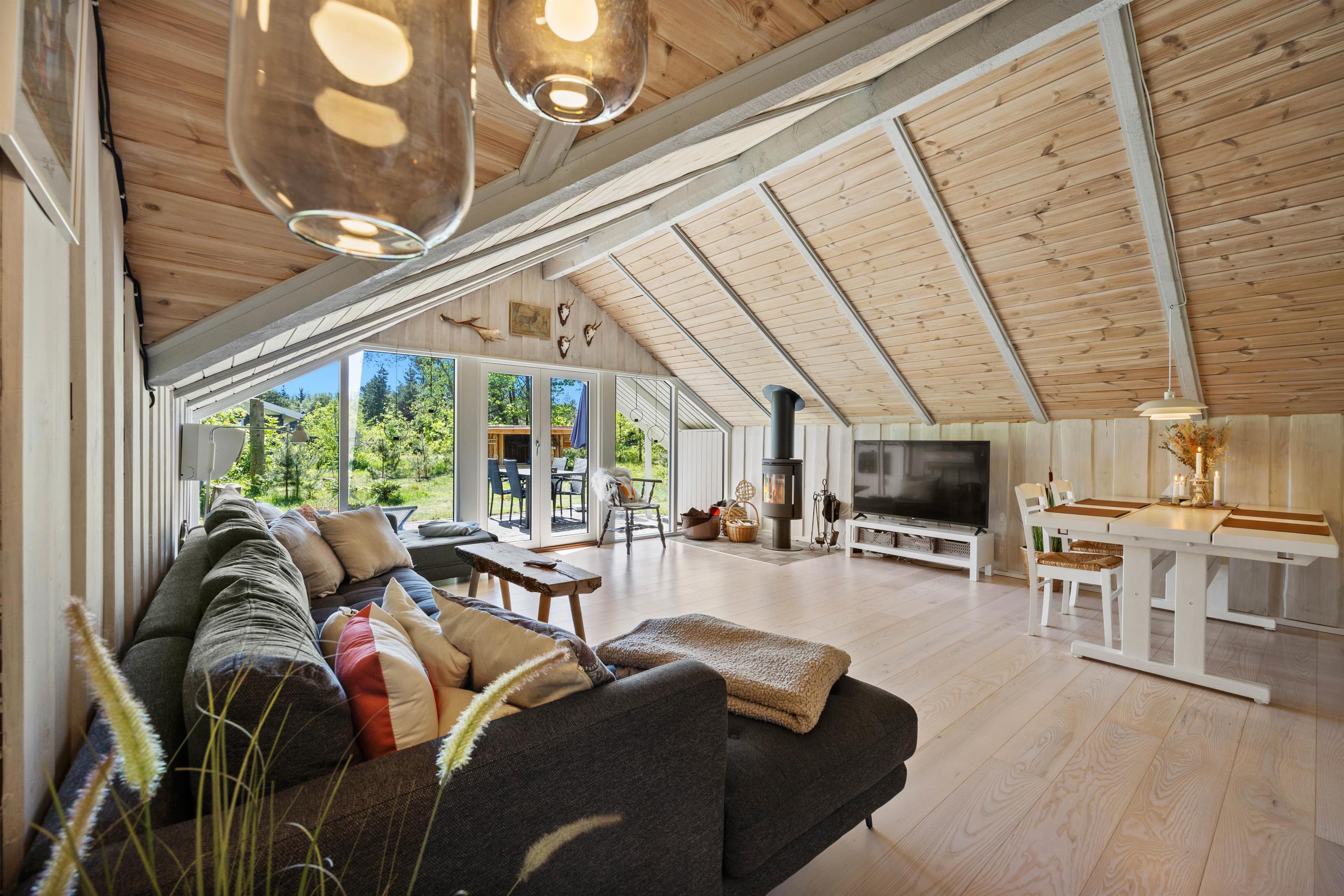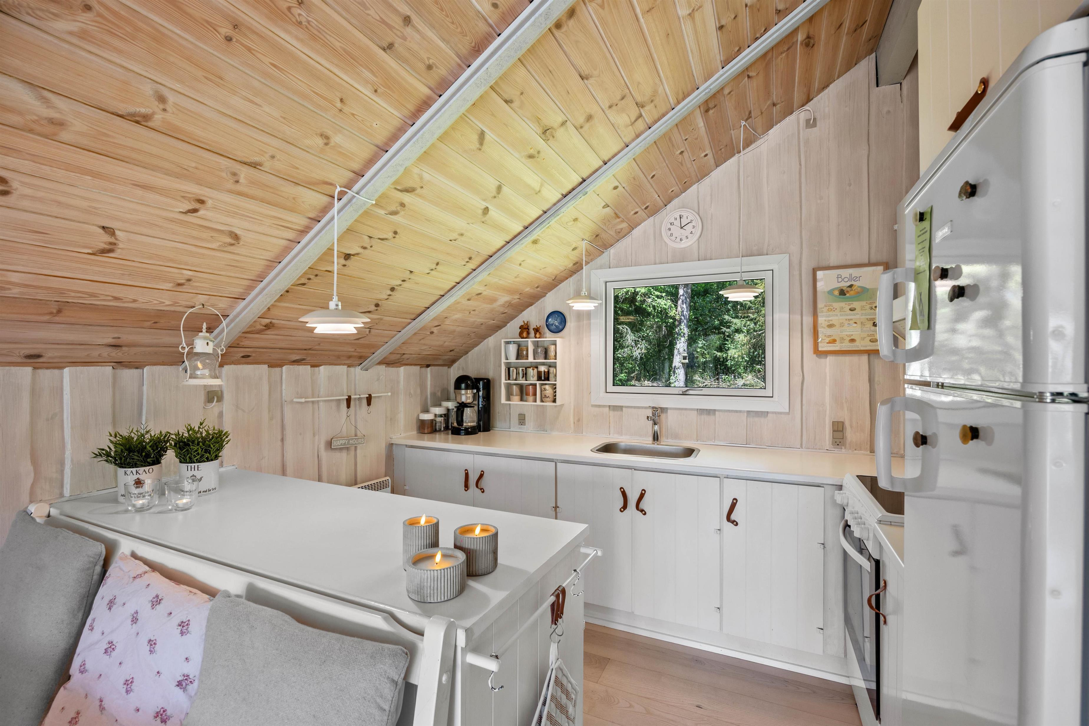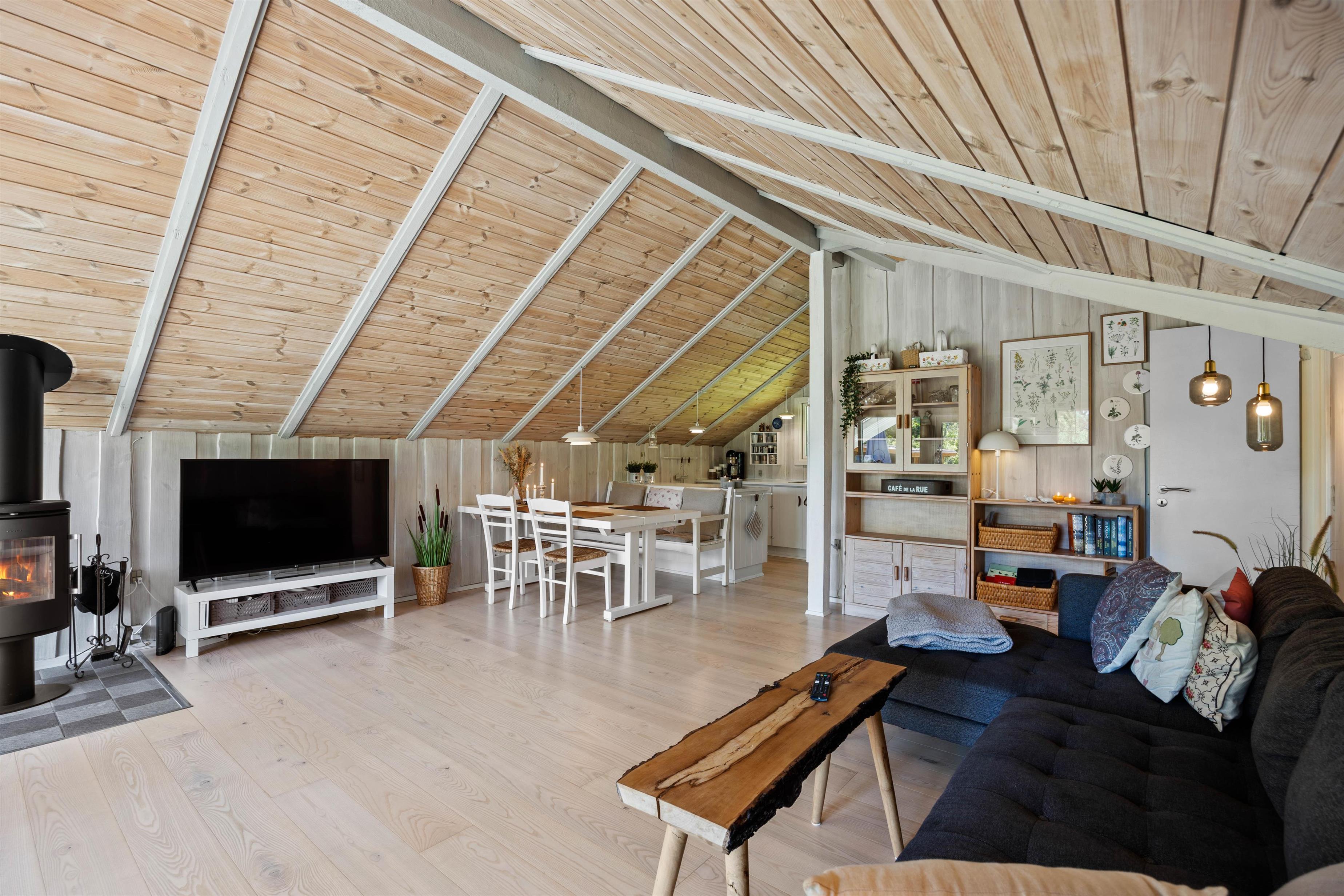 Stue og køkkenet smelter her sammen som ét og danner et skønt alrum – feriehusets hjerterum, hvor I alle kan samles. Daybed´en og den store hjørnesofa indbyder til total afslapning med film, en god bog eller et hyggeligt brætspil. Også her kan man nyde en kop kaffe, mens den knitrende brændeovn spreder en dejlig varme i rummet. I det lille søde køkken, kan I sammen lave nogle dejlige måltider eller forberede desserten til aftenkaffen. Praktisk er her en energibesparende varmepumpe samt direkte udgang til terrassen.