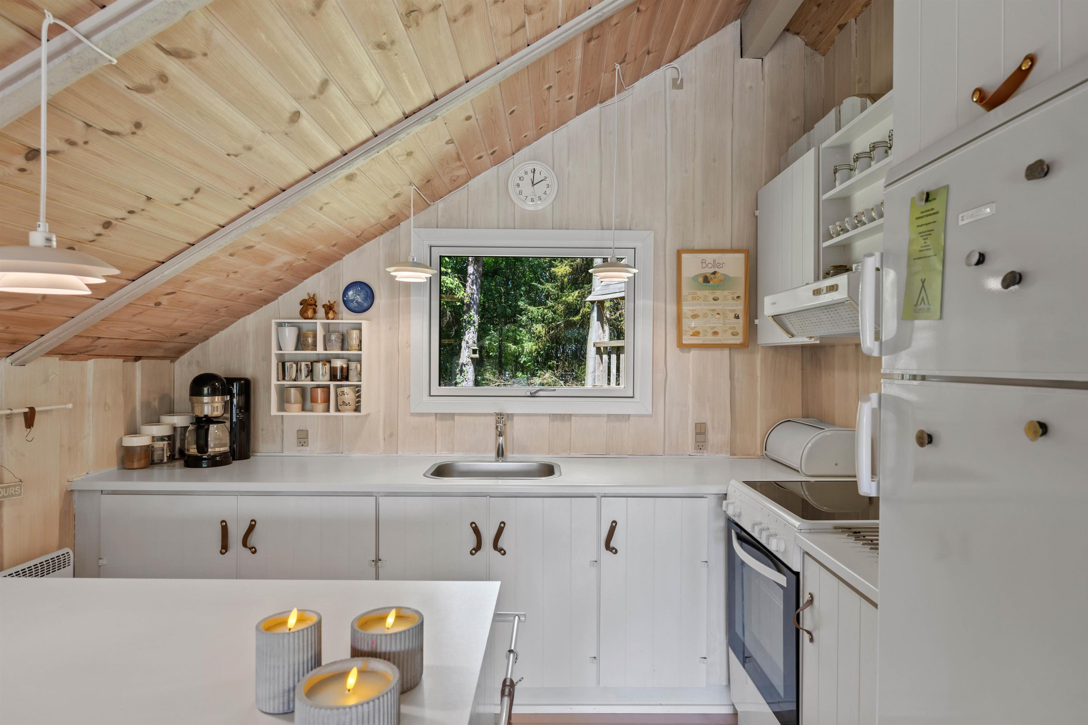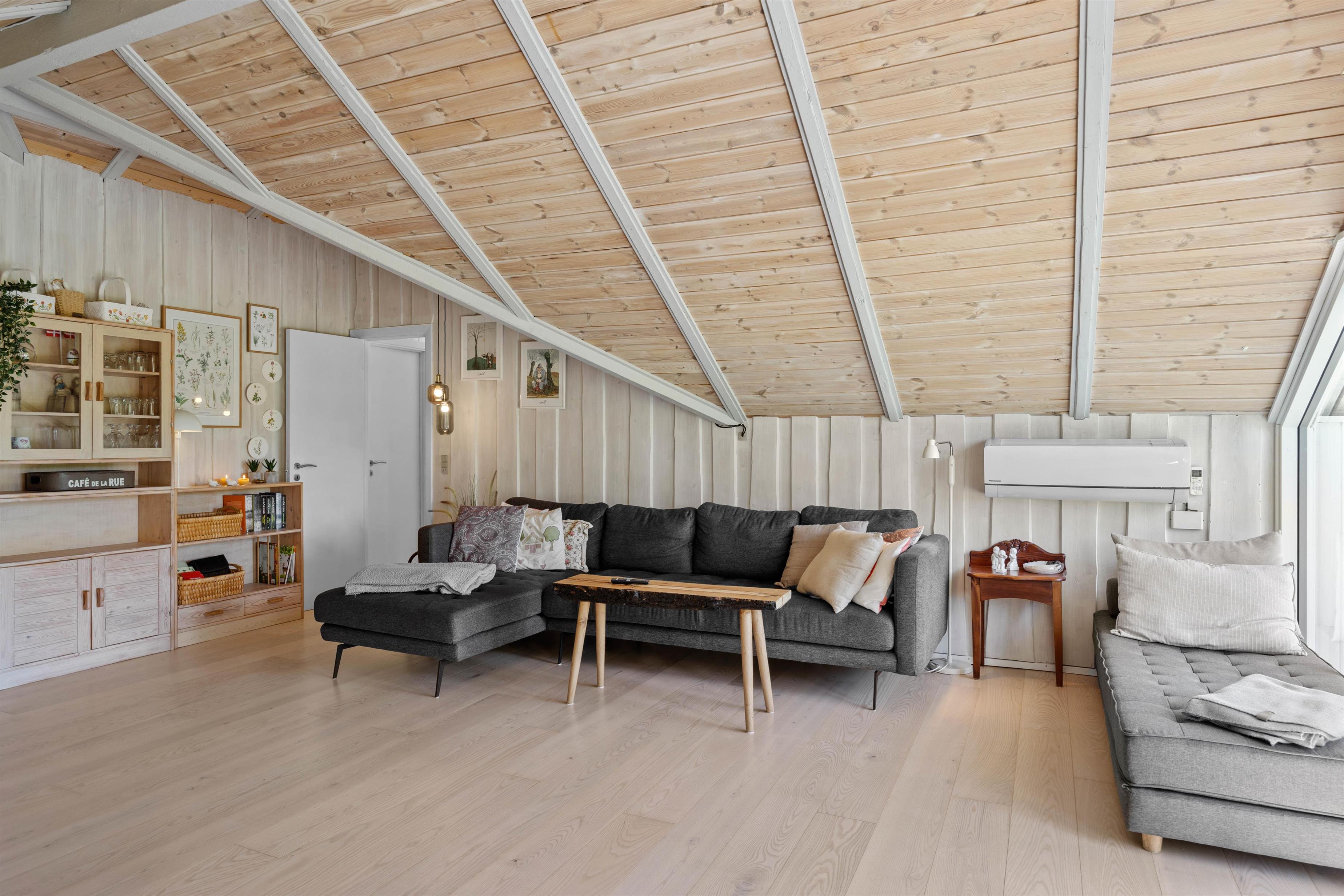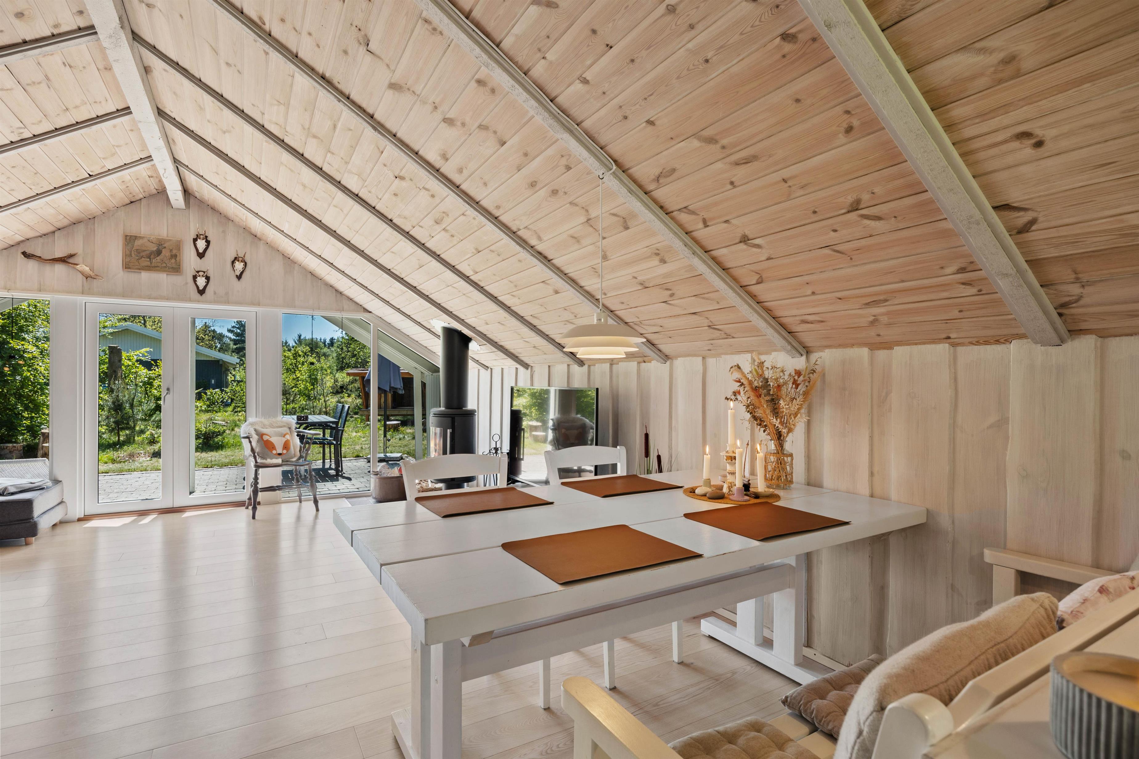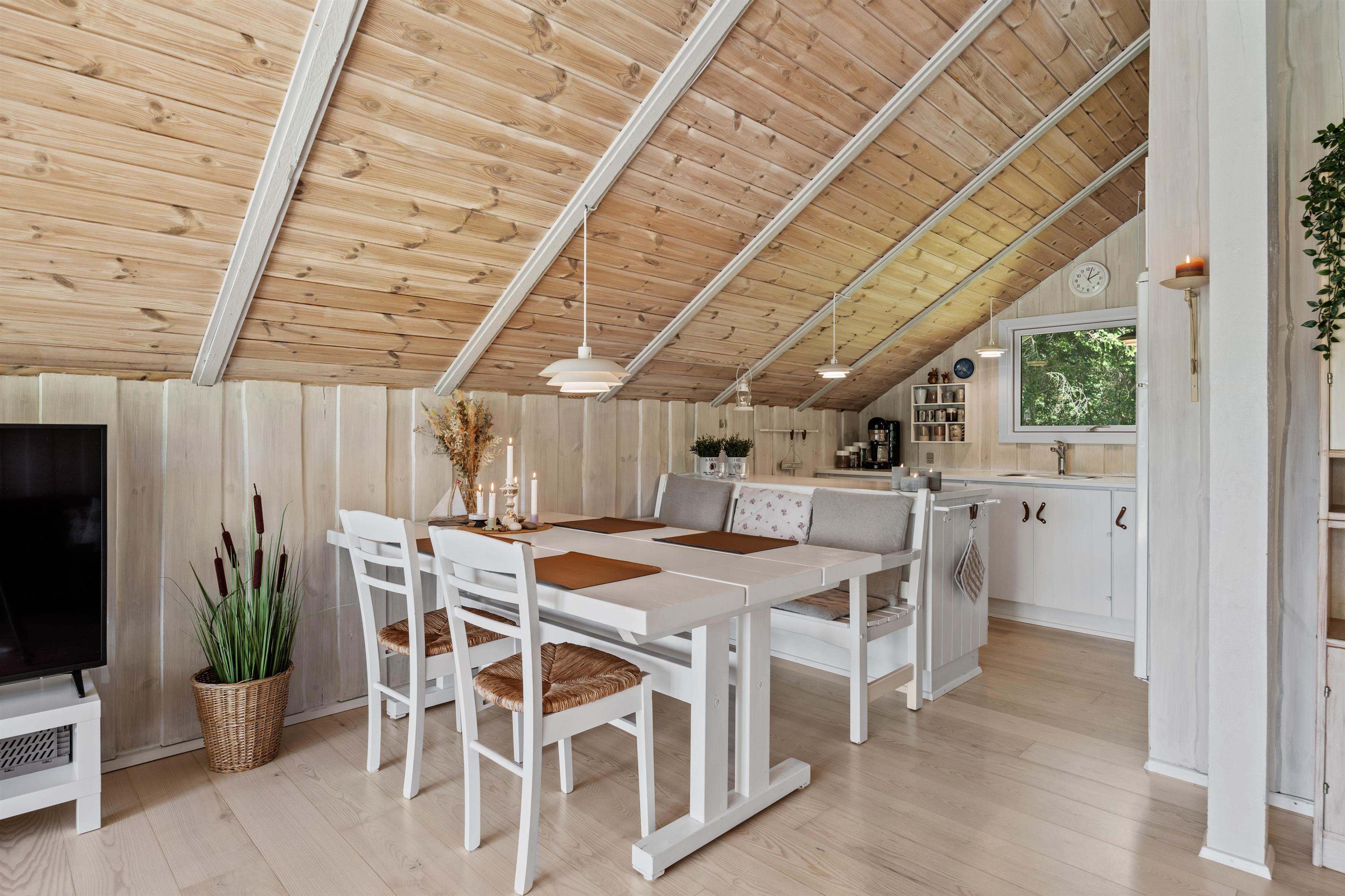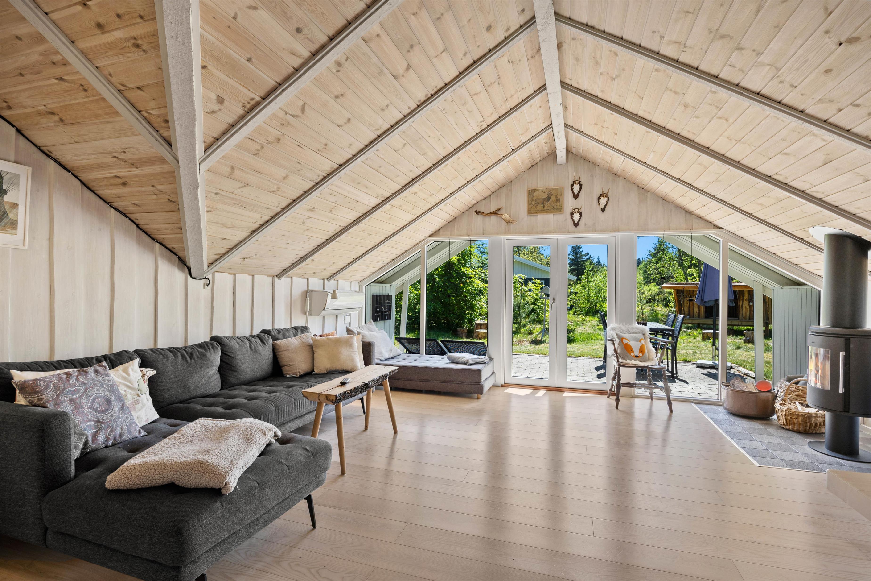 Stue og køkkenet smelter her sammen som ét og danner et skønt alrum – feriehusets hjerterum, hvor I alle kan samles. Daybed´en og den store hjørnesofa indbyder til total afslapning med film, en god bog eller et hyggeligt brætspil. Også her kan man nyde en kop kaffe, mens den knitrende brændeovn spreder en dejlig varme i rummet. I det lille søde køkken, kan I sammen lave nogle dejlige måltider eller forberede desserten til aftenkaffen. Praktisk er her en energibesparende varmepumpe samt direkte udgang til terrassen.