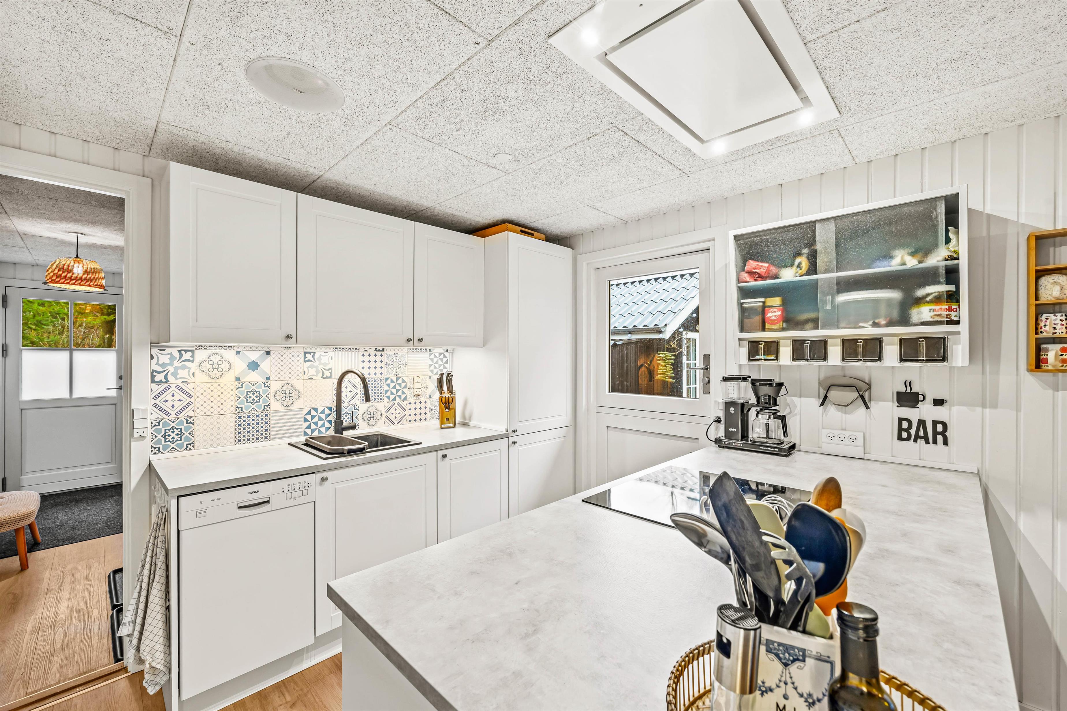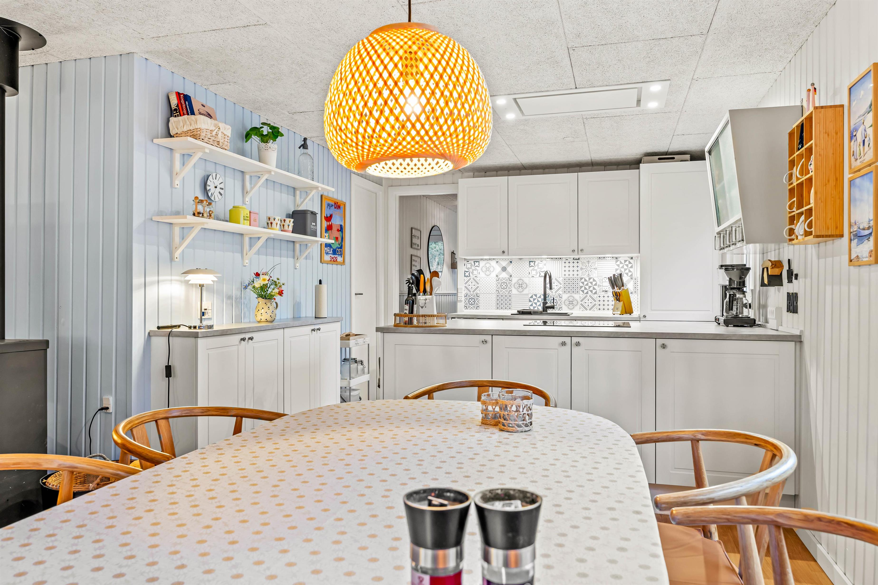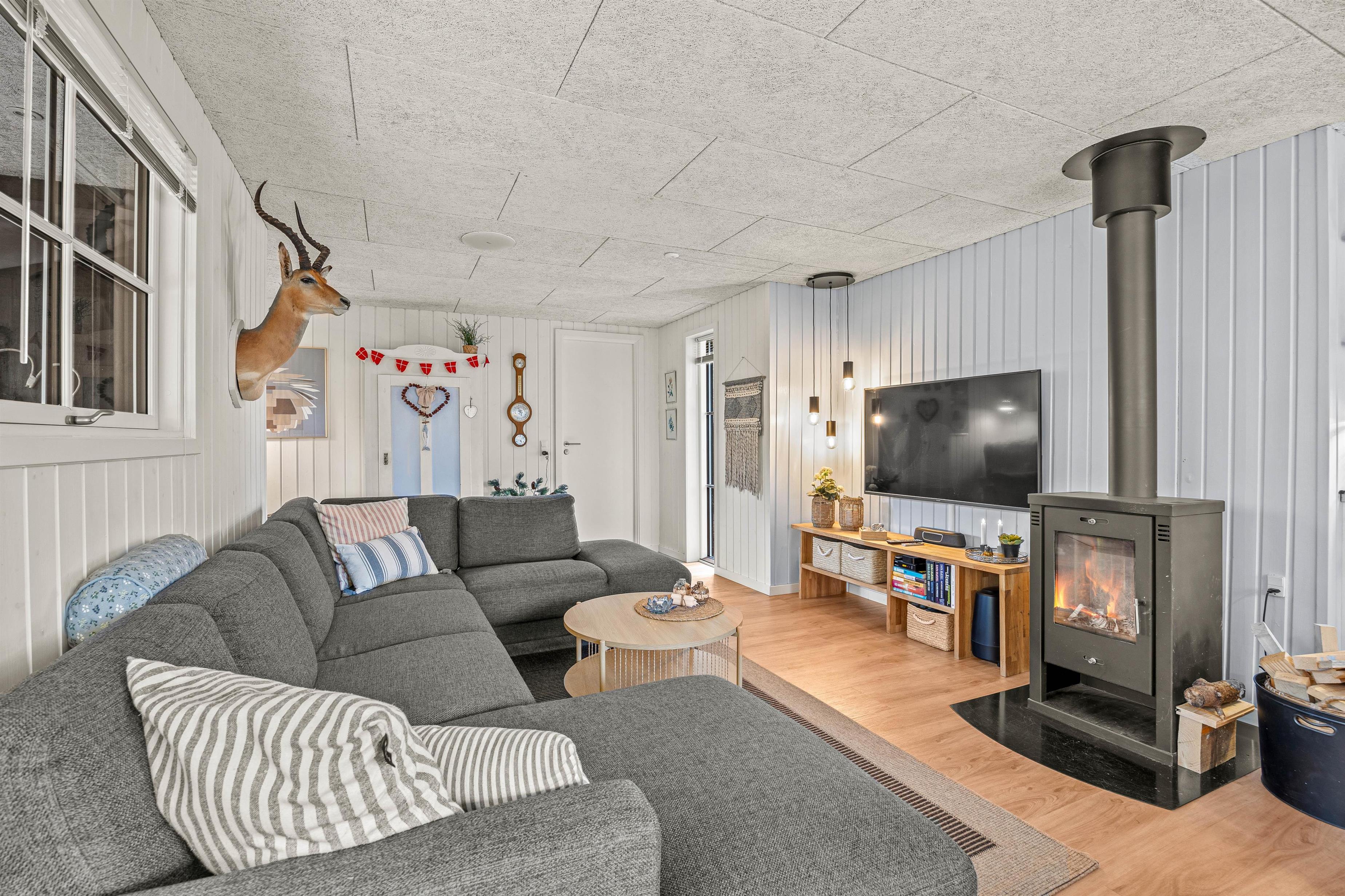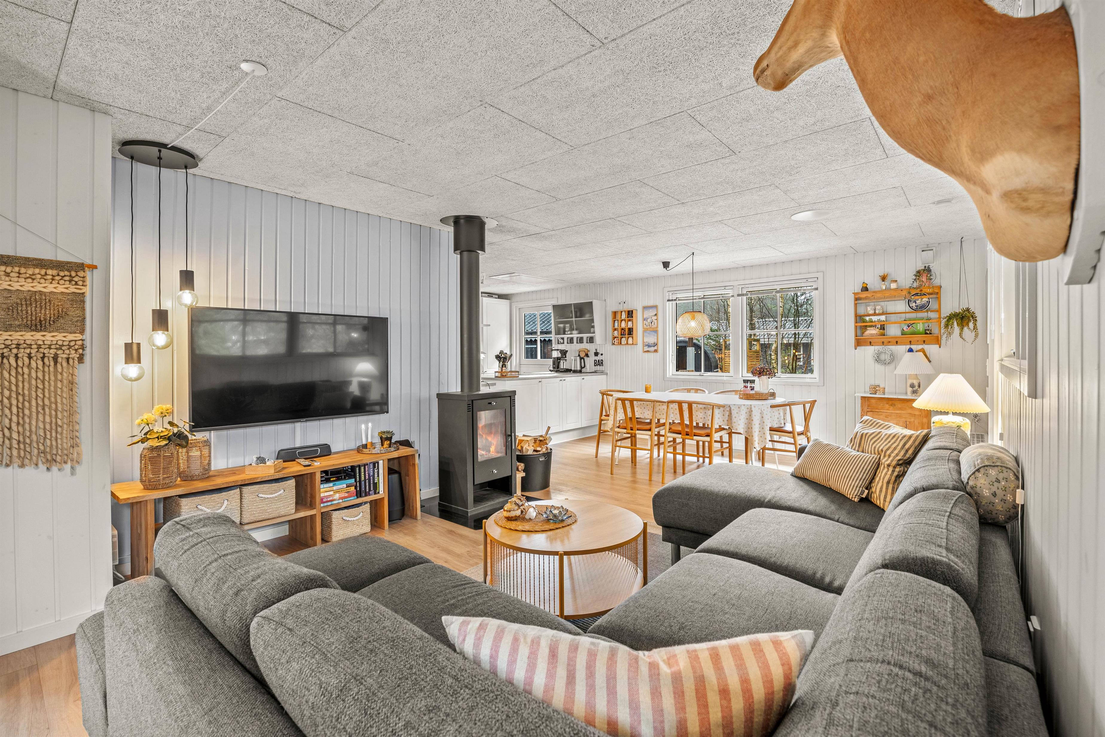 Det dejlige sommerhus er renoveret i 2021, og har en skøn moderne indretning med masser af lys. Spiseafdeling, stue og køkken er kombineret, hvilket uden tvivl vil blive jeres samlingspunkt på ferien. Her kan I også nyde hinandens selskab foran feriehusets brændeovn med et godt glas vin.