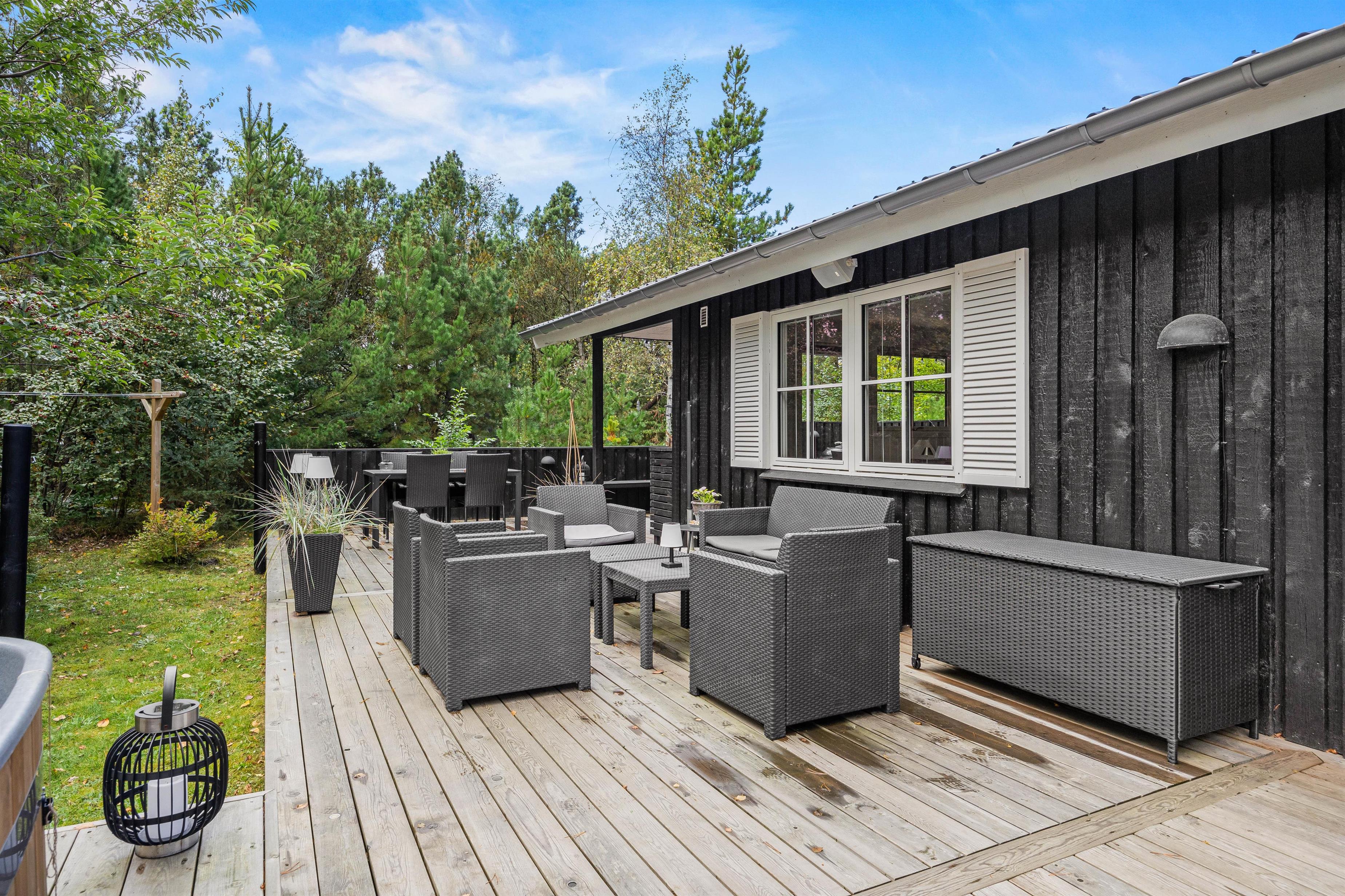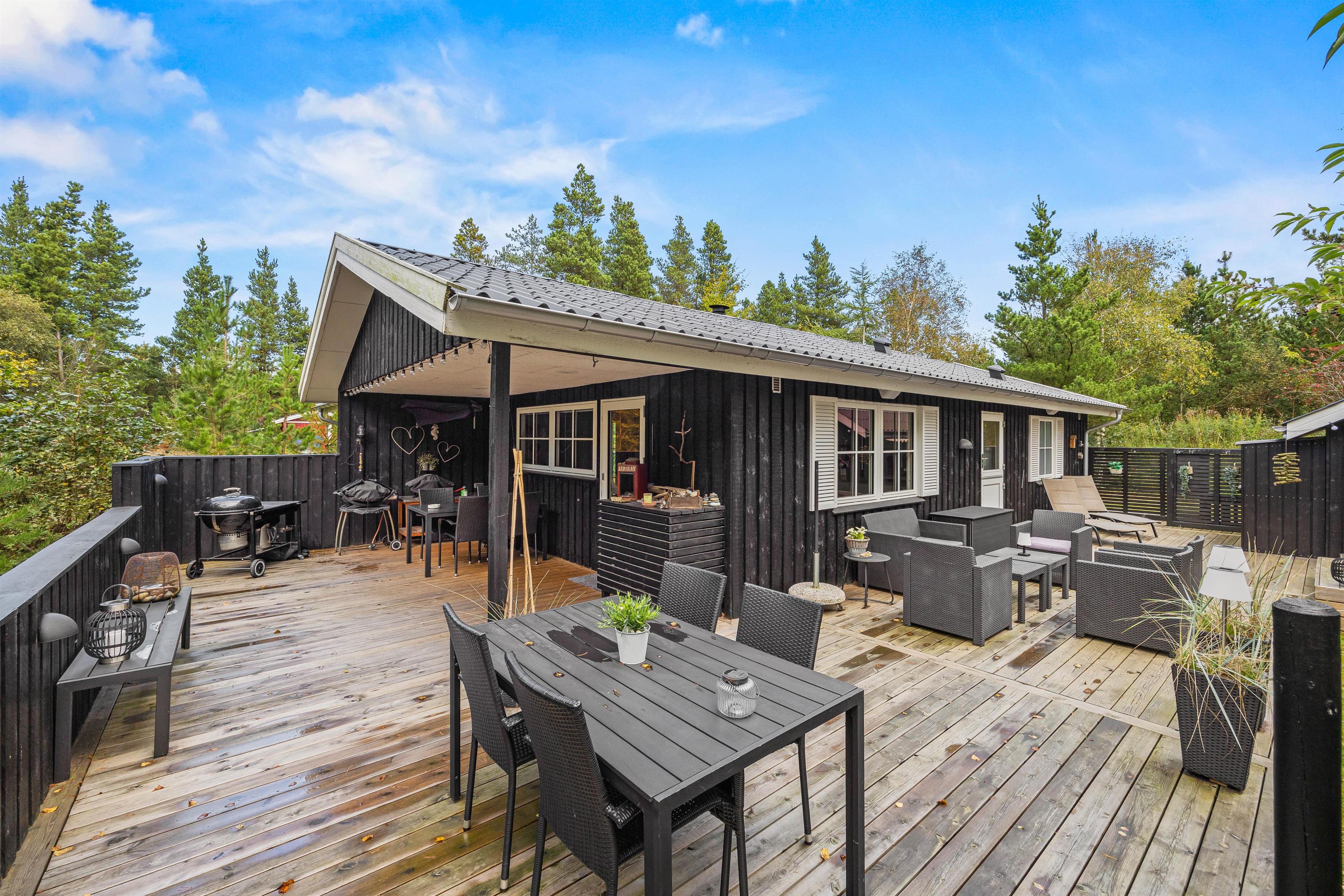 Sommerhuset har 2 skønne terrasser med havemøbler og liggestole. Den ene terrasse er vestvendt og overdækket, så I kan kravle i skygge med en god bog, eller stå i læ med grillen. Den anden terrasse er sydvendt og afskærmet, hvor I kan nyde den dejlige sol fra morgenstunden med en god kop kaffe.