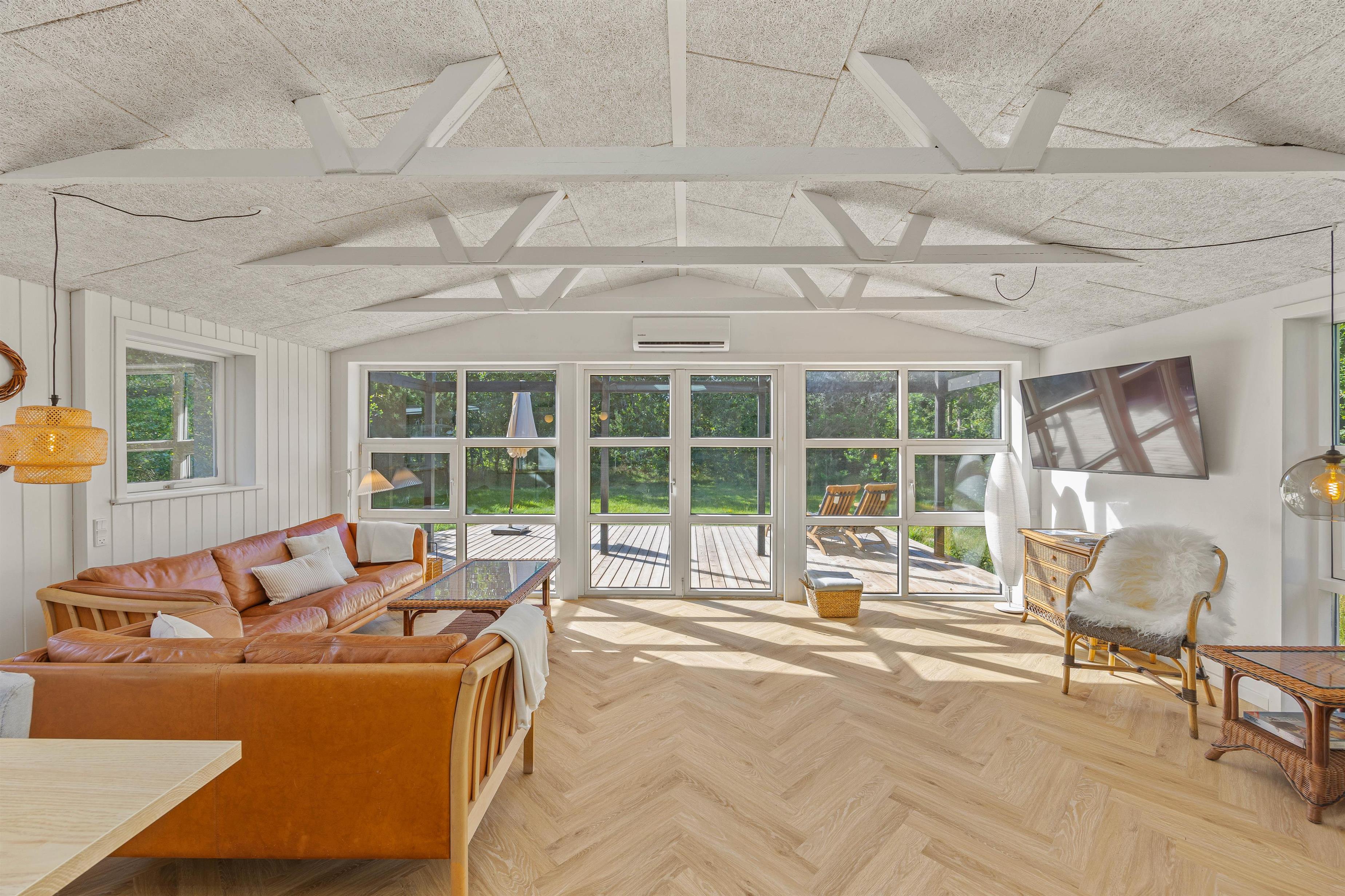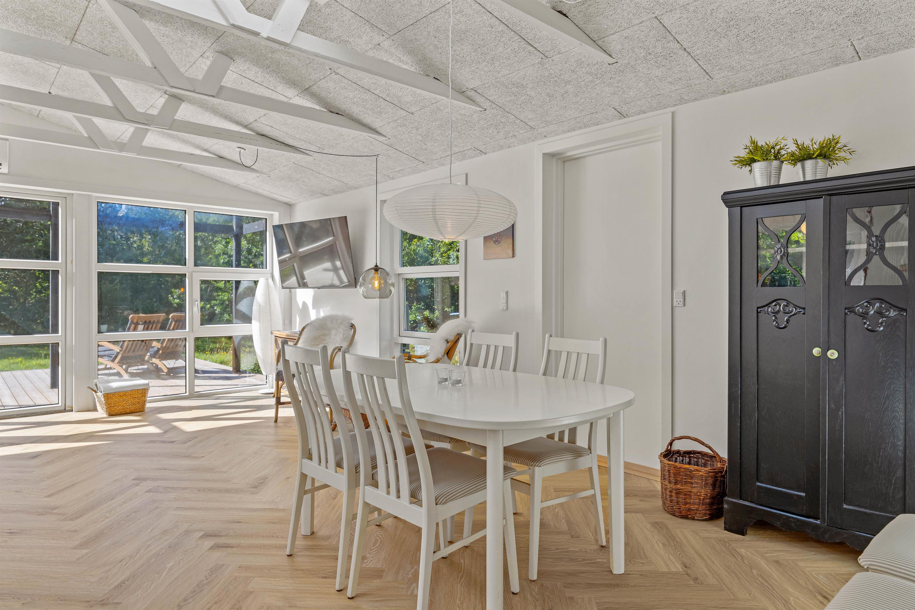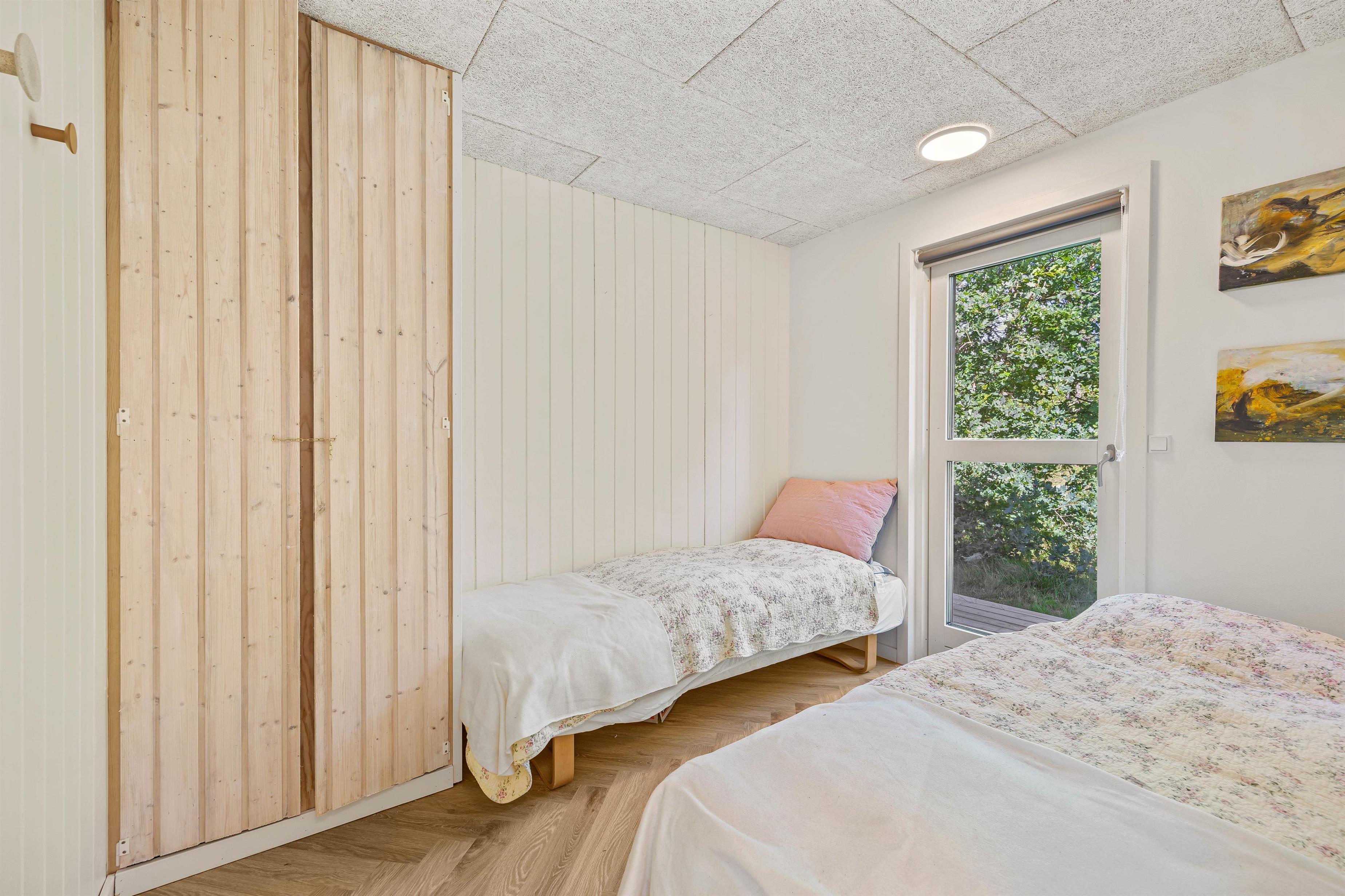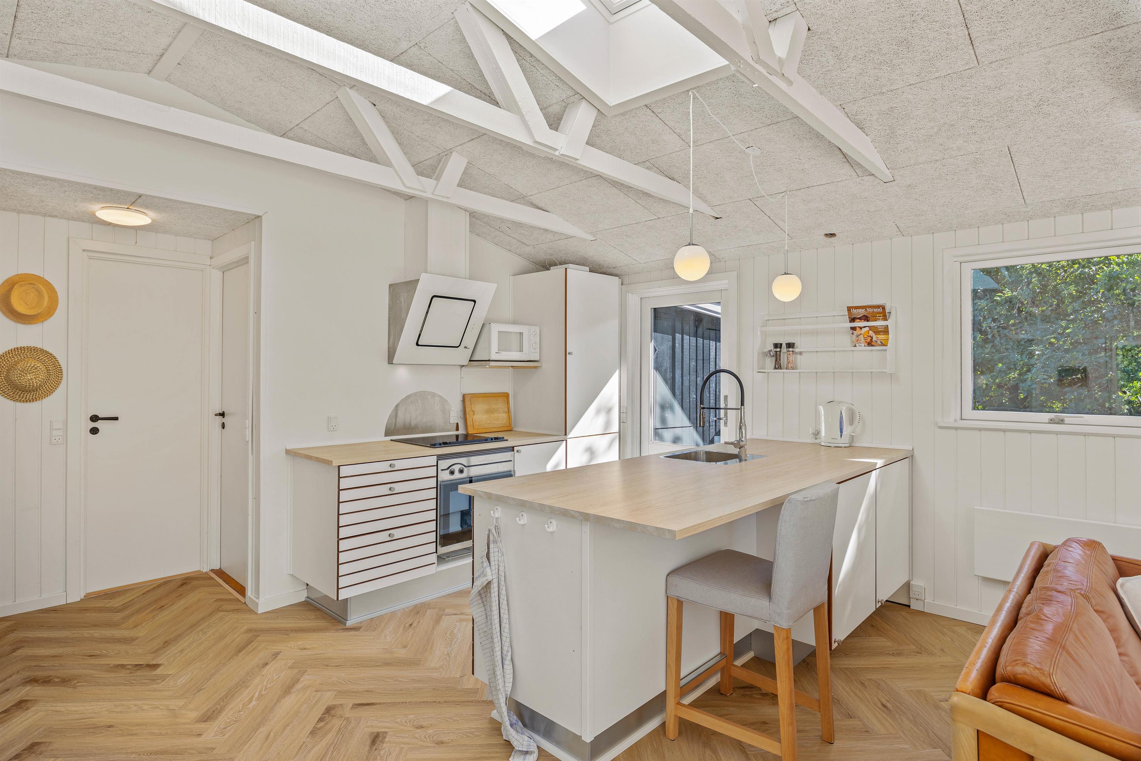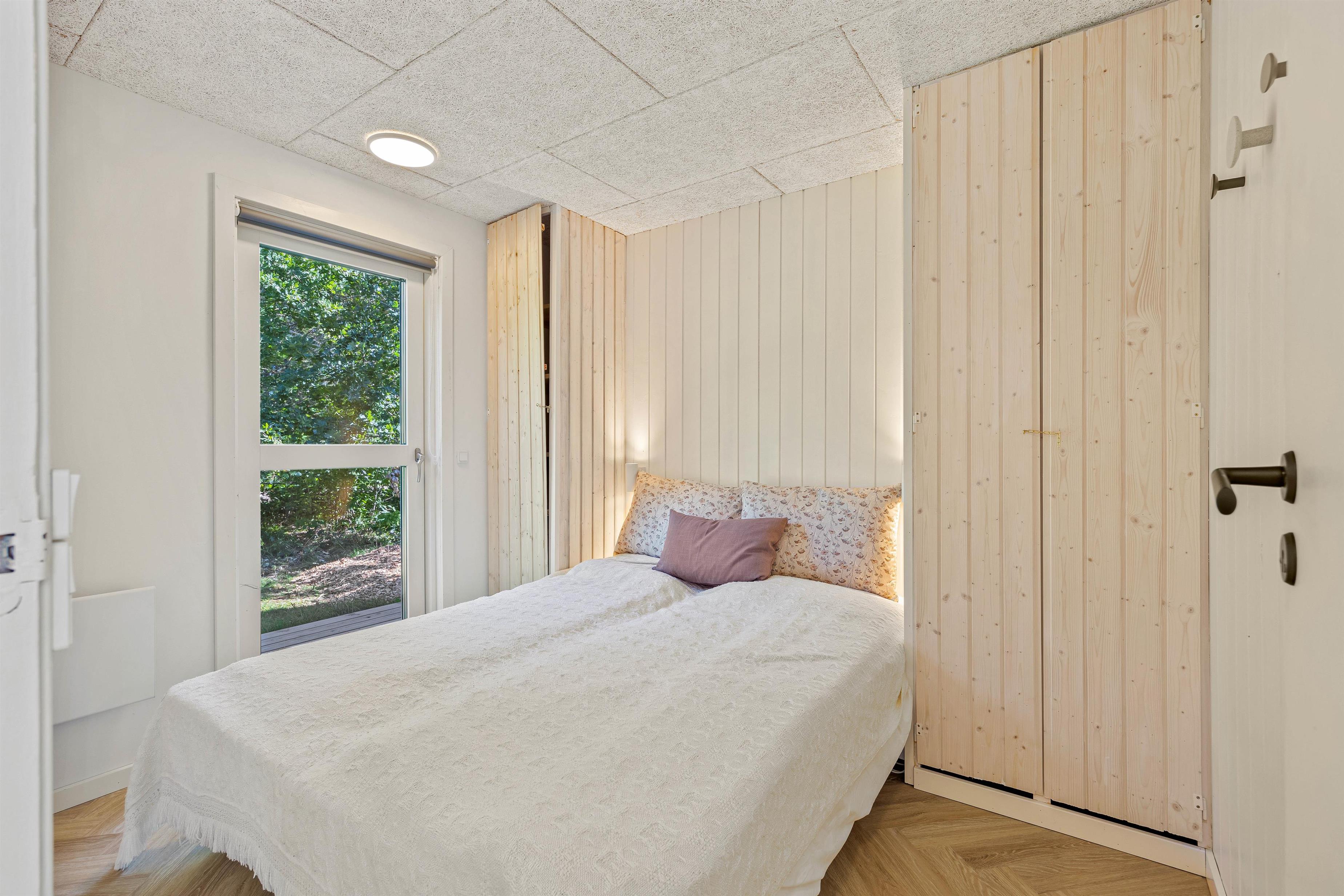 Loft op til kip og de lyse gulve, hvidmalede vægge og hanebånd giver en dejlig feriestemning. De store vinduespartier giver et fint lysindfald i sommerhuset, som er renoveret i 2023. Det åbne køkken i forbindelse med opholdsrummet indeholder alt, hvad I har brug for til at forkæle hinanden med lækre hjemmelavede måltider. I kan dække fint op ved spisebordet, eller I kan spille brætspil der. Eller slå jer ned med en god bog i sofagruppen. Herfra er udgang til terrassen og en dejlig udsigt til naturen og dyrelivet på naturgrunden med opvoksede fyrretræer omkring. Badeværelset har gulvvarme, de to værelser er indrettet med gode senge, hvor I kan hvile godt ud. Det ene værelse har en dobbeltseng, mens det andet har to enkeltsenge.
