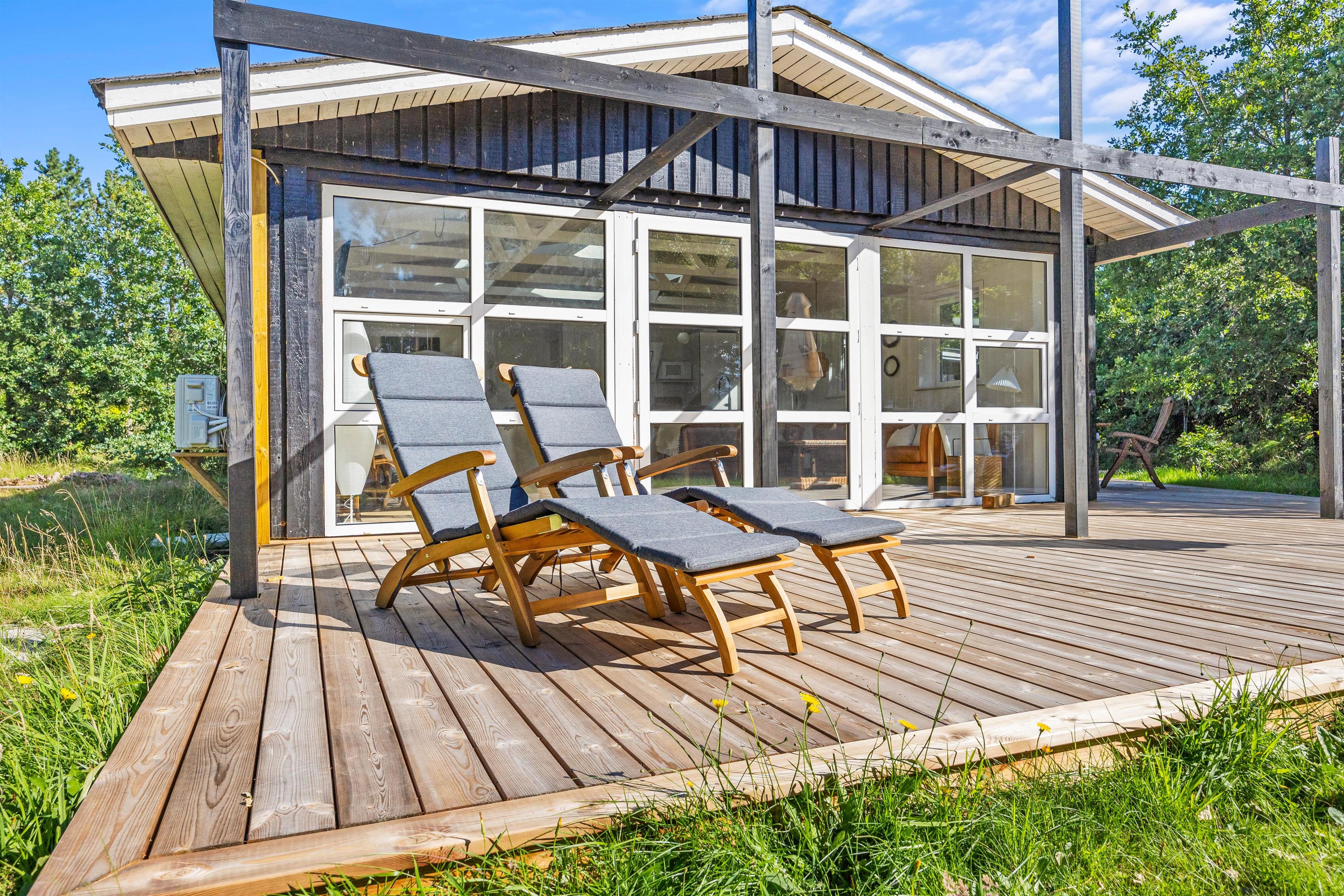 Den brede træterrasse går omkring 2 sider af sommerhuset, så I har rig mulighed for at finde en god lækrog eller et roligt hjørne. Benyt jer af de komfortable havemøbler, eller slap af i liggestolene, og slå parasollen op, hvis solen er for stærk. Tænd op i grillen, og slut dagen af med et lækkert grillmåltid imens skyggerne bliver lange.