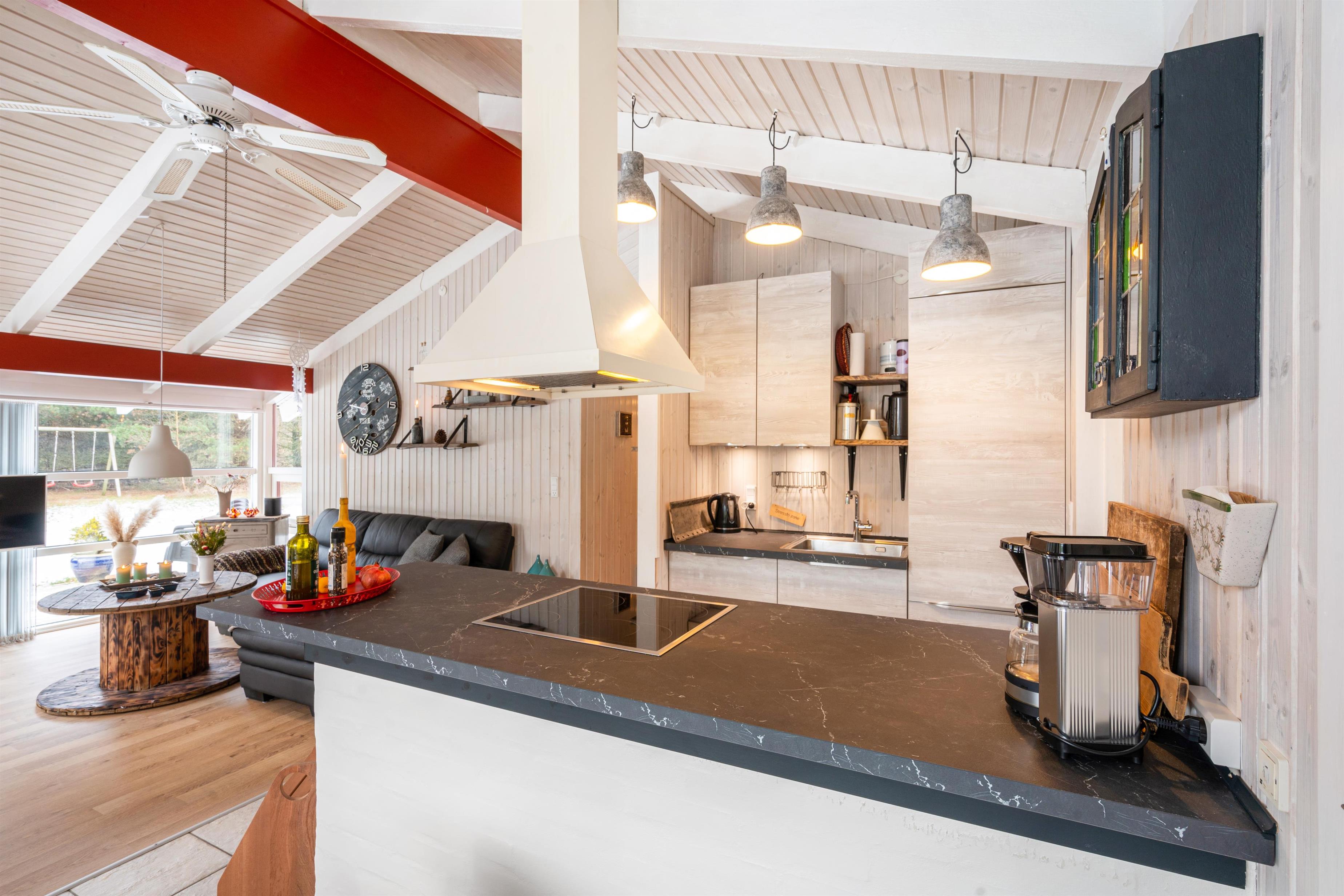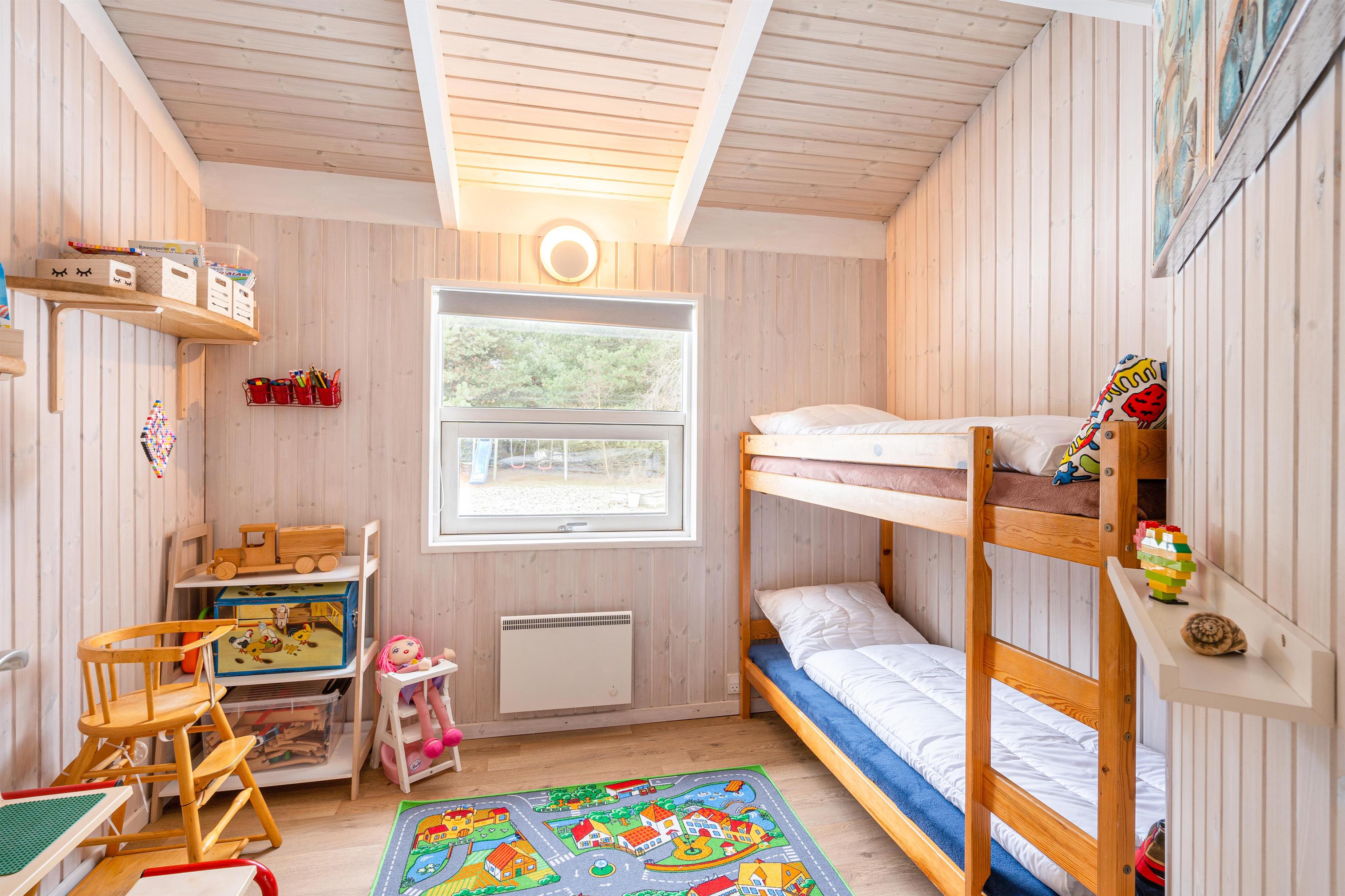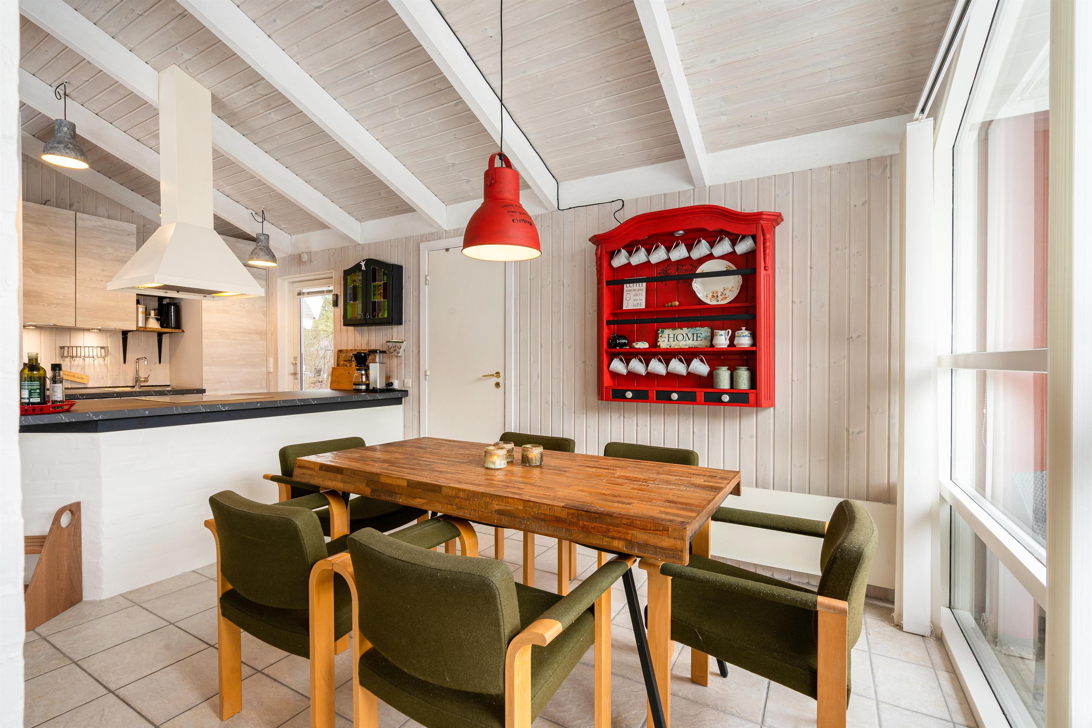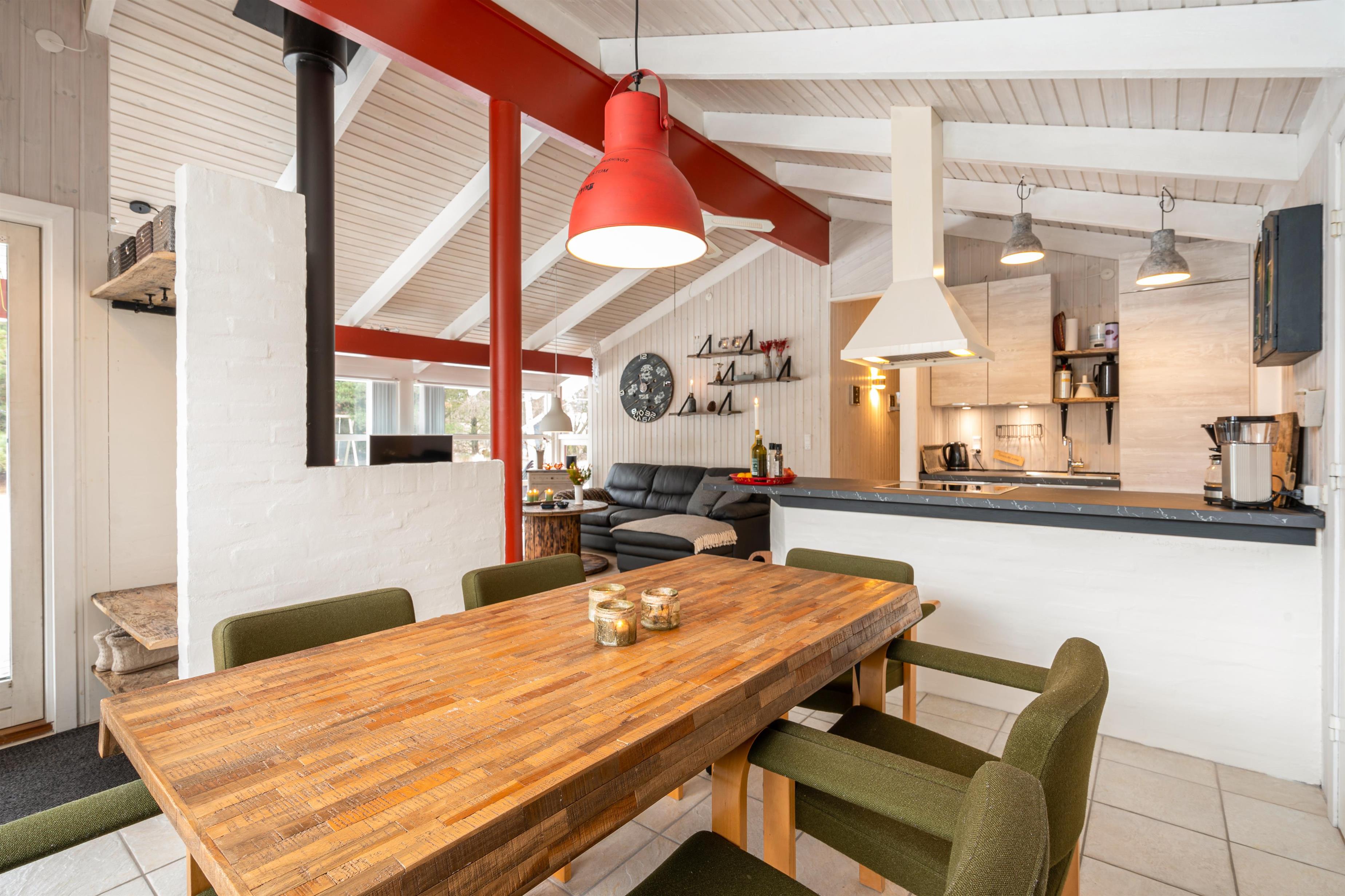 Det skønne åbne køkken- og spisestueområde er sommerhusets hjerte og bliver centrum for samvær. Her er der masser af plads til fælles madlavning i det nye køkken fra 2021 eller en hyggelig aften på sofaen. Lad de sene aftentimer rinde ud, mens den orange aftenhimmel kaster smukke farver ind gennem vinduerne. Her kommer I altså aldrig til at kede jer, og mens I læner jer tilbage og nyder varmen, kan de mindste sommerhusgæster underholde sig selv timevis på det flot indrettede børneværelse med køjesenge.