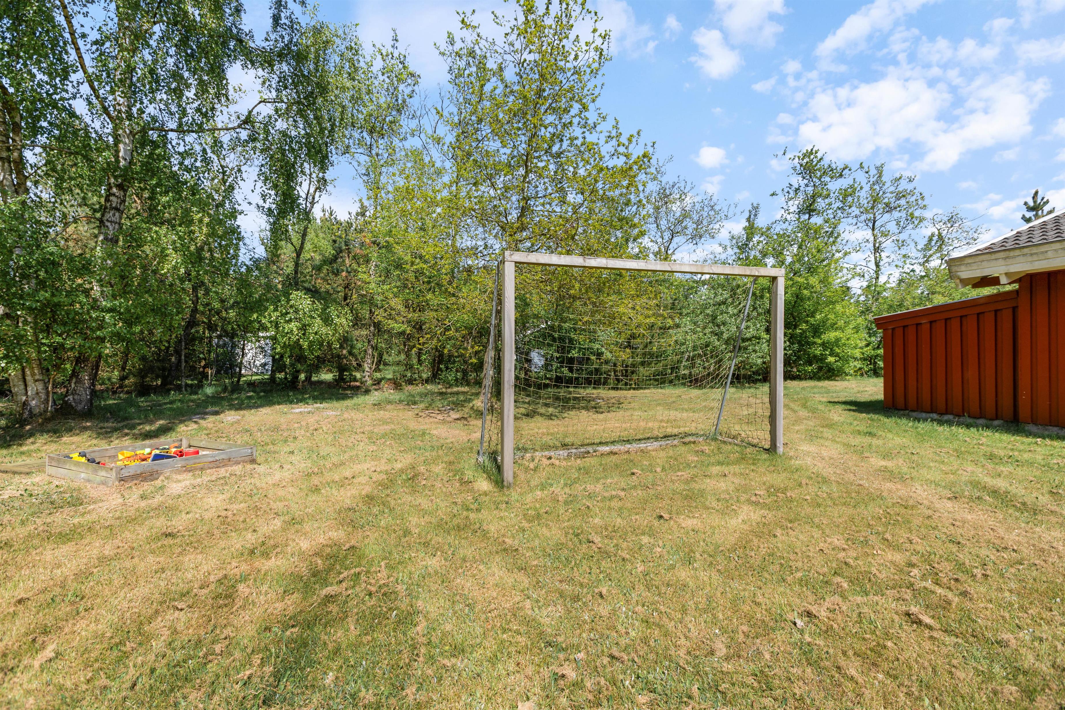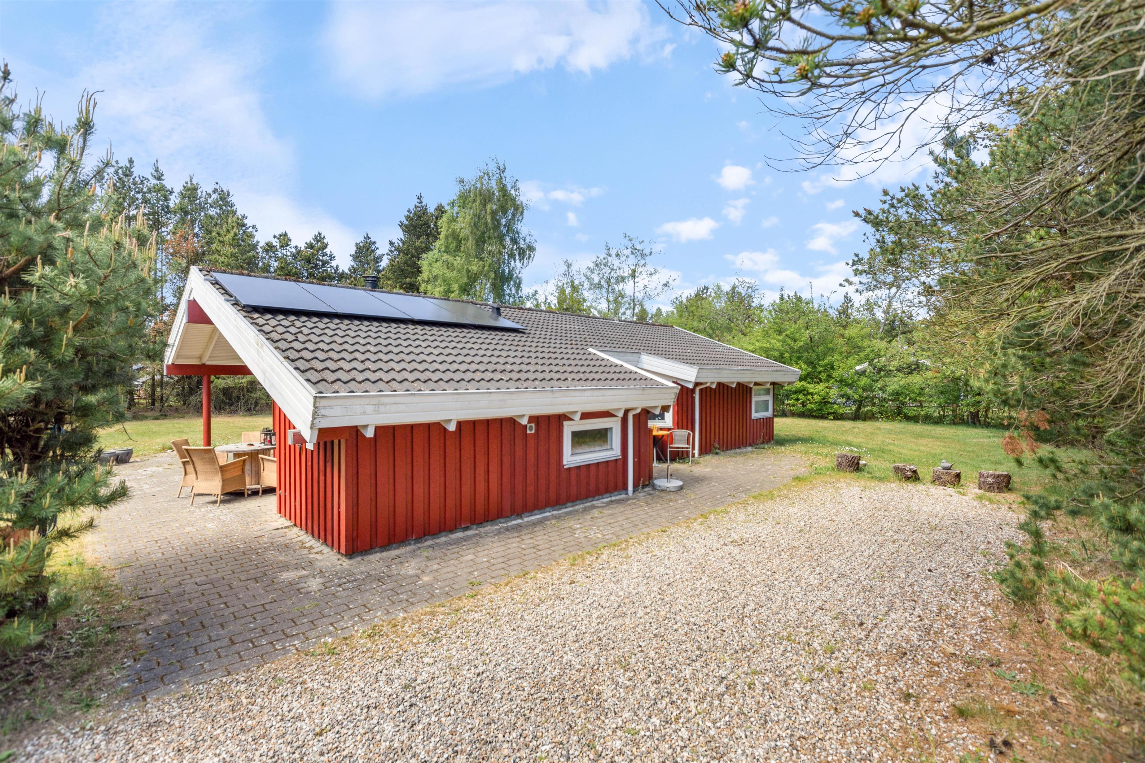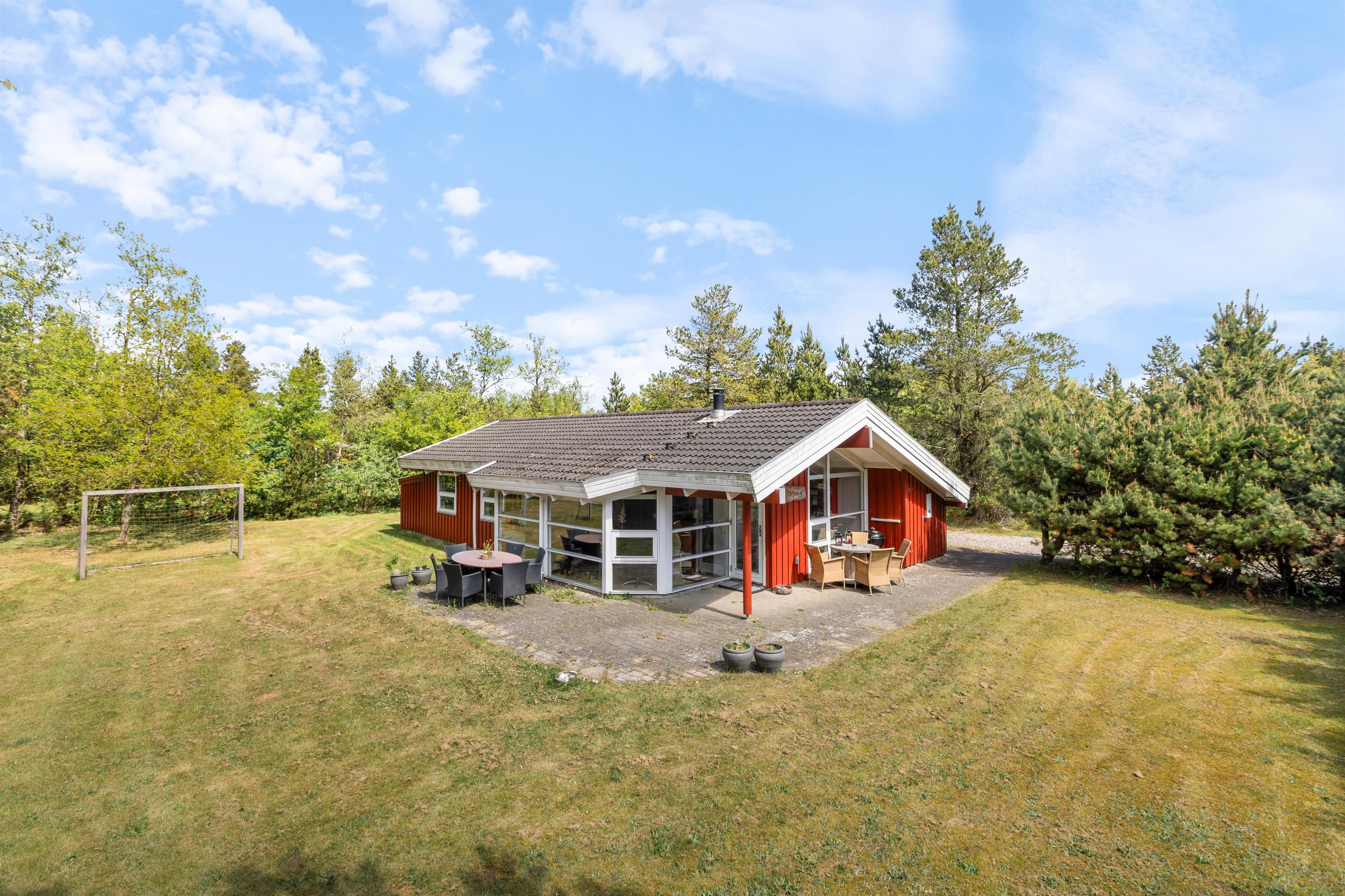 Det hyggelige røde træsommerhus ligger rigtig skønt på en stor naturgrund med masser af plads. Den åbne terrasse indbyder helt fra start af til afslapning og hygge i liggestolene, mens den store græsplæne indbyder til leg og boldspil for store og små, og selvfølgelig hunden.