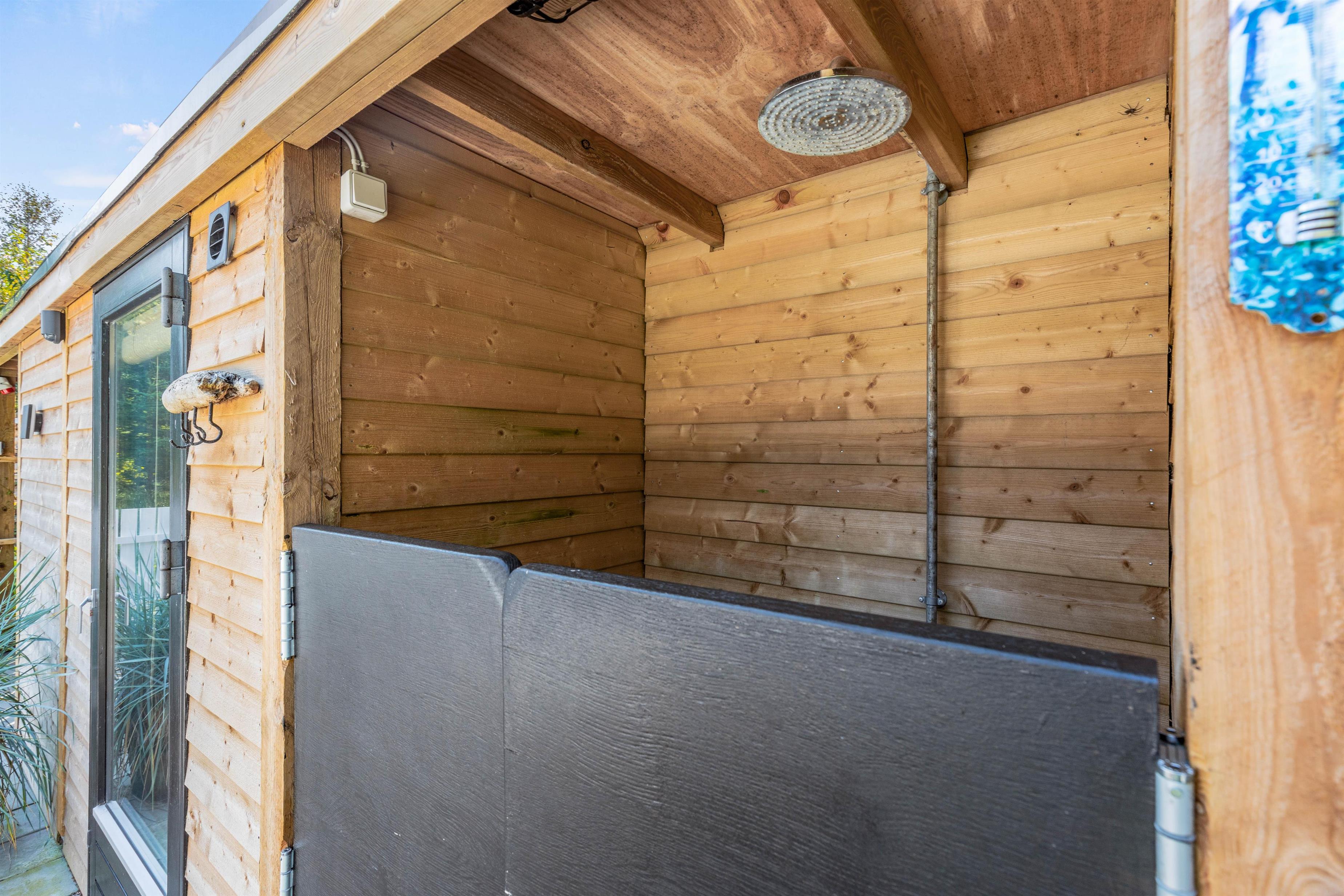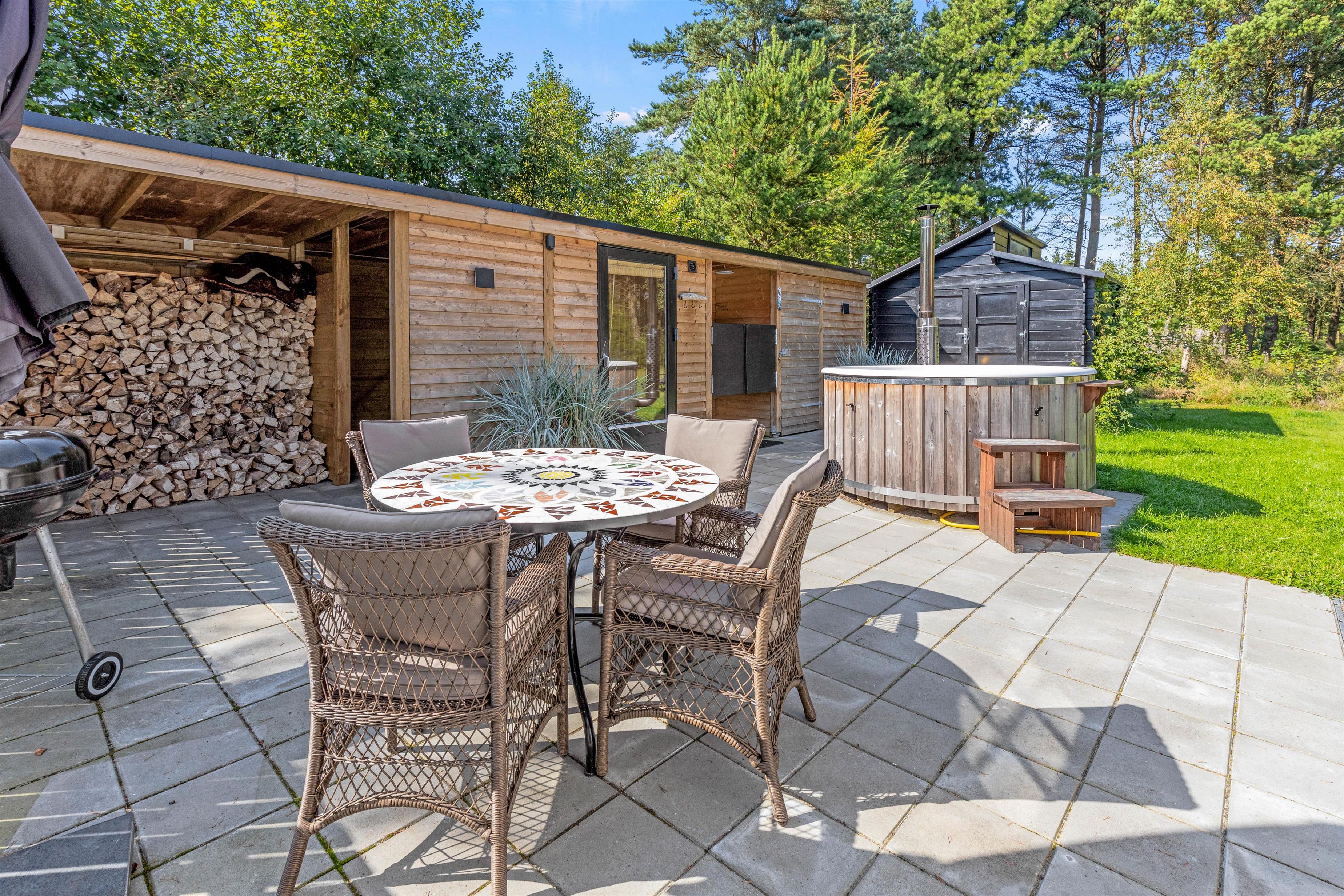 Udenfor finder I også en lille wellness-oase i form af et vildmarksbad, en udesauna og en udebruser, som I kan nyde fra april til november. Denne sammensætning giver jer mulighed for at forkæle jer selv med et varmt bad eller en forfriskende udedusche under åben himmel. Om I vælger at starte dagen med saunaens varme eller slutte aftenen med et bad under den klare stjernehimmel, inviterer de udendørs oplevelser til afslapning og ro.